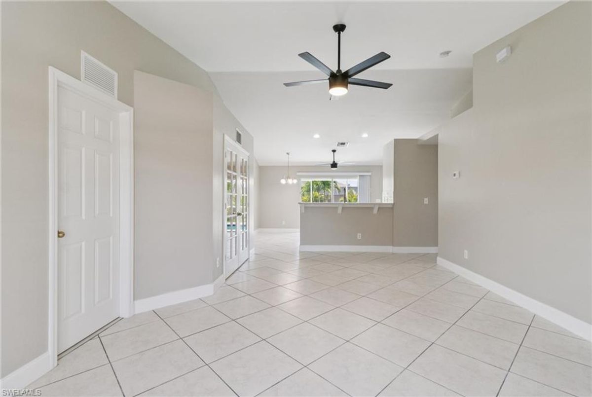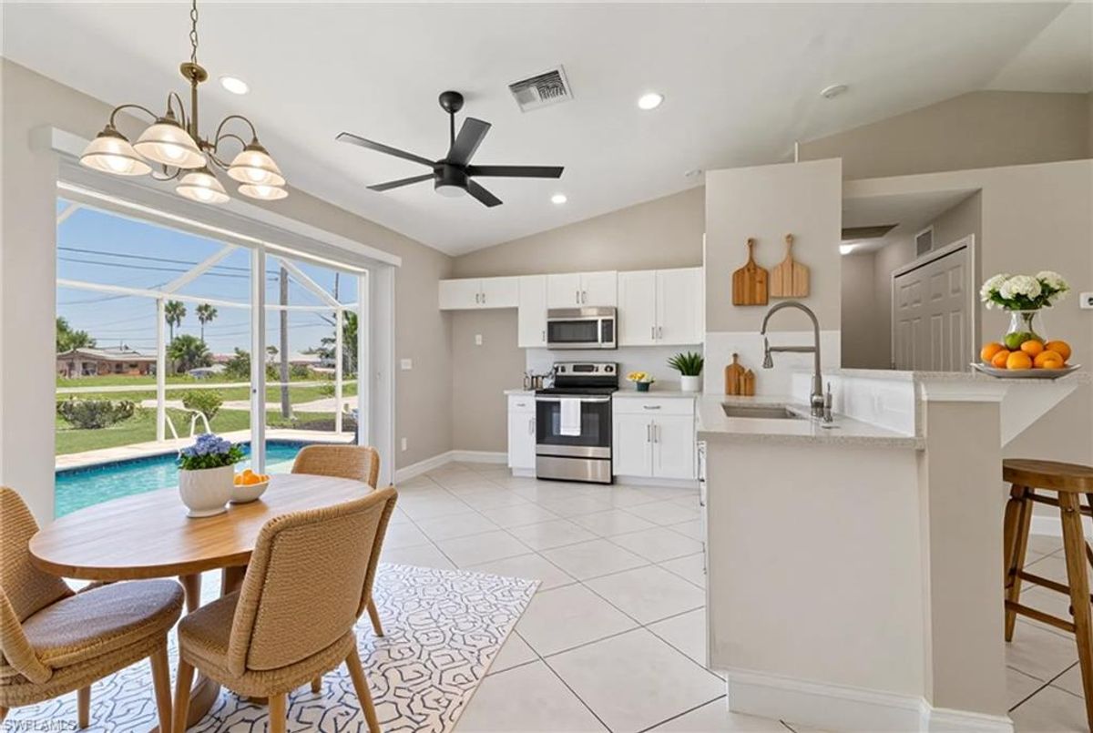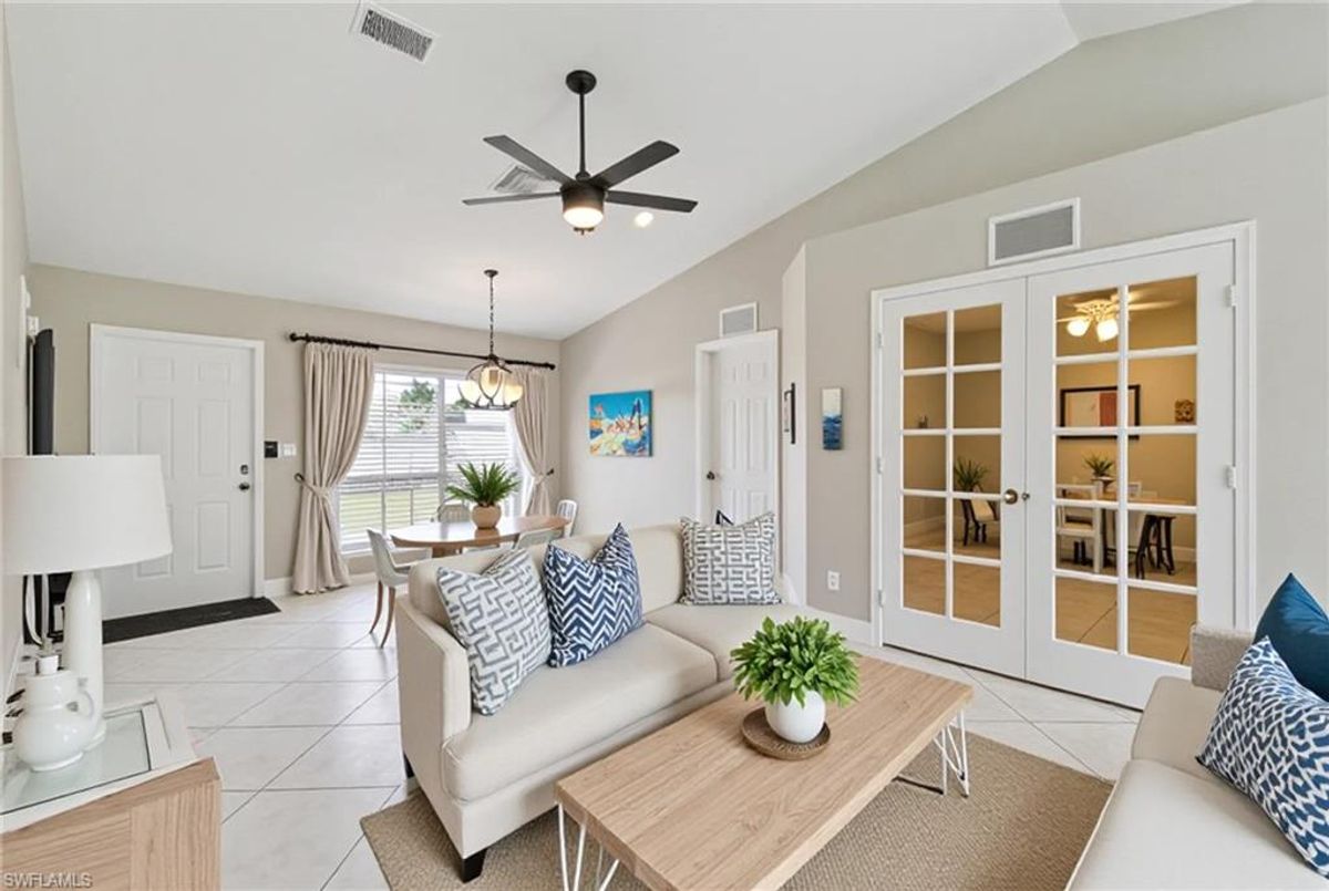 Welcome to this Cape Coral property complete with sparkling pool and screened lanai beautifully situated on a corner lot. Soak up some sun and enjoy a refreshing swim or relax in the shade on the patio. Take a peaceful stroll around the neighborhood and take in the canal views. You'll appreciate the crisp, clean feel of this updated home with vaulted ceilings and tile floors throughout giving this home an open, flowing appeal. The split floorplan preserves the privacy of the owner's suite with walk-in closet and ensuite bath. A charming den with French doors is the perfect gathering space, along with the spacious living room. 2 additional bedrooms and a second full bath round out the living space. You will certainly appreciate the separate laundry room storage and the 2 stall garage with room for your tools and storage. Just minutes from shopping, local eateries, groceries and the Caloosahatchee River.