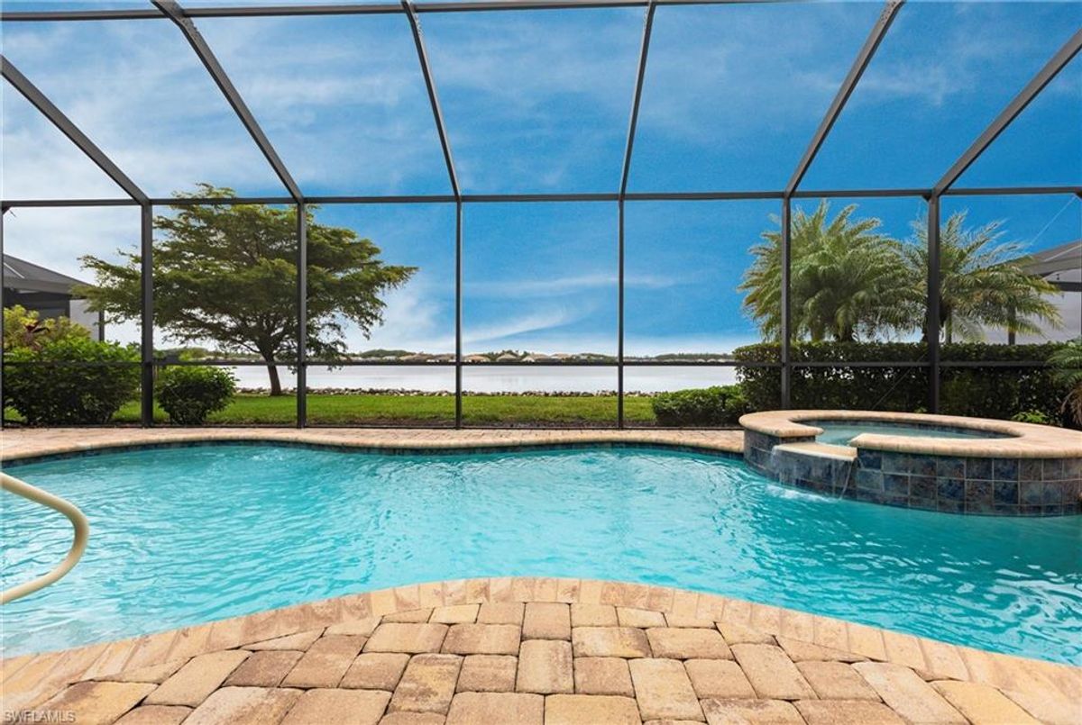 Magnificent views of expansive 243-acre lake from this spectacular executive class residence. Luxuriate in your private pool and spa. The amenity rich community of Corkscrew Shores features the Captains Club Bar & Restaurant, a resort style pool, pickleball, state of the art fitness center. This very prestigious gated community has low HOA fees and no CDD fees. It is conveniently located to shopping, dining, beaches, parks, and an international airport. An oversized living area with coffered ceiling and expansive wide water views will captivate your guests. The dining area has plenty of room for a large table and you will enjoy plenty of seating at the breakfast bar. Live comfortably and entertain graciously. This home offers a spacious office with beautiful French doors. Use this beautiful room to work at home or to just keep your life organized. It is also a flex space to use as you wish. You will love the spacious primary suite with unparalleled views of the lake and walk out to the pool and spa. There is a secondary ensuite featuring a spacious bath. The third bedroom is conveniently located to a third full bathroom. The three-car garage offers plenty of space for vehicles and storage. This is truly a spacious 3-car garage. Pull-down stairs to the attic further enhances storage. This is the one you have been waiting for!