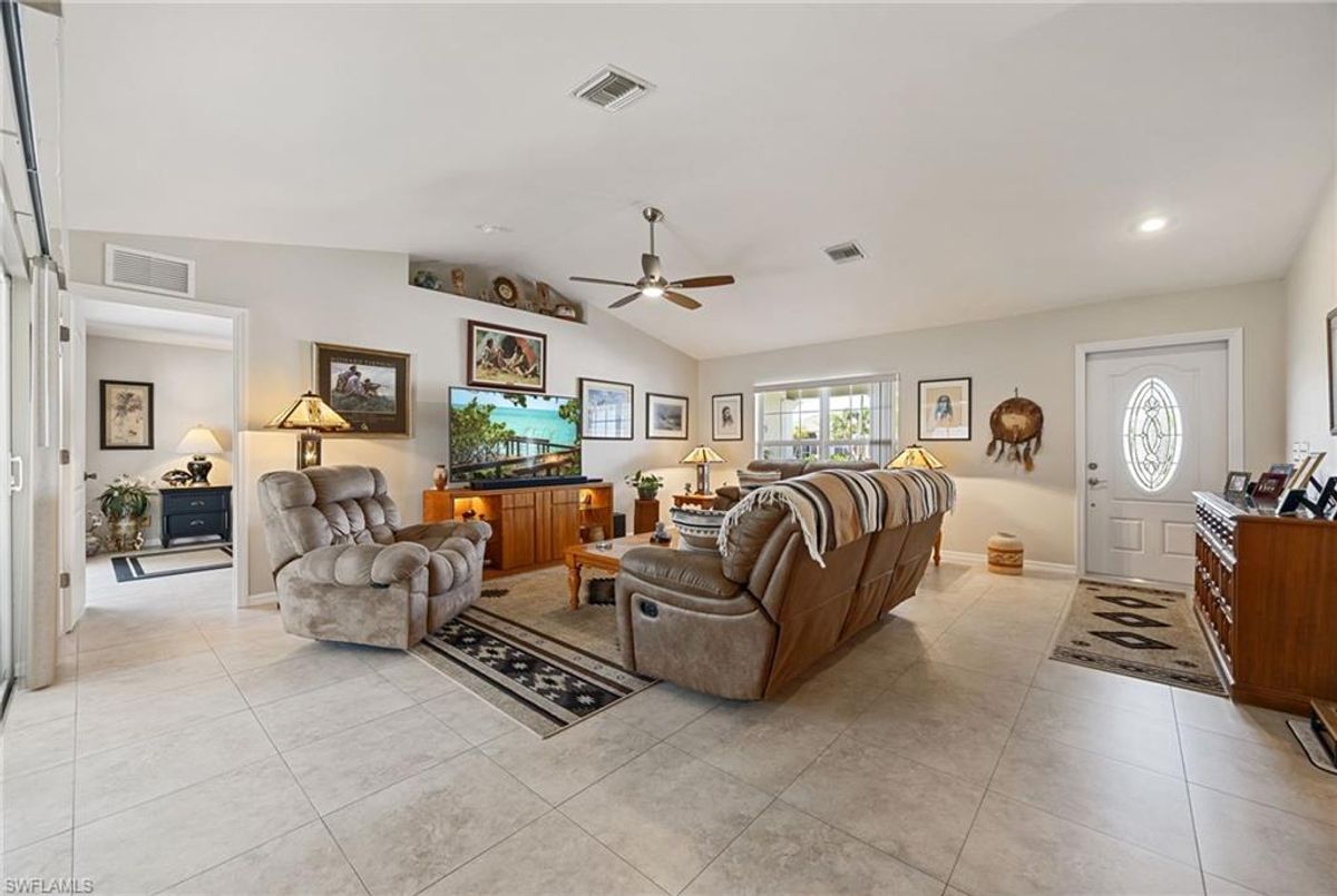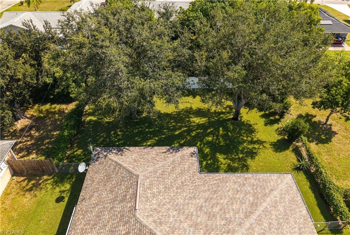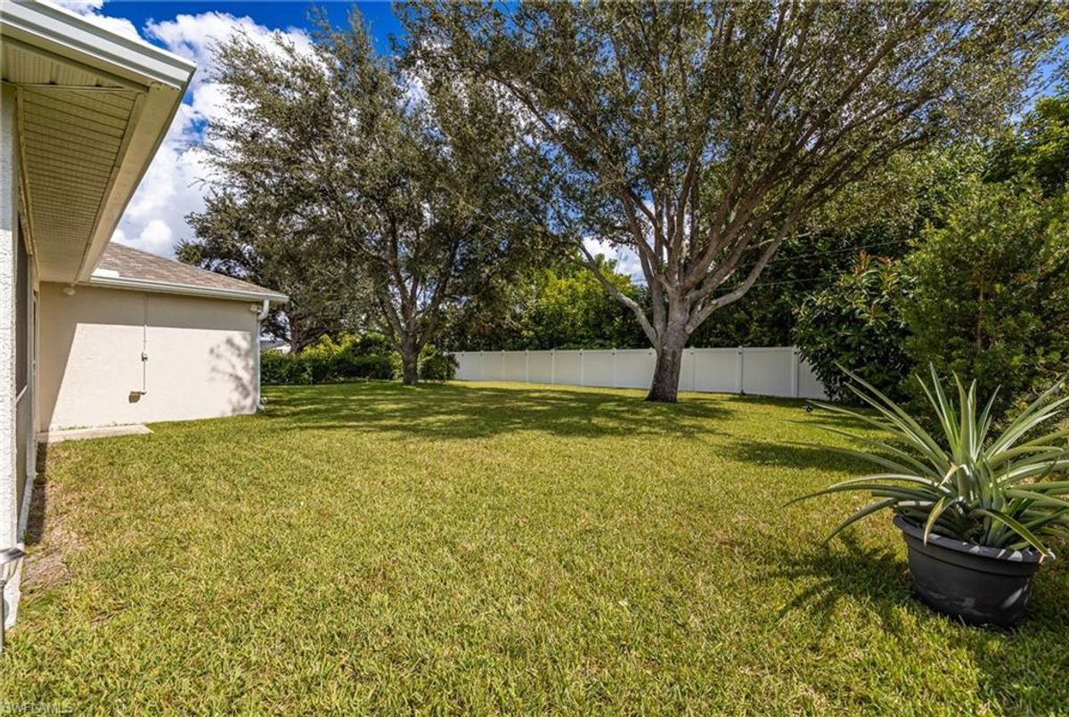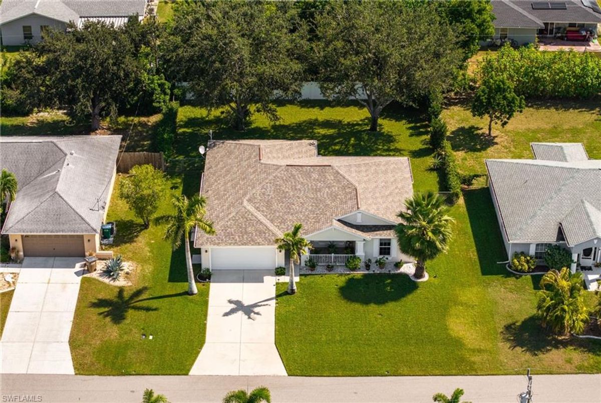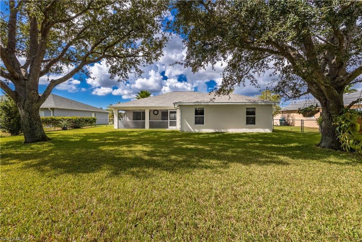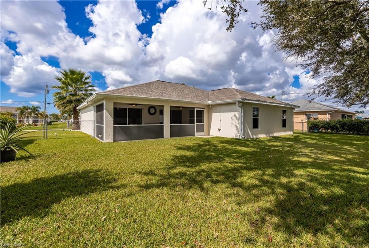 Lovingly maintained and move-in ready, this beautiful 3 bedroom, 2 bathroom home in desirable SW Cape Coral Florida offers comfort, style, and attention to detail at every turn. From the moment you arrive, you’ll be drawn to the lush, tropical landscaping featuring a striking Washingtonia palm in the front yard, complemented by graceful royal palms that create exceptional curb appeal. A beautiful open front porch welcomes you home. Inside you’ll find a spacious open floor plan with 20 inch tile throughout for easy maintenance and timeless appeal. The kitchen is upgraded with Whirlpool stainless steel appliances, including a 31 cubic foot refrigerator and a convection oven, paired with elegant glass front and raised panel cabinets topped with crown molding, 78 feet of granite countertops featuring a waterfall edge, a Kraus dual bowl stainless steel sink, and a pantry, this kitchen perfectly blends functionality and beauty for both everyday living and entertaining. The large primary suite, approximately 16x13, easily accommodates a king sized bed and features sliding doors to the lanai. While the primary bath includes a granite vanity, a walk-in shower with glass doors, and a spacious walk-in closet. Two guest bedrooms, a second full bath and a linen closet are situated on the opposite side of the home, providing a true split bedroom floor plan ideal for family or guests. A dedicated home office features an 8.5 foot built in desk wired for high speed internet, cable, and Ethernet, perfect for remote work, daily organization or school work. The open living and dining areas flow seamlessly together and open through sliding glass doors to an expansive 25 foot under truss lanai with privacy screens and remote controlled ceiling fans, it’s ideal for relaxing or entertaining outdoors. The laundry room off the kitchen gives access to the garage and a storage closet. The fully fenced backyard offers a 6 foot vinyl privacy fence along the back with solar lighting and is stunning at night. There are gates on both sides of the home, ample room for a pool. Majestic oak trees, mature landscaping, and fragrant jasmine and passion flower vines create a tranquil private retreat. Additional upgrades include, a Clopay hurricane rated garage door with battery back up, a Rudd 14 seer air conditioner, a side door in the garage for added convenience, easy install hurricane panels, a 10K electric start Generac generator for peace of mind, and an Aquaboon whole-house water filtration system providing clean, high-quality water throughout. The home also features an architectural shingle roof with a secondary water barrier and a 130 MPH limited lifetime manufacturer warranty, a Rain Bird automatic irrigation system, an Arlo security system with motion lights on all corners, and a renewable flood policy. This exceptional Cape Coral home offers both comfort and value in one of the areas most desirable locations. Close to shopping, dining, parks, and the beautiful Gulf beaches.