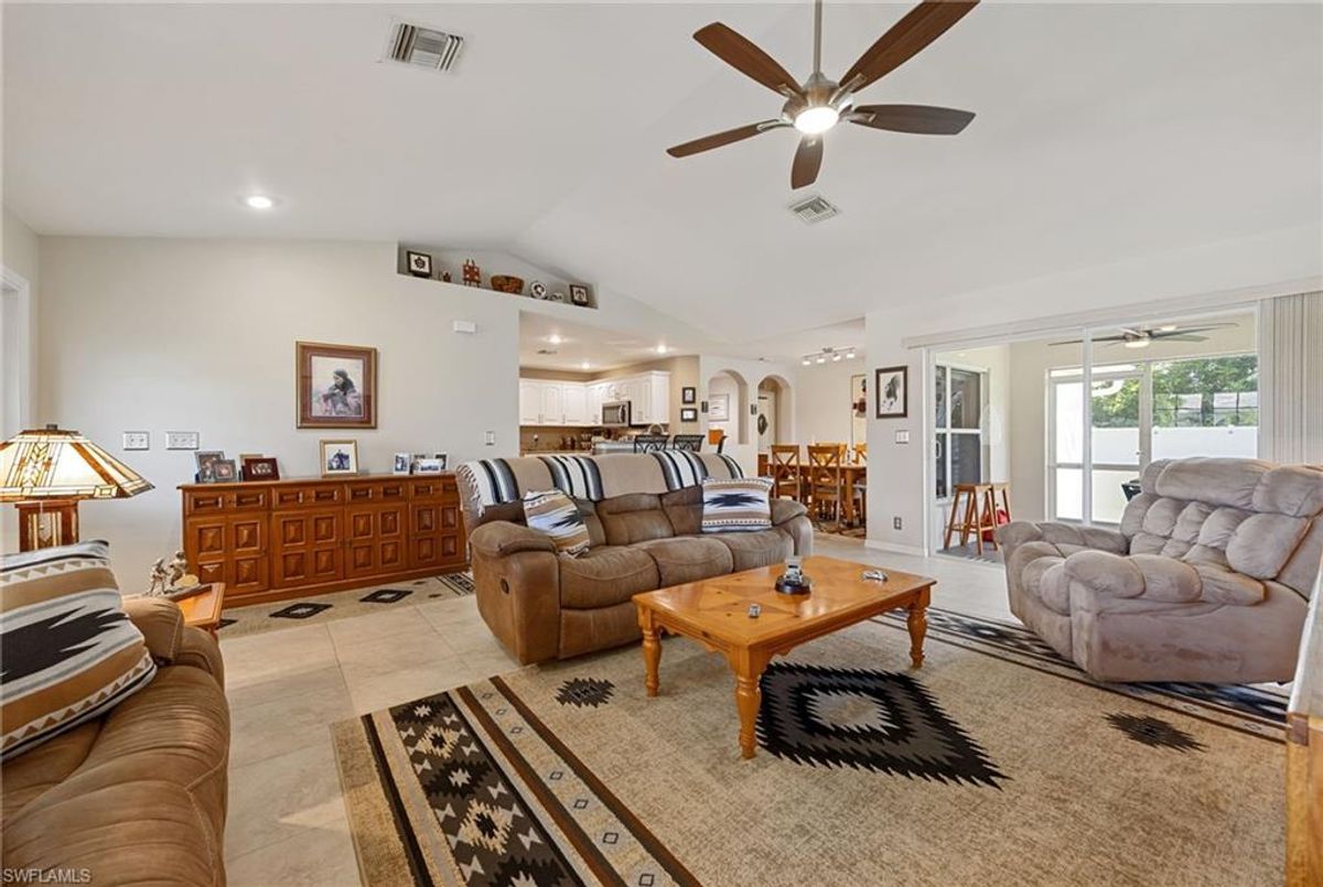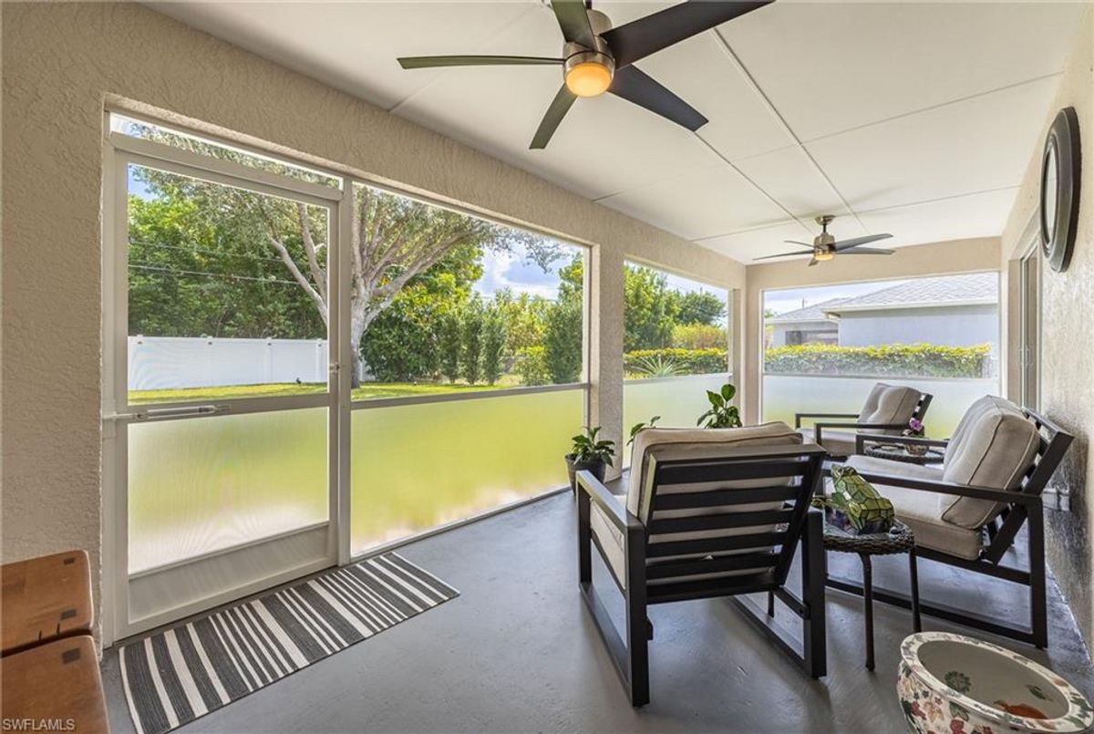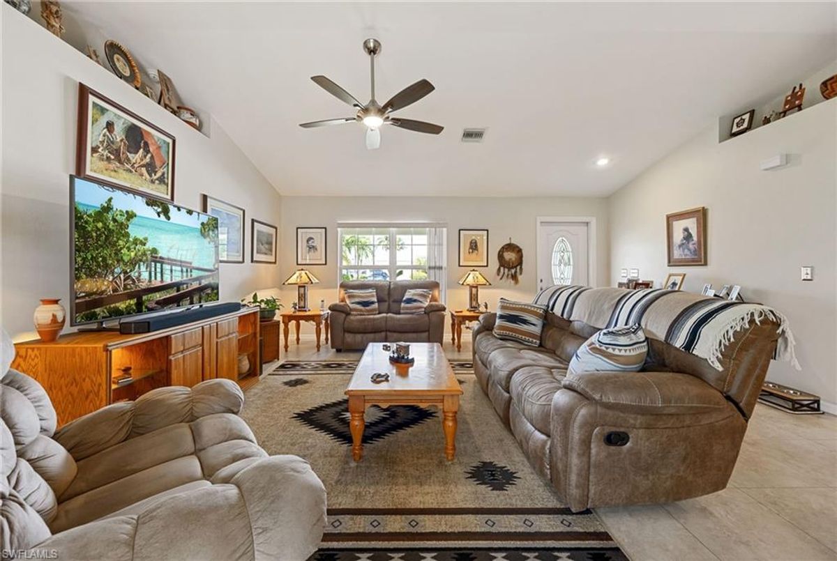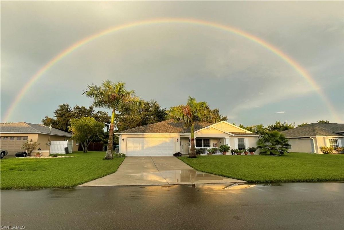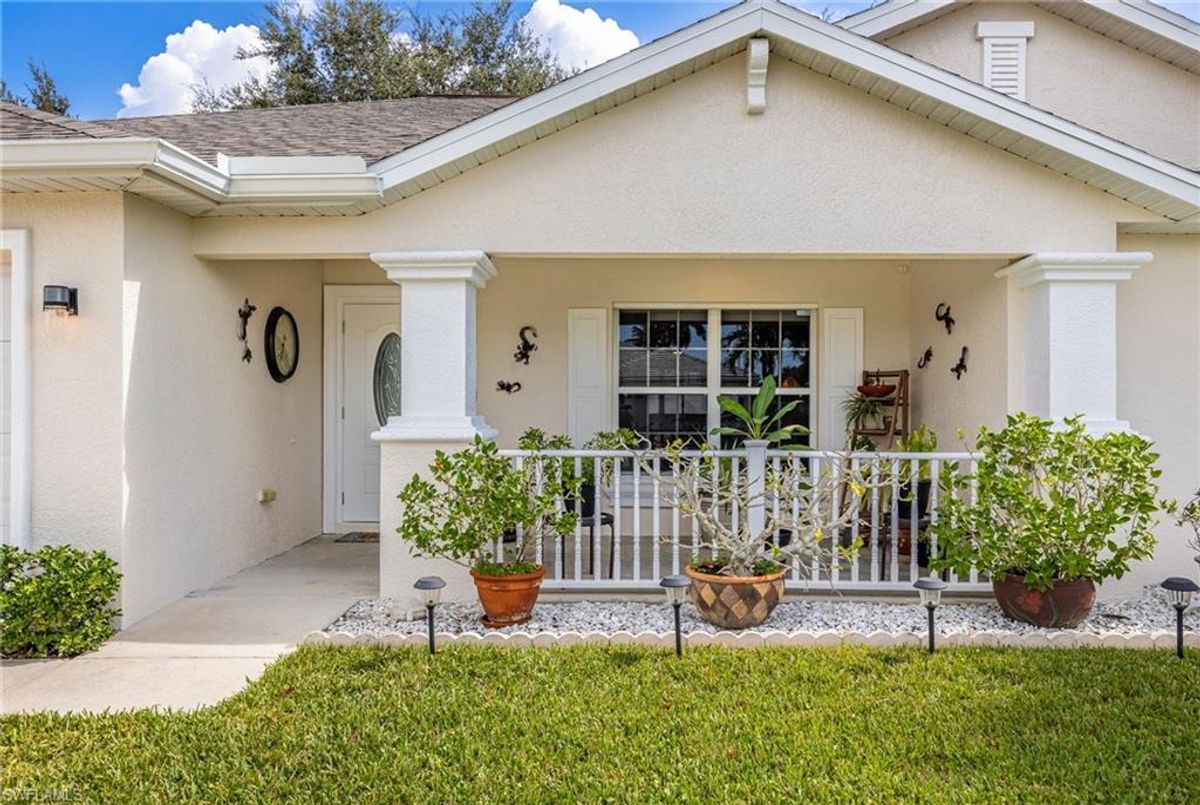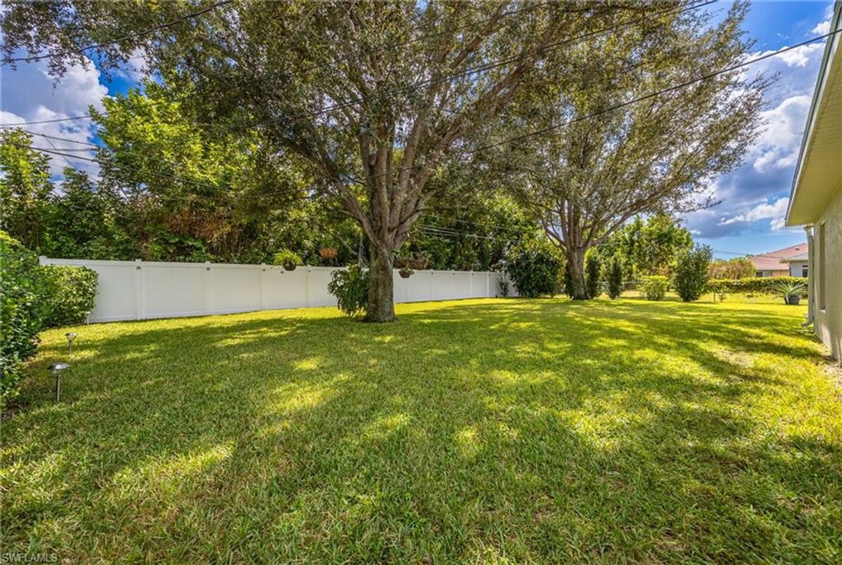Lovingly maintained and move-in ready, this beautiful 3 bedroom, 2 bathroom home in desirable SW Cape Coral Florida offers comfort, style, and attention to detail at every turn. From the moment you arrive, you’ll be drawn to the lush, tropical landscaping featuring a striking Washingtonia palm in the front yard, complemented by graceful royal palms that create exceptional curb appeal. A beautiful open front porch welcomes you home. Inside you’ll find a spacious open floor plan with 20 inch tile throughout for easy maintenance and timeless appeal. The kitchen is upgraded with Whirlpool stainless steel appliances, including a 31 cubic foot refrigerator and a convection oven, paired with elegant glass front and raised panel cabinets topped with crown molding, 78 feet of granite countertops featuring a waterfall edge, a Kraus dual bowl stainless steel sink, and a pantry, this kitchen perfectly blends functionality and beauty for both everyday living and entertaining. The large primary suite, approximately 16x13, easily accommodates a king sized bed and features sliding doors to the lanai. While the primary bath includes a granite vanity, a walk-in shower with glass doors, and a spacious walk-in closet. Two guest bedrooms, a second full bath and a linen closet are situated on the opposite side of the home, providing a true split bedroom floor plan ideal for family or guests. A dedicated home office features an 8.5 foot built in desk wired for high speed internet, cable, and Ethernet, perfect for remote work, daily organization or school work. The open living and dining areas flow seamlessly together and open through sliding glass doors to an expansive 25 foot under truss lanai with privacy screens and remote controlled ceiling fans, it’s ideal for relaxing or entertaining outdoors. The laundry room off the kitchen gives access to the garage and a storage closet. The fully fenced backyard offers a 6 foot vinyl privacy fence along the back with solar lighting and is stunning at night. There are gates on both sides of the home, ample room for a pool. Majestic oak trees, mature landscaping, and fragrant jasmine and passion flower vines create a tranquil private retreat. Additional upgrades include, a Clopay hurricane rated garage door with battery back up, a Rudd 14 seer air conditioner, a side door in the garage for added convenience, easy install hurricane panels, a 10K electric start Generac generator for peace of mind, and an Aquaboon whole-house water filtration system providing clean, high-quality water throughout. The home also features an architectural shingle roof with a secondary water barrier and a 130 MPH limited lifetime manufacturer warranty, a Rain Bird automatic irrigation system, an Arlo security system with motion lights on all corners, and a renewable flood policy. This exceptional Cape Coral home offers both comfort and value in one of the areas most desirable locations. Close to shopping, dining, parks, and the beautiful Gulf beaches.