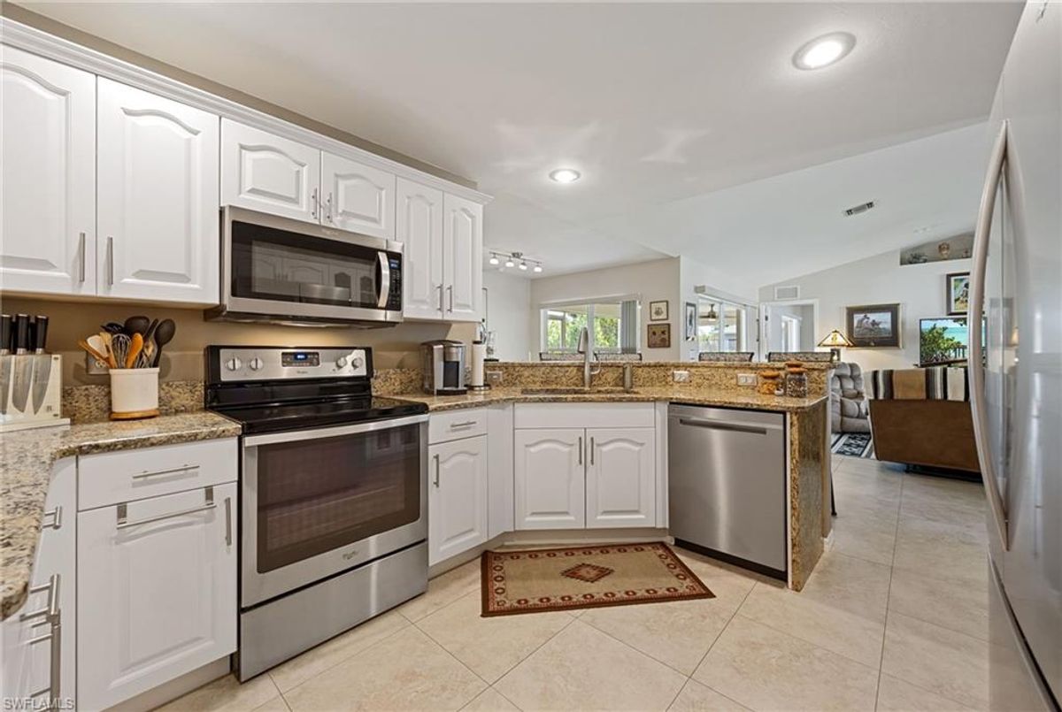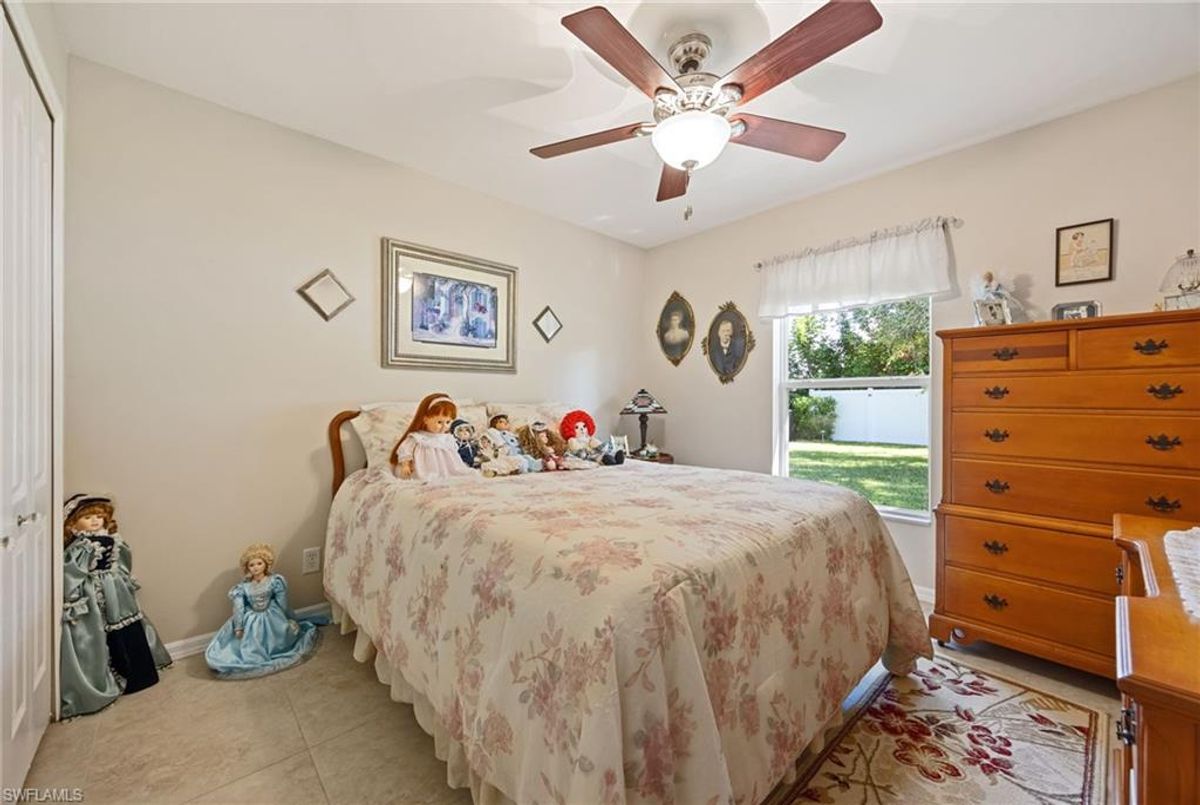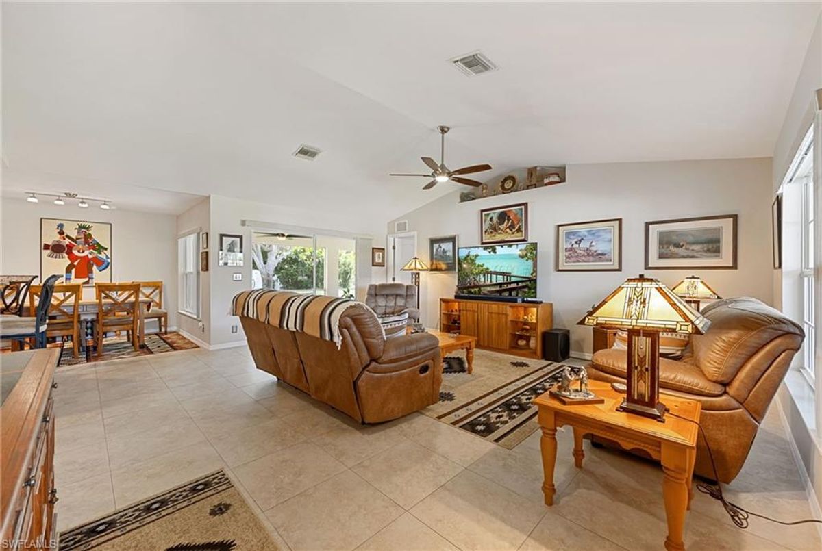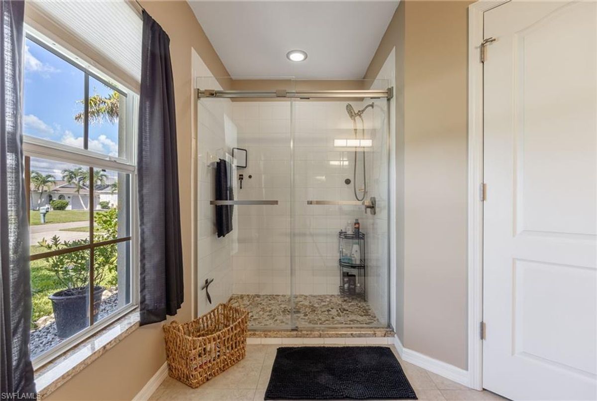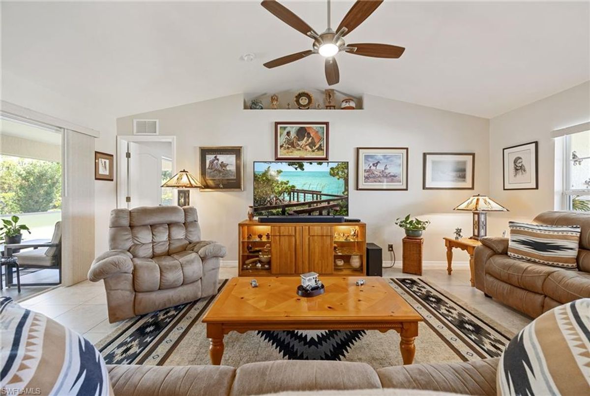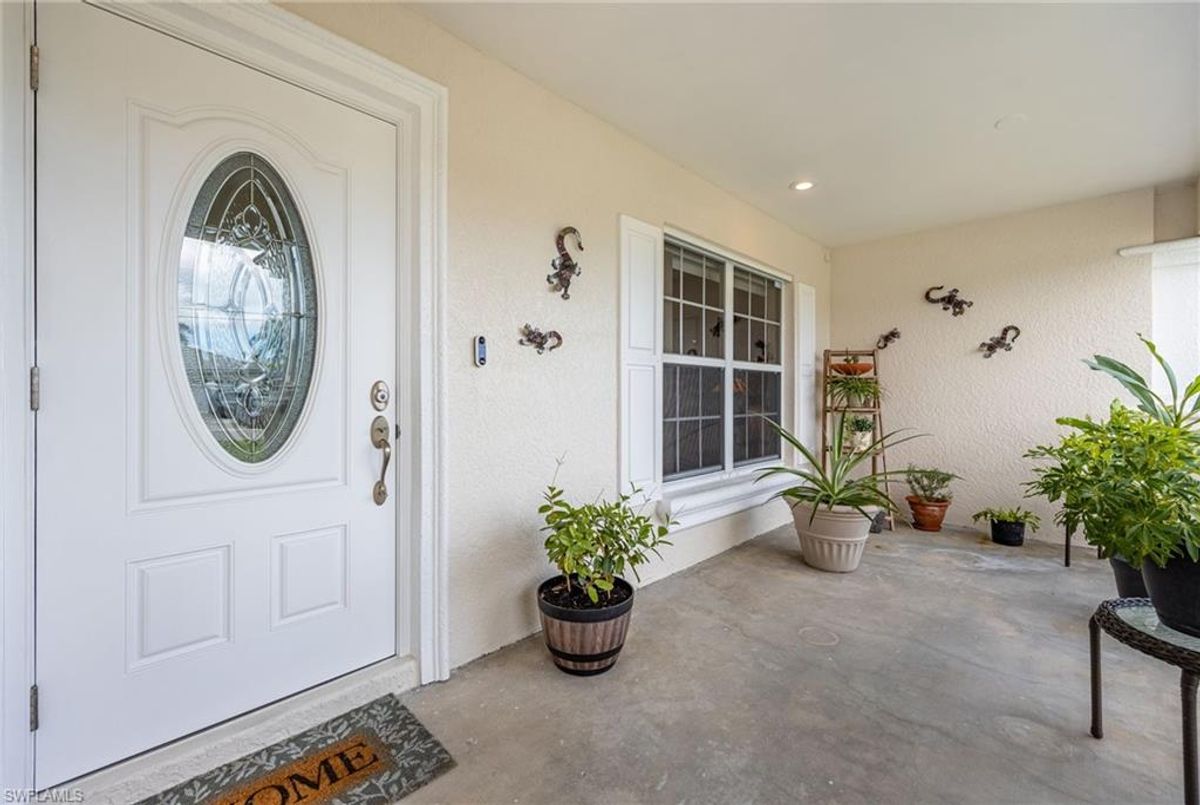 Lovingly maintained and move-in ready, this beautiful 3 bedroom, 2 bathroom home in desirable SW Cape Coral Florida offers comfort, style, and attention to detail at every turn. From the moment you arrive, you’ll be drawn to the lush, tropical landscaping featuring a striking Washingtonia palm in the front yard, complemented by graceful royal palms that create exceptional curb appeal. A beautiful open front porch welcomes you home. Inside you’ll find a spacious open floor plan with 20 inch tile throughout for easy maintenance and timeless appeal. The kitchen is upgraded with Whirlpool stainless steel appliances, including a 31 cubic foot refrigerator and a convection oven, paired with elegant glass front and raised panel cabinets topped with crown molding, 78 feet of granite countertops featuring a waterfall edge, a Kraus dual bowl stainless steel sink, and a pantry, this kitchen perfectly blends functionality and beauty for both everyday living and entertaining. The large primary suite, approximately 16x13, easily accommodates a king sized bed and features sliding doors to the lanai. While the primary bath includes a granite vanity, a walk-in shower with glass doors, and a spacious walk-in closet. Two guest bedrooms, a second full bath and a linen closet are situated on the opposite side of the home, providing a true split bedroom floor plan ideal for family or guests. A dedicated home office features an 8.5 foot built in desk wired for high speed internet, cable, and Ethernet, perfect for remote work, daily organization or school work. The open living and dining areas flow seamlessly together and open through sliding glass doors to an expansive 25 foot under truss lanai with privacy screens and remote controlled ceiling fans, it’s ideal for relaxing or entertaining outdoors. The laundry room off the kitchen gives access to the garage and a storage closet. The fully fenced backyard offers a 6 foot vinyl privacy fence along the back with solar lighting and is stunning at night. There are gates on both sides of the home, ample room for a pool. Majestic oak trees, mature landscaping, and fragrant jasmine and passion flower vines create a tranquil private retreat. Additional upgrades include, a Clopay hurricane rated garage door with battery back up, a Rudd 14 seer air conditioner, a side door in the garage for added convenience, easy install hurricane panels, a 10K electric start Generac generator for peace of mind, and an Aquaboon whole-house water filtration system providing clean, high-quality water throughout. The home also features an architectural shingle roof with a secondary water barrier and a 130 MPH limited lifetime manufacturer warranty, a Rain Bird automatic irrigation system, an Arlo security system with motion lights on all corners, and a renewable flood policy. This exceptional Cape Coral home offers both comfort and value in one of the areas most desirable locations. Close to shopping, dining, parks, and the beautiful Gulf beaches.