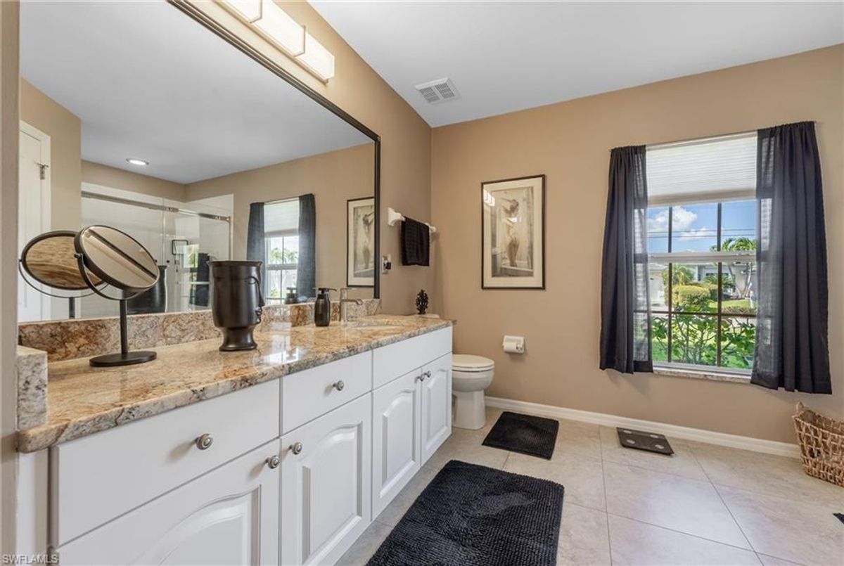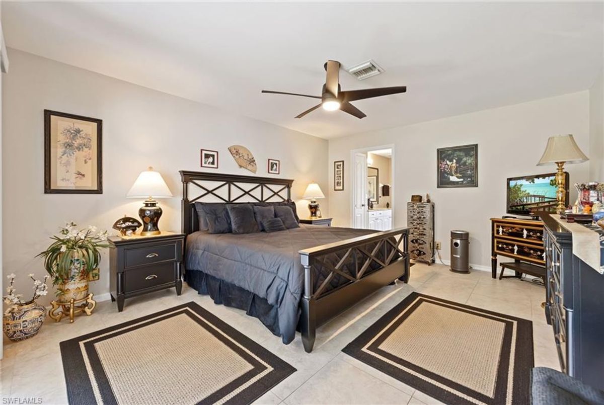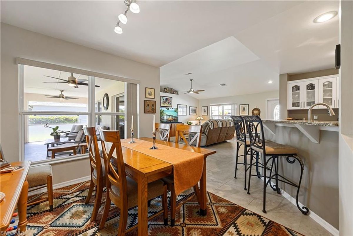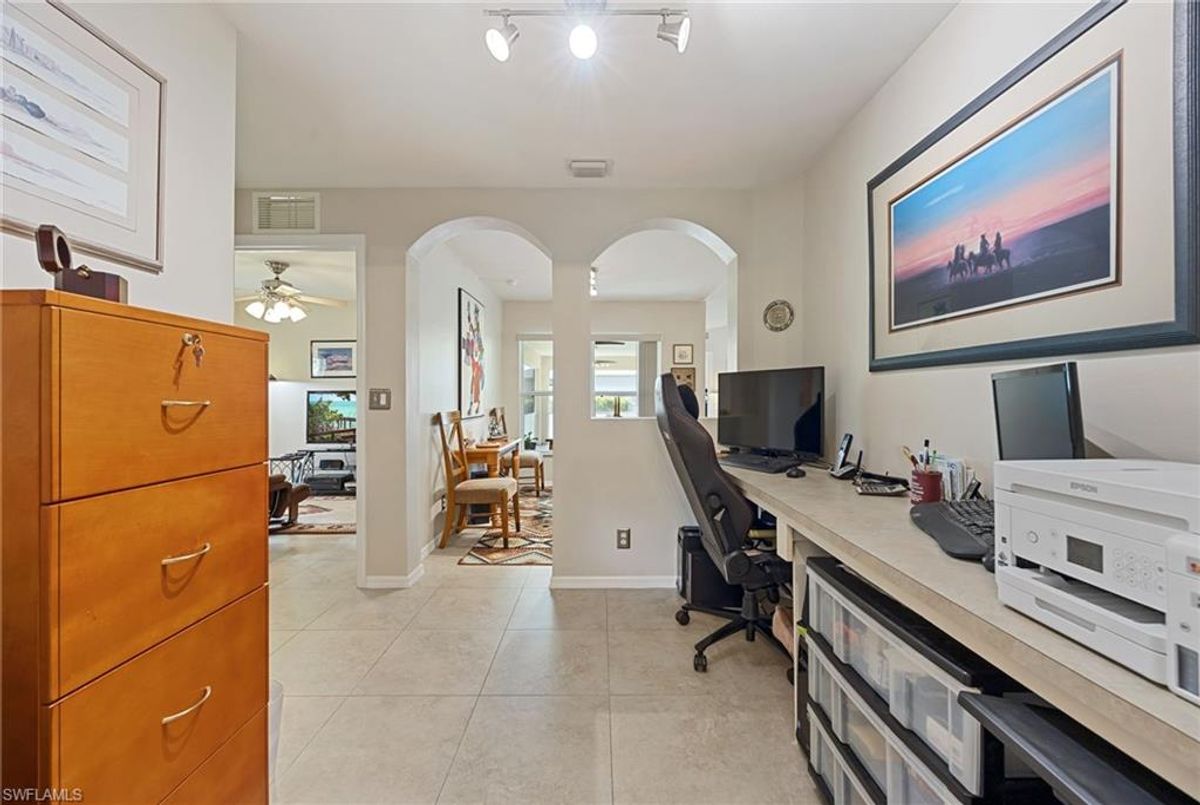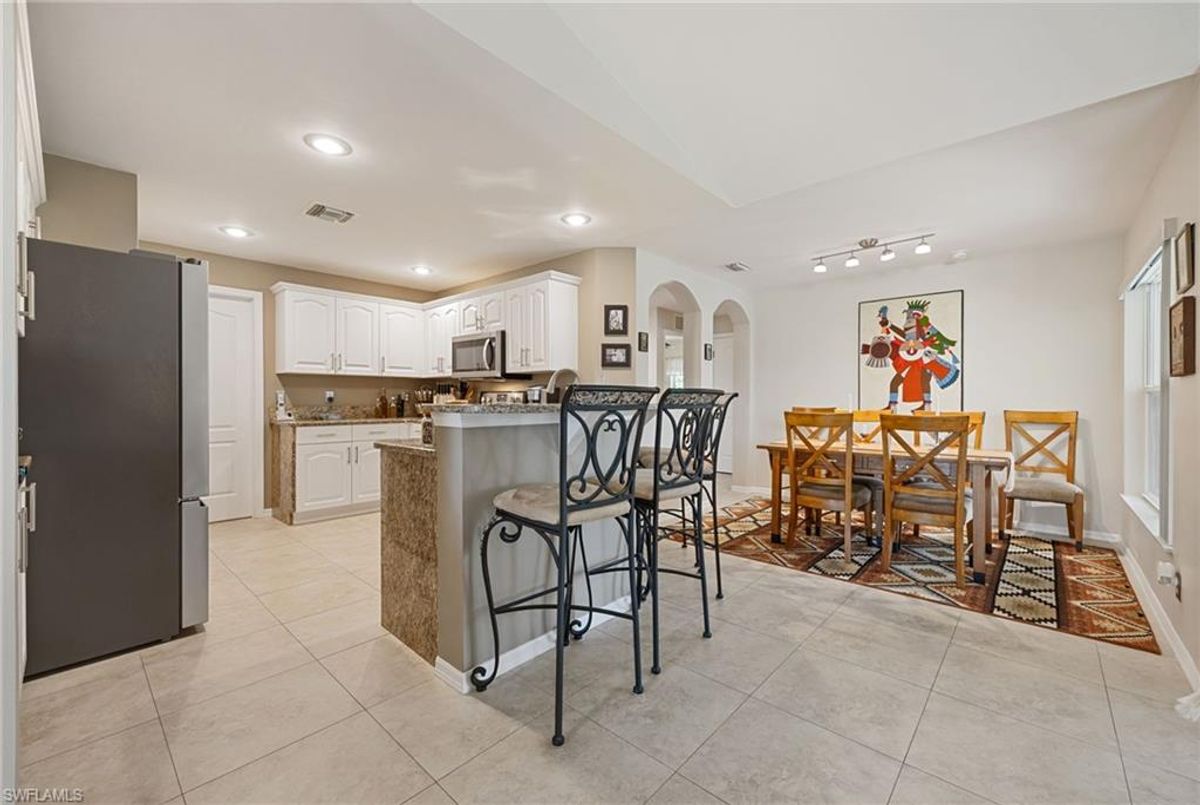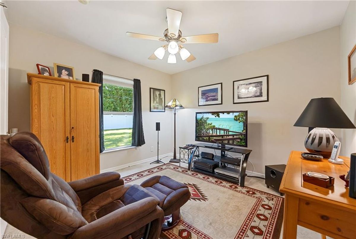 Lovingly maintained and move-in ready, this beautiful 3 bedroom, 2 bathroom home in desirable SW Cape Coral Florida offers comfort, style, and attention to detail at every turn. From the moment you arrive, you’ll be drawn to the lush, tropical landscaping featuring a striking Washingtonia palm in the front yard, complemented by graceful royal palms that create exceptional curb appeal. A beautiful open front porch welcomes you home. Inside you’ll find a spacious open floor plan with 20 inch tile throughout for easy maintenance and timeless appeal. The kitchen is upgraded with Whirlpool stainless steel appliances, including a 31 cubic foot refrigerator and a convection oven, paired with elegant glass front and raised panel cabinets topped with crown molding, 78 feet of granite countertops featuring a waterfall edge, a Kraus dual bowl stainless steel sink, and a pantry, this kitchen perfectly blends functionality and beauty for both everyday living and entertaining. The large primary suite, approximately 16x13, easily accommodates a king sized bed and features sliding doors to the lanai. While the primary bath includes a granite vanity, a walk-in shower with glass doors, and a spacious walk-in closet. Two guest bedrooms, a second full bath and a linen closet are situated on the opposite side of the home, providing a true split bedroom floor plan ideal for family or guests. A dedicated home office features an 8.5 foot built in desk wired for high speed internet, cable, and Ethernet, perfect for remote work, daily organization or school work. The open living and dining areas flow seamlessly together and open through sliding glass doors to an expansive 25 foot under truss lanai with privacy screens and remote controlled ceiling fans, it’s ideal for relaxing or entertaining outdoors. The laundry room off the kitchen gives access to the garage and a storage closet. The fully fenced backyard offers a 6 foot vinyl privacy fence along the back with solar lighting and is stunning at night. There are gates on both sides of the home, ample room for a pool. Majestic oak trees, mature landscaping, and fragrant jasmine and passion flower vines create a tranquil private retreat. Additional upgrades include, a Clopay hurricane rated garage door with battery back up, a Rudd 14 seer air conditioner, a side door in the garage for added convenience, easy install hurricane panels, a 10K electric start Generac generator for peace of mind, and an Aquaboon whole-house water filtration system providing clean, high-quality water throughout. The home also features an architectural shingle roof with a secondary water barrier and a 130 MPH limited lifetime manufacturer warranty, a Rain Bird automatic irrigation system, an Arlo security system with motion lights on all corners, and a renewable flood policy. This exceptional Cape Coral home offers both comfort and value in one of the areas most desirable locations. Close to shopping, dining, parks, and the beautiful Gulf beaches.