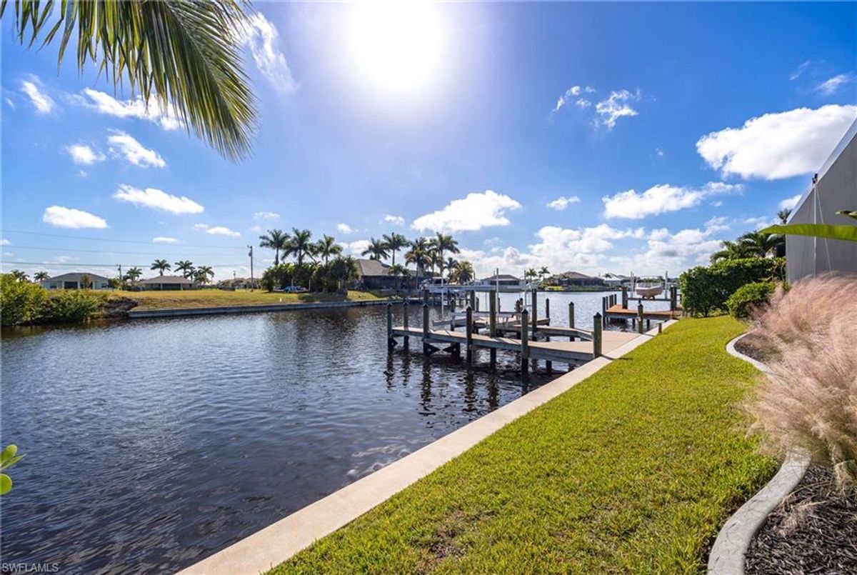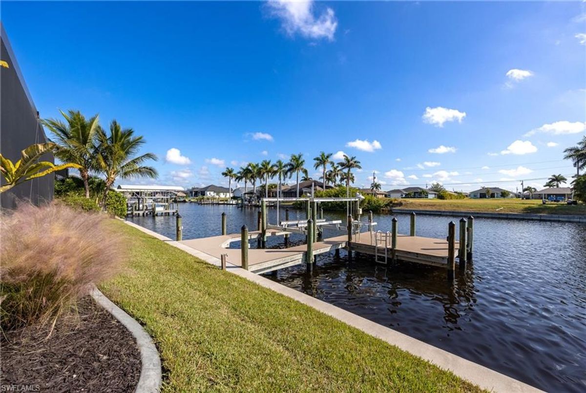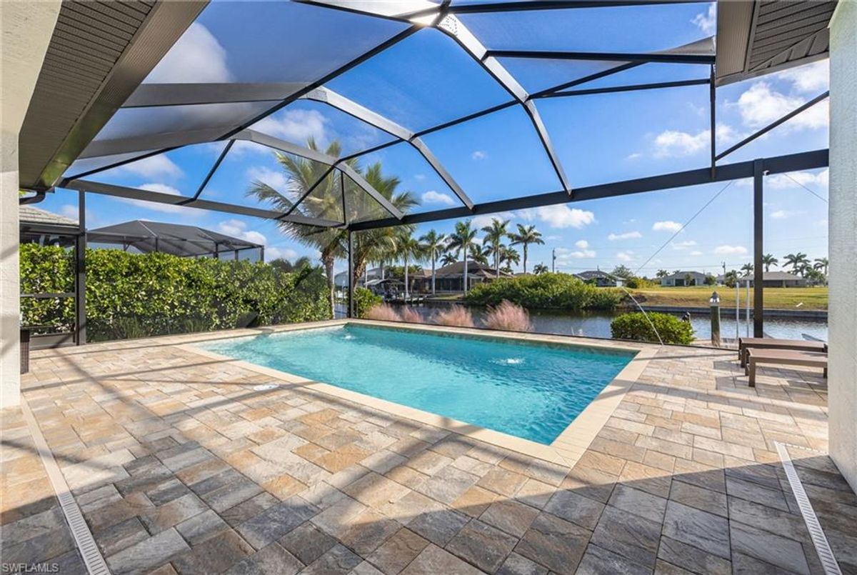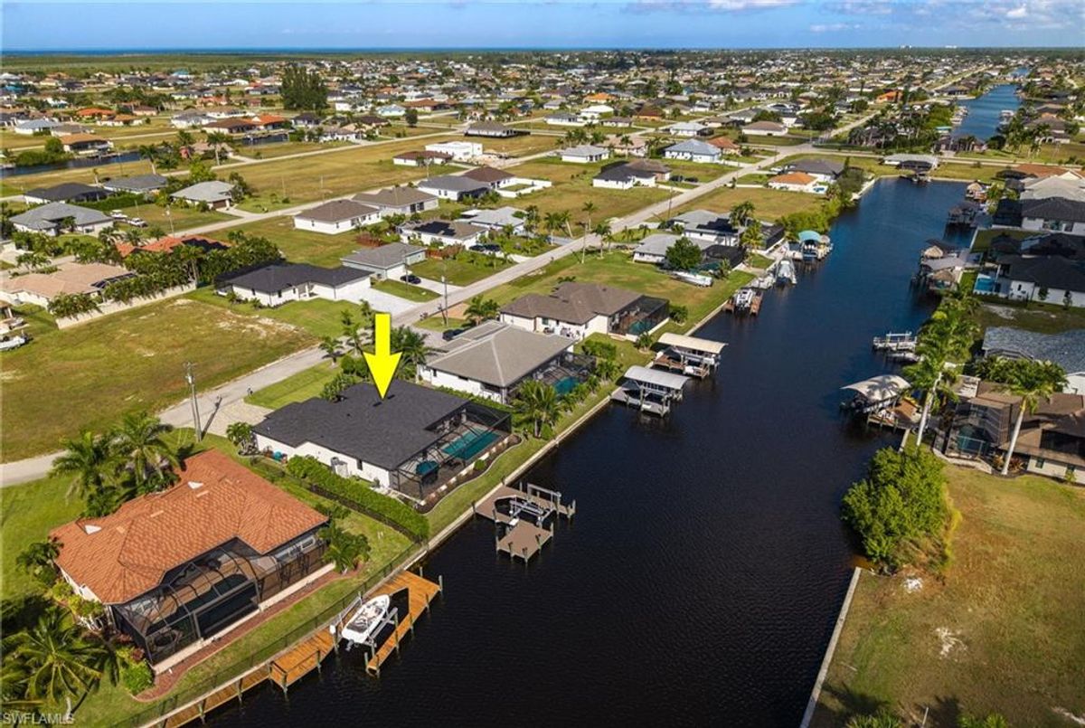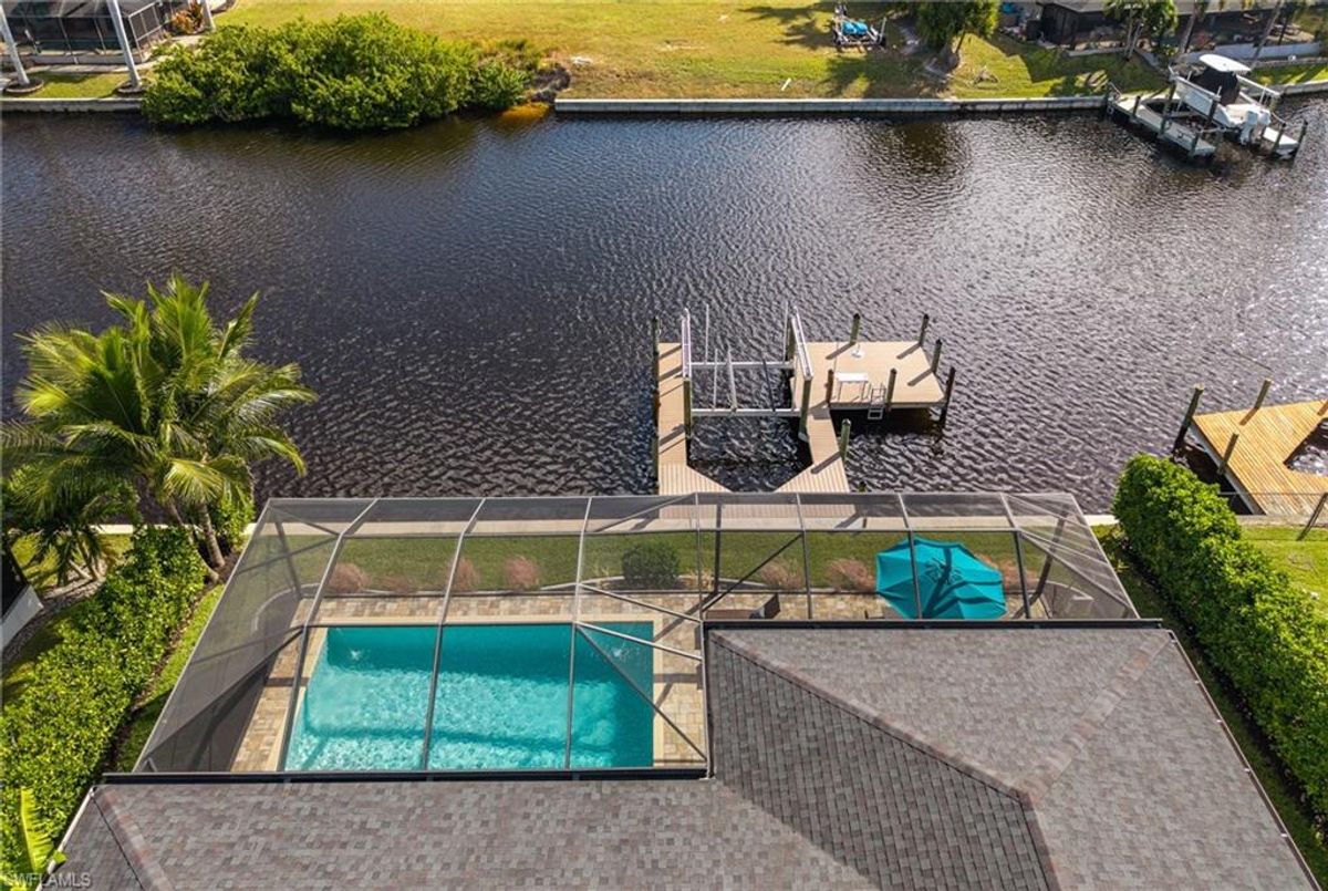 Your dream home and move in ready! Impeccably maintained, this one-owner custom-built 2020 contemporary pool home offers intersecting canal views and over 2,200 sq ft of luxurious living space. Designed for comfort and functionality, it features 3 spacious bedrooms—all with walk-in closets—and 2 large bathrooms, including a guest-accessible pool bath. The flexible floor plan includes a Bonus Room perfect for an office, family room, home gym, playroom, den, or even a mother-in-law suite/wing. Additional highlights include an extra-deep 3-car garage, a family-style kitchen ideal for gatherings, and a distinctive mudroom/laundry room with a built-in drop zone for everyday convenience. Enjoy finishes like tile flooring throughout, crown molding, tray ceilings, impact doors and windows, and an added benefit, a whole-house reverse osmosis system. The open great room flows seamlessly to a screened lanai with a wood-inlaid ceiling, a panoramic pool cage with super screen, and a sparkling pool—your private oasis for entertaining or relaxing in the sun. Outside, you'll find a composite captains walk dock with custom lighting and a 10,000 lb boat lift. Prime location with effortless Gulf of America boating access — only one 10' bridge (the highest max water height in the NW) between you and open water. Cast off and you’re instantly on your way to incredible boating, world-class fishing, and endless sunshine. Plus, affordable flood insurance at just $968 annually provides peace of mind. Located in a rapidly growing area of Cape Coral, surrounded by newer homes and close to exciting developments like the Seven Islands Project and the recently completed Crystal Lake Park. Check out the video link! This isn’t just a listing—it’s a lifestyle!