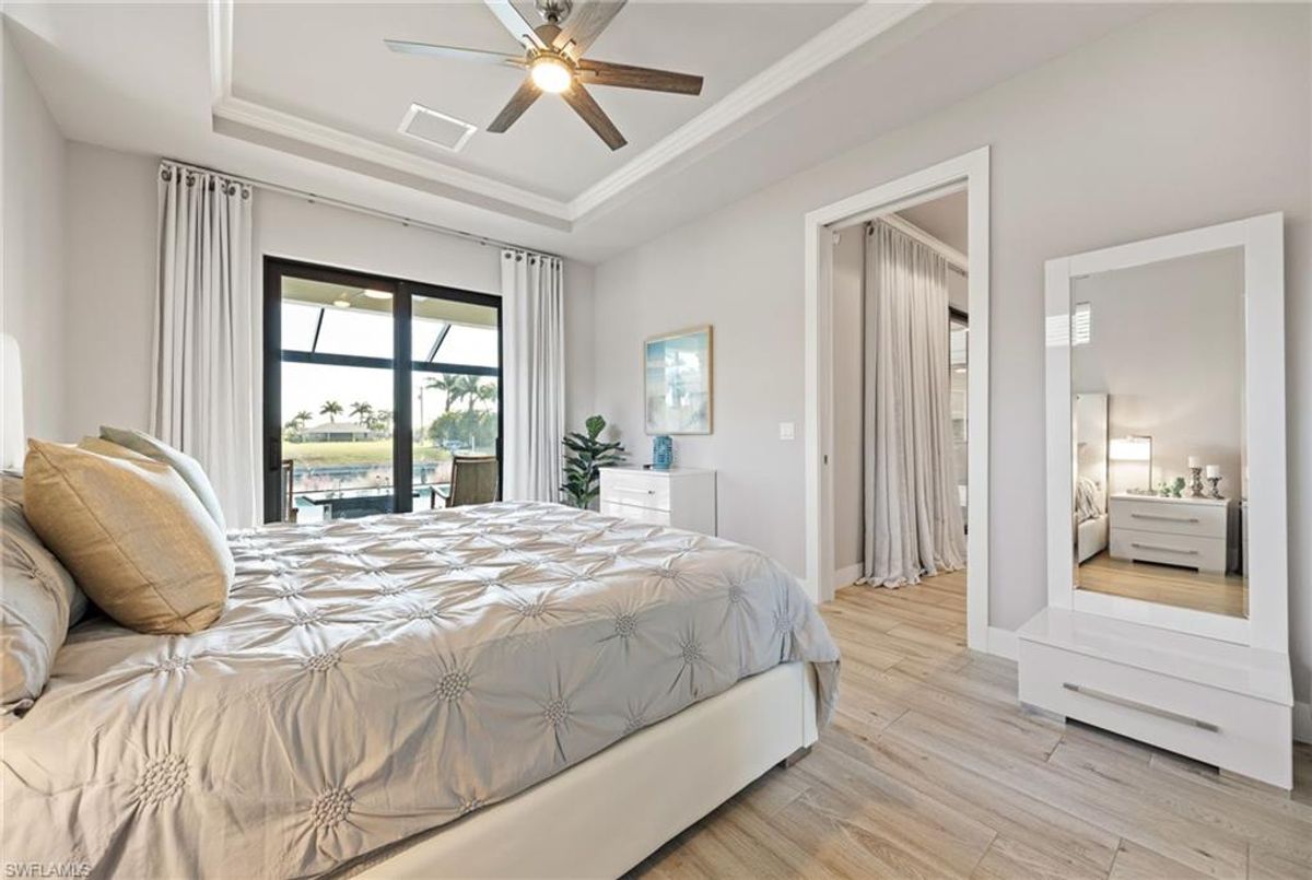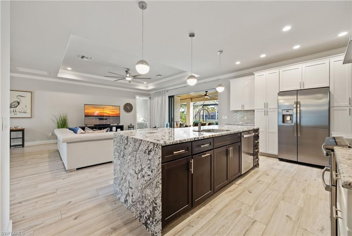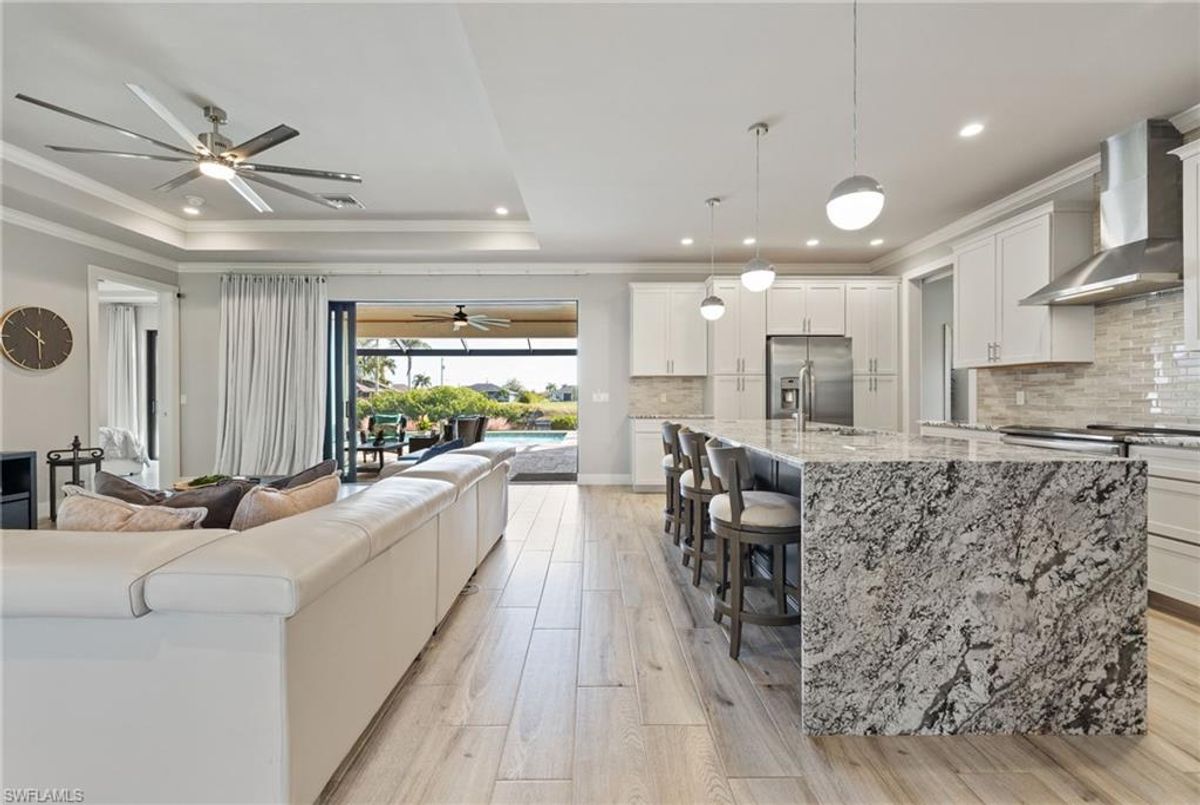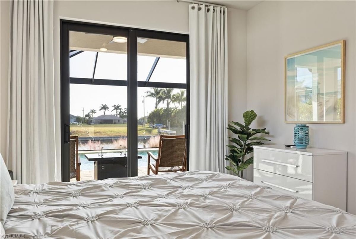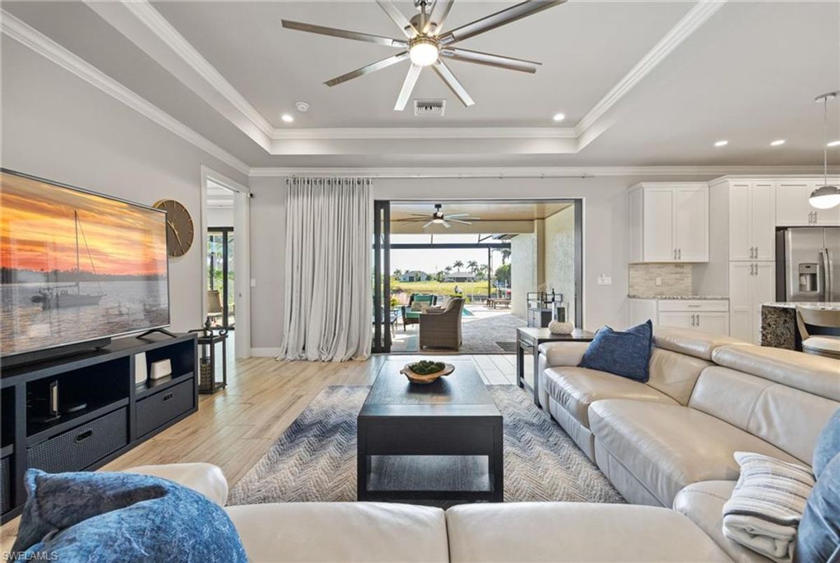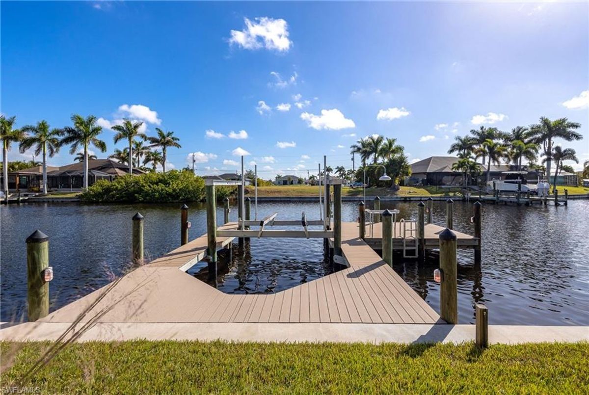 Your dream home and move in ready! Impeccably maintained, this one-owner custom-built 2020 contemporary pool home offers intersecting canal views and over 2,200 sq ft of luxurious living space. Designed for comfort and functionality, it features 3 spacious bedrooms—all with walk-in closets—and 2 large bathrooms, including a guest-accessible pool bath. The flexible floor plan includes a Bonus Room perfect for an office, family room, home gym, playroom, den, or even a mother-in-law suite/wing. Additional highlights include an extra-deep 3-car garage, a family-style kitchen ideal for gatherings, and a distinctive mudroom/laundry room with a built-in drop zone for everyday convenience. Enjoy finishes like tile flooring throughout, crown molding, tray ceilings, impact doors and windows, and an added benefit, a whole-house reverse osmosis system. The open great room flows seamlessly to a screened lanai with a wood-inlaid ceiling, a panoramic pool cage with super screen, and a sparkling pool—your private oasis for entertaining or relaxing in the sun. Outside, you'll find a composite captains walk dock with custom lighting and a 10,000 lb boat lift. Prime location with effortless Gulf of America boating access — only one 10' bridge (the highest max water height in the NW) between you and open water. Cast off and you’re instantly on your way to incredible boating, world-class fishing, and endless sunshine. Plus, affordable flood insurance at just $968 annually provides peace of mind. Located in a rapidly growing area of Cape Coral, surrounded by newer homes and close to exciting developments like the Seven Islands Project and the recently completed Crystal Lake Park. Check out the video link! This isn’t just a listing—it’s a lifestyle!