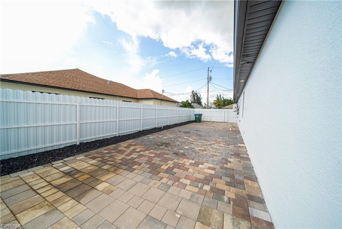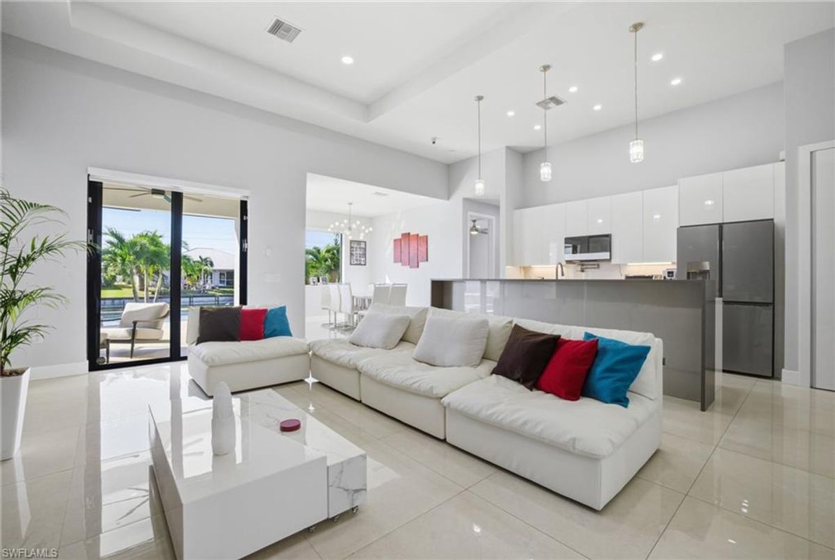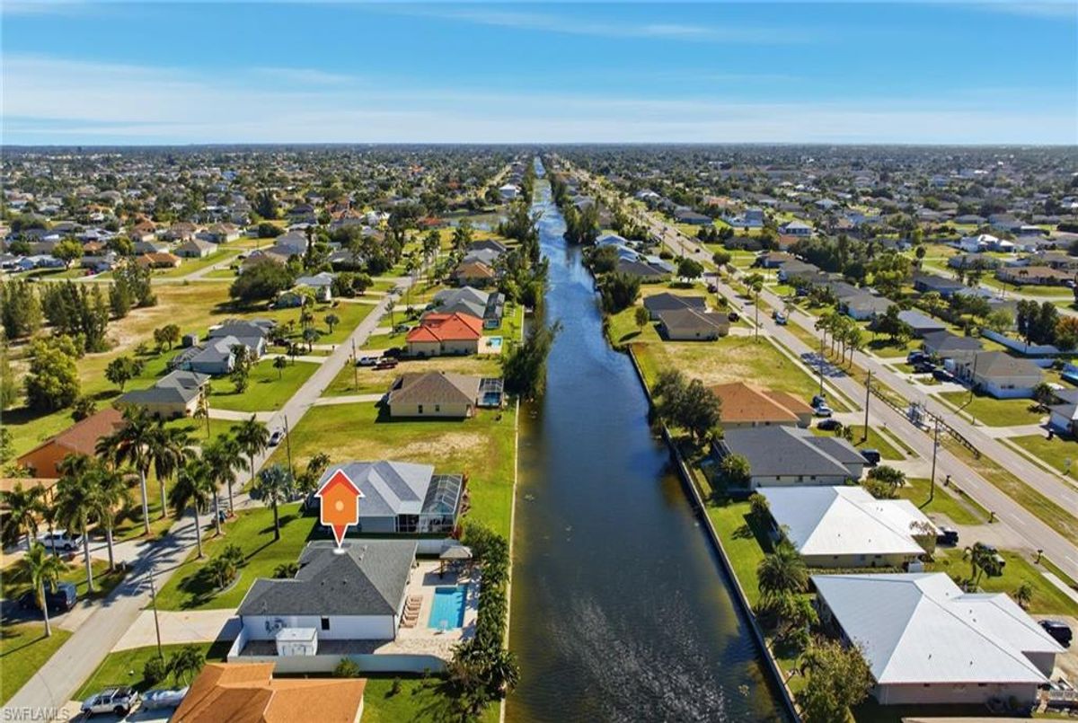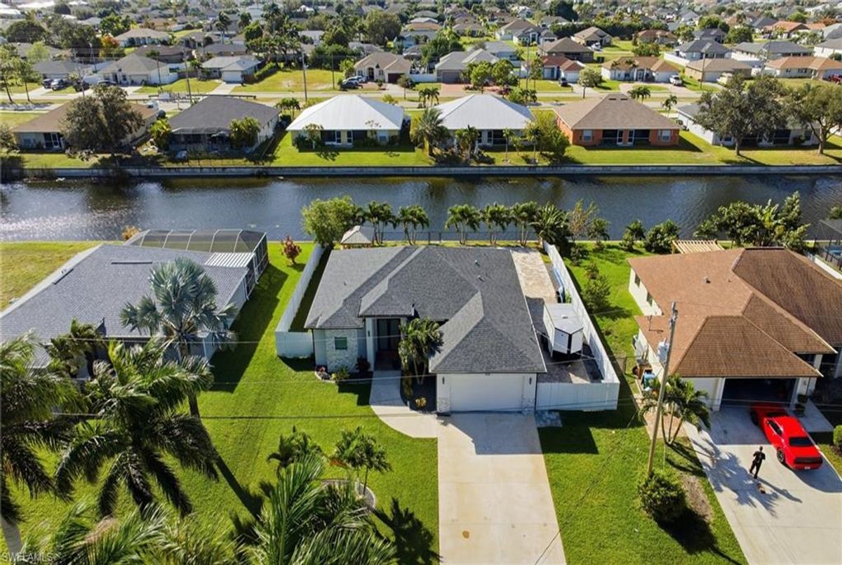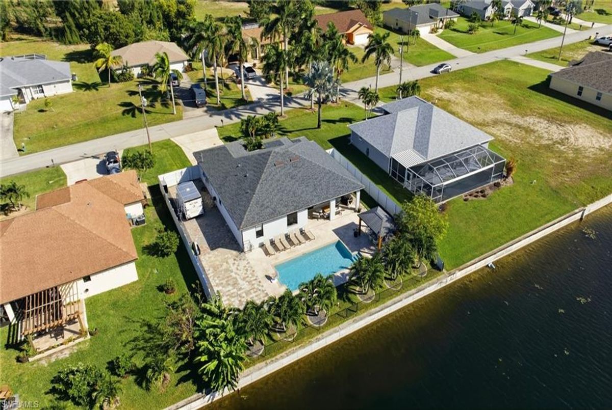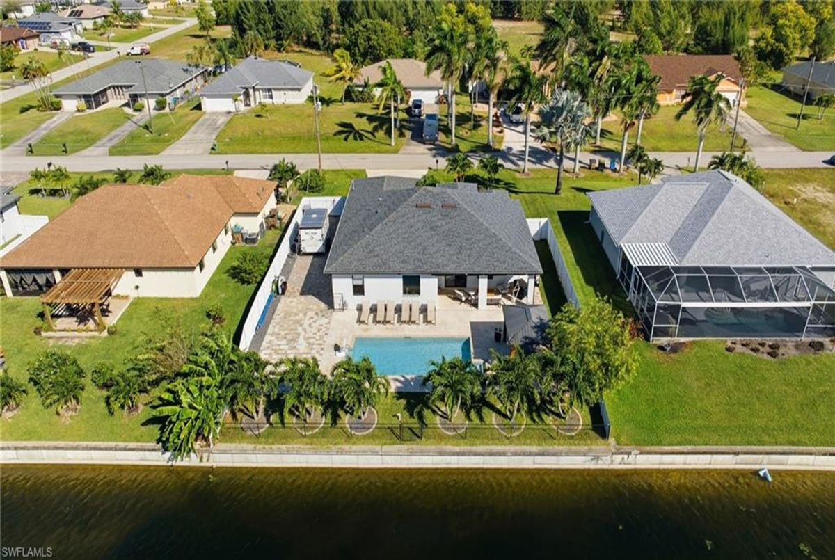 This beautifully designed, new construction waterfront home perfectly blends modern style, comfort, and Florida living. Situated on a wide canal in one of Cape Coral’s most desirable areas, this property offers peaceful water views and plenty of outdoor space to relax or entertain. Step inside to discover a bright, open-concept layout with soaring ceilings, contemporary finishes, and abundant natural light. The kitchen features sleek cabinetry, stainless steel appliances, and a spacious island—ideal for both cooking and entertaining. Every upgrade in this home was carefully thought out, creating a perfect balance of design and functionality. The living area flows seamlessly to the expansive open lanai and oversized patio, where a sparkling pool surrounded by stunning travertine tile awaits. Not only does the travertine add timeless elegance, but it also stays cool underfoot—perfect for sunny Florida days. Whether you’re lounging poolside, dining outdoors, or taking in the serene canal views, this backyard is your personal oasis. Built for peace of mind and efficiency, this home includes impact-resistant windows and doors, energy-efficient systems, and is located in a NO FLOOD ZONE, providing lasting value and security. RV Parking & Hookup. ONE YEAR HOME WARRANTY INCLUDED Move-in ready and offering everything you could want in a Florida dream home, this immaculate property is ideal for full-time living, a seasonal escape, or a smart investment. Don’t miss your chance to own this piece of paradise—schedule your private showing today