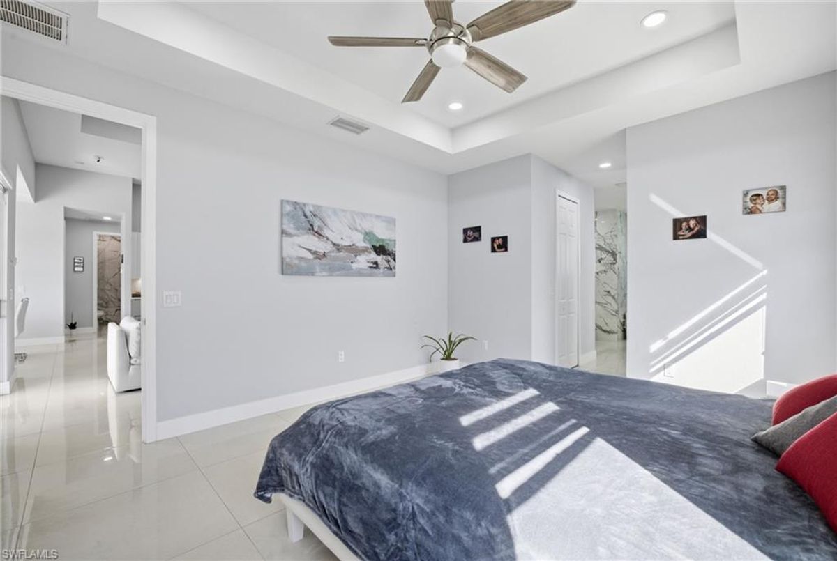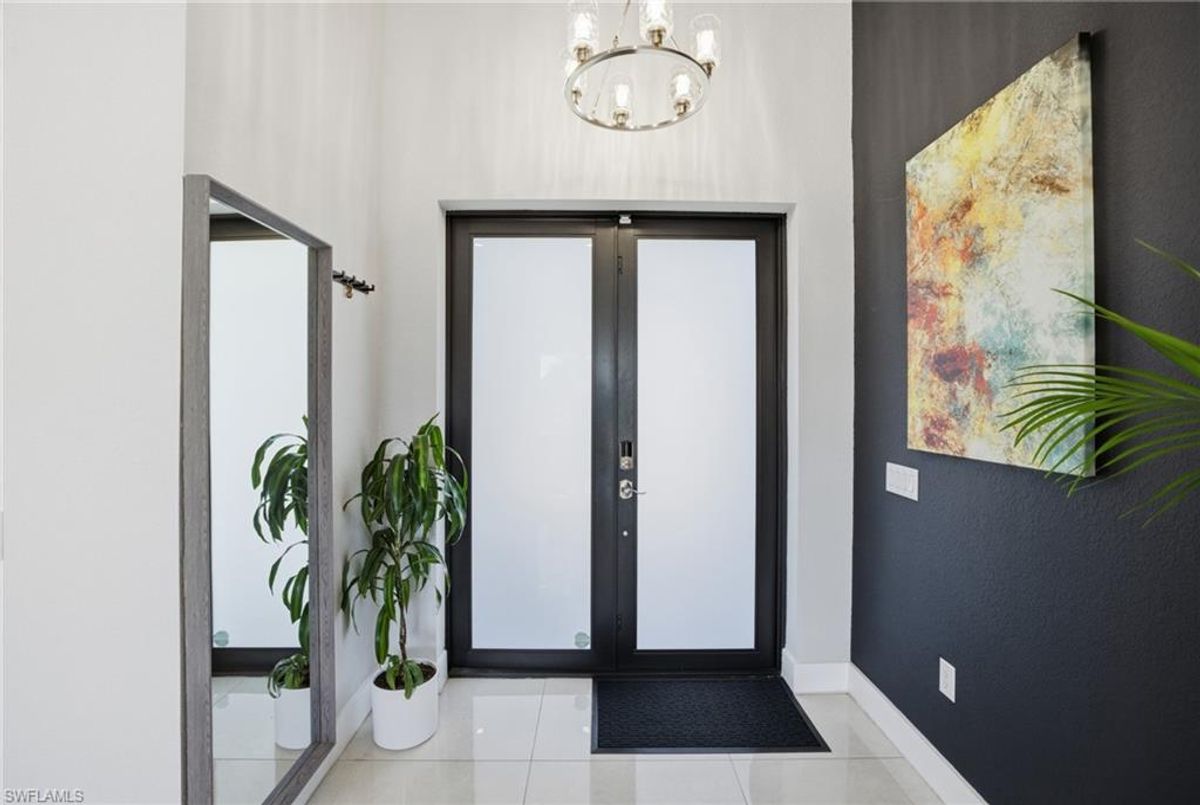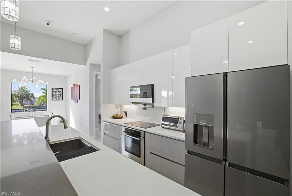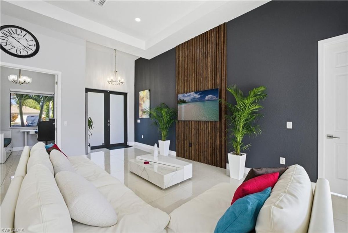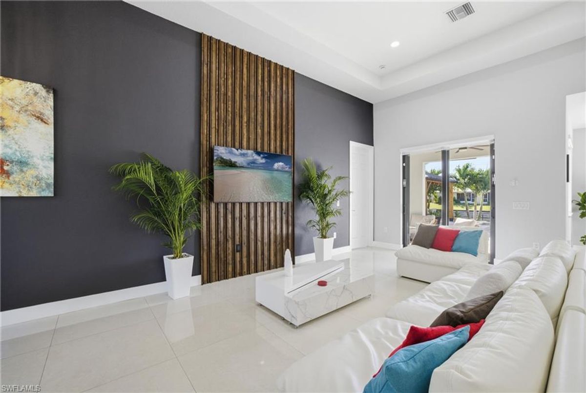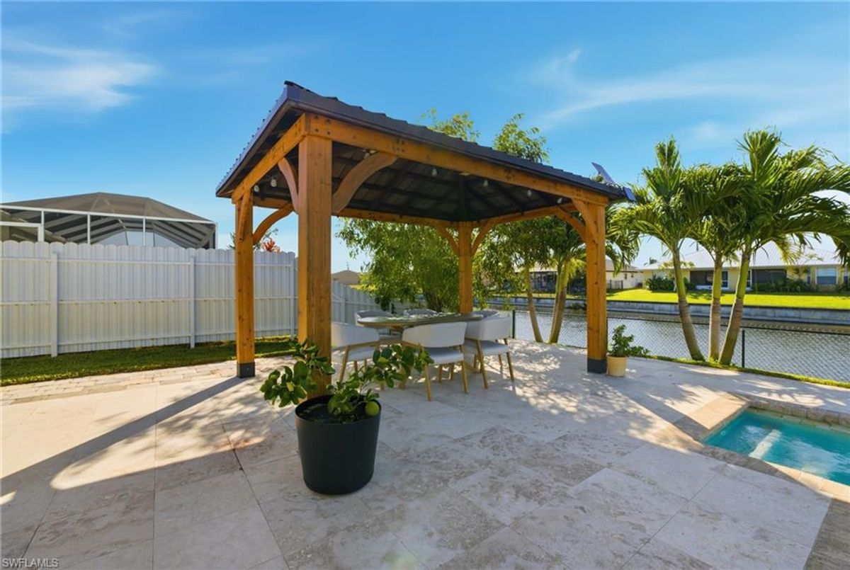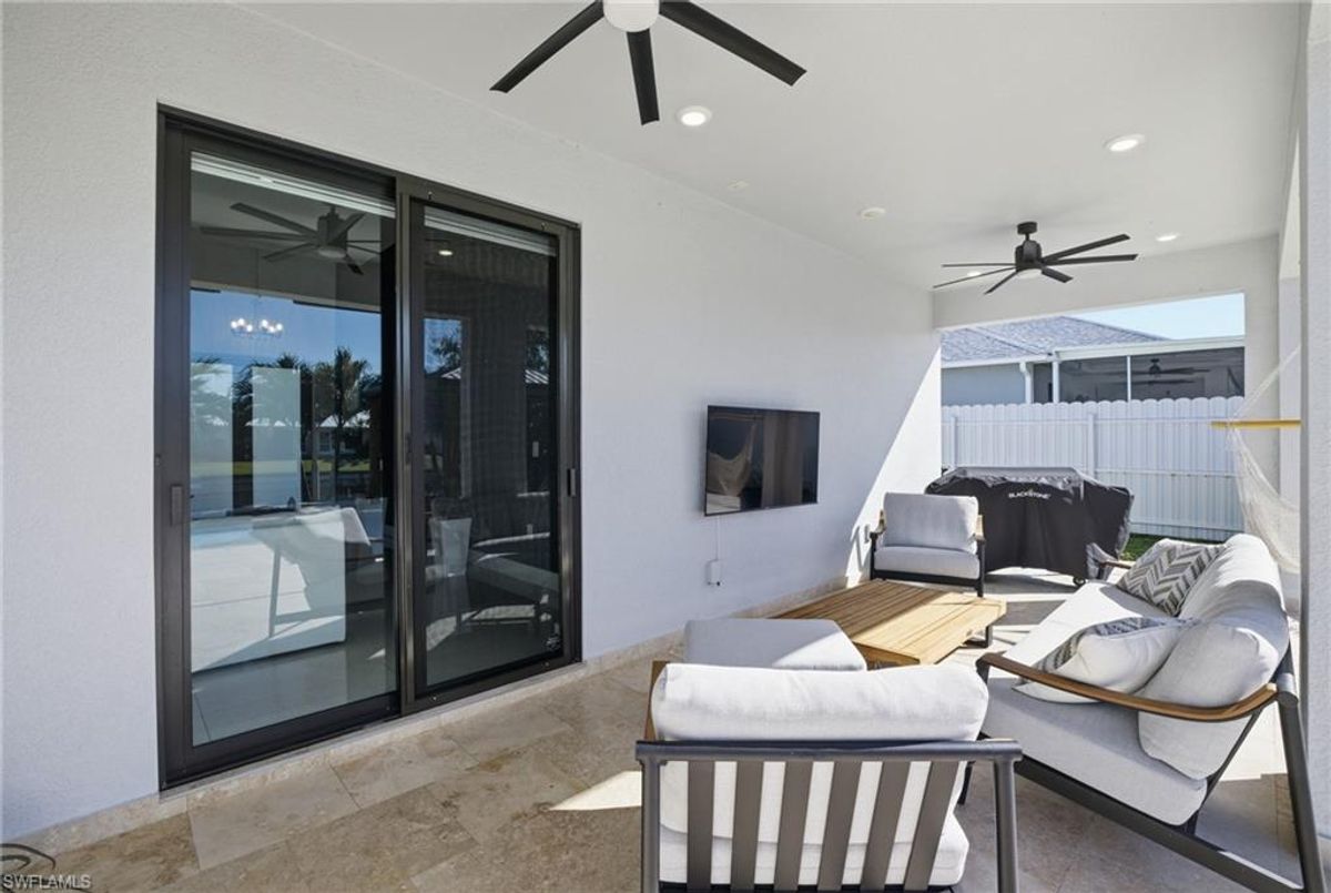This beautifully designed, new construction waterfront home perfectly blends modern style, comfort, and Florida living. Situated on a wide canal in one of Cape Coral’s most desirable areas, this property offers peaceful water views and plenty of outdoor space to relax or entertain. Step inside to discover a bright, open-concept layout with soaring ceilings, contemporary finishes, and abundant natural light. The kitchen features sleek cabinetry, stainless steel appliances, and a spacious island—ideal for both cooking and entertaining. Every upgrade in this home was carefully thought out, creating a perfect balance of design and functionality. The living area flows seamlessly to the expansive open lanai and oversized patio, where a sparkling pool surrounded by stunning travertine tile awaits. Not only does the travertine add timeless elegance, but it also stays cool underfoot—perfect for sunny Florida days. Whether you’re lounging poolside, dining outdoors, or taking in the serene canal views, this backyard is your personal oasis. Built for peace of mind and efficiency, this home includes impact-resistant windows and doors, energy-efficient systems, and is located in a NO FLOOD ZONE, providing lasting value and security. RV Parking & Hookup. ONE YEAR HOME WARRANTY INCLUDED Move-in ready and offering everything you could want in a Florida dream home, this immaculate property is ideal for full-time living, a seasonal escape, or a smart investment. Don’t miss your chance to own this piece of paradise—schedule your private showing today