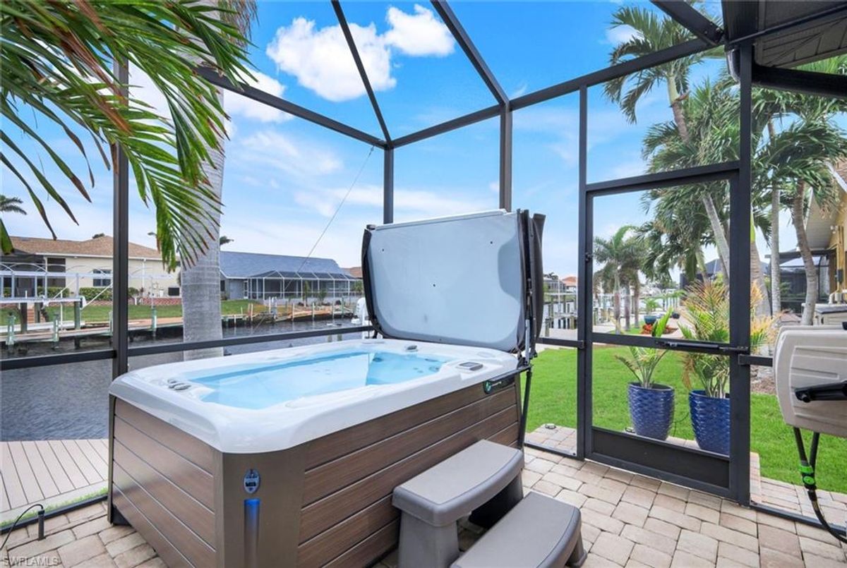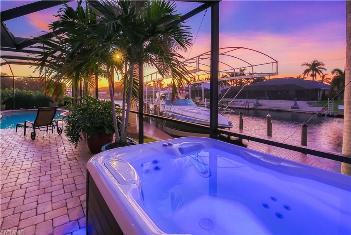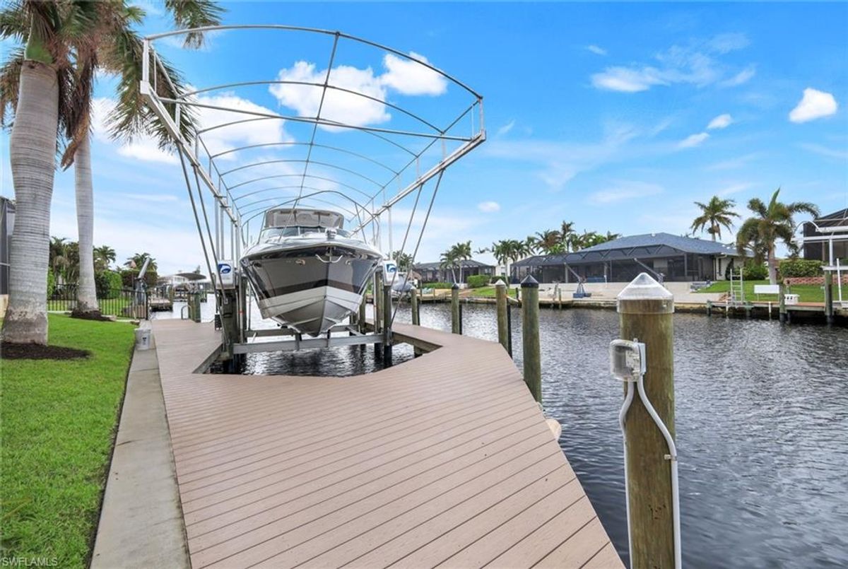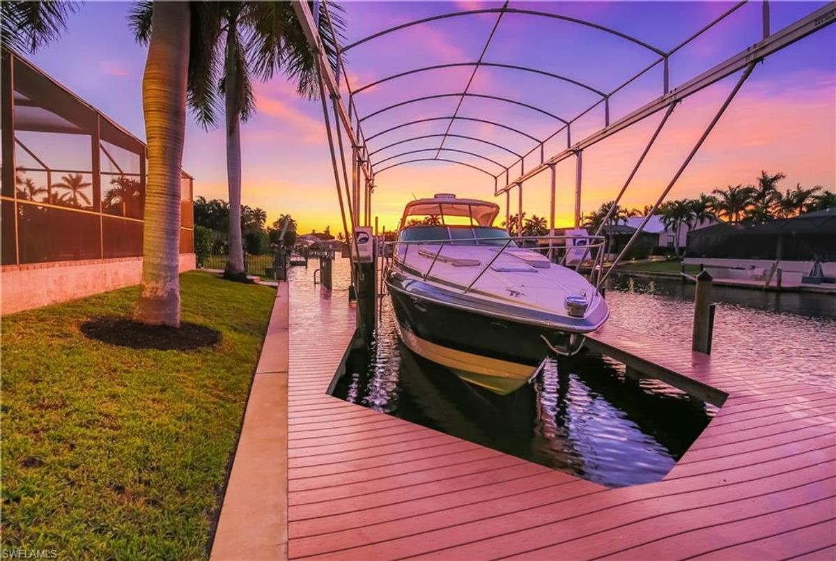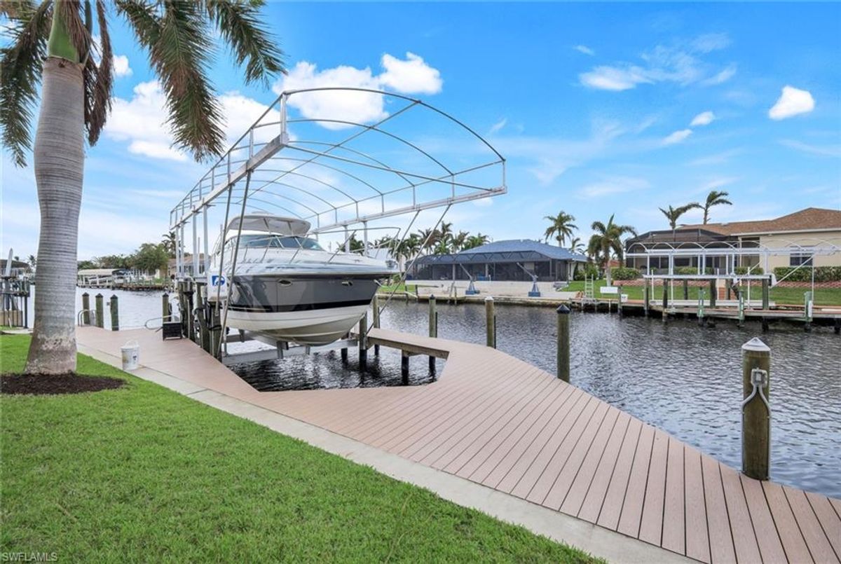 Welcome to 1432 SW 53rd Terrace, where luxury meets the excitement of Florida waterfront living. This custom-built Aubuchon Homes residence, completely remodeled in 2022, offers the ultimate blend of sophistication, comfort, and coastal charm. Featuring 5 spacious bedrooms, 3 full bathrooms, and a 3-car garage, this stunning home is situated on a direct Gulf-access canal—just minutes from open waters—making it a true boater’s paradise. The southern exposure ensures all-day sunshine over the resort-style pool area, complete with an electric-heated pool and spa, outdoor shower, and extended under-truss lanai with 90-degree disappearing sliders that seamlessly connect indoor and outdoor living. The summer kitchen is an entertainer’s dream, featuring an Artisan grill, Euhomy ice maker, and Trade-Wind vent hood, plus a convenient storage closet for all your poolside essentials. Inside, an open-concept floor plan and high baseboards set the tone for refined living. The chef-inspired kitchen boasts a walk-in pantry, separate prep island, KitchenAid refrigerator, GE Profile oven and microwave, and beverage coolers—perfect for hosting. The tray-ceiling master suite offers private lanai access through sliding doors, a custom walk-in closet with built-in organizer and safe, and a spa-like bathroom featuring a soaking tub, dual vanities, and a walk-in shower with dual shower heads. Additional highlights include a walk-around dock with a 25,000 lb boat lift, electric and water hookups at the dock, a Maytag washer and dryer, and epoxy-finished garage floors with walk-in storage, laundry tub, and attic access via pull-down stairs. The decorative double front doors, paver driveway and lanai, and lush tropical landscaping with mature palms complete this picture-perfect retreat. This exceptional Cape Coral residence captures the essence of luxury coastal living—where every detail is designed for elegance, comfort, and adventure on the water.