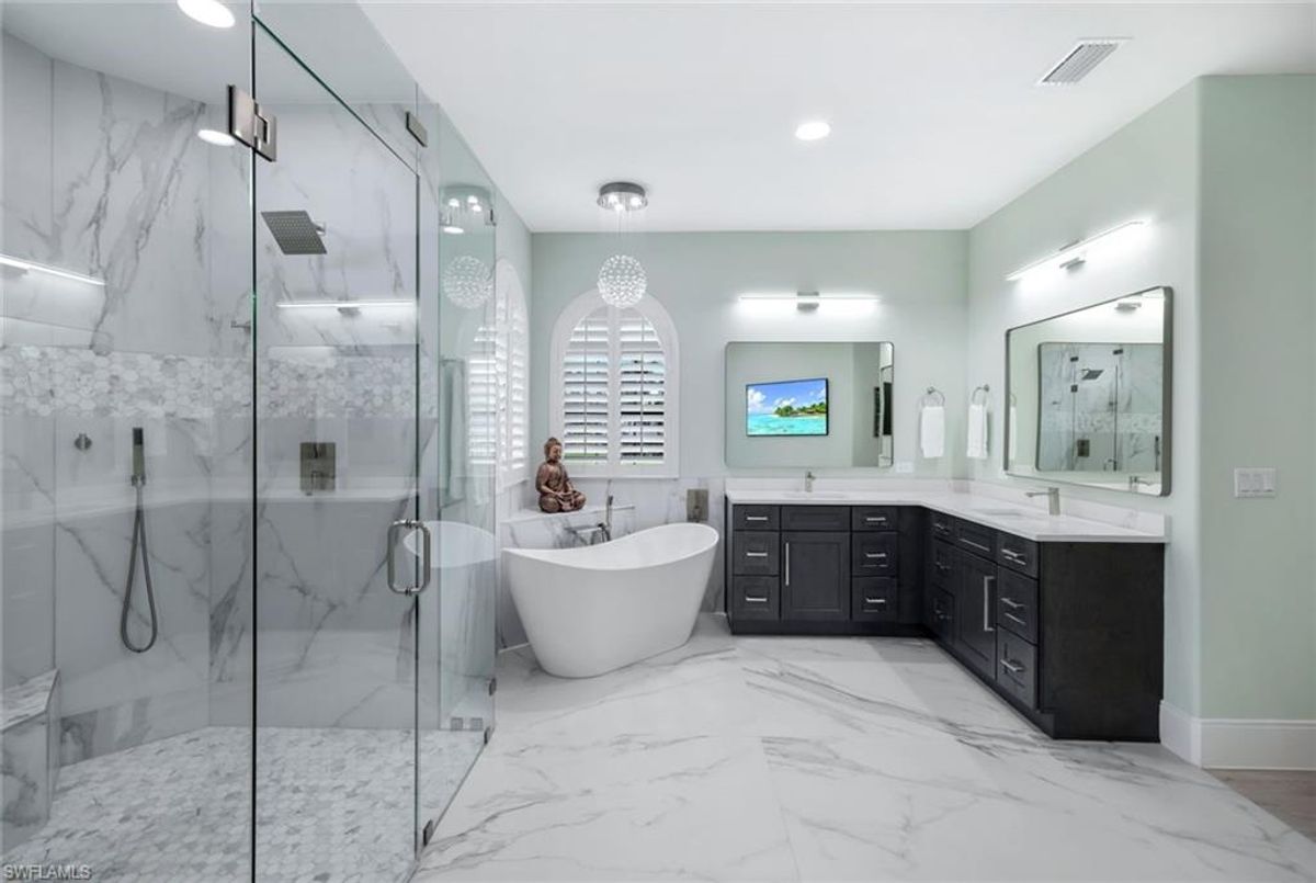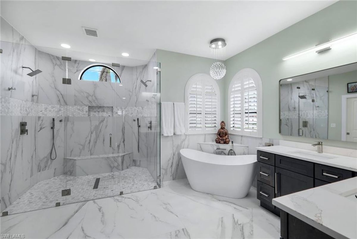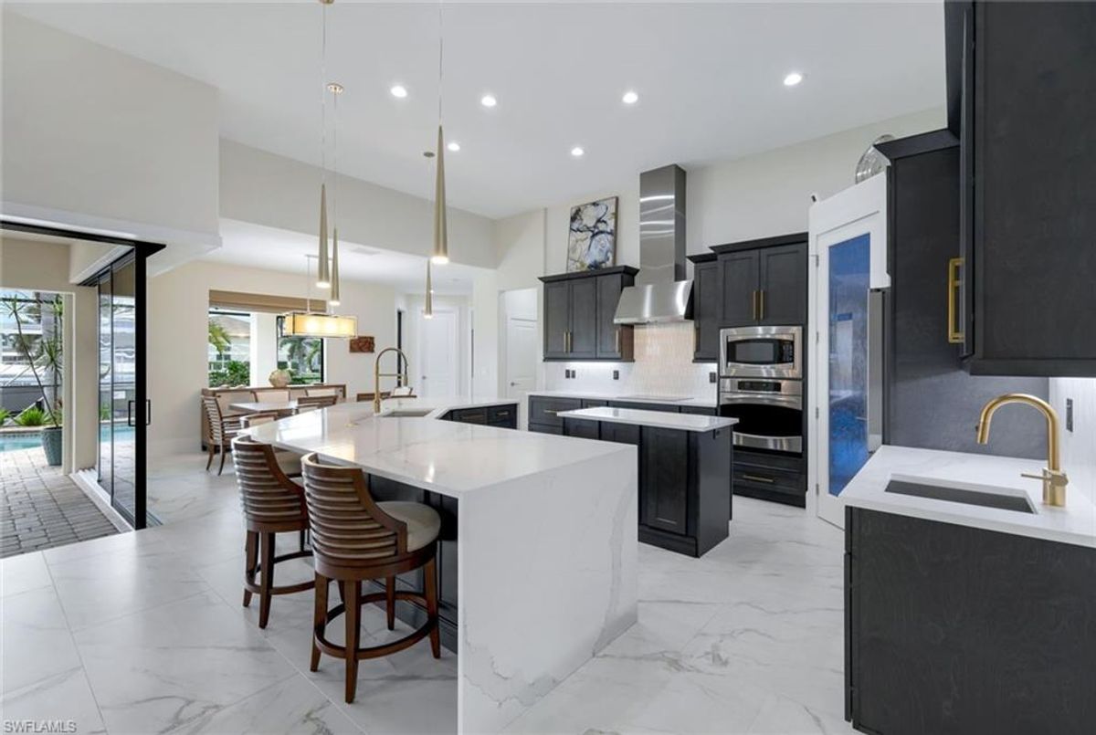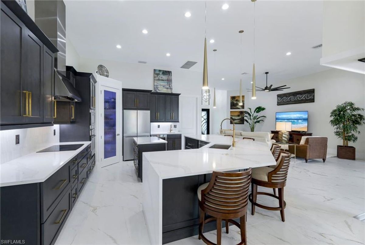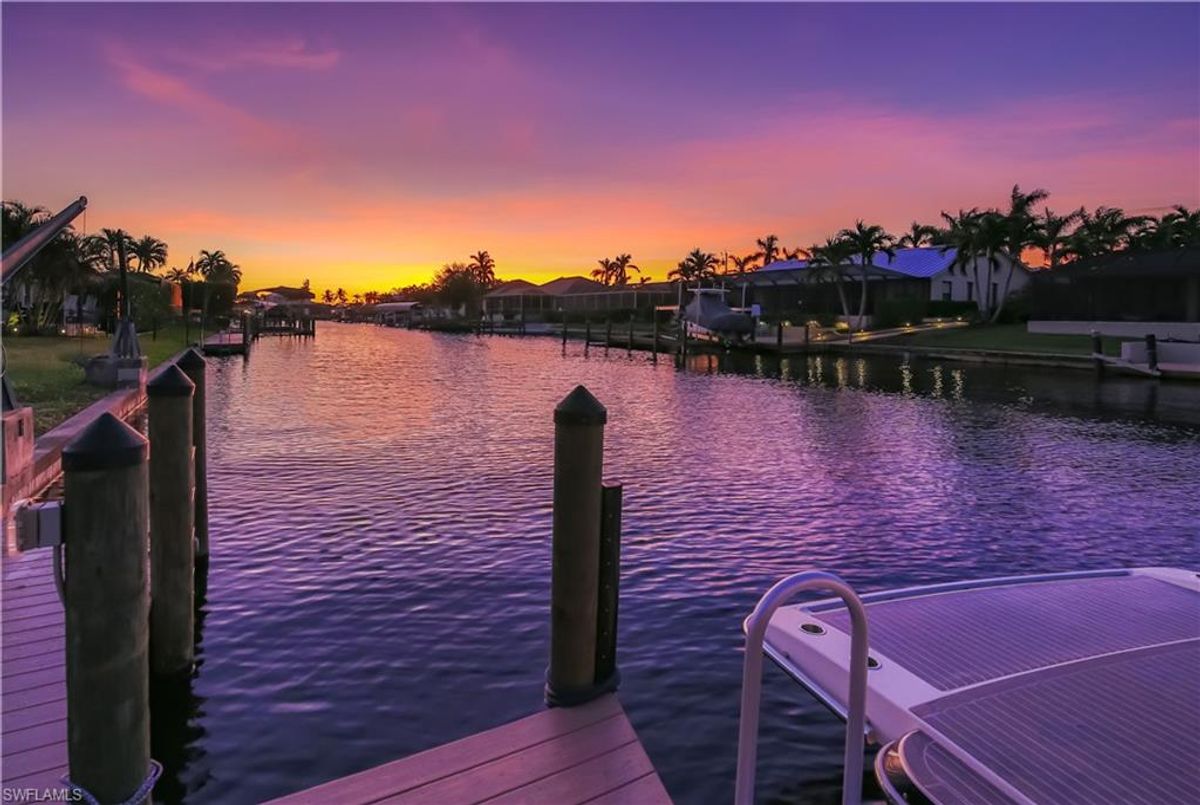 Welcome to 1432 SW 53rd Terrace, where luxury meets the excitement of Florida waterfront living. This custom-built Aubuchon Homes residence, completely remodeled in 2022, offers the ultimate blend of sophistication, comfort, and coastal charm. Featuring 5 spacious bedrooms, 3 full bathrooms, and a 3-car garage, this stunning home is situated on a direct Gulf-access canal—just minutes from open waters—making it a true boater’s paradise. The southern exposure ensures all-day sunshine over the resort-style pool area, complete with an electric-heated pool and spa, outdoor shower, and extended under-truss lanai with 90-degree disappearing sliders that seamlessly connect indoor and outdoor living. The summer kitchen is an entertainer’s dream, featuring an Artisan grill, Euhomy ice maker, and Trade-Wind vent hood, plus a convenient storage closet for all your poolside essentials. Inside, an open-concept floor plan and high baseboards set the tone for refined living. The chef-inspired kitchen boasts a walk-in pantry, separate prep island, KitchenAid refrigerator, GE Profile oven and microwave, and beverage coolers—perfect for hosting. The tray-ceiling master suite offers private lanai access through sliding doors, a custom walk-in closet with built-in organizer and safe, and a spa-like bathroom featuring a soaking tub, dual vanities, and a walk-in shower with dual shower heads. Additional highlights include a walk-around dock with a 25,000 lb boat lift, electric and water hookups at the dock, a Maytag washer and dryer, and epoxy-finished garage floors with walk-in storage, laundry tub, and attic access via pull-down stairs. The decorative double front doors, paver driveway and lanai, and lush tropical landscaping with mature palms complete this picture-perfect retreat. This exceptional Cape Coral residence captures the essence of luxury coastal living—where every detail is designed for elegance, comfort, and adventure on the water.