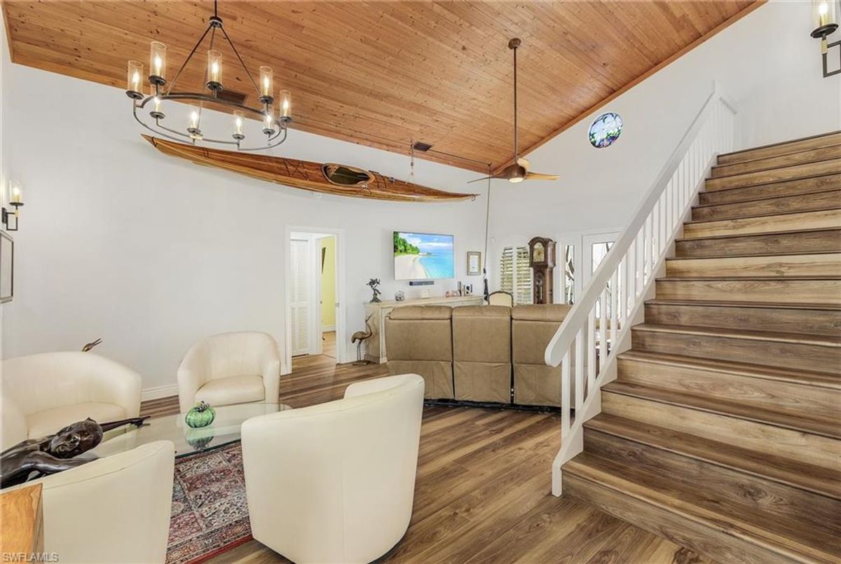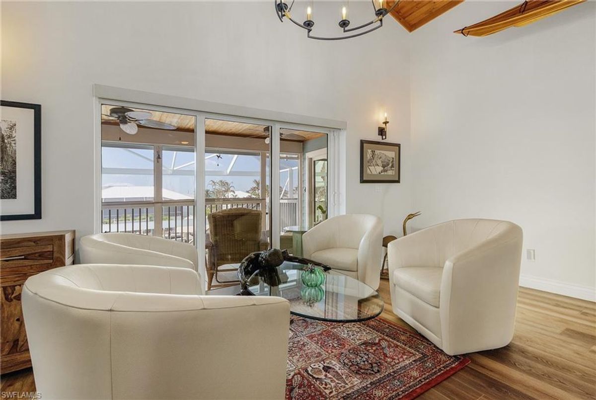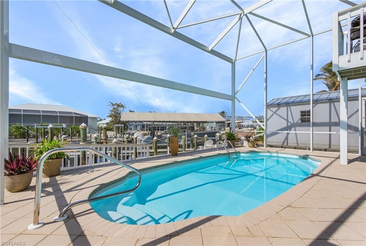 SAILORS AND POWER BOATERS WANTED!!! This stunning and completely remodeled waterfront three-story pool home is a water enthusiast’s paradise! Be on the ICW or the Gulf of Mexico within minutes, with no bridges or locks to navigate. The extensive waterfront is comprised of a large 14’ x 40’ slip, and an 8K lb. covered boat lift. There is a large custom designed small craft floating dock with a hinged kayak launch and a safety assist bar for easy access. You will enjoy serving cocktails and watching the sunsets from the custom Tiki bar with sink, bar refrigerator, and light filtering / privacy screens. The driveway has a large concrete RV pad with twin 50 amp service, and water & sewer connections. The professionally landscaped grounds are designed to be low maintenance. The home has all new exterior Hardie plank & shingle siding, a 1.5” Snap-lock Standing Seam System aluminum roof (no exposed screws), with a 25 year warranty, new facia, soffits, & gutters, new impact rated vinyl insulated Low-E, Argon windows, doors, and a custom made front entry door & sidelights with an ocean dune sea grass design. There is a new HVAC system (2024) with a variable speed high efficiency air handler, with both a Reme Halo & Fresh Air UV air purifying units, an exterior cargo lift, and a resurfaced pool, with a new 2 story panoramic lanai enclosure. The ground floor includes approx. 912 sqft of two air conditioned shop spaces with impact rated insulated French doors & windows. One is used as a wood shop with sound proofed 8” interior walls and a sound proof closet for the compressor. The flooring has comfortable rubber tiles, and there is a storm rated electric roll up garage door & an electric roll up insect screen. There are (4) dedicated 20 amp circuits for power equipment. The 2nd shop/craft area is being used as an artist/quilt studio and includes a ½ bath and LVP flooring. The handicap accessible interior boasts new LVP flooring throughout, large profile base & door moldings, plantation shutters and custom shades, plus a complete alarm system including sheds, which also monitors for fire, smoke, and motion in the house & shops. The chef’s kitchen is custom designed with all new custom cabinets, new appliances, double wall oven, induction cook top, outside vented exhaust fan, center island, and a butler’s pantry, all with stunning solid surface stone countertops. The laundry room includes a full-size freezer & utility sink. The spacious & private master suite is upstairs with a large West facing balcony overlooking the canal where you can watch the evening sunsets with views of San Carlos Bay and Sanibel Island. The 4th story Cupola has unobstructed breath-taking distant views of Sanibel. This exquisite Pine Island home is on the Southern tip of the Island, and must be viewed to truly appreciate every finely executed detail. Please view the video to see how easy it is to launch your kayak and not get wet!