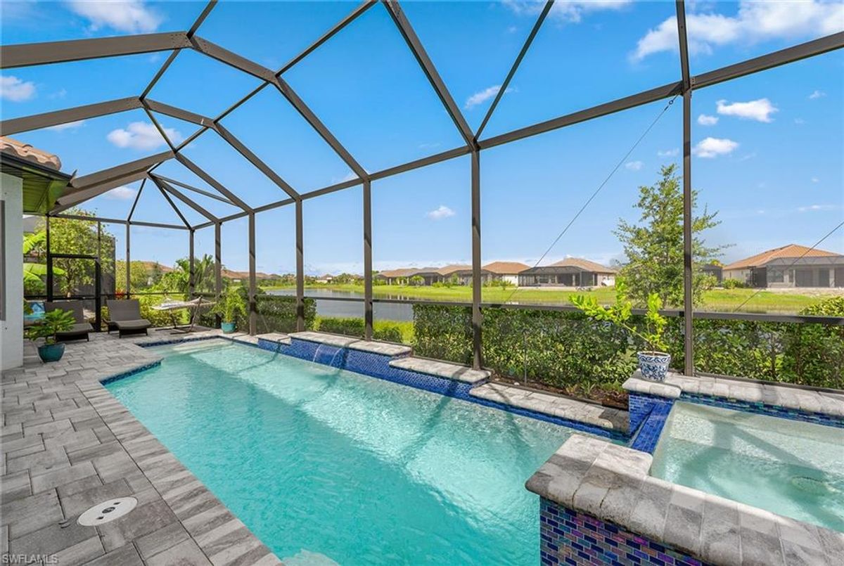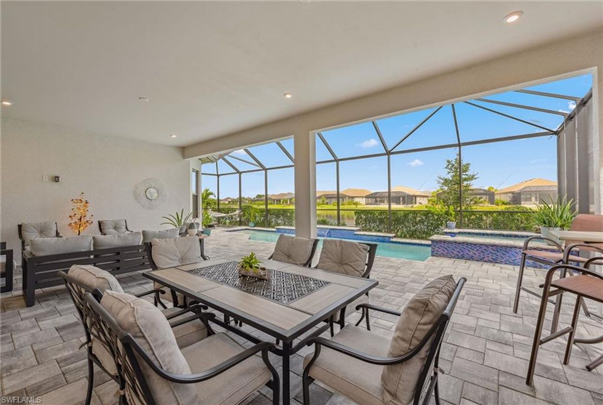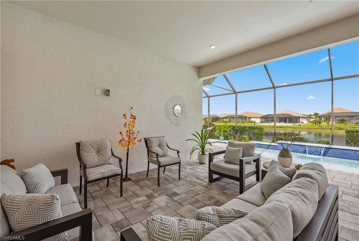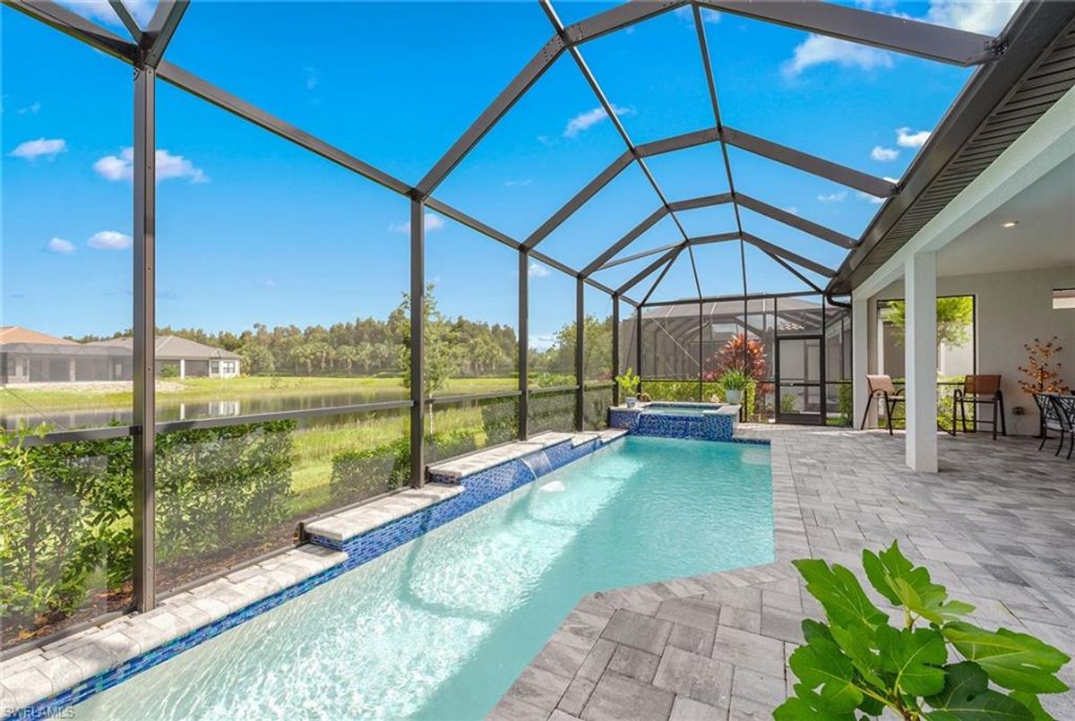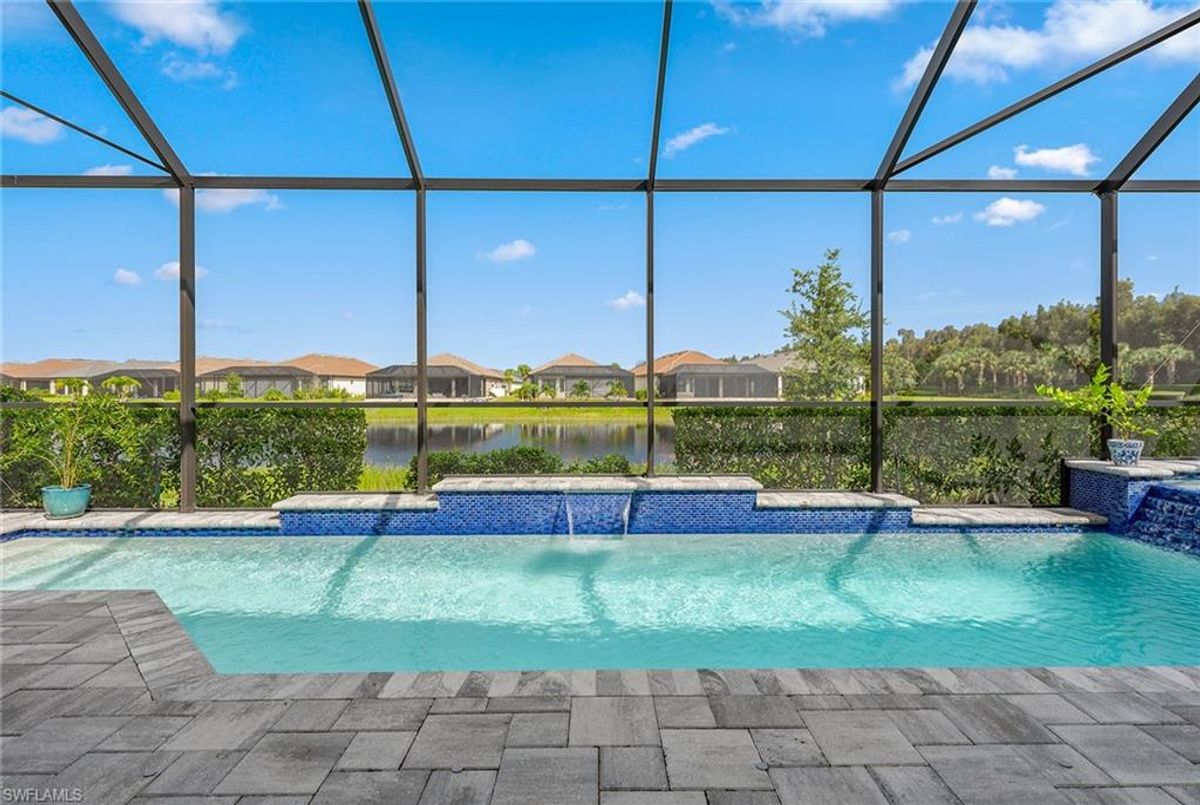 This stunning like-new modern single-family pool home, built in 2022, is in the highly sought-after Esplanade at Hacienda Lakes. With tranquil water views, this 2,929-square-foot popular Pallazio residence offers three bedrooms plus a den, three full baths and a two-car garage. Designed with a dramatic double door entry into a massive great room that opens up to the outside, this home ideally blends comfort with sophisticated style. Inside, you’ll find extensive custom details and a thoughtfully designed split-bedroom layout with 10-foot ceilings, elegant tile flooring and recessed lighting. Natural light floods the living areas through abundant windows. The kitchen is a chef’s dream, featuring an extended layout with shaker-style cabinets with under-cabinet lighting, a tile backsplash, quartz countertops, exquisite fixtures, walk-in pantry and a large island with a prep sink with storage. The upgraded appliances include a gas cooktop with a warming tray and hood, double-wall oven, microwave, French door refrigerator, dishwasher and a wine refrigerator. The heart of the home is the expansive great room, with upgraded pocket sliders on both sides that open to the extended lanai, offering seamless indoor-outdoor living. The screened lanai, with brick pavers, boasts a heated pool and spa with a waterfall feature, and a large covered outdoor living area for ultimate relaxation. Additionally, plumbing and electrical are installed for a future outdoor kitchen. The owner’s suite is a luxurious retreat with tray ceilings, bay windows and an en-suite bath that includes a huge walk-in shower with multiple shower heads, a rainfall showerhead and benches. The dual sink vanity with a makeup counter and full-width mirror, along with a linen closet and a large walk-in closet with shelving, completes this elegant space. The guest bedrooms are well-appointed, one featuring an adjacent bath with a shower-tub combo and the other offering an en-suite bath with a walk-in shower with glass enclosure. The versatile den can serve as an office or study, providing additional space to suit your needs. Practical features include a central vacuum system, security system, and storm protection with impact windows and shutters. The laundry room offers a utility sink with counter space, ample storage cabinets, and extra-large capacity LG front-load washer and dryer units. The wide brick paver driveway and tile roof enhance the home's exterior appeal, and the exterior bricks, including those on the lanai, were recently sealed for added durability. Residents enjoy a resort lifestyle with access to the clubhouse, planned events, a well-equipped fitness room, a resort-style heated pool and spa, cabanas, a fire pit, tennis and illuminated pickleball courts, a dog park and a playground. Near downtown Naples and Marco Island, this home offers an exceptional lifestyle with easy proximity to beaches, dining, shopping, boating, golf, parks and museums. Furnishings negotiable.