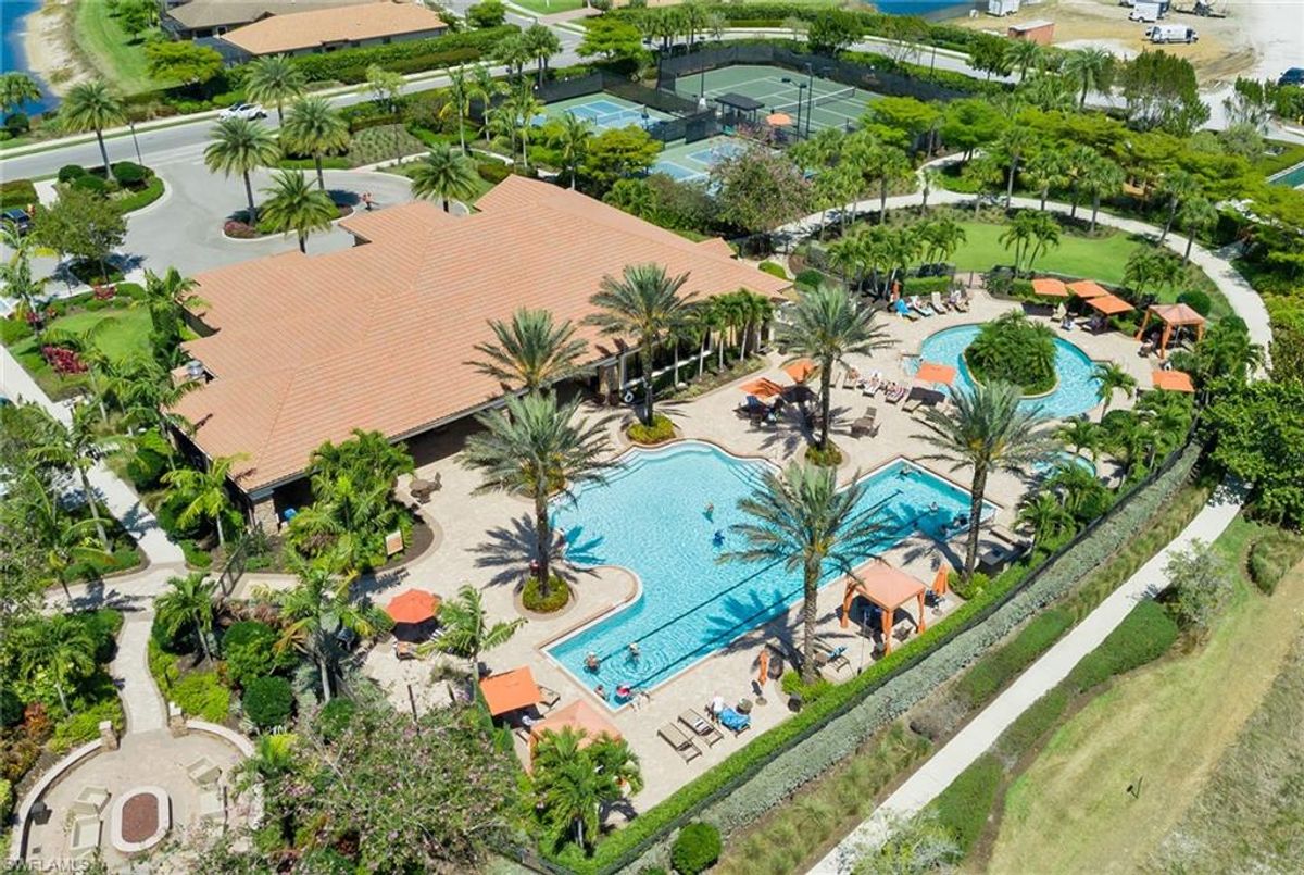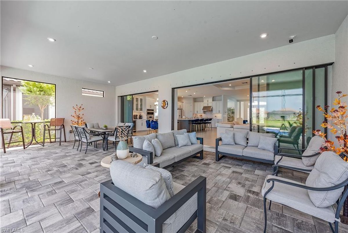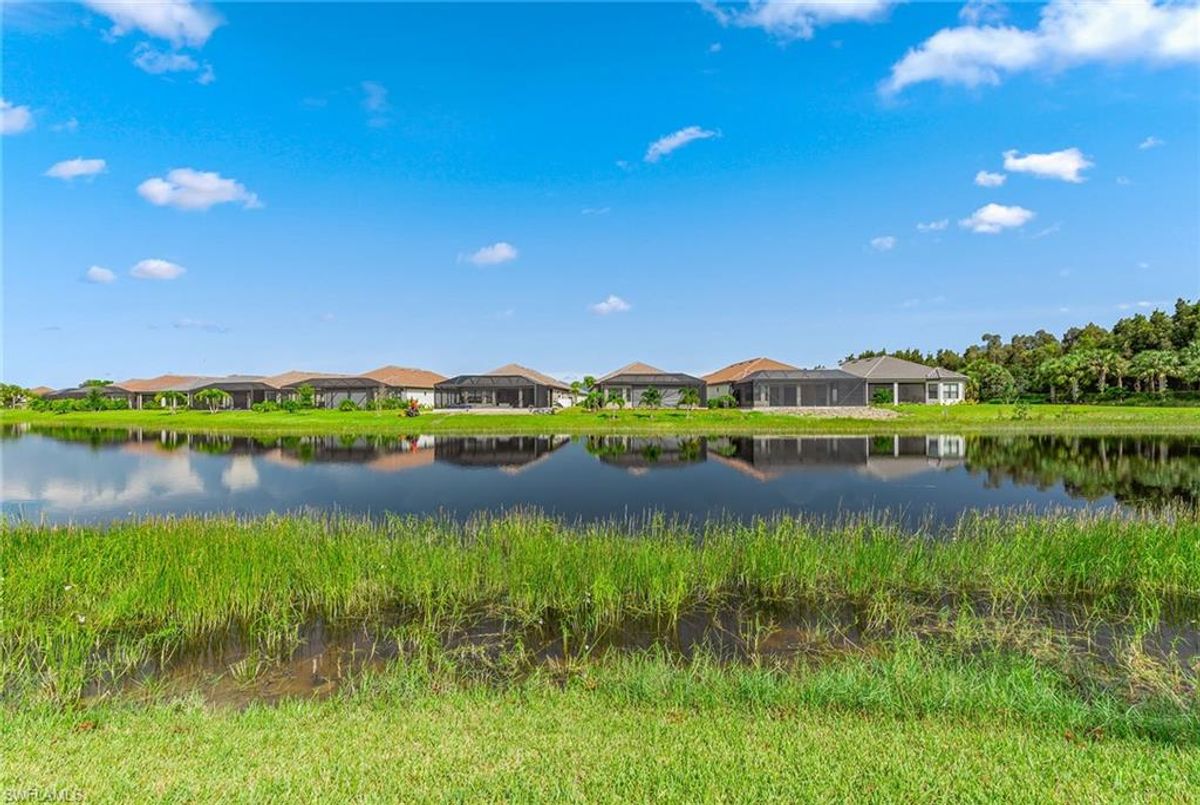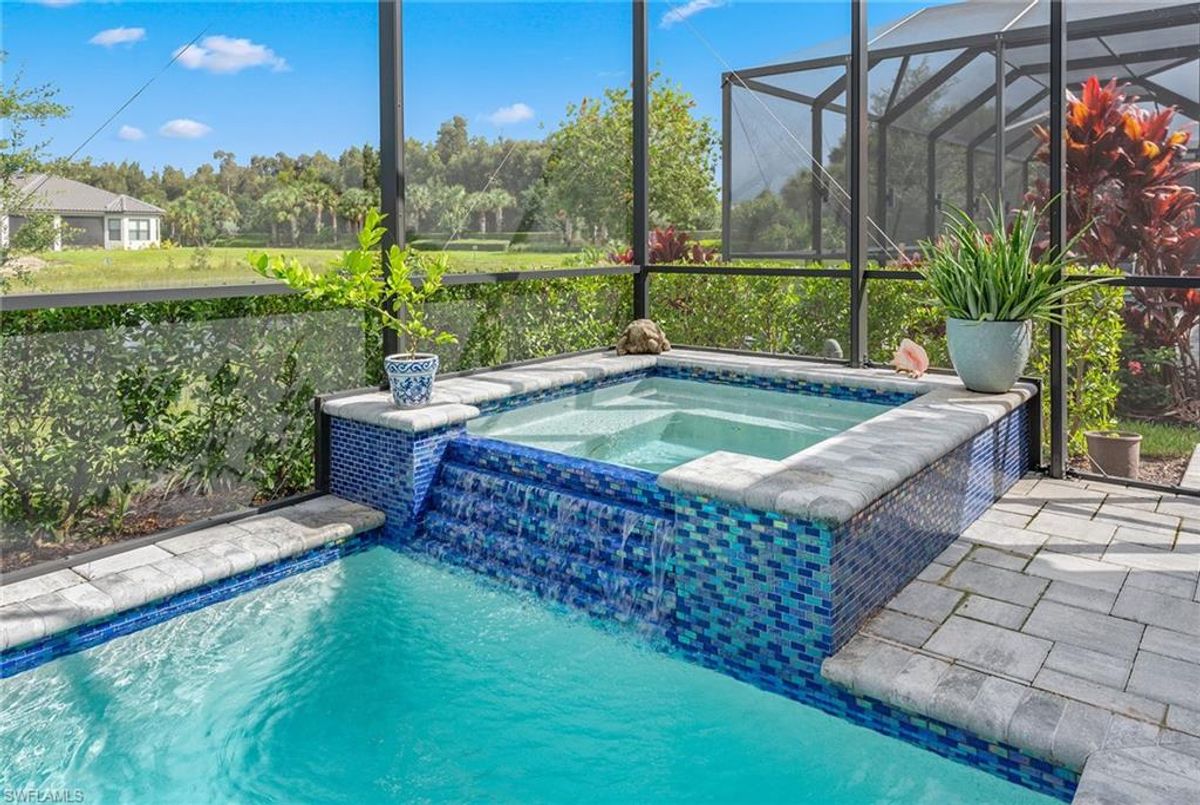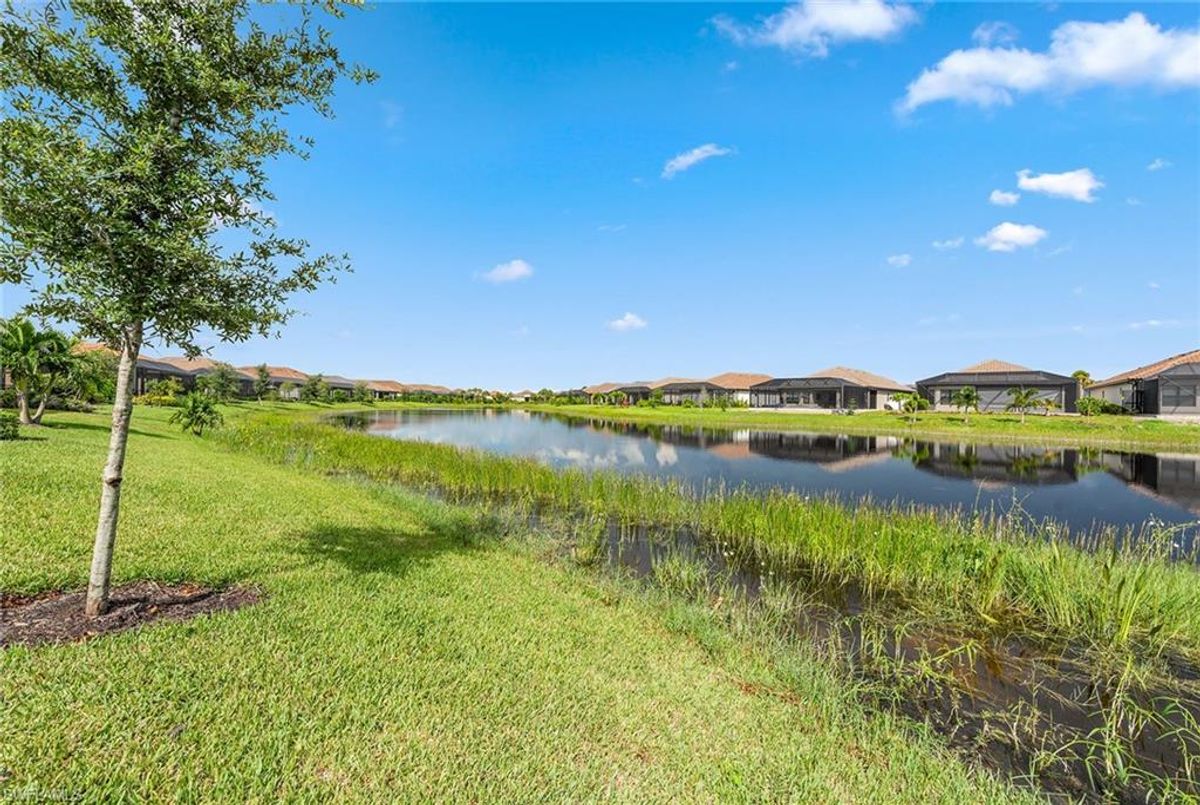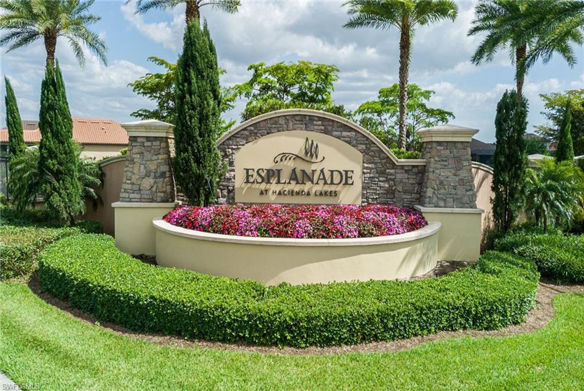 This stunning like-new modern single-family pool home, built in 2022, is in the highly sought-after Esplanade at Hacienda Lakes. With tranquil water views, this 2,929-square-foot popular Pallazio residence offers three bedrooms plus a den, three full baths and a two-car garage. Designed with a dramatic double door entry into a massive great room that opens up to the outside, this home ideally blends comfort with sophisticated style. Inside, you’ll find extensive custom details and a thoughtfully designed split-bedroom layout with 10-foot ceilings, elegant tile flooring and recessed lighting. Natural light floods the living areas through abundant windows. The kitchen is a chef’s dream, featuring an extended layout with shaker-style cabinets with under-cabinet lighting, a tile backsplash, quartz countertops, exquisite fixtures, walk-in pantry and a large island with a prep sink with storage. The upgraded appliances include a gas cooktop with a warming tray and hood, double-wall oven, microwave, French door refrigerator, dishwasher and a wine refrigerator. The heart of the home is the expansive great room, with upgraded pocket sliders on both sides that open to the extended lanai, offering seamless indoor-outdoor living. The screened lanai, with brick pavers, boasts a heated pool and spa with a waterfall feature, and a large covered outdoor living area for ultimate relaxation. Additionally, plumbing and electrical are installed for a future outdoor kitchen. The owner’s suite is a luxurious retreat with tray ceilings, bay windows and an en-suite bath that includes a huge walk-in shower with multiple shower heads, a rainfall showerhead and benches. The dual sink vanity with a makeup counter and full-width mirror, along with a linen closet and a large walk-in closet with shelving, completes this elegant space. The guest bedrooms are well-appointed, one featuring an adjacent bath with a shower-tub combo and the other offering an en-suite bath with a walk-in shower with glass enclosure. The versatile den can serve as an office or study, providing additional space to suit your needs. Practical features include a central vacuum system, security system, and storm protection with impact windows and shutters. The laundry room offers a utility sink with counter space, ample storage cabinets, and extra-large capacity LG front-load washer and dryer units. The wide brick paver driveway and tile roof enhance the home's exterior appeal, and the exterior bricks, including those on the lanai, were recently sealed for added durability. Residents enjoy a resort lifestyle with access to the clubhouse, planned events, a well-equipped fitness room, a resort-style heated pool and spa, cabanas, a fire pit, tennis and illuminated pickleball courts, a dog park and a playground. Near downtown Naples and Marco Island, this home offers an exceptional lifestyle with easy proximity to beaches, dining, shopping, boating, golf, parks and museums. Furnishings negotiable.