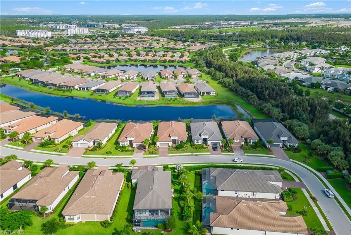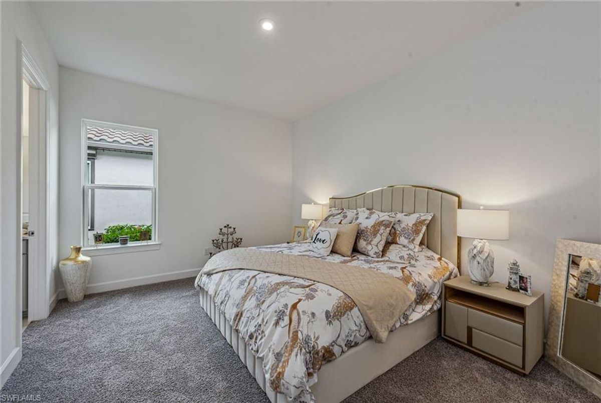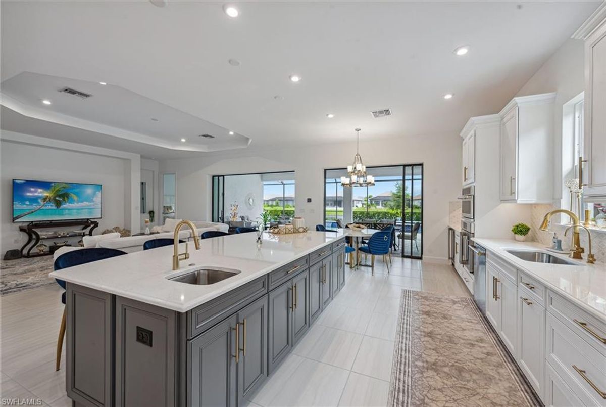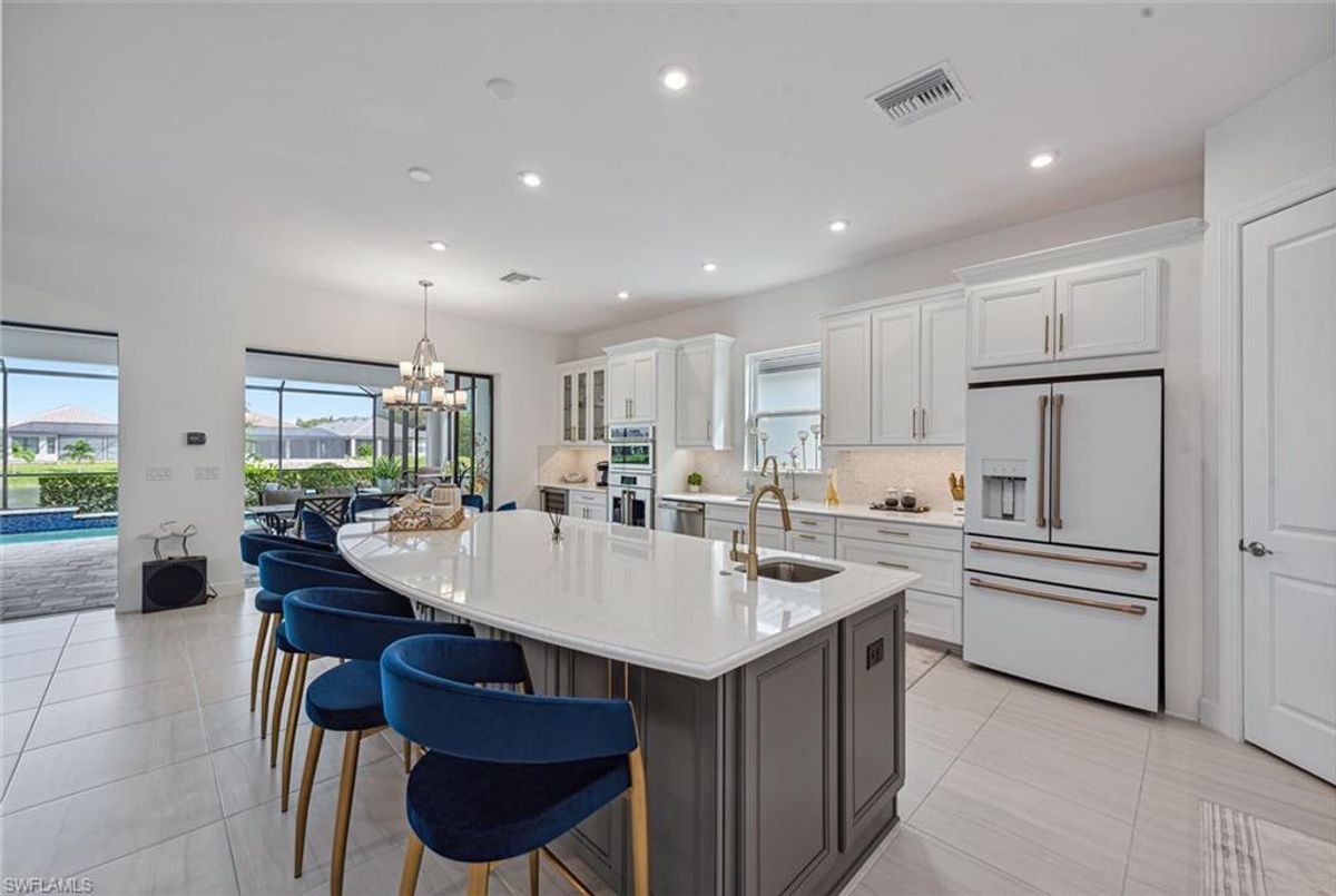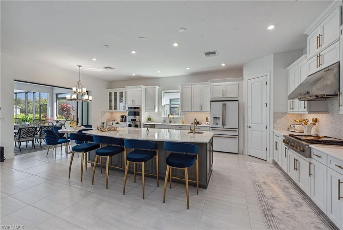 This stunning like-new modern single-family pool home, built in 2022, is in the highly sought-after Esplanade at Hacienda Lakes. With tranquil water views, this 2,929-square-foot popular Pallazio residence offers three bedrooms plus a den, three full baths and a two-car garage. Designed with a dramatic double door entry into a massive great room that opens up to the outside, this home ideally blends comfort with sophisticated style. Inside, you’ll find extensive custom details and a thoughtfully designed split-bedroom layout with 10-foot ceilings, elegant tile flooring and recessed lighting. Natural light floods the living areas through abundant windows. The kitchen is a chef’s dream, featuring an extended layout with shaker-style cabinets with under-cabinet lighting, a tile backsplash, quartz countertops, exquisite fixtures, walk-in pantry and a large island with a prep sink with storage. The upgraded appliances include a gas cooktop with a warming tray and hood, double-wall oven, microwave, French door refrigerator, dishwasher and a wine refrigerator. The heart of the home is the expansive great room, with upgraded pocket sliders on both sides that open to the extended lanai, offering seamless indoor-outdoor living. The screened lanai, with brick pavers, boasts a heated pool and spa with a waterfall feature, and a large covered outdoor living area for ultimate relaxation. Additionally, plumbing and electrical are installed for a future outdoor kitchen. The owner’s suite is a luxurious retreat with tray ceilings, bay windows and an en-suite bath that includes a huge walk-in shower with multiple shower heads, a rainfall showerhead and benches. The dual sink vanity with a makeup counter and full-width mirror, along with a linen closet and a large walk-in closet with shelving, completes this elegant space. The guest bedrooms are well-appointed, one featuring an adjacent bath with a shower-tub combo and the other offering an en-suite bath with a walk-in shower with glass enclosure. The versatile den can serve as an office or study, providing additional space to suit your needs. Practical features include a central vacuum system, security system, and storm protection with impact windows and shutters. The laundry room offers a utility sink with counter space, ample storage cabinets, and extra-large capacity LG front-load washer and dryer units. The wide brick paver driveway and tile roof enhance the home's exterior appeal, and the exterior bricks, including those on the lanai, were recently sealed for added durability. Residents enjoy a resort lifestyle with access to the clubhouse, planned events, a well-equipped fitness room, a resort-style heated pool and spa, cabanas, a fire pit, tennis and illuminated pickleball courts, a dog park and a playground. Near downtown Naples and Marco Island, this home offers an exceptional lifestyle with easy proximity to beaches, dining, shopping, boating, golf, parks and museums. Furnishings negotiable.