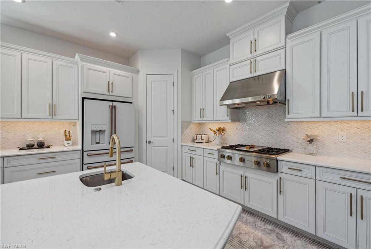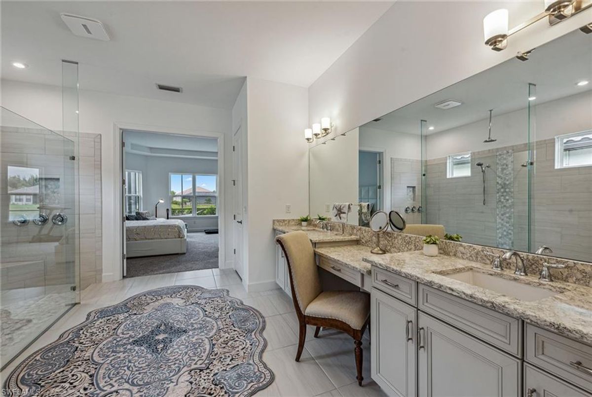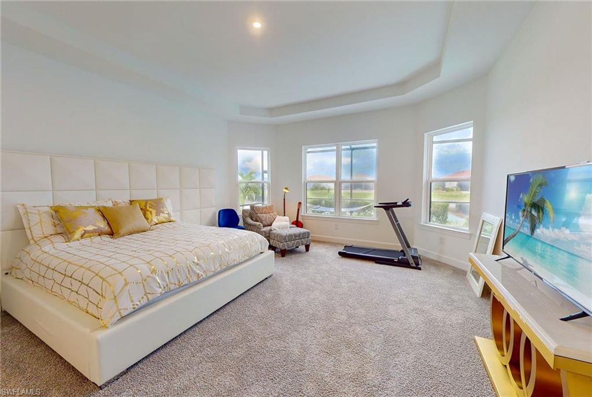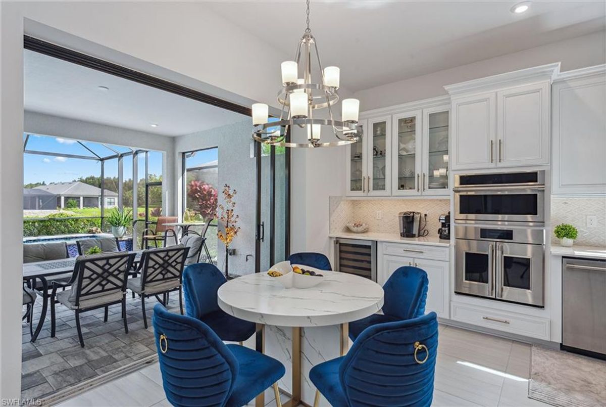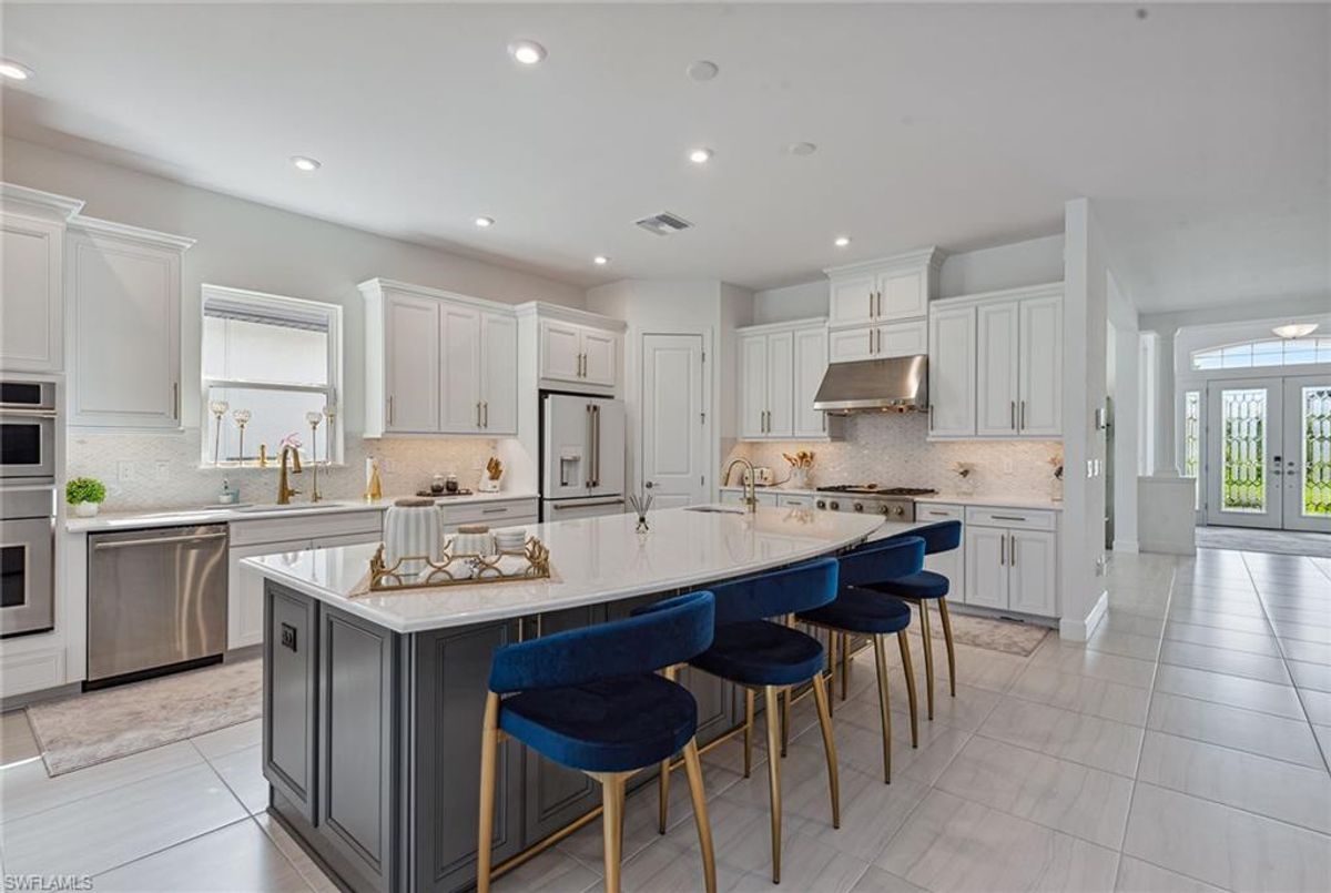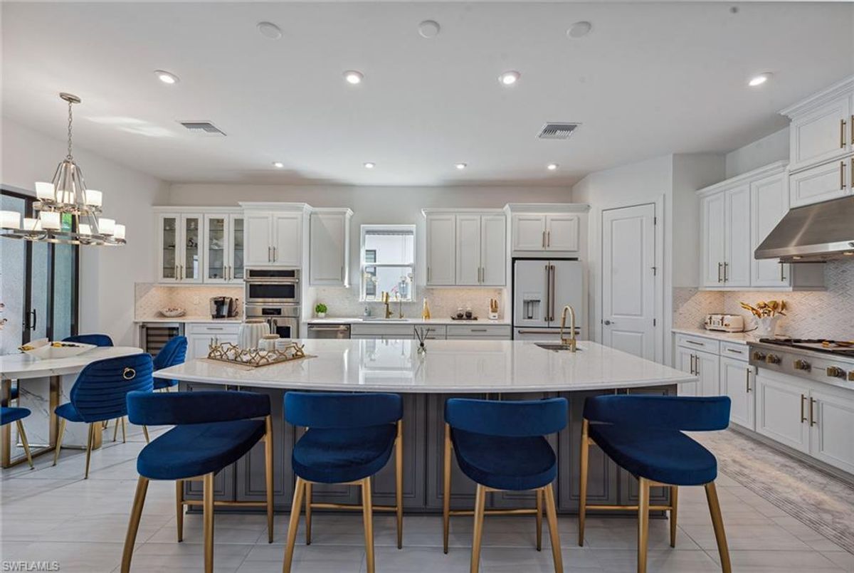 This stunning like-new modern single-family pool home, built in 2022, is in the highly sought-after Esplanade at Hacienda Lakes. With tranquil water views, this 2,929-square-foot popular Pallazio residence offers three bedrooms plus a den, three full baths and a two-car garage. Designed with a dramatic double door entry into a massive great room that opens up to the outside, this home ideally blends comfort with sophisticated style. Inside, you’ll find extensive custom details and a thoughtfully designed split-bedroom layout with 10-foot ceilings, elegant tile flooring and recessed lighting. Natural light floods the living areas through abundant windows. The kitchen is a chef’s dream, featuring an extended layout with shaker-style cabinets with under-cabinet lighting, a tile backsplash, quartz countertops, exquisite fixtures, walk-in pantry and a large island with a prep sink with storage. The upgraded appliances include a gas cooktop with a warming tray and hood, double-wall oven, microwave, French door refrigerator, dishwasher and a wine refrigerator. The heart of the home is the expansive great room, with upgraded pocket sliders on both sides that open to the extended lanai, offering seamless indoor-outdoor living. The screened lanai, with brick pavers, boasts a heated pool and spa with a waterfall feature, and a large covered outdoor living area for ultimate relaxation. Additionally, plumbing and electrical are installed for a future outdoor kitchen. The owner’s suite is a luxurious retreat with tray ceilings, bay windows and an en-suite bath that includes a huge walk-in shower with multiple shower heads, a rainfall showerhead and benches. The dual sink vanity with a makeup counter and full-width mirror, along with a linen closet and a large walk-in closet with shelving, completes this elegant space. The guest bedrooms are well-appointed, one featuring an adjacent bath with a shower-tub combo and the other offering an en-suite bath with a walk-in shower with glass enclosure. The versatile den can serve as an office or study, providing additional space to suit your needs. Practical features include a central vacuum system, security system, and storm protection with impact windows and shutters. The laundry room offers a utility sink with counter space, ample storage cabinets, and extra-large capacity LG front-load washer and dryer units. The wide brick paver driveway and tile roof enhance the home's exterior appeal, and the exterior bricks, including those on the lanai, were recently sealed for added durability. Residents enjoy a resort lifestyle with access to the clubhouse, planned events, a well-equipped fitness room, a resort-style heated pool and spa, cabanas, a fire pit, tennis and illuminated pickleball courts, a dog park and a playground. Near downtown Naples and Marco Island, this home offers an exceptional lifestyle with easy proximity to beaches, dining, shopping, boating, golf, parks and museums. Furnishings negotiable.