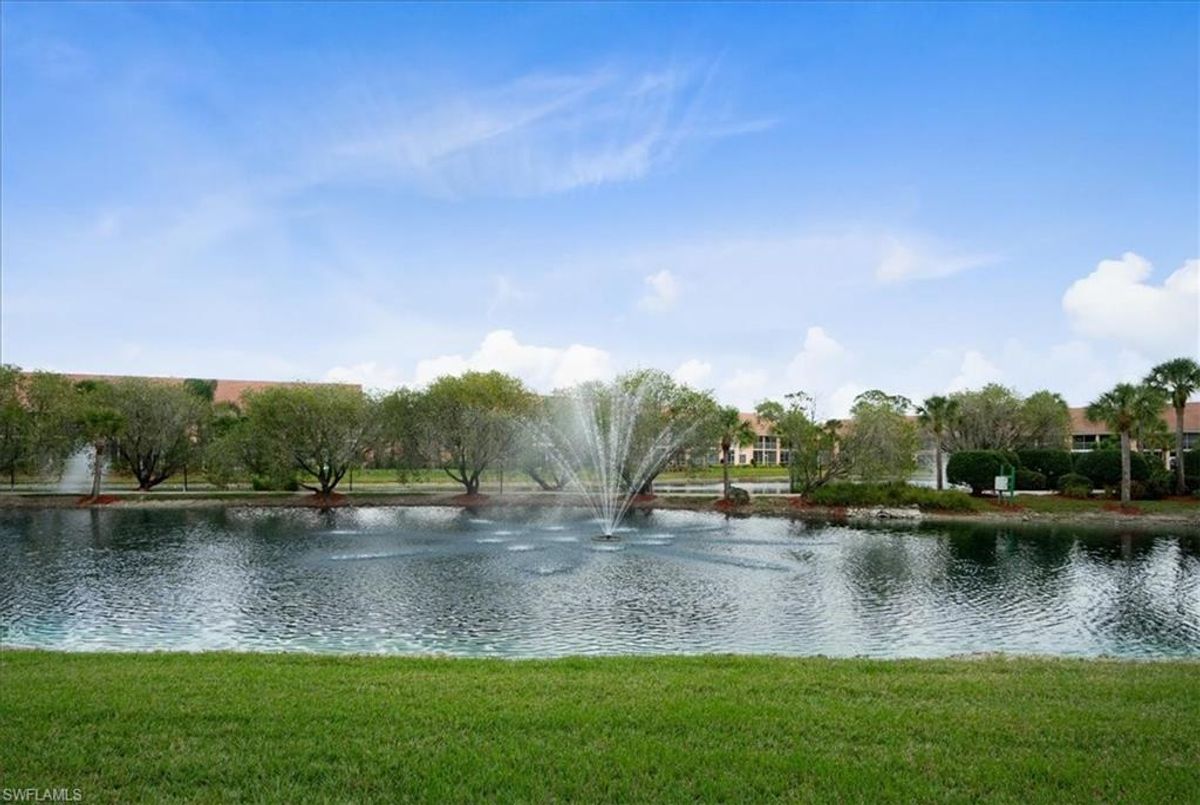 AMAZING DEAL, HUGE PRICE IMPROVEMENT TO SELL THIS WINTER RETREAT!!  BIG DOG FRIENDLY TOO!! Discover Falling Waters Beach Resort with this charming 2-bedroom, 2-bath condo. Featuring a private 1 CAR GARAGE and an Oversized EXPANSIVE LANAI with HURRICANE Impact Electric Shutters, this FURNISHED TURNKEY home offers a stunning lake view and is impeccably clean and neat. Enjoy the vibrant community amenities including a refreshing updated Lazy River, Lap Pool, PICKLEBALL, Shuffleboard, Tennis, and Bocci. With a Full calendar of social events throughout the season, you'll find plenty of opportunities to stay active and engaged. Close to restaurants and stores makes this home away from home a perfect fit for all. (This association #4 is the only one in the Community that allows LARGER DOG BREEDS) GO SEE THIS HOME TODAY!!!