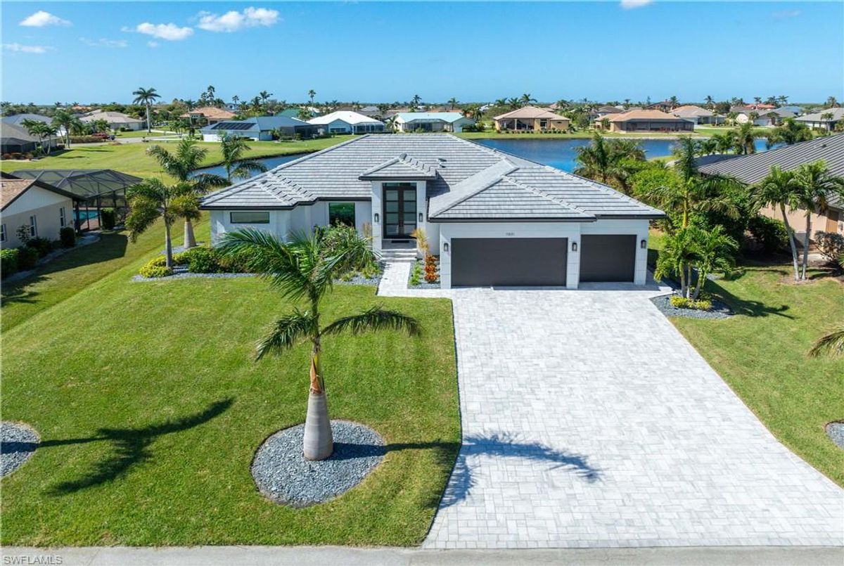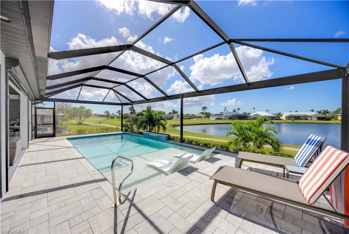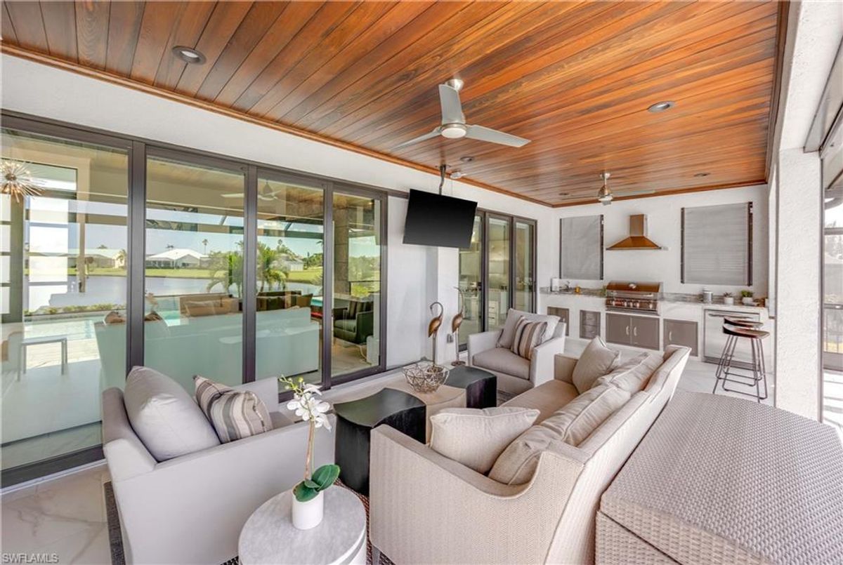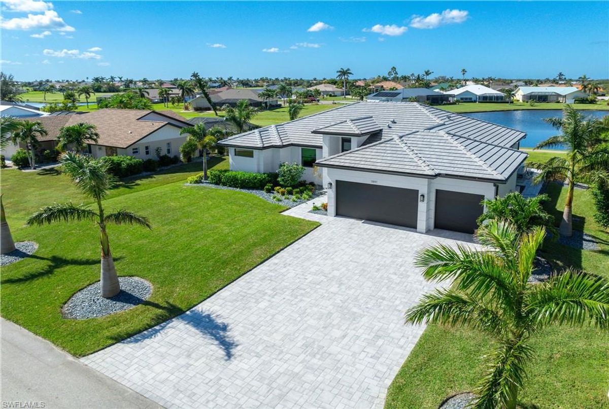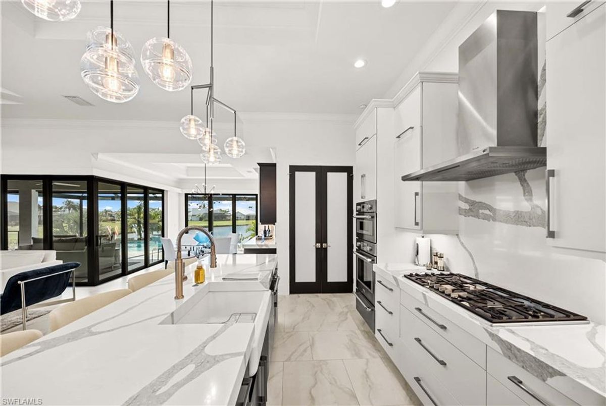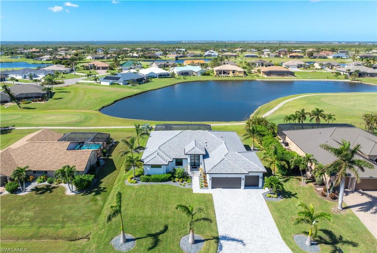 Located in the prestigious golf community of Cape Royal, this 2022 custom-built home showcases modern elegance and luxury at its finest.  Decorated with Bernhardt and Century furniture, mixed with exquisite lighting fixtures and distinctive artwork - each piece tastefully enhances the beauty of this home. Accented with QUARTZ COUNTERTOPS in the kitchen, bathrooms, laundry room and WALK-IN CHEF'S PANTRY, coupled with an oversized quartz waterfall kitchen island and white porcelain farmhouse sink, tie everything together. So many features included in this home: A 500 GALLON PROPANE TANK THAT OPERATES THE STOVE, OUTDOOR GRILL, HOT WATER TANK, POOL HEATER AND WHOLE HOUSE GENERAC GENERATOR. THE HALO 5 WATER SYSTEM, BRIDGEWOOD CABINETRY, THERMADOR APPLIANCES, DRY BAR, DESIGNER LED BATHROOM MIRRORS, OVER-SIZED CROWN MOLDING, BASEBOARDS AND TRIM ARE EXCEPTIONAL! CUSTOM CEILING DESIGNS, 90-DEGREE SLIDERS WITH CUSTOM REMOTE BLINDS IN EVERY ROOM AND A 72" ELECTRIC FIREPLACE CREATE A STUNNING AMBIANCE! The lanai boasts a CYPRESS WOOD CEILING, A full SUMMER KITCHEN WITH GAS GRILL, STORM SMART BLINDS, FULL CONCRETE POUR-UNDER PAVER POOL DECK, SUN SHELF AND PANORAMIC SCREENS to fully capture the golf course and water views! All HURRICANE IMPACT DOORS AND WINDOWS, TILE ROOF, 3-CAR GARAGE, INSULATED FLUSH PANEL GARAGE DOORS AND FLORATAM LAWN make this home truly astounding. ** This home is being sold FURNISHED **