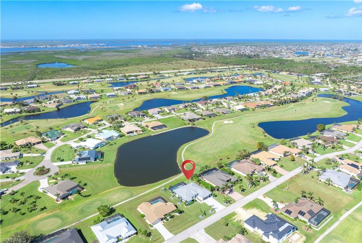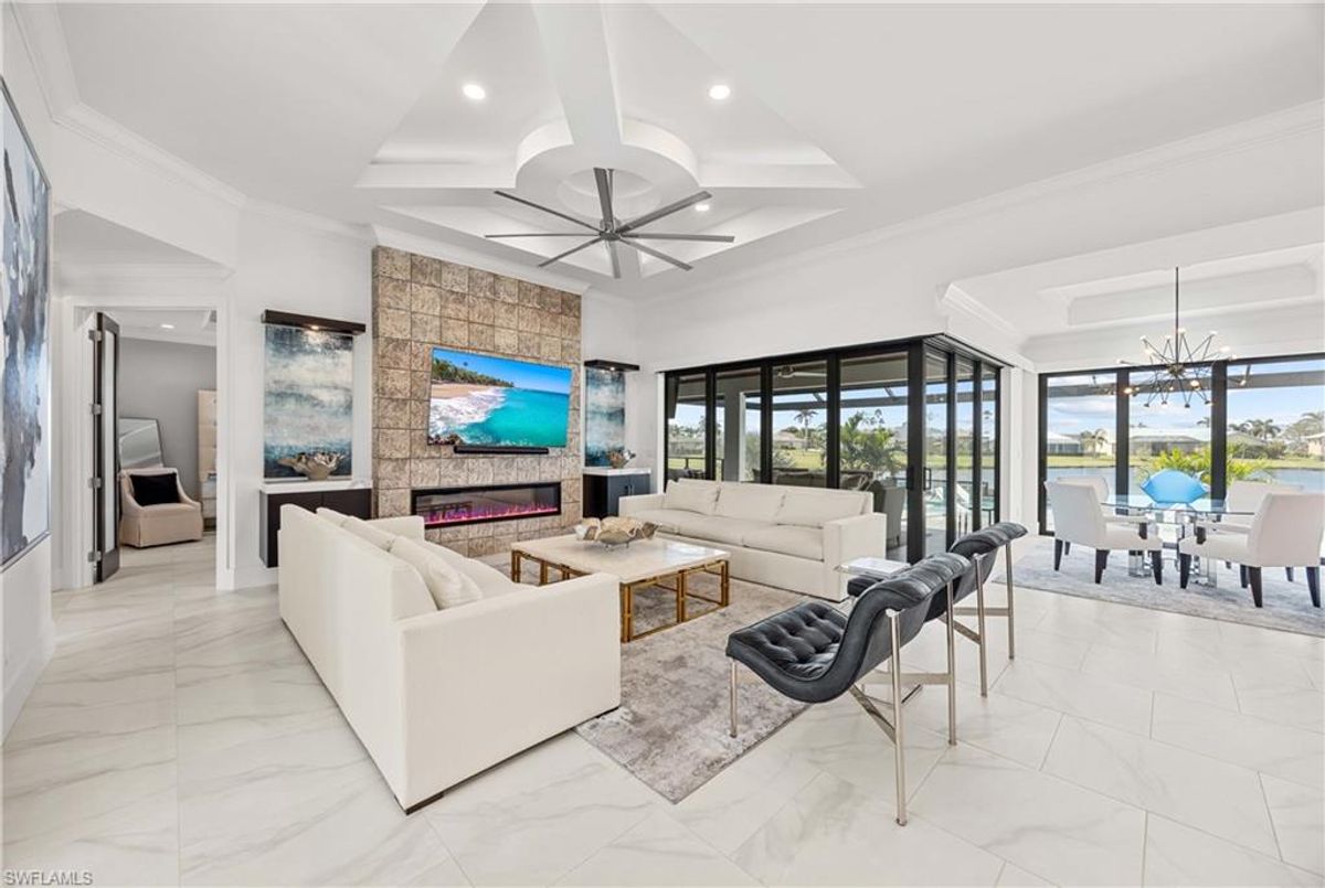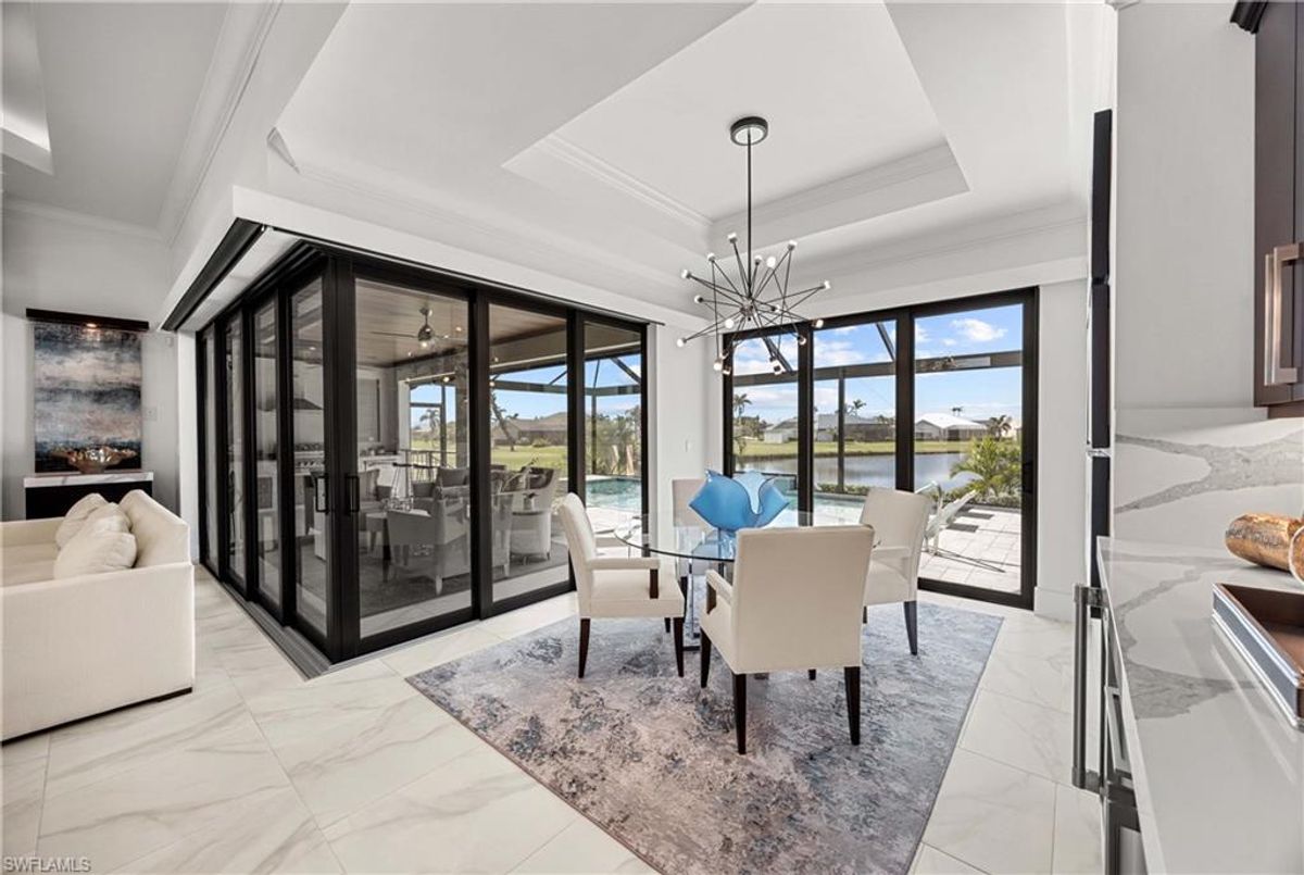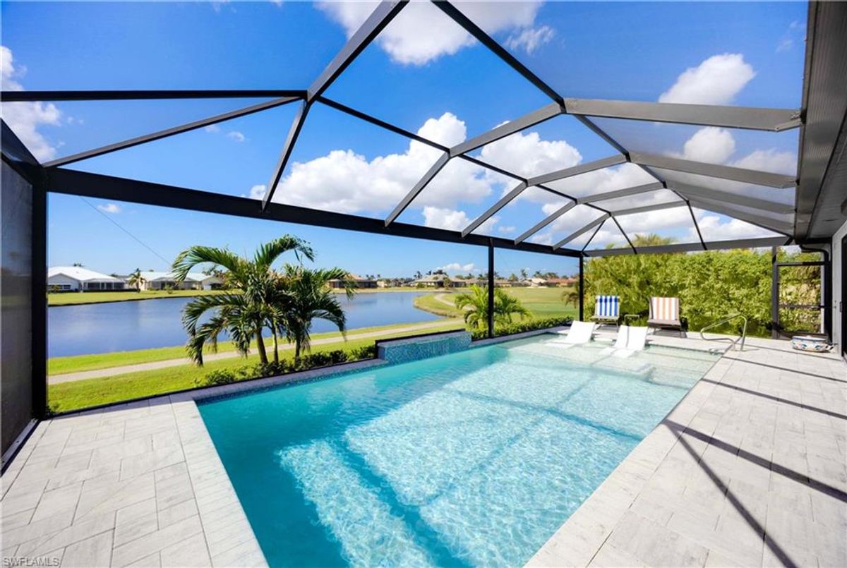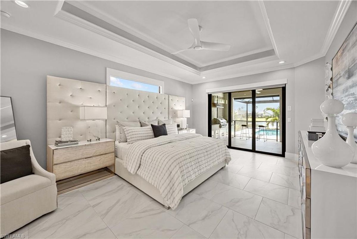 Located in the prestigious golf community of Cape Royal, this 2022 custom-built home showcases modern elegance and luxury at its finest.  Decorated with Bernhardt and Century furniture, mixed with exquisite lighting fixtures and distinctive artwork - each piece tastefully enhances the beauty of this home. Accented with QUARTZ COUNTERTOPS in the kitchen, bathrooms, laundry room and WALK-IN CHEF'S PANTRY, coupled with an oversized quartz waterfall kitchen island and white porcelain farmhouse sink, tie everything together. So many features included in this home: A 500 GALLON PROPANE TANK THAT OPERATES THE STOVE, OUTDOOR GRILL, HOT WATER TANK, POOL HEATER AND WHOLE HOUSE GENERAC GENERATOR. THE HALO 5 WATER SYSTEM, BRIDGEWOOD CABINETRY, THERMADOR APPLIANCES, DRY BAR, DESIGNER LED BATHROOM MIRRORS, OVER-SIZED CROWN MOLDING, BASEBOARDS AND TRIM ARE EXCEPTIONAL! CUSTOM CEILING DESIGNS, 90-DEGREE SLIDERS WITH CUSTOM REMOTE BLINDS IN EVERY ROOM AND A 72" ELECTRIC FIREPLACE CREATE A STUNNING AMBIANCE! The lanai boasts a CYPRESS WOOD CEILING, A full SUMMER KITCHEN WITH GAS GRILL, STORM SMART BLINDS, FULL CONCRETE POUR-UNDER PAVER POOL DECK, SUN SHELF AND PANORAMIC SCREENS to fully capture the golf course and water views! All HURRICANE IMPACT DOORS AND WINDOWS, TILE ROOF, 3-CAR GARAGE, INSULATED FLUSH PANEL GARAGE DOORS AND FLORATAM LAWN make this home truly astounding. ** This home is being sold FURNISHED **