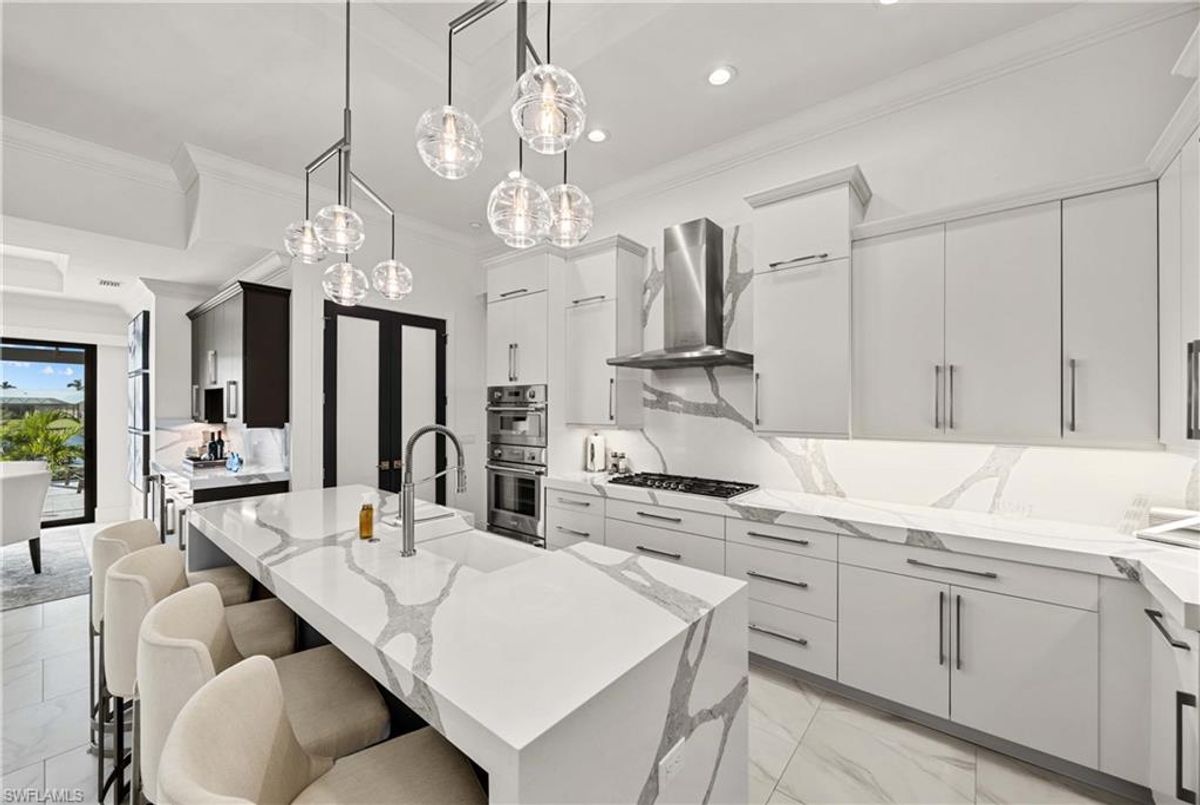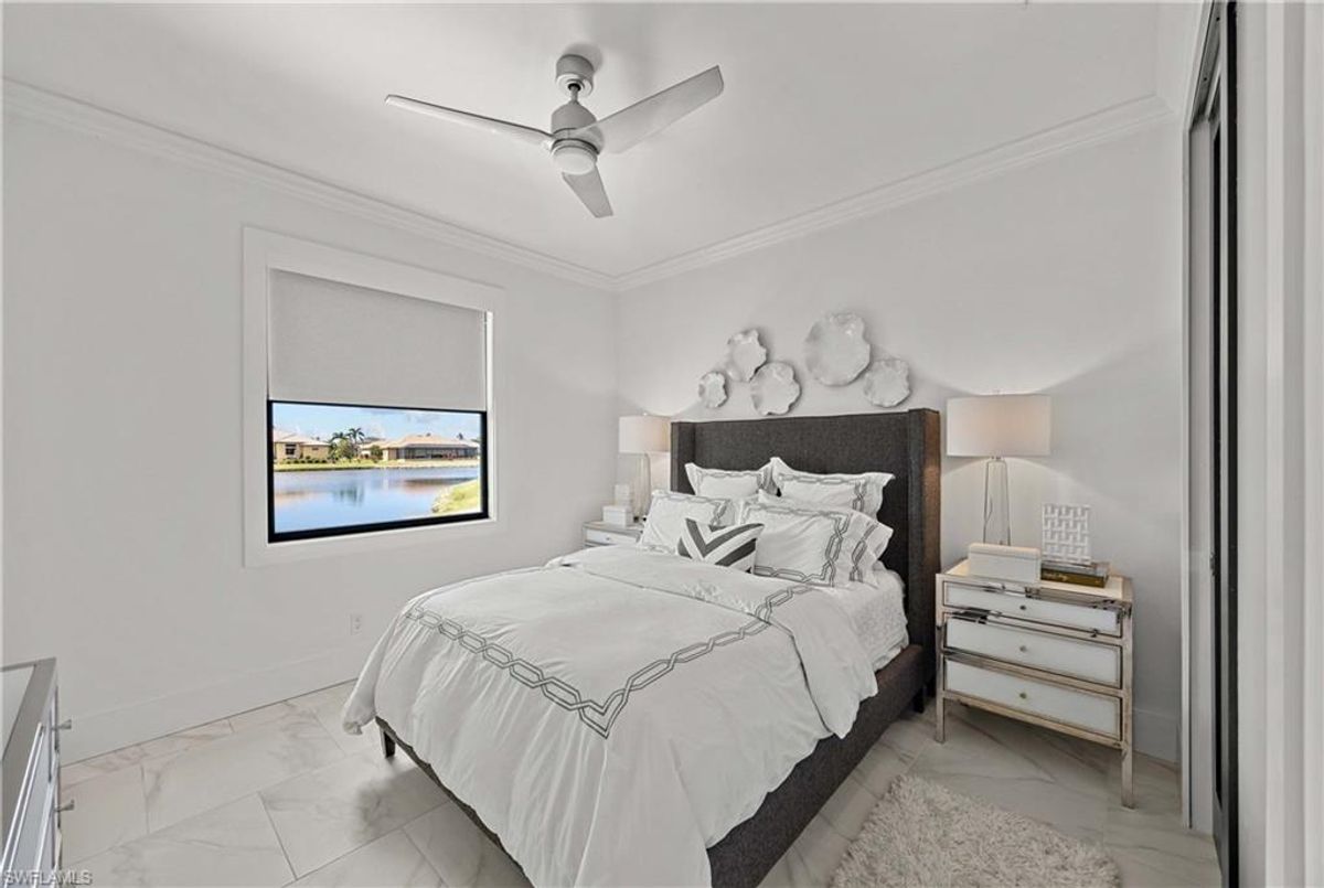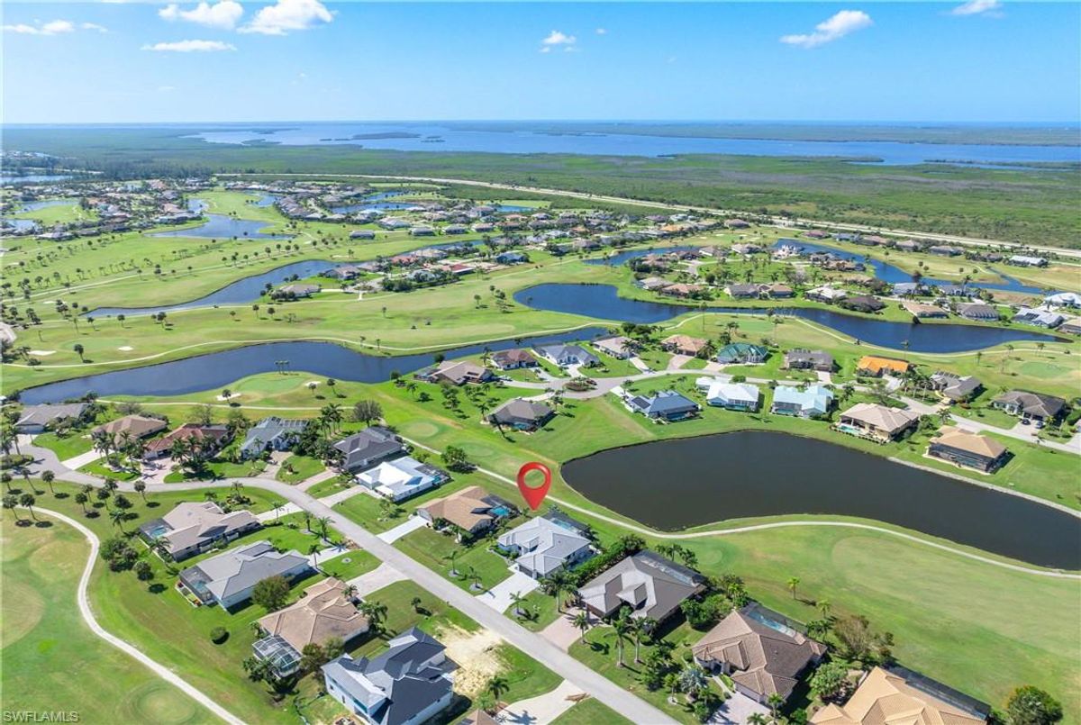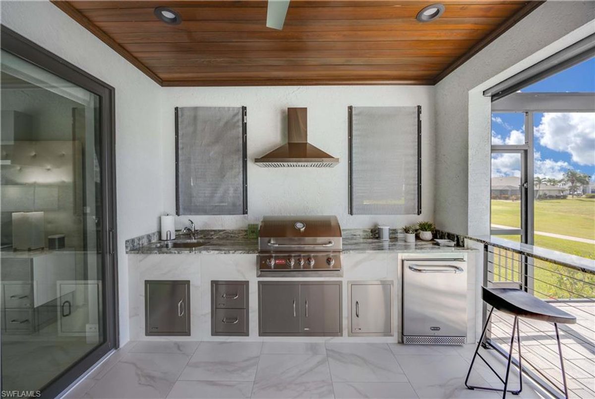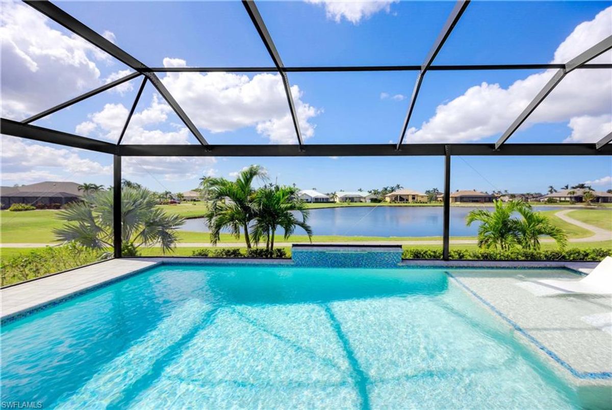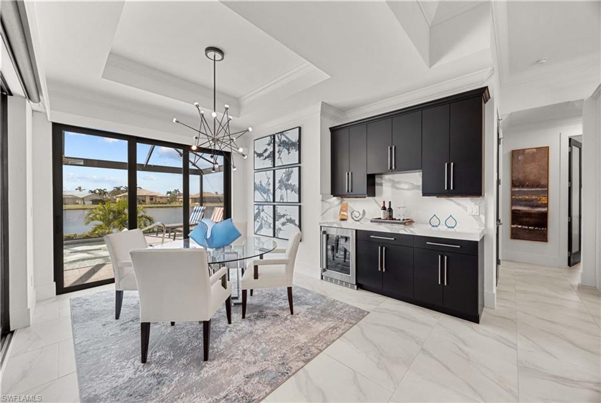 Located in the prestigious golf community of Cape Royal, this 2022 custom-built home showcases modern elegance and luxury at its finest.  Decorated with Bernhardt and Century furniture, mixed with exquisite lighting fixtures and distinctive artwork - each piece tastefully enhances the beauty of this home. Accented with QUARTZ COUNTERTOPS in the kitchen, bathrooms, laundry room and WALK-IN CHEF'S PANTRY, coupled with an oversized quartz waterfall kitchen island and white porcelain farmhouse sink, tie everything together. So many features included in this home: A 500 GALLON PROPANE TANK THAT OPERATES THE STOVE, OUTDOOR GRILL, HOT WATER TANK, POOL HEATER AND WHOLE HOUSE GENERAC GENERATOR. THE HALO 5 WATER SYSTEM, BRIDGEWOOD CABINETRY, THERMADOR APPLIANCES, DRY BAR, DESIGNER LED BATHROOM MIRRORS, OVER-SIZED CROWN MOLDING, BASEBOARDS AND TRIM ARE EXCEPTIONAL! CUSTOM CEILING DESIGNS, 90-DEGREE SLIDERS WITH CUSTOM REMOTE BLINDS IN EVERY ROOM AND A 72" ELECTRIC FIREPLACE CREATE A STUNNING AMBIANCE! The lanai boasts a CYPRESS WOOD CEILING, A full SUMMER KITCHEN WITH GAS GRILL, STORM SMART BLINDS, FULL CONCRETE POUR-UNDER PAVER POOL DECK, SUN SHELF AND PANORAMIC SCREENS to fully capture the golf course and water views! All HURRICANE IMPACT DOORS AND WINDOWS, TILE ROOF, 3-CAR GARAGE, INSULATED FLUSH PANEL GARAGE DOORS AND FLORATAM LAWN make this home truly astounding. ** This home is being sold FURNISHED **