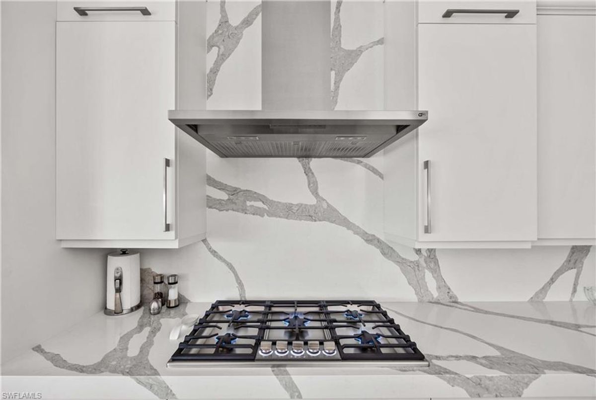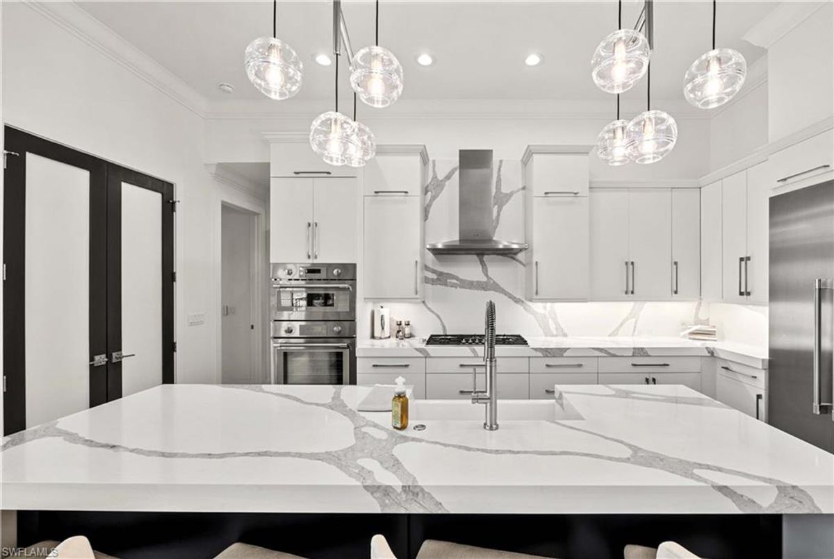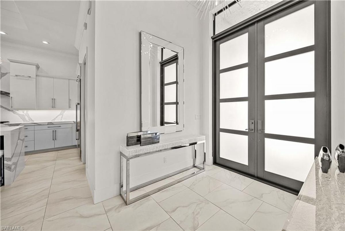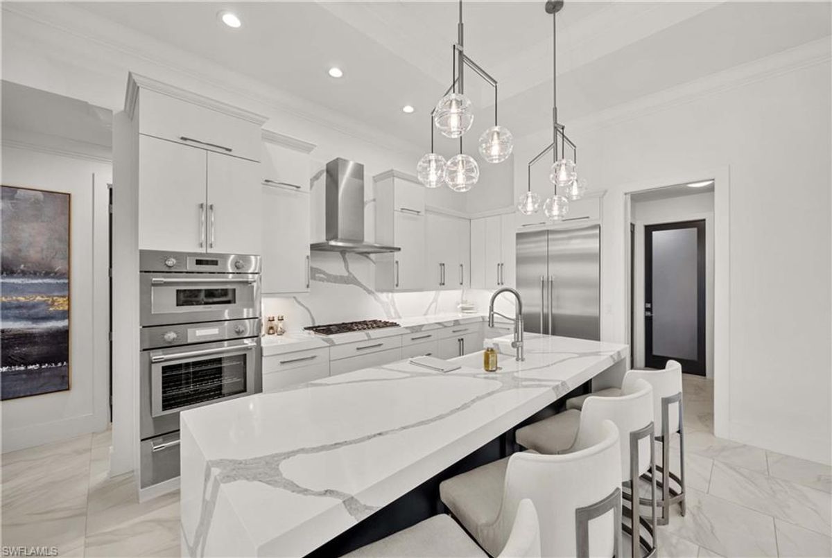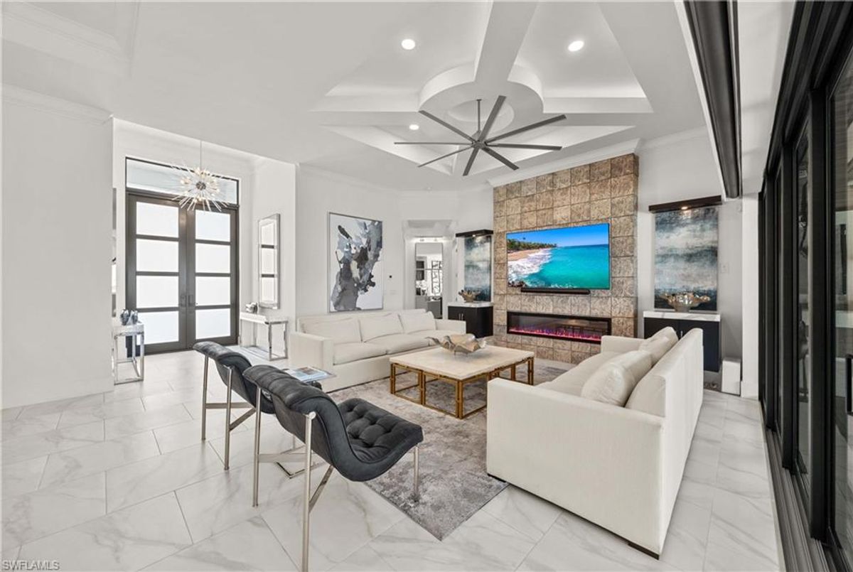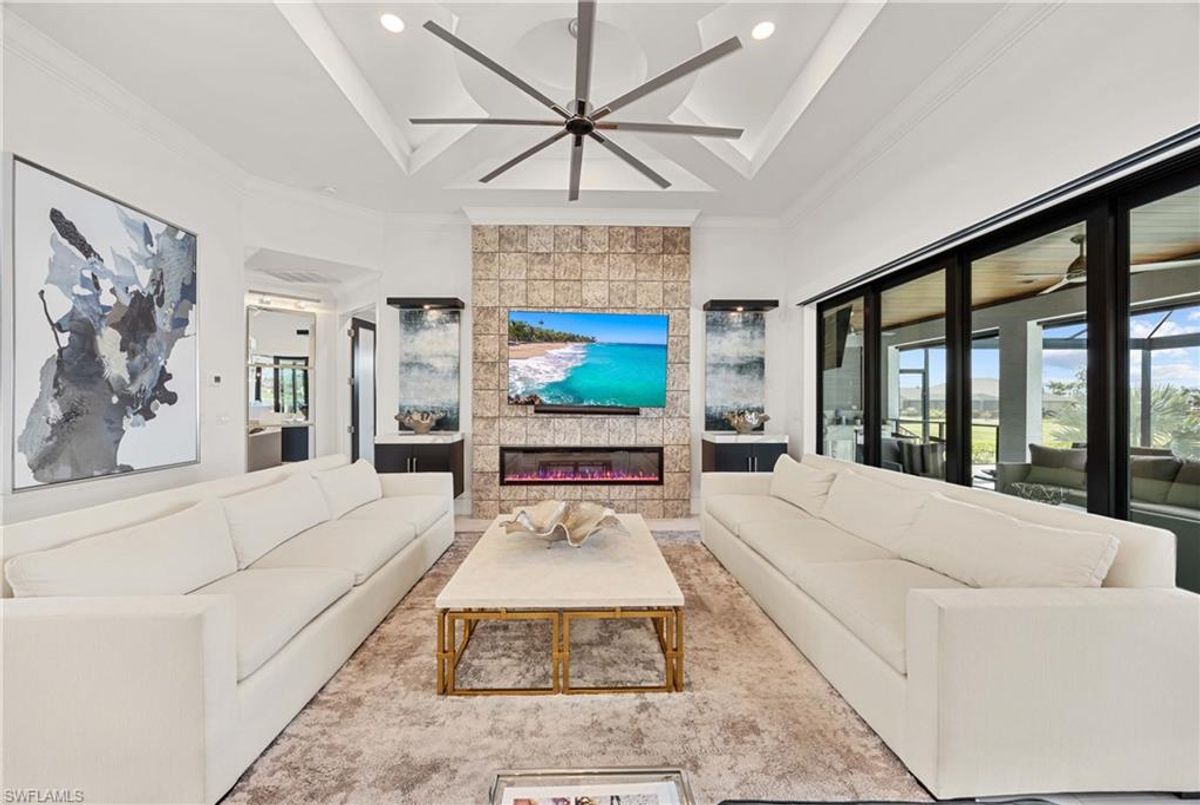 Located in the prestigious golf community of Cape Royal, this 2022 custom-built home showcases modern elegance and luxury at its finest.  Decorated with Bernhardt and Century furniture, mixed with exquisite lighting fixtures and distinctive artwork - each piece tastefully enhances the beauty of this home. Accented with QUARTZ COUNTERTOPS in the kitchen, bathrooms, laundry room and WALK-IN CHEF'S PANTRY, coupled with an oversized quartz waterfall kitchen island and white porcelain farmhouse sink, tie everything together. So many features included in this home: A 500 GALLON PROPANE TANK THAT OPERATES THE STOVE, OUTDOOR GRILL, HOT WATER TANK, POOL HEATER AND WHOLE HOUSE GENERAC GENERATOR. THE HALO 5 WATER SYSTEM, BRIDGEWOOD CABINETRY, THERMADOR APPLIANCES, DRY BAR, DESIGNER LED BATHROOM MIRRORS, OVER-SIZED CROWN MOLDING, BASEBOARDS AND TRIM ARE EXCEPTIONAL! CUSTOM CEILING DESIGNS, 90-DEGREE SLIDERS WITH CUSTOM REMOTE BLINDS IN EVERY ROOM AND A 72" ELECTRIC FIREPLACE CREATE A STUNNING AMBIANCE! The lanai boasts a CYPRESS WOOD CEILING, A full SUMMER KITCHEN WITH GAS GRILL, STORM SMART BLINDS, FULL CONCRETE POUR-UNDER PAVER POOL DECK, SUN SHELF AND PANORAMIC SCREENS to fully capture the golf course and water views! All HURRICANE IMPACT DOORS AND WINDOWS, TILE ROOF, 3-CAR GARAGE, INSULATED FLUSH PANEL GARAGE DOORS AND FLORATAM LAWN make this home truly astounding. ** This home is being sold FURNISHED **
