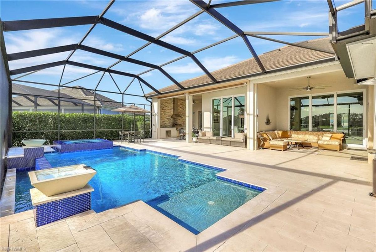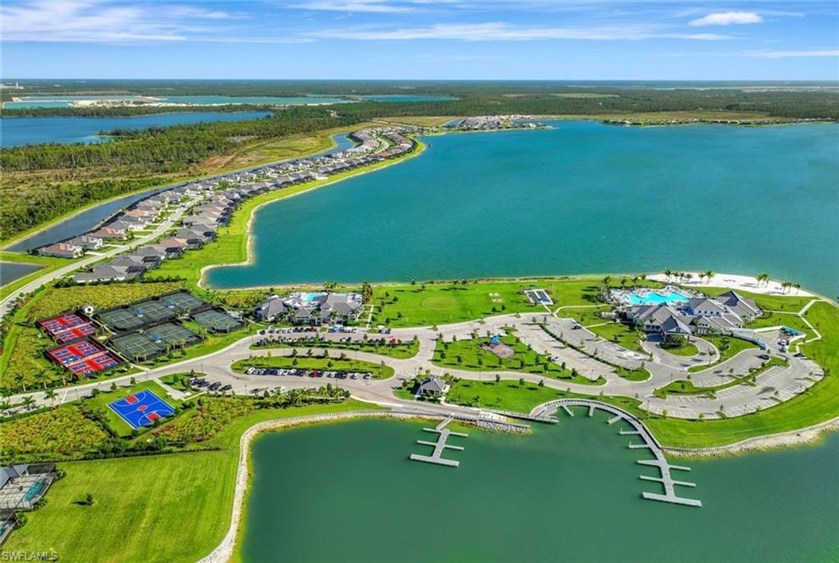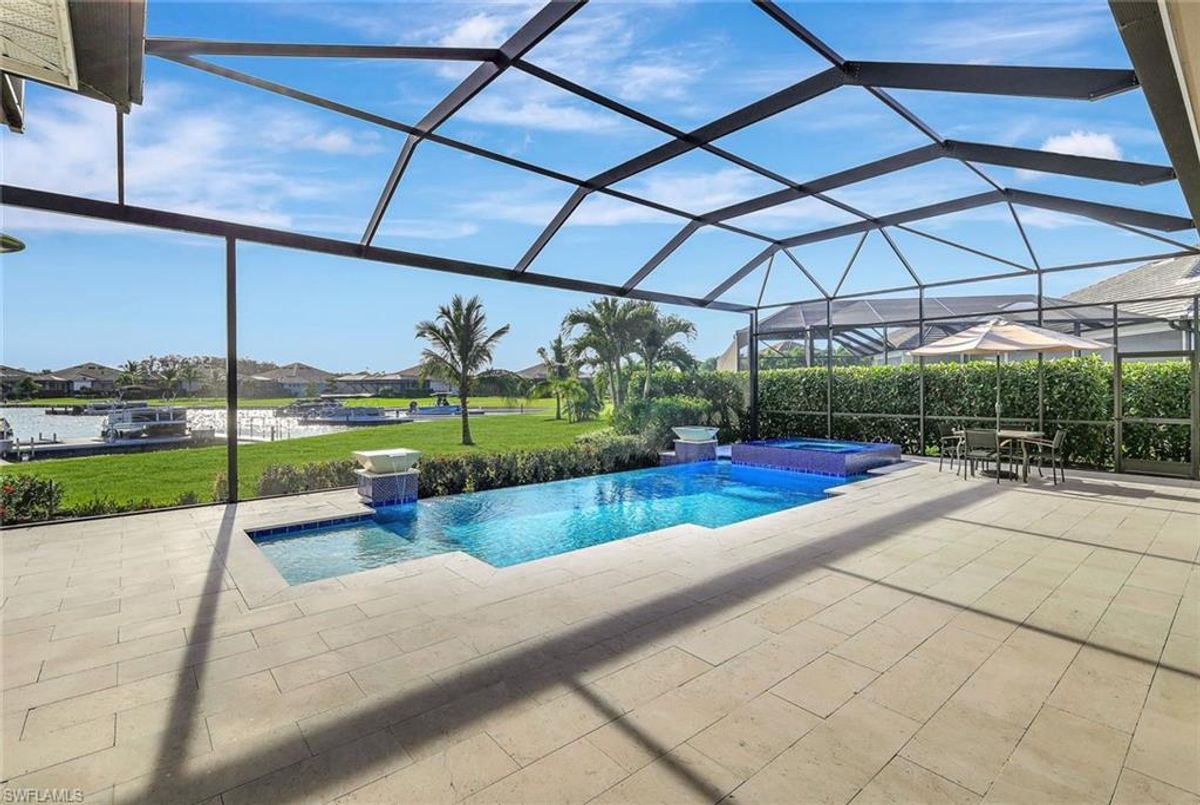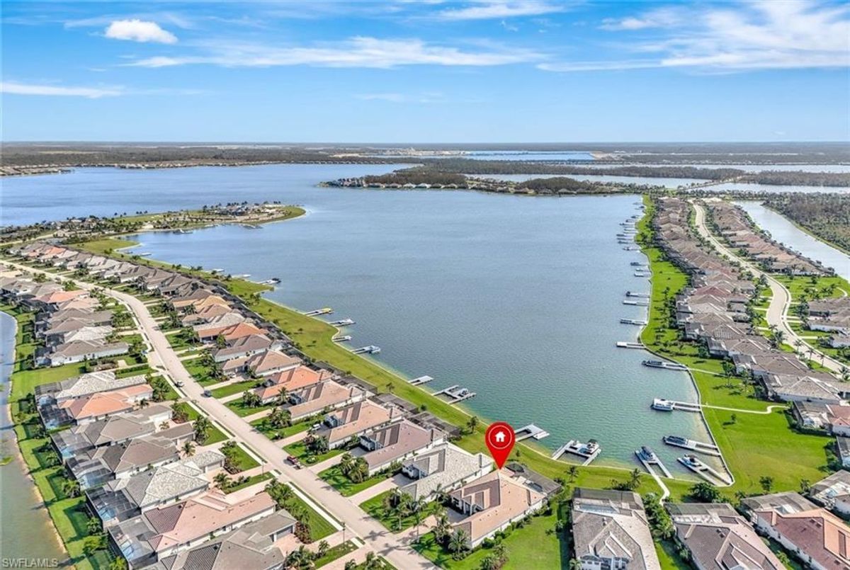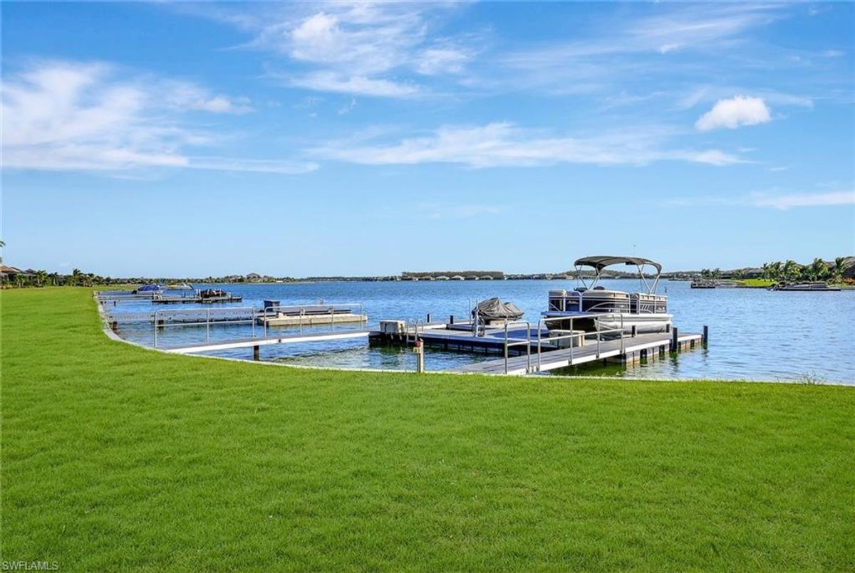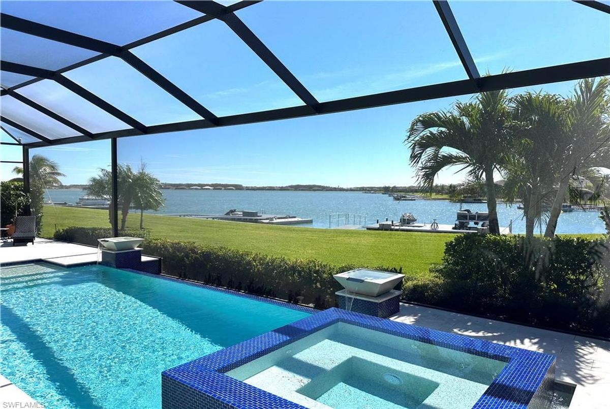 Welcome to luxury LAKEFRONT living at Wildblue!!! Stunning lakefront home with sought after southeast exposure, spectacular lake views and sunrises. Furnishings and the Pontoon Boat are included! This home is nearly 3200 sq ft with elegant large porcelain tile throughout and massive 12 ft ceilings. The gourmet kitchen includes an oversized island, beautiful quartz countertops, high-end stainless-steel appliances and gas cooktop. Custom millwork and impressive crown moldings throughout. This home provides resort style living at its best. There are custom white cabinets throughout and a home theater system. Enjoy boating, kayaking, waterskiing, fishing or just cruising to one of the resort style restaurants on the 600-acre lake just steps from your back door.  Expansive outdoor living space with extended Lanai and upgraded travertine pool pavers.  Full outdoor kitchen.  Custom heated saltwater pool & spa.  Upgraded landscaping with calusa hedge for privacy and large royal palms. This home includes the most sought-after upgrades.  Storm Smart electric hurricane screens, whole house backup generator for power when you need it, private boat dock with dual boat lifts and electric/water connections. The home is situated on one of the most desirable lake lots and includes a high-end security system for safety and peace of mind. Pontoon Boat included!WildBlue is a rare gem in Southwest Florida, offering 800 acres of freshwater lakes and 1,300 acres of preserved land. Amenities include a luxurious clubhouse with formal and casual dining options, a poolside café and bar, a resort-style pool, fitness and yoga facilities, a full-service spa, and a variety of recreational activities such as basketball, pickleball, tennis, bocce ball, and horseshoes. Residents also enjoy access to a beach, boat and kayak launch, and numerous community events.