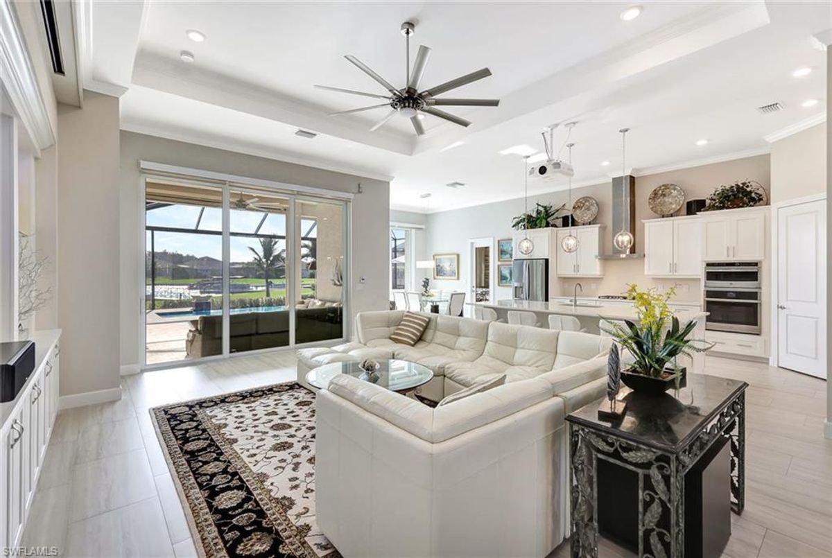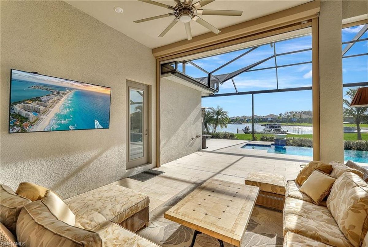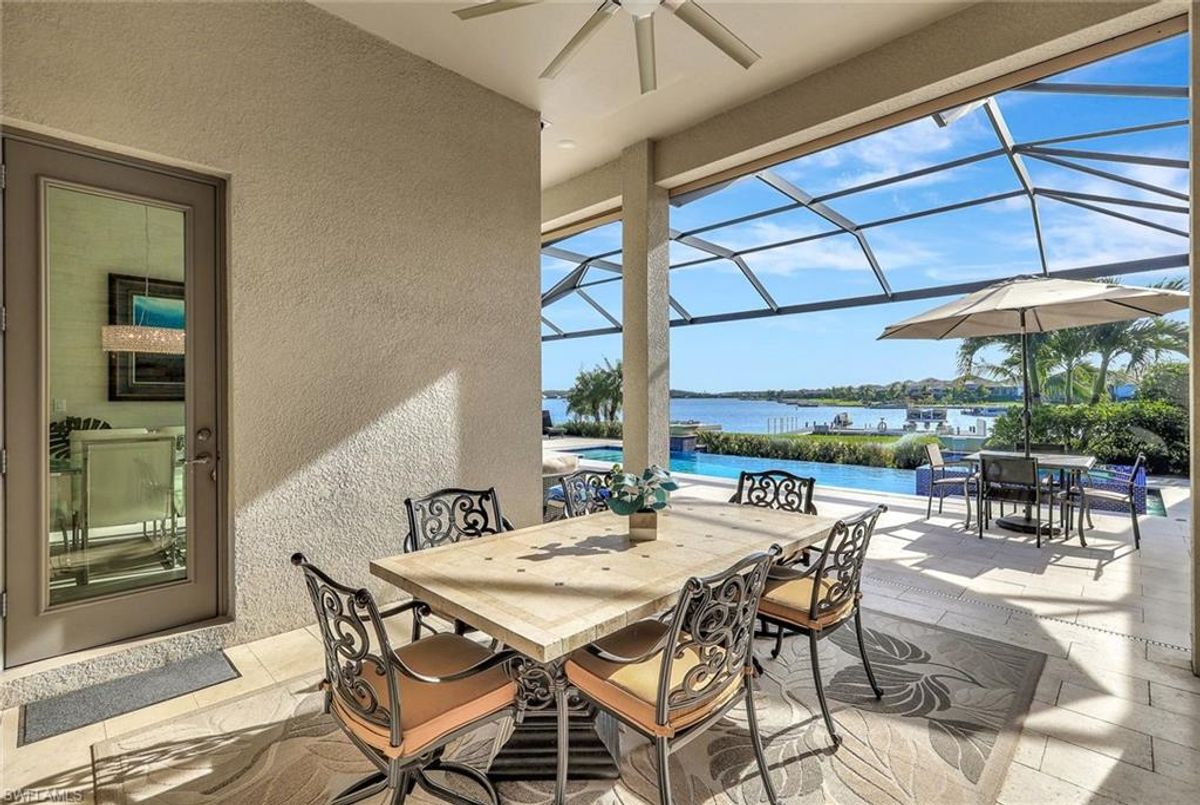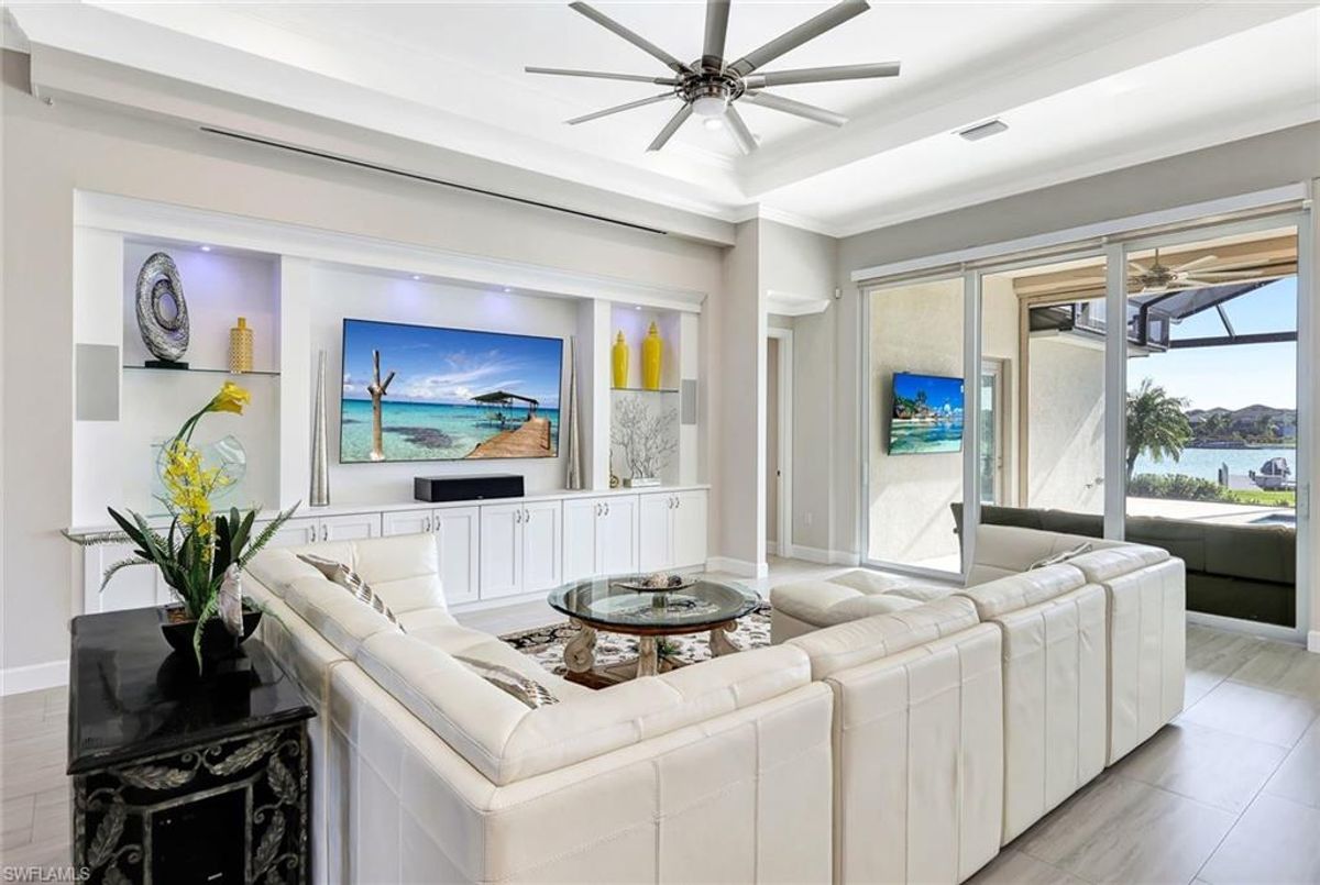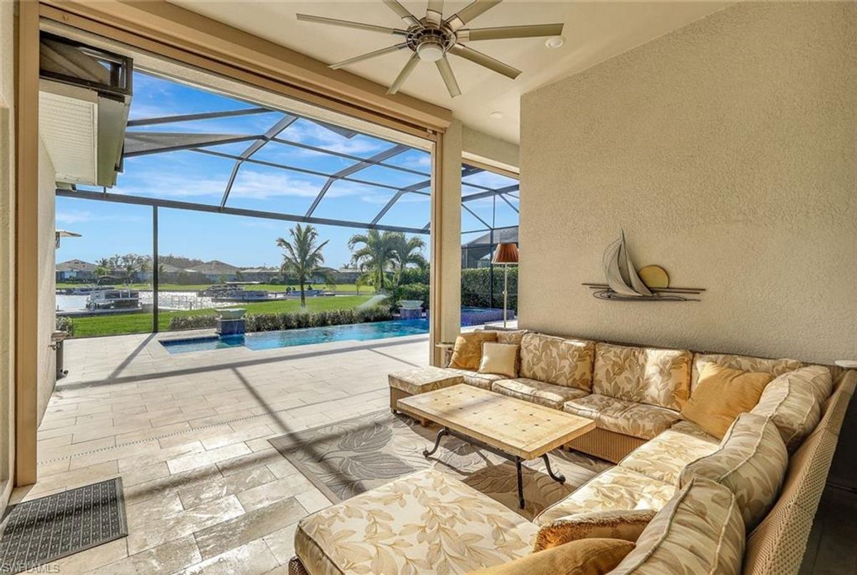 Welcome to luxury LAKEFRONT living at Wildblue!!! Stunning lakefront home with sought after southeast exposure, spectacular lake views and sunrises. Furnishings and the Pontoon Boat are included! This home is nearly 3200 sq ft with elegant large porcelain tile throughout and massive 12 ft ceilings. The gourmet kitchen includes an oversized island, beautiful quartz countertops, high-end stainless-steel appliances and gas cooktop. Custom millwork and impressive crown moldings throughout. This home provides resort style living at its best. There are custom white cabinets throughout and a home theater system. Enjoy boating, kayaking, waterskiing, fishing or just cruising to one of the resort style restaurants on the 600-acre lake just steps from your back door.  Expansive outdoor living space with extended Lanai and upgraded travertine pool pavers.  Full outdoor kitchen.  Custom heated saltwater pool & spa.  Upgraded landscaping with calusa hedge for privacy and large royal palms. This home includes the most sought-after upgrades.  Storm Smart electric hurricane screens, whole house backup generator for power when you need it, private boat dock with dual boat lifts and electric/water connections. The home is situated on one of the most desirable lake lots and includes a high-end security system for safety and peace of mind. Pontoon Boat included!WildBlue is a rare gem in Southwest Florida, offering 800 acres of freshwater lakes and 1,300 acres of preserved land. Amenities include a luxurious clubhouse with formal and casual dining options, a poolside café and bar, a resort-style pool, fitness and yoga facilities, a full-service spa, and a variety of recreational activities such as basketball, pickleball, tennis, bocce ball, and horseshoes. Residents also enjoy access to a beach, boat and kayak launch, and numerous community events.