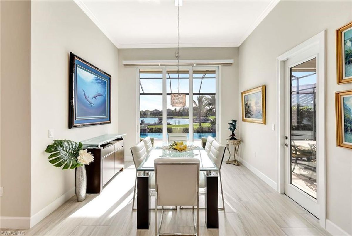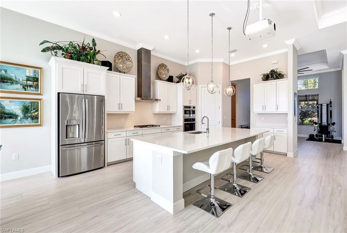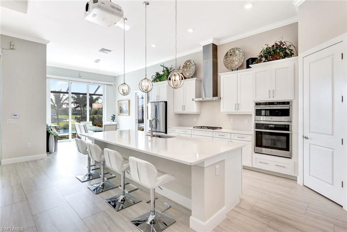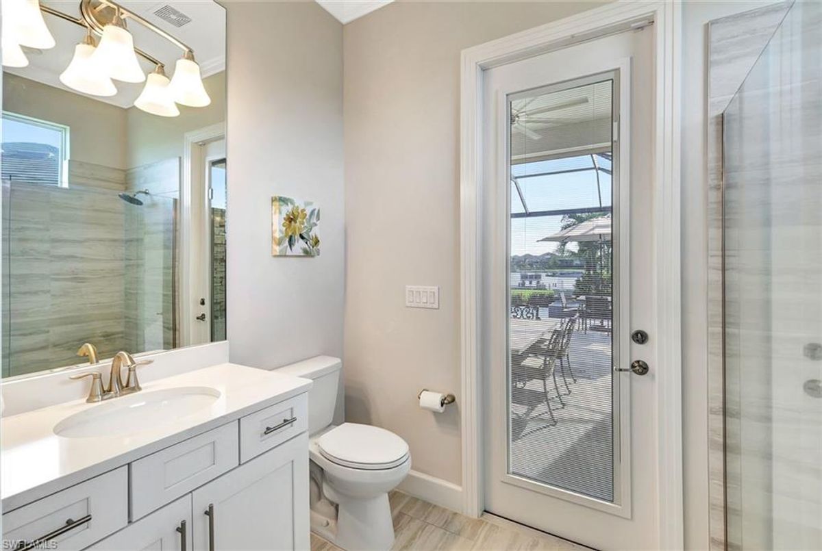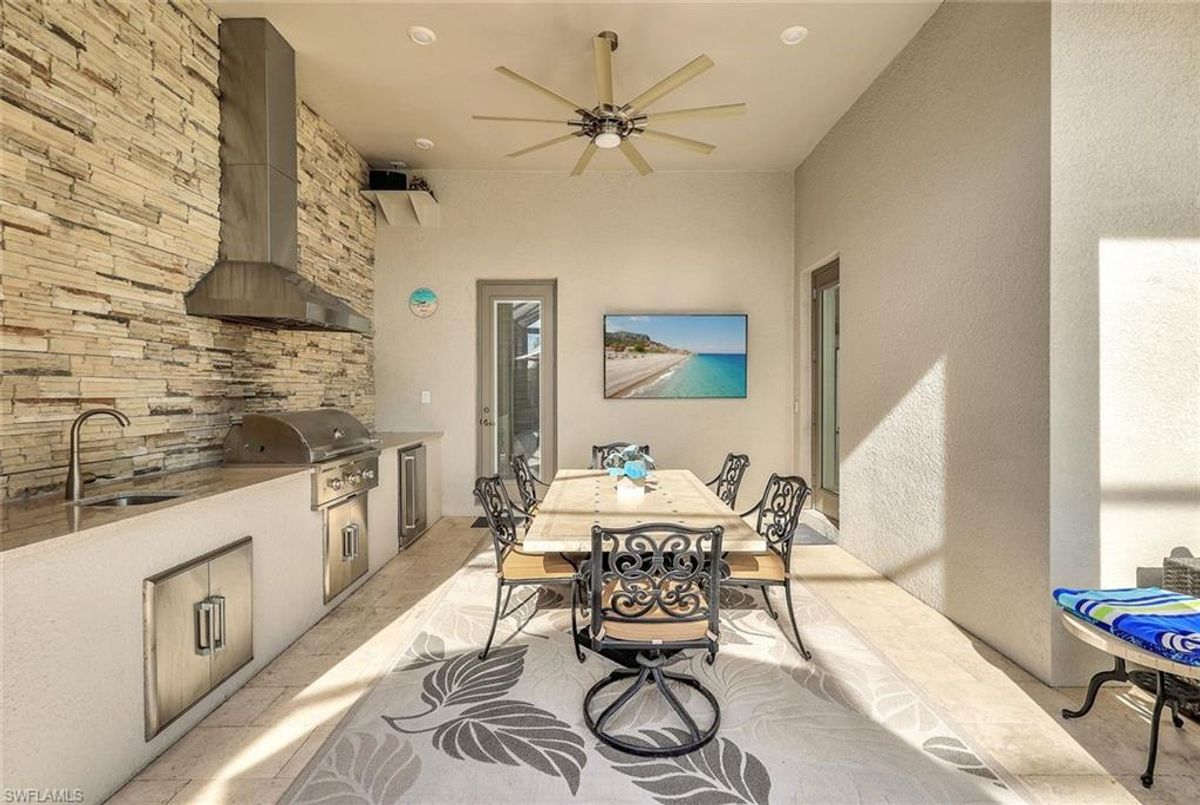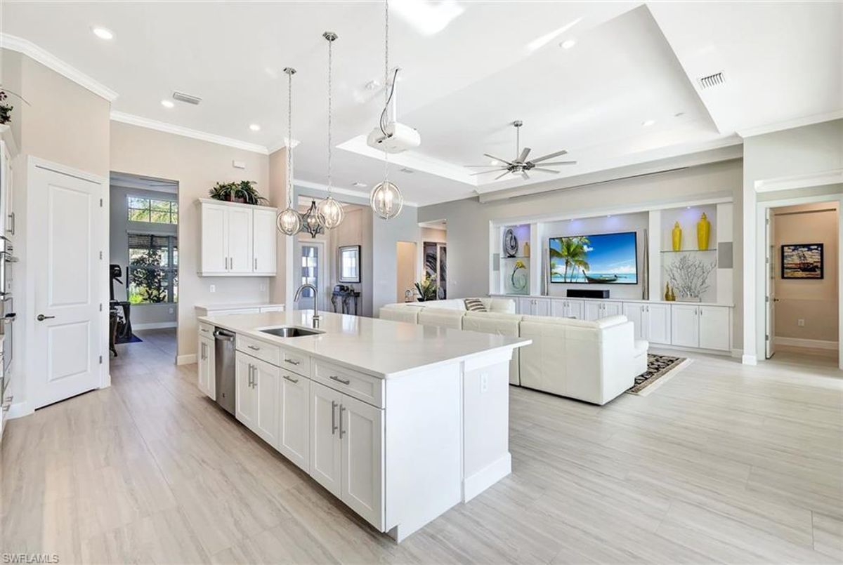 Welcome to luxury LAKEFRONT living at Wildblue!!! Stunning lakefront home with sought after southeast exposure, spectacular lake views and sunrises. Furnishings and the Pontoon Boat are included! This home is nearly 3200 sq ft with elegant large porcelain tile throughout and massive 12 ft ceilings. The gourmet kitchen includes an oversized island, beautiful quartz countertops, high-end stainless-steel appliances and gas cooktop. Custom millwork and impressive crown moldings throughout. This home provides resort style living at its best. There are custom white cabinets throughout and a home theater system. Enjoy boating, kayaking, waterskiing, fishing or just cruising to one of the resort style restaurants on the 600-acre lake just steps from your back door.  Expansive outdoor living space with extended Lanai and upgraded travertine pool pavers.  Full outdoor kitchen.  Custom heated saltwater pool & spa.  Upgraded landscaping with calusa hedge for privacy and large royal palms. This home includes the most sought-after upgrades.  Storm Smart electric hurricane screens, whole house backup generator for power when you need it, private boat dock with dual boat lifts and electric/water connections. The home is situated on one of the most desirable lake lots and includes a high-end security system for safety and peace of mind. Pontoon Boat included!WildBlue is a rare gem in Southwest Florida, offering 800 acres of freshwater lakes and 1,300 acres of preserved land. Amenities include a luxurious clubhouse with formal and casual dining options, a poolside café and bar, a resort-style pool, fitness and yoga facilities, a full-service spa, and a variety of recreational activities such as basketball, pickleball, tennis, bocce ball, and horseshoes. Residents also enjoy access to a beach, boat and kayak launch, and numerous community events.