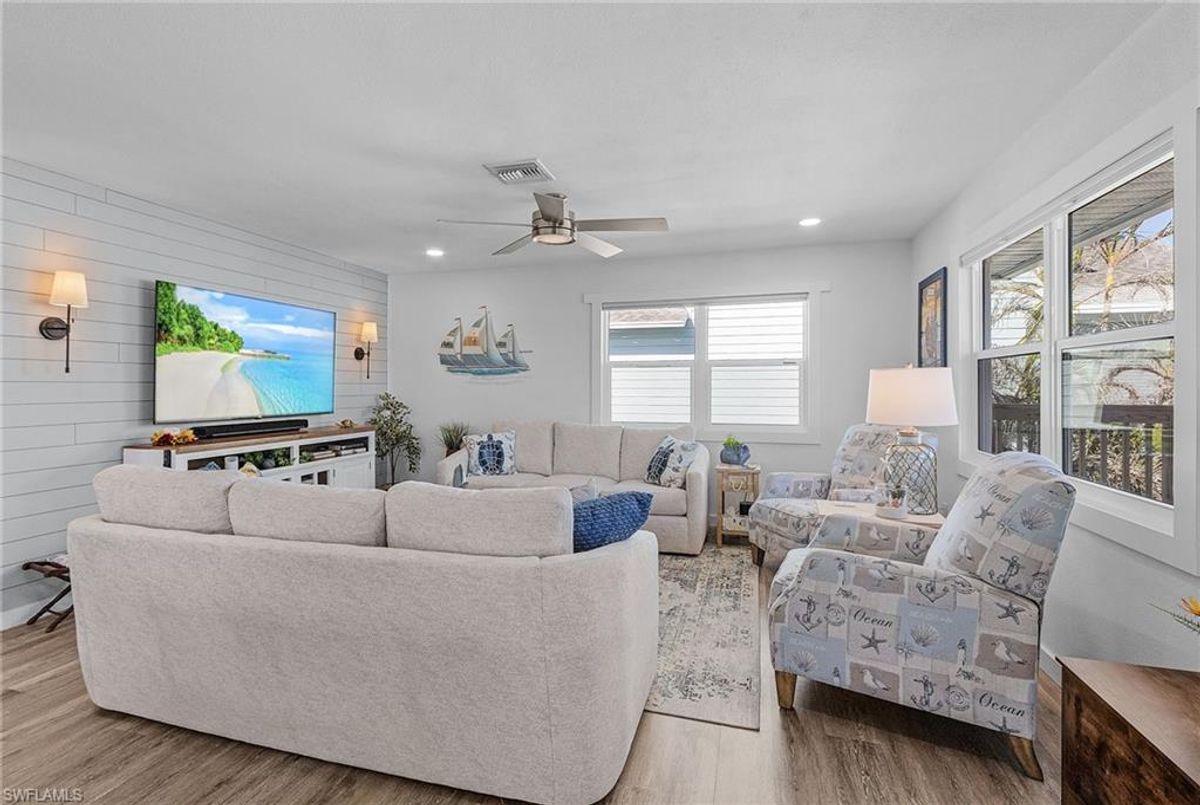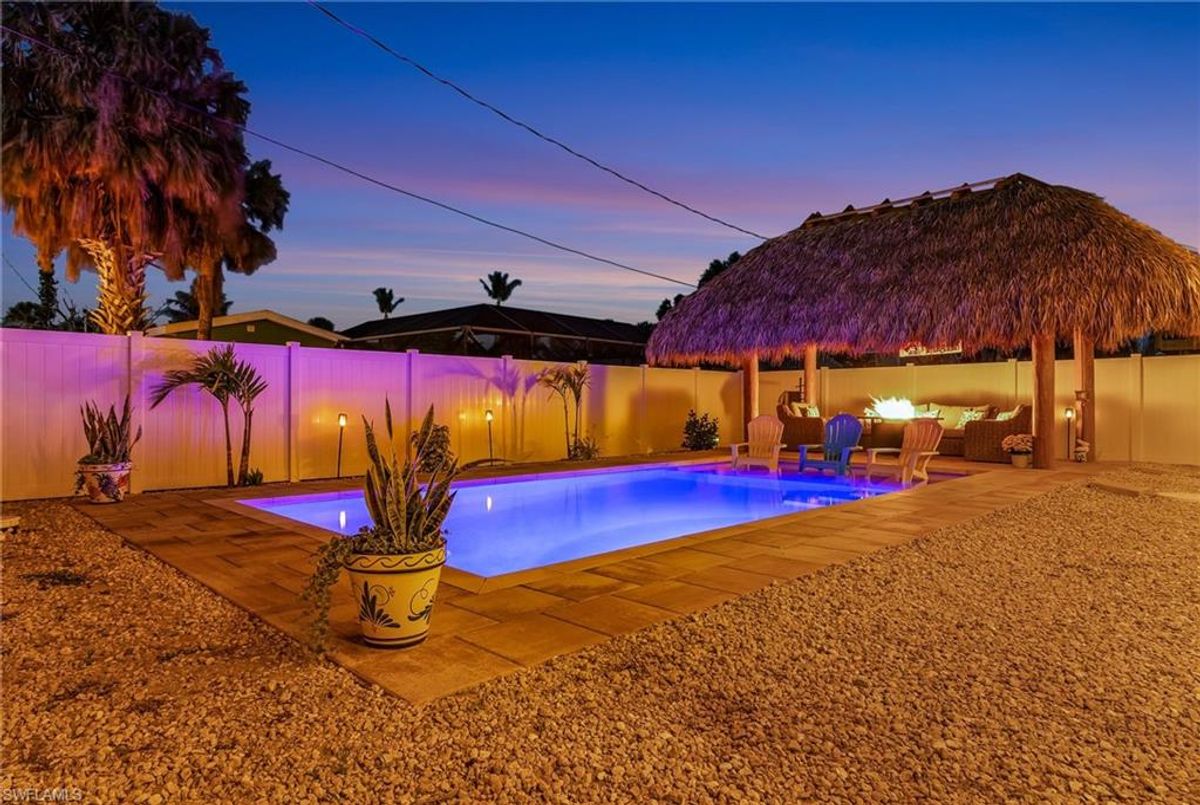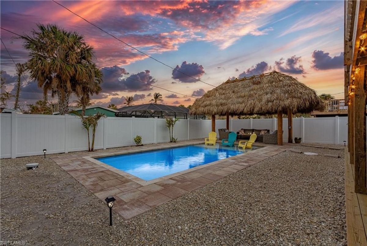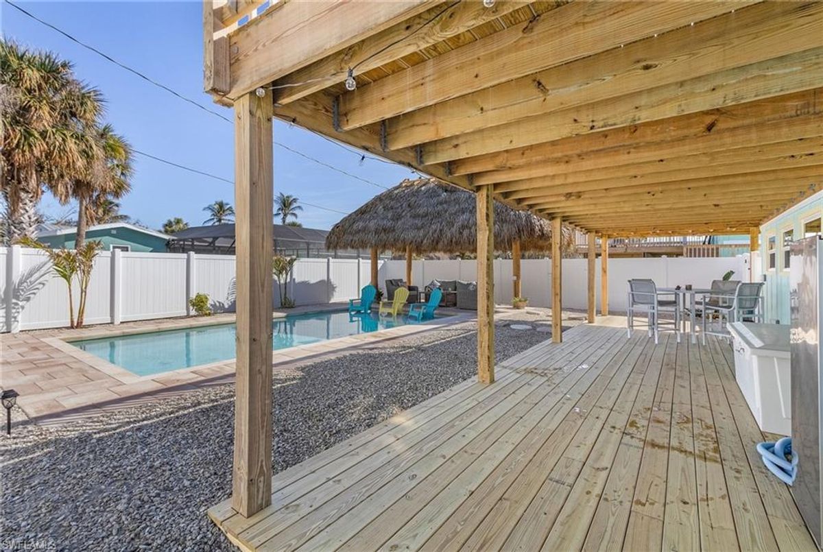 Welcome to our beautiful property on Fort Myers Beach. WHY THIS PROPERTY IS SPECIAL: INCOME PRODUCING GUEST QUARTERS AVERAGING UPWARDS TO $5,500 MONTHLY, WHILE OWNERS RESIDE IN THE HOME, OFFERING DEEDED BEACH ACCESS, ALL NEW IMPACT RESISTANT DOORS & WINDOWS, HEATED POOL, NEW ROOF, NEWLY CONSTRUCTED TIKI HUT, TASTEFUL PAVER POOL DECK AND FULLY FURNISHED TURNKEY HOME! Centrally located, mid Island location next to Publix, full-service marina and restaurant with relaxing back bay views. Convenient 5-minute walk to a deeded beach access and spectacular Gulf sunsets. Charming beach style home offering no HOA fees in a highly desirable rental community. Home offers amazing 3 bedrooms and 2 bathrooms on the main floor and a single bedroom and bathroom in the grandfathered guest quarters. This impressive property is offered fully furnished turnkey, with all new furniture, appliances, A/C system, hot water tank, new roof, 2 bay garage with a 50-amp outlet for a car charging station. All new impact resistant windows, upper and lower deck area, all new heated pool and newly constructed tiki hut on a tastefully pavered pool deck. The yard is completely fenced in for some privacy while enjoying your time outside. Call today for your private showing, you will not be disappointed. This property is in absolute pristine condition and move-in ready. Did I mention an endless supply of scenic and incredible sunsets?