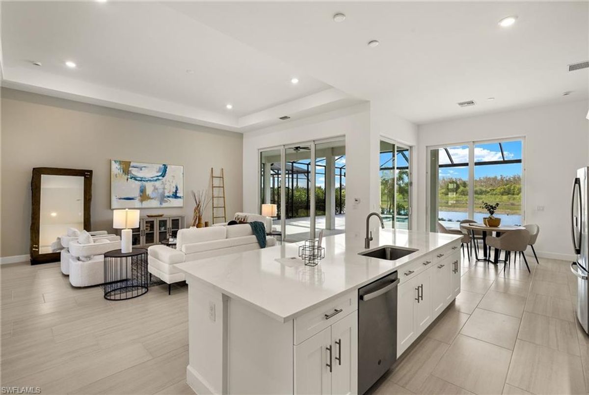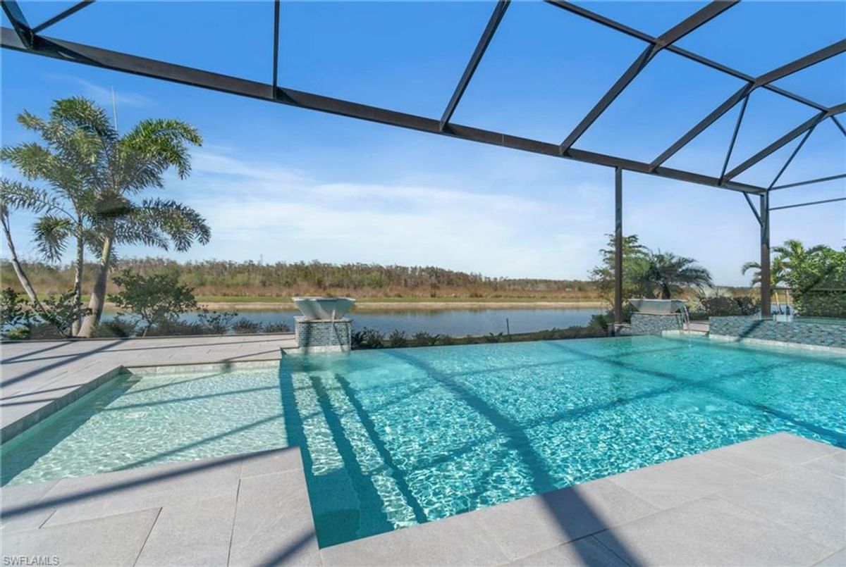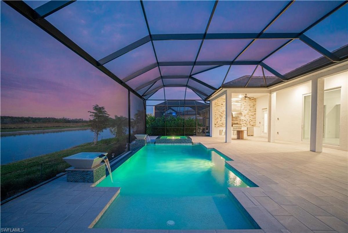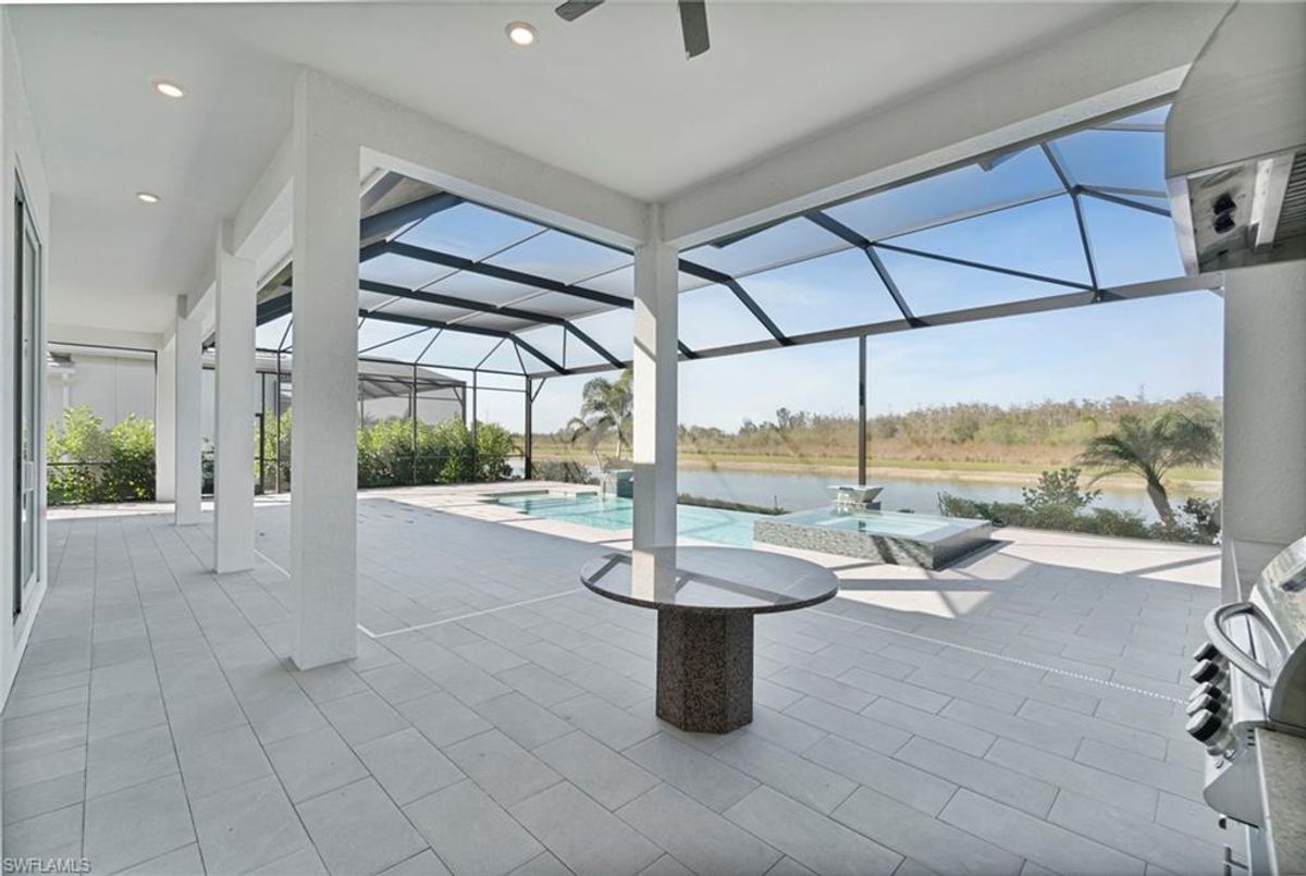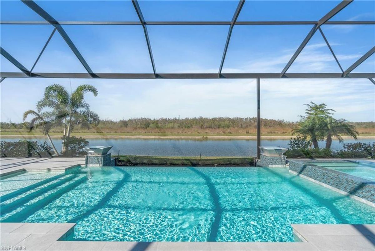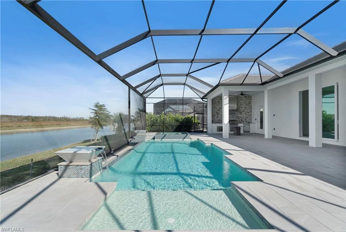 BEST PRICED and highly sought-after IRIS Model in absolute prime location! This new estate home features 4 spacious bedrooms, 3 baths, a 3-car garage - and a huge lanai! The waterfront residence has never been lived in and shows like a model, showcasing superior quality and numerous upgrades added by the owner. This home really stands out for its prime location and peacefulness. Enjoy the proximity - walking distance - to the incredible 20-acre amenity center boasting all you are looking for! This property is ideal for those that love expansive outdoor living, featuring an oversized 799-square-foot lanai and an open-concept design that seamlessly blend the great room, dining room, kitchen, and outdoor pool oasis. The pool deck offers a beautiful infinity pool and spa with breathtaking water features, an outdoor kitchen area, generous seating spaces, and spectacular views of the water and nature preserve. From the moment you enter, you will appreciate the spacious, open-concept layout and fresh, modern feel. The chef’s kitchen is equipped with a large island, soft-close cabinetry, modern white cabinets, high-end Calacatta Gold quartz countertops, stainless steel appliances, and a gas cooktop. Elegant large-format porcelain tile flooring extends throughout the home, adding a touch of sophistication. The owner’s suite offers a separate soaking tub and shower, dual sinks, two spacious walk-in closets, and more, while all guest bedrooms provide ample storage, large walk-in closets, and stylish modern bathrooms. World-class amenities and a vibrant, active lifestyle await in WildBlue, featuring over 800 acres of panoramic freshwater lakes, ideal for boating and water sports. The 20-acre amenity center includes a beautiful clubhouse with a large resort-style pool, indoor and outdoor restaurants, a pub, and a private sand beach. Additional amenities include a professional lap pool, full-service spa, top-notch fitness center, locker rooms with saunas, pickleball courts with an on-site pro and pro shop, a basketball court, bocce, a playground, and three boat ramps providing access to the pristine lakes. One of the many advantages of this property is its location in the lowest-risk flood zone in Lee County, offering peace of mind and insurance savings. A video tour is available to showcase this masterpiece, making it easy to fall in love with this exceptional home. EXCEPTIONAL PRICE, LOWEST FLOOD ZONE, BEST LOCATION IN WILDBLUE and MOVE-IN READY! ...