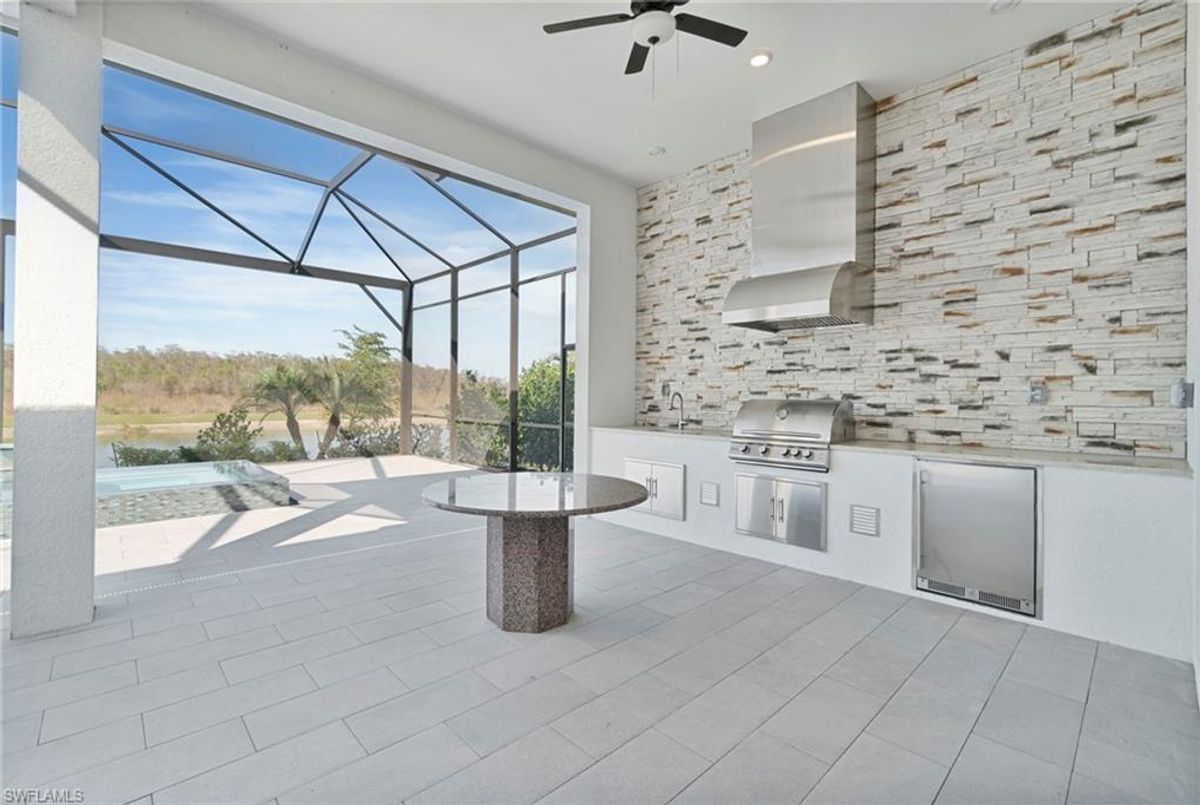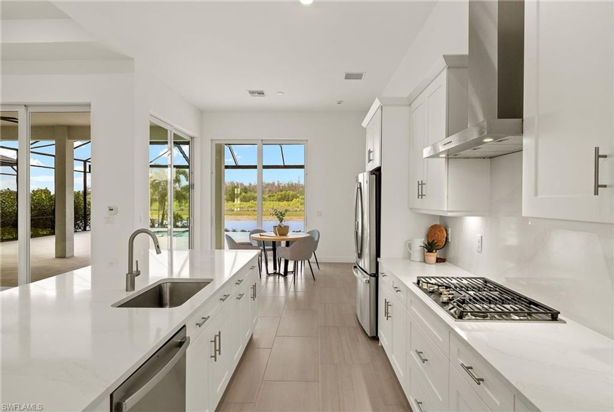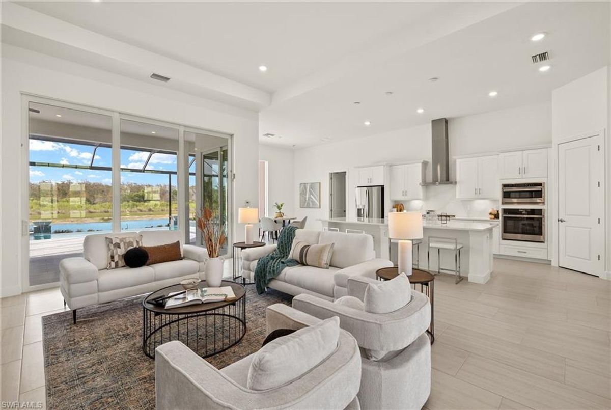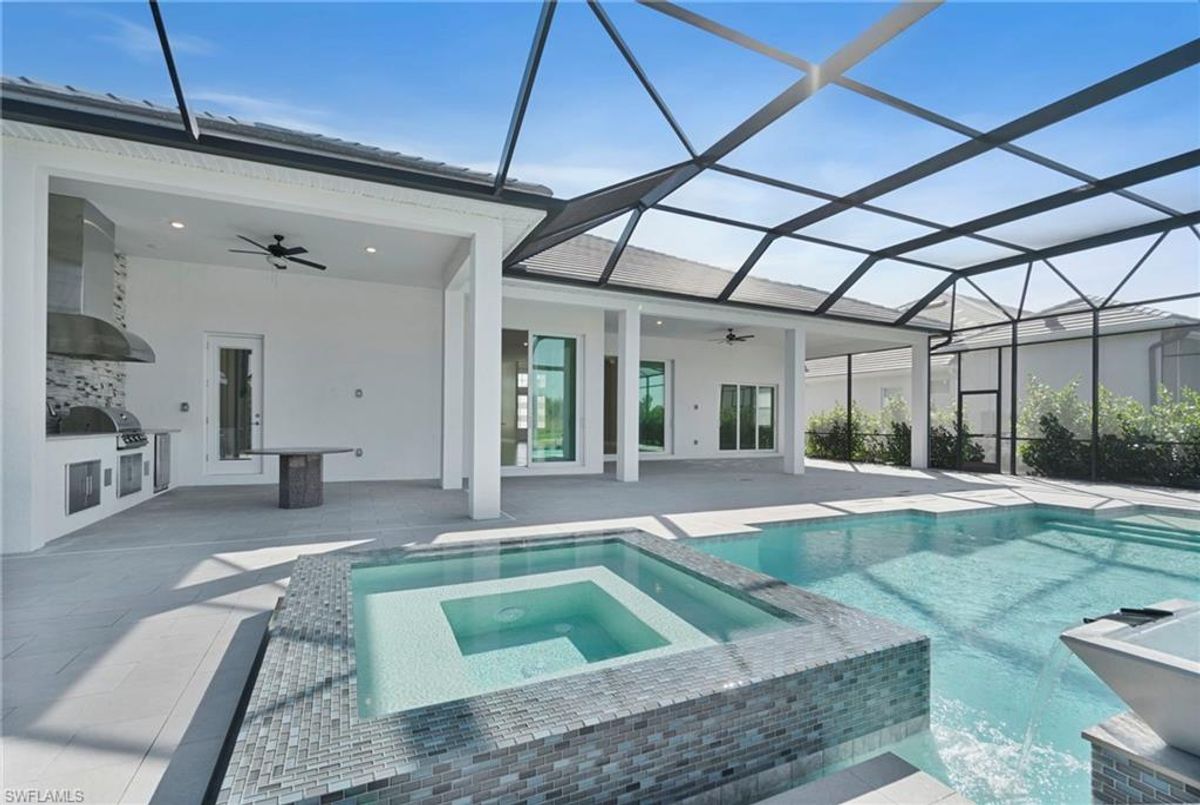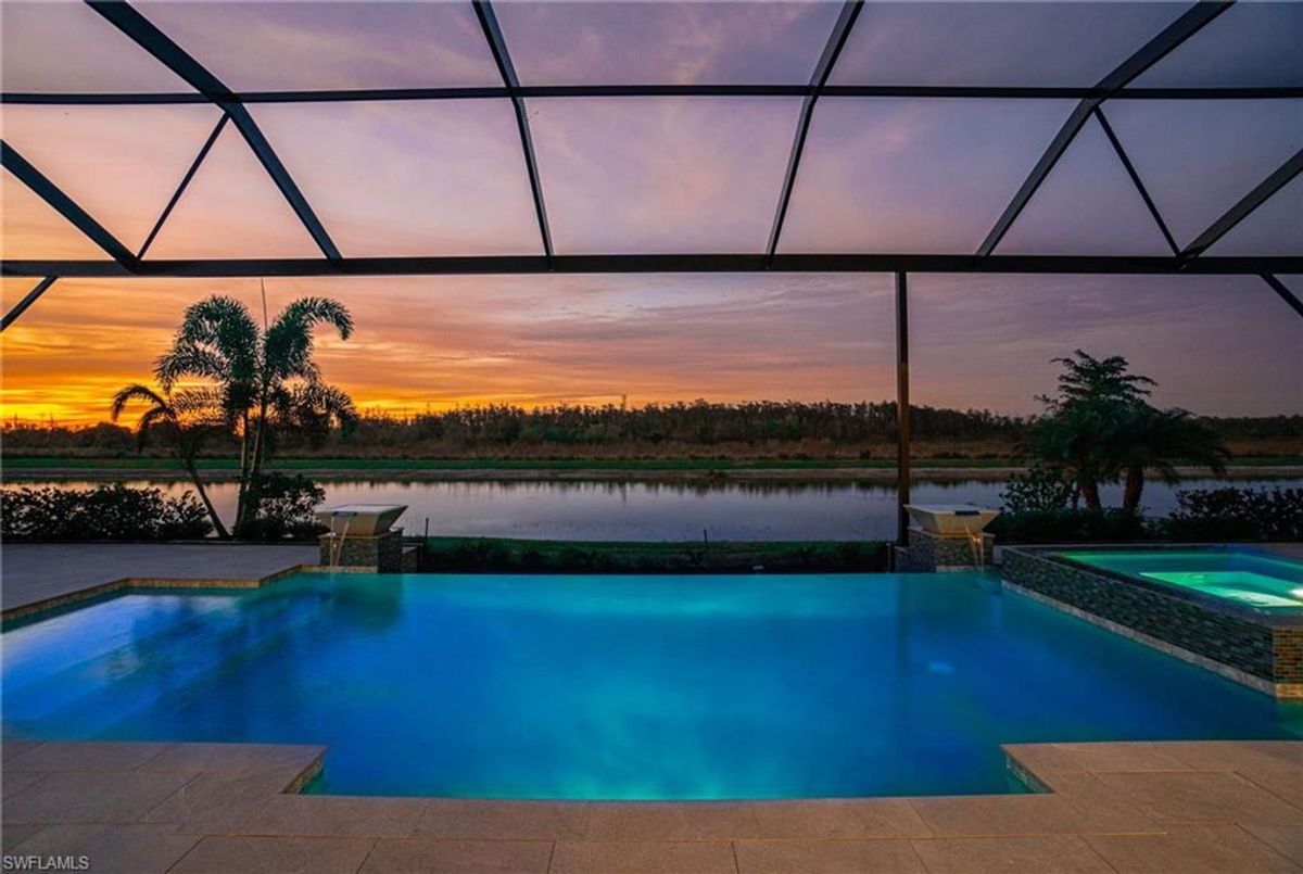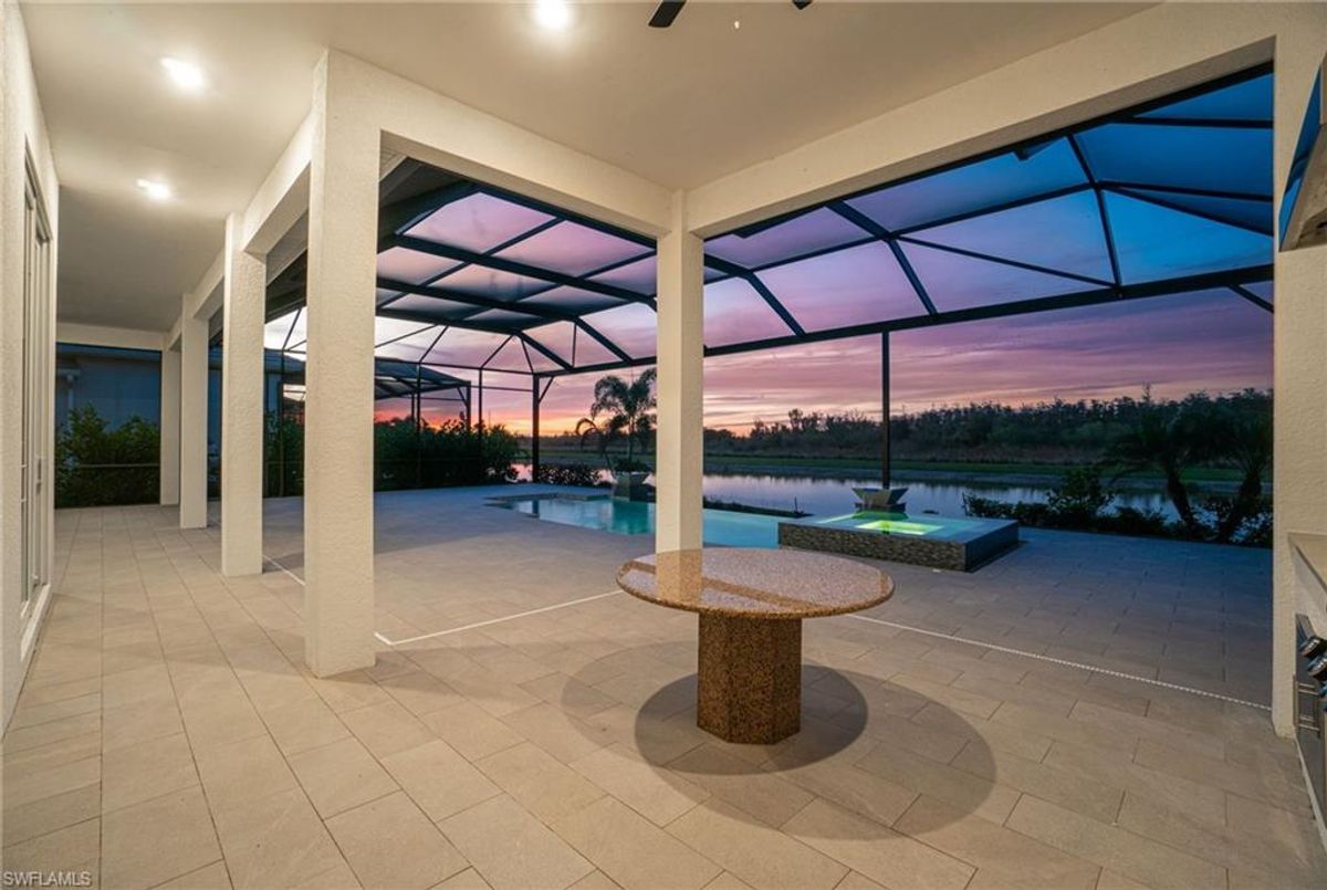 BEST PRICED and highly sought-after IRIS Model in absolute prime location! This new estate home features 4 spacious bedrooms, 3 baths, a 3-car garage - and a huge lanai! The waterfront residence has never been lived in and shows like a model, showcasing superior quality and numerous upgrades added by the owner. This home really stands out for its prime location and peacefulness. Enjoy the proximity - walking distance - to the incredible 20-acre amenity center boasting all you are looking for! This property is ideal for those that love expansive outdoor living, featuring an oversized 799-square-foot lanai and an open-concept design that seamlessly blend the great room, dining room, kitchen, and outdoor pool oasis. The pool deck offers a beautiful infinity pool and spa with breathtaking water features, an outdoor kitchen area, generous seating spaces, and spectacular views of the water and nature preserve. From the moment you enter, you will appreciate the spacious, open-concept layout and fresh, modern feel. The chef’s kitchen is equipped with a large island, soft-close cabinetry, modern white cabinets, high-end Calacatta Gold quartz countertops, stainless steel appliances, and a gas cooktop. Elegant large-format porcelain tile flooring extends throughout the home, adding a touch of sophistication. The owner’s suite offers a separate soaking tub and shower, dual sinks, two spacious walk-in closets, and more, while all guest bedrooms provide ample storage, large walk-in closets, and stylish modern bathrooms. World-class amenities and a vibrant, active lifestyle await in WildBlue, featuring over 800 acres of panoramic freshwater lakes, ideal for boating and water sports. The 20-acre amenity center includes a beautiful clubhouse with a large resort-style pool, indoor and outdoor restaurants, a pub, and a private sand beach. Additional amenities include a professional lap pool, full-service spa, top-notch fitness center, locker rooms with saunas, pickleball courts with an on-site pro and pro shop, a basketball court, bocce, a playground, and three boat ramps providing access to the pristine lakes. One of the many advantages of this property is its location in the lowest-risk flood zone in Lee County, offering peace of mind and insurance savings. A video tour is available to showcase this masterpiece, making it easy to fall in love with this exceptional home. EXCEPTIONAL PRICE, LOWEST FLOOD ZONE, BEST LOCATION IN WILDBLUE and MOVE-IN READY! ...