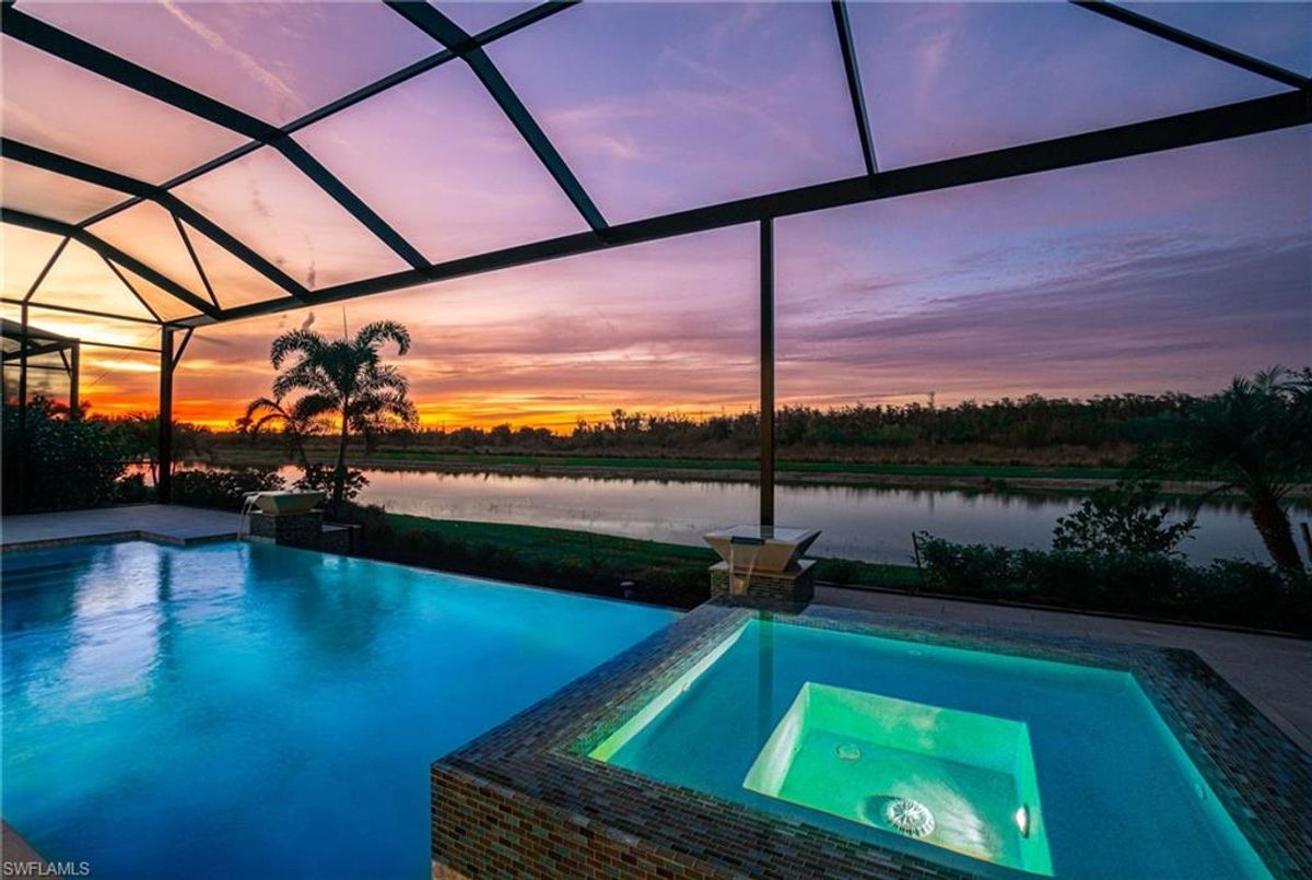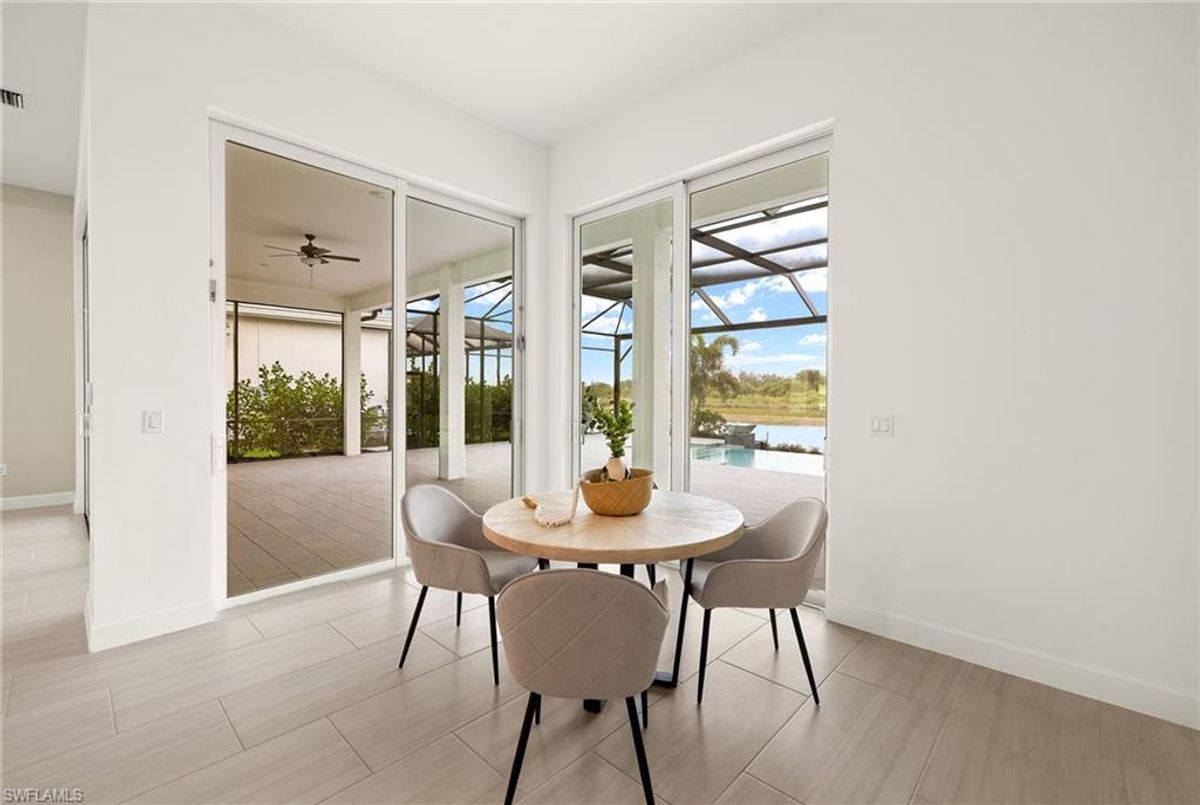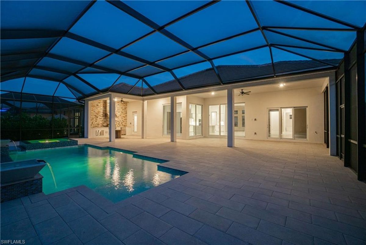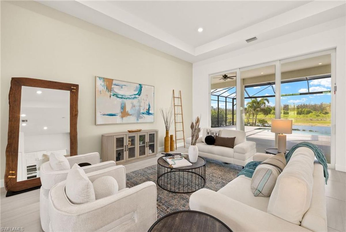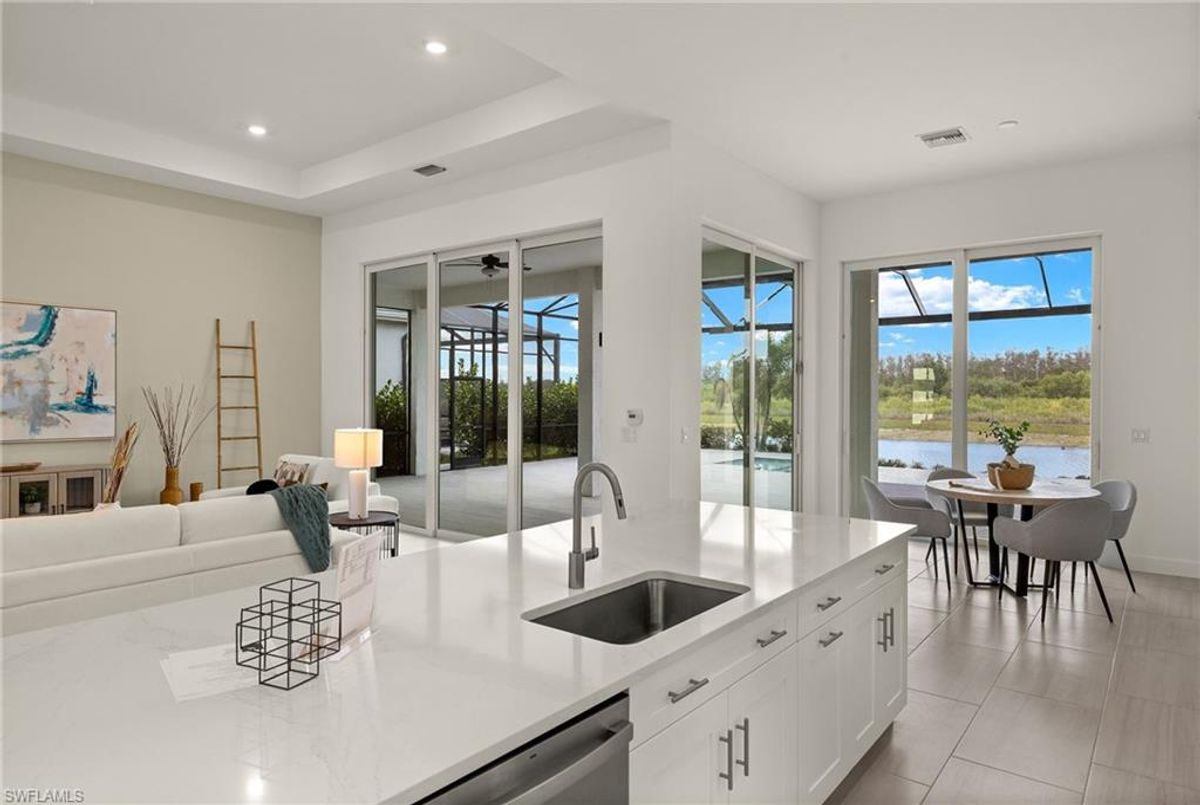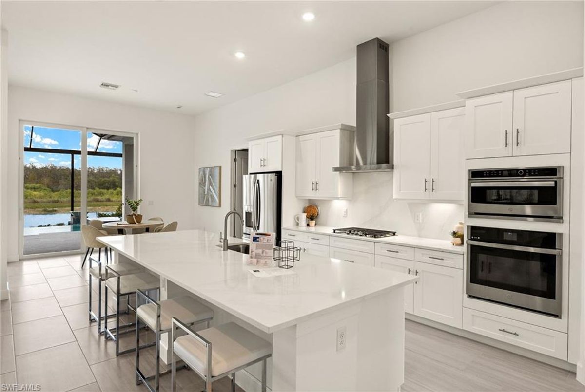 BEST PRICED and highly sought-after IRIS Model in absolute prime location! This new estate home features 4 spacious bedrooms, 3 baths, a 3-car garage - and a huge lanai! The waterfront residence has never been lived in and shows like a model, showcasing superior quality and numerous upgrades added by the owner. This home really stands out for its prime location and peacefulness. Enjoy the proximity - walking distance - to the incredible 20-acre amenity center boasting all you are looking for! This property is ideal for those that love expansive outdoor living, featuring an oversized 799-square-foot lanai and an open-concept design that seamlessly blend the great room, dining room, kitchen, and outdoor pool oasis. The pool deck offers a beautiful infinity pool and spa with breathtaking water features, an outdoor kitchen area, generous seating spaces, and spectacular views of the water and nature preserve. From the moment you enter, you will appreciate the spacious, open-concept layout and fresh, modern feel. The chef’s kitchen is equipped with a large island, soft-close cabinetry, modern white cabinets, high-end Calacatta Gold quartz countertops, stainless steel appliances, and a gas cooktop. Elegant large-format porcelain tile flooring extends throughout the home, adding a touch of sophistication. The owner’s suite offers a separate soaking tub and shower, dual sinks, two spacious walk-in closets, and more, while all guest bedrooms provide ample storage, large walk-in closets, and stylish modern bathrooms. World-class amenities and a vibrant, active lifestyle await in WildBlue, featuring over 800 acres of panoramic freshwater lakes, ideal for boating and water sports. The 20-acre amenity center includes a beautiful clubhouse with a large resort-style pool, indoor and outdoor restaurants, a pub, and a private sand beach. Additional amenities include a professional lap pool, full-service spa, top-notch fitness center, locker rooms with saunas, pickleball courts with an on-site pro and pro shop, a basketball court, bocce, a playground, and three boat ramps providing access to the pristine lakes. One of the many advantages of this property is its location in the lowest-risk flood zone in Lee County, offering peace of mind and insurance savings. A video tour is available to showcase this masterpiece, making it easy to fall in love with this exceptional home. EXCEPTIONAL PRICE, LOWEST FLOOD ZONE, BEST LOCATION IN WILDBLUE and MOVE-IN READY! ...
