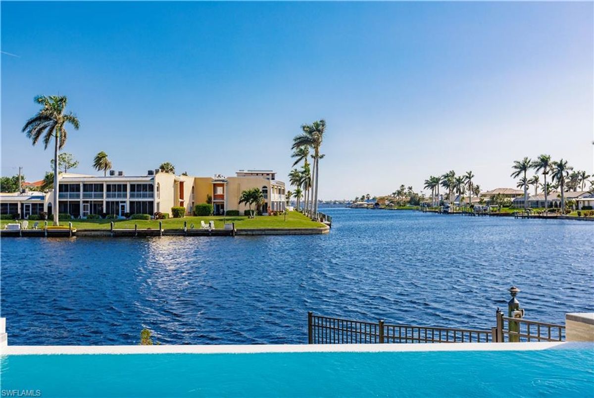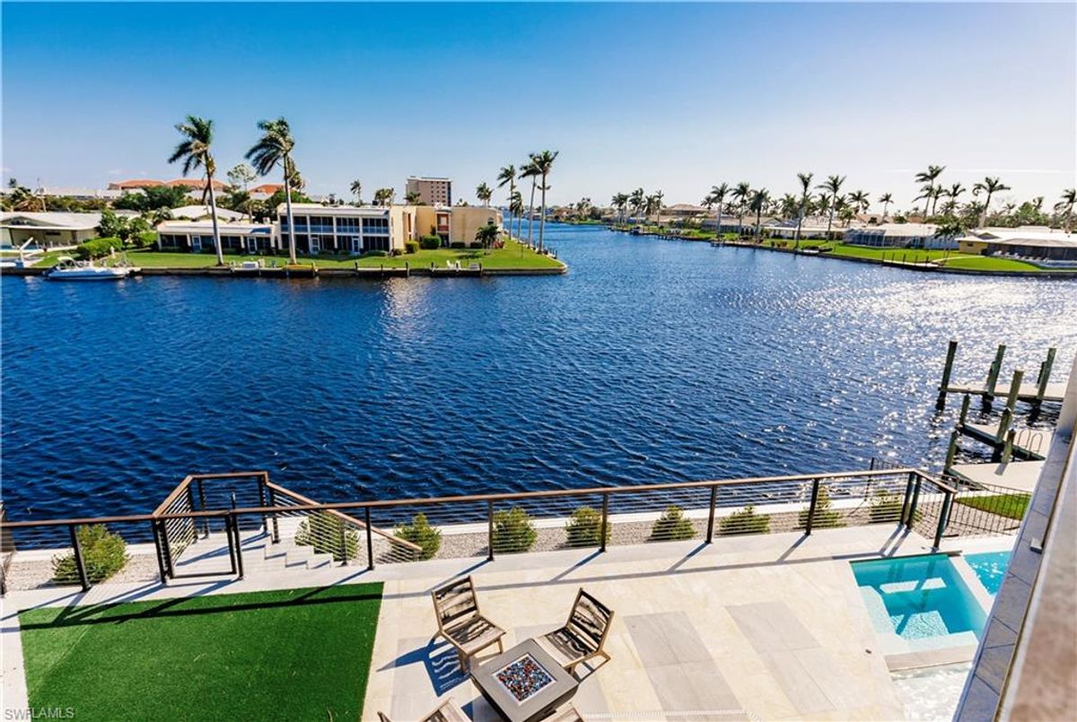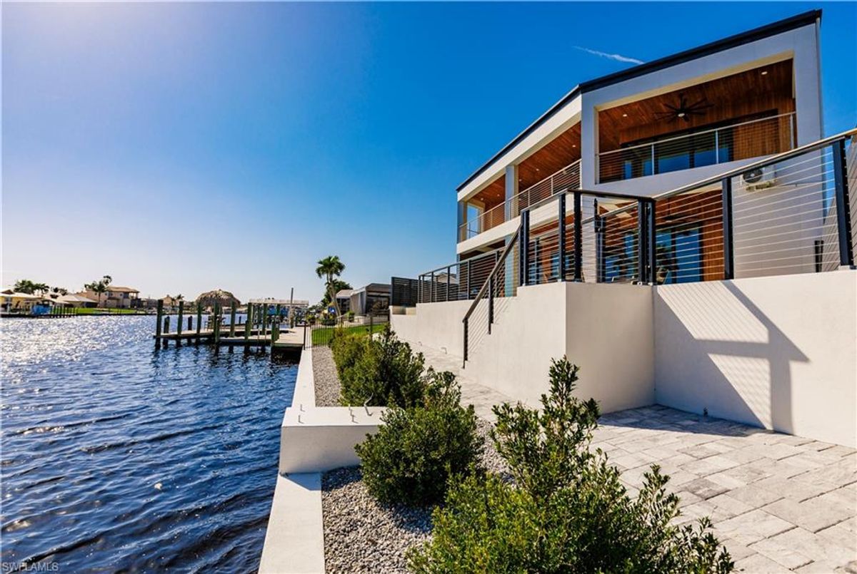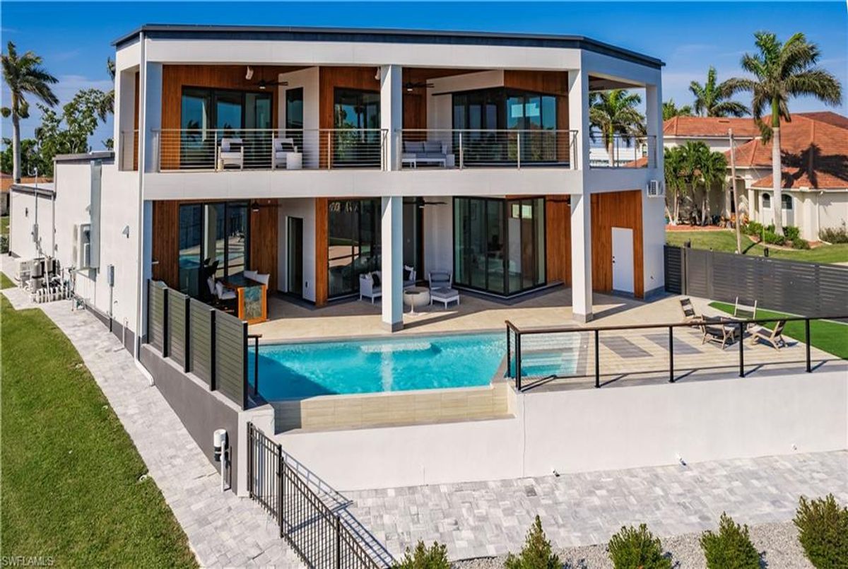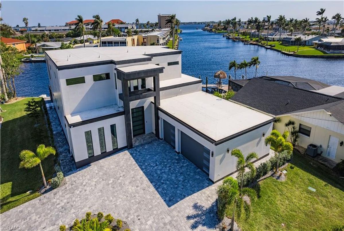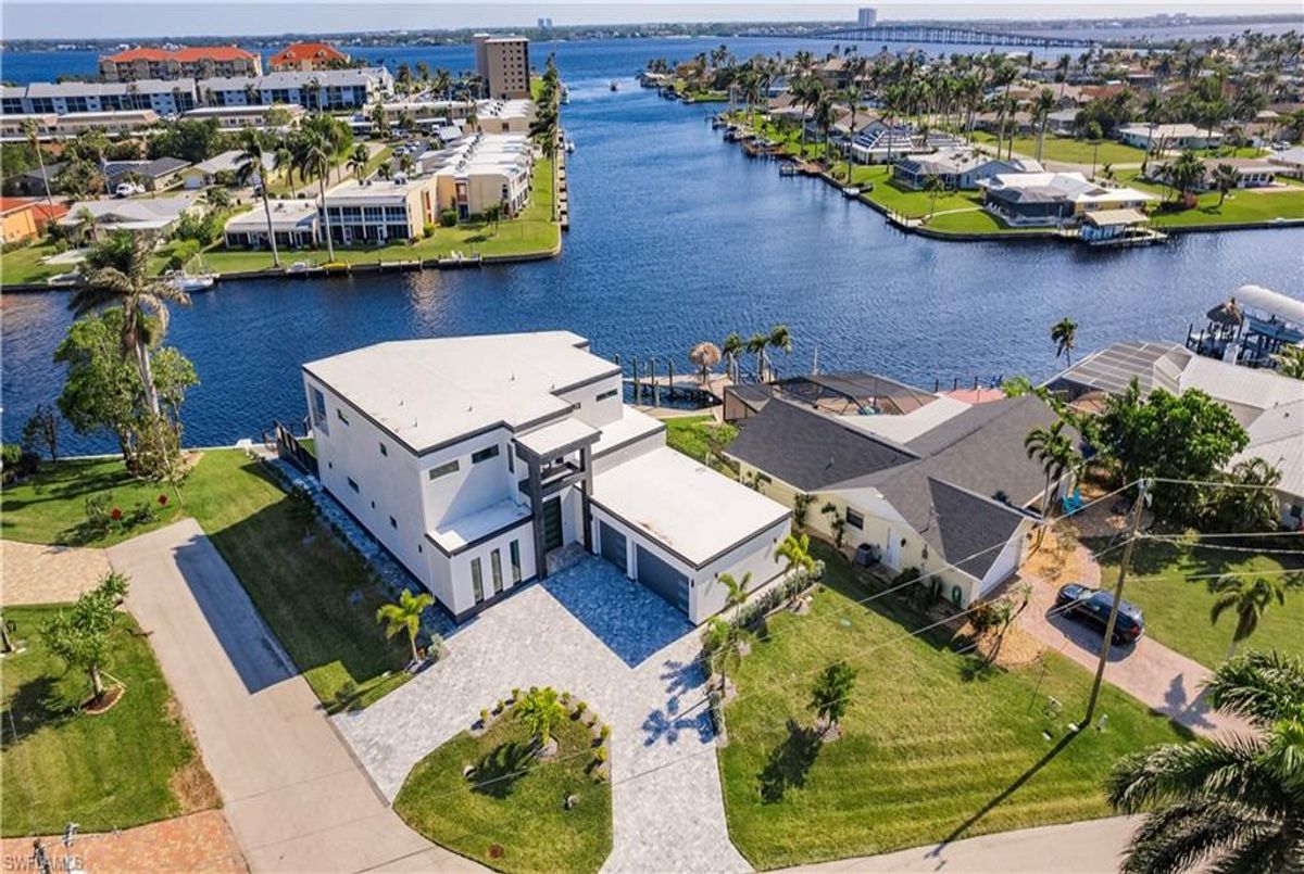 Gulf of America. Miles of canals. Cute burrowing owls. Beautiful parks. No state income tax! And LendingTree just called Cape Coral...Boomtown! What's not to love? Now you can bask in the sunshine in “Captain’s Retreat” ...a Fortress of Elegance!This BRAND NEW, stunning 2- story ultra-modern home was constructed to commercial standards to withstand the worst storms, providing unmatched safety and luxury to you and your loved ones, anytime of the year. For additional safety, it is situated on elevated ground on the 195-foot-wide Orpheus canal, just a few hundred feet from the Caloosahatchee River, protecting your prized vessel from strong waves and high winds. Direct access to Sanibel, Captiva and Useppa Islands and the crystal-clear tropical waters of Gasparilla Sound and the Gulf of America (Mexico). With 90+ feet of seawall, a deep canal and no bridges, it can accommodate a vessel of almost any size. As for the home, no expense was spared in construction and finish. For example, this high-end custom home builder used over a half million dollars of structural concrete over the required Florida code! There is a buried a 500-gallon LP tank to supply the gas stove and outdoor kitchen, and if needed, the Generac WHOLE HOUSE GENERATOR. For windstorm protection, only the highest quality wind/impact windows, sliders and doors were chosen. For finish, there are too many details to list, but as an example, the floating staircase is constructed from 5.5” Brazilian Cumaru wood. Even the furnishings are top quality by Clive Daniel Home Designs. This stunning home has 3900 square feet under A/C and 7700 square feet in total, with 4 bedrooms, 5.5 bathrooms and a Butler’s Pantry with wine cooler, 2nd dishwasher, ice-maker and prep station. On the first floor, there is a private office/den. What is especially unique is two master bedrooms, one on each floor, both with floor with interlocking pocket sliding doors to take advantage of the stunning water views. On the ground floor is a large patio with sitting area, custom pool with infinity edge, (visually) spilling into the canal, spa, sun shelf and sunbathing deck. There is also a full pool bathroom, complete outdoor kitchen and a firepit overlooking the canal. Imagine not just the enjoyment of living here, but also entertaining family, friends and business colleagues. This property screams “MASSIVE SUCCESS!” Brand new, Ultra-modern, stunning views, built like a fortress with gorgeous, quality furnishings. Come see what the easy Florida lifestyle is about, living in this VERY special “Captain’s Retreat”! (See aerial via Virtual Tour link)