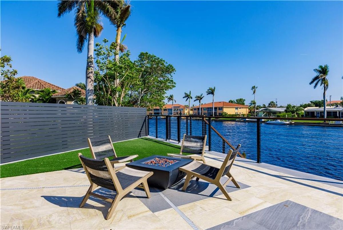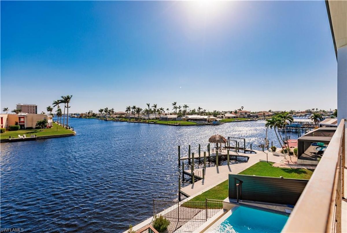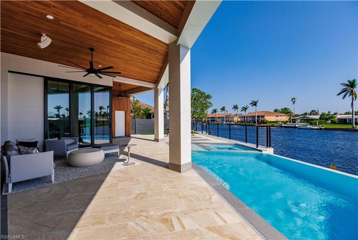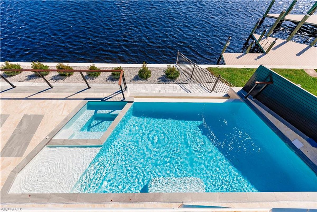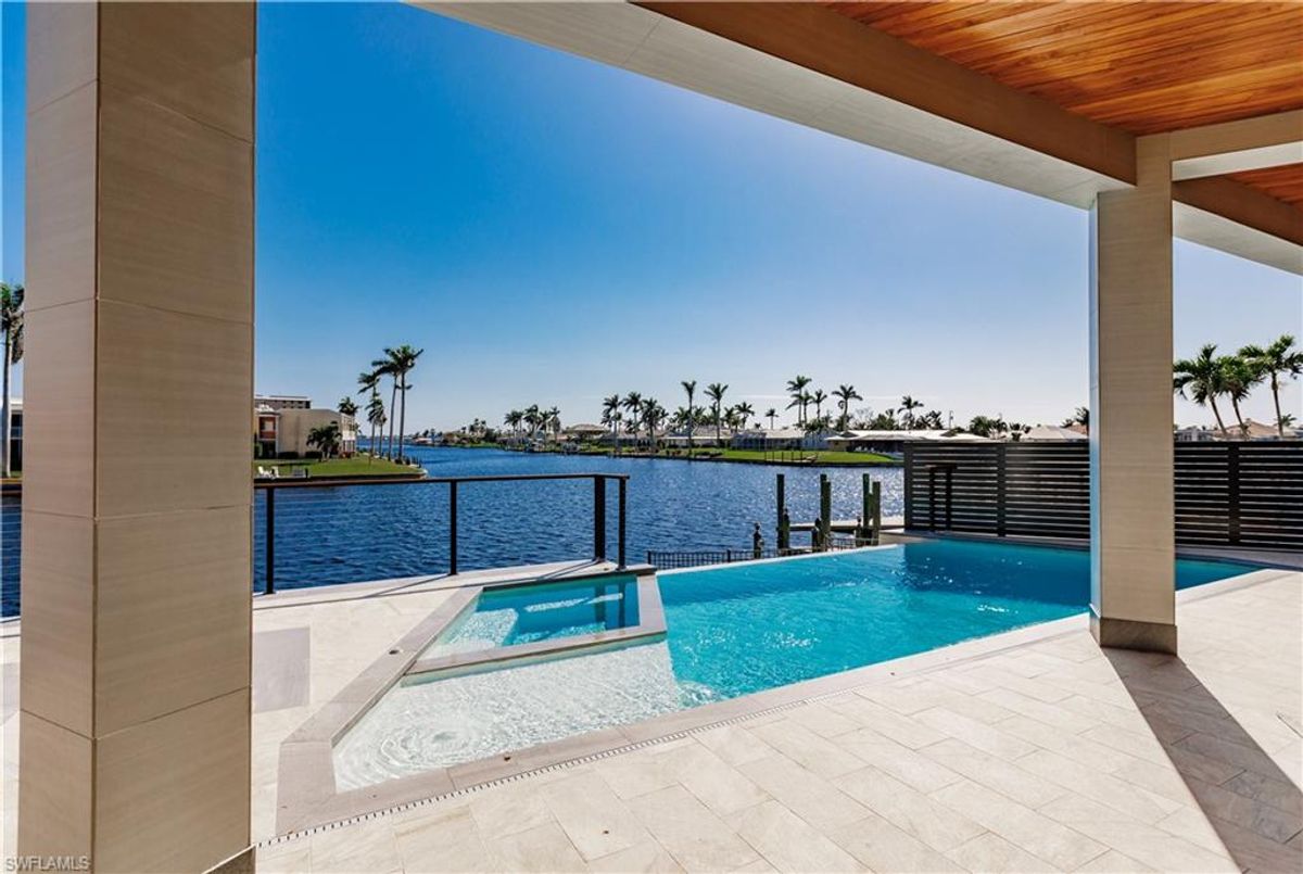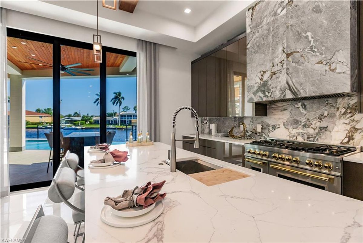Gulf of America. Miles of canals. Cute burrowing owls. Beautiful parks. No state income tax! And LendingTree just called Cape Coral...Boomtown! What's not to love? Now you can bask in the sunshine in “Captain’s Retreat” ...a Fortress of Elegance!This BRAND NEW, stunning 2- story ultra-modern home was constructed to commercial standards to withstand the worst storms, providing unmatched safety and luxury to you and your loved ones, anytime of the year. For additional safety, it is situated on elevated ground on the 195-foot-wide Orpheus canal, just a few hundred feet from the Caloosahatchee River, protecting your prized vessel from strong waves and high winds. Direct access to Sanibel, Captiva and Useppa Islands and the crystal-clear tropical waters of Gasparilla Sound and the Gulf of America (Mexico). With 90+ feet of seawall, a deep canal and no bridges, it can accommodate a vessel of almost any size. As for the home, no expense was spared in construction and finish. For example, this high-end custom home builder used over a half million dollars of structural concrete over the required Florida code! There is a buried a 500-gallon LP tank to supply the gas stove and outdoor kitchen, and if needed, the Generac WHOLE HOUSE GENERATOR. For windstorm protection, only the highest quality wind/impact windows, sliders and doors were chosen. For finish, there are too many details to list, but as an example, the floating staircase is constructed from 5.5” Brazilian Cumaru wood. Even the furnishings are top quality by Clive Daniel Home Designs. This stunning home has 3900 square feet under A/C and 7700 square feet in total, with 4 bedrooms, 5.5 bathrooms and a Butler’s Pantry with wine cooler, 2nd dishwasher, ice-maker and prep station. On the first floor, there is a private office/den. What is especially unique is two master bedrooms, one on each floor, both with floor with interlocking pocket sliding doors to take advantage of the stunning water views. On the ground floor is a large patio with sitting area, custom pool with infinity edge, (visually) spilling into the canal, spa, sun shelf and sunbathing deck. There is also a full pool bathroom, complete outdoor kitchen and a firepit overlooking the canal. Imagine not just the enjoyment of living here, but also entertaining family, friends and business colleagues. This property screams “MASSIVE SUCCESS!” Brand new, Ultra-modern, stunning views, built like a fortress with gorgeous, quality furnishings. Come see what the easy Florida lifestyle is about, living in this VERY special “Captain’s Retreat”! (See aerial via Virtual Tour link)