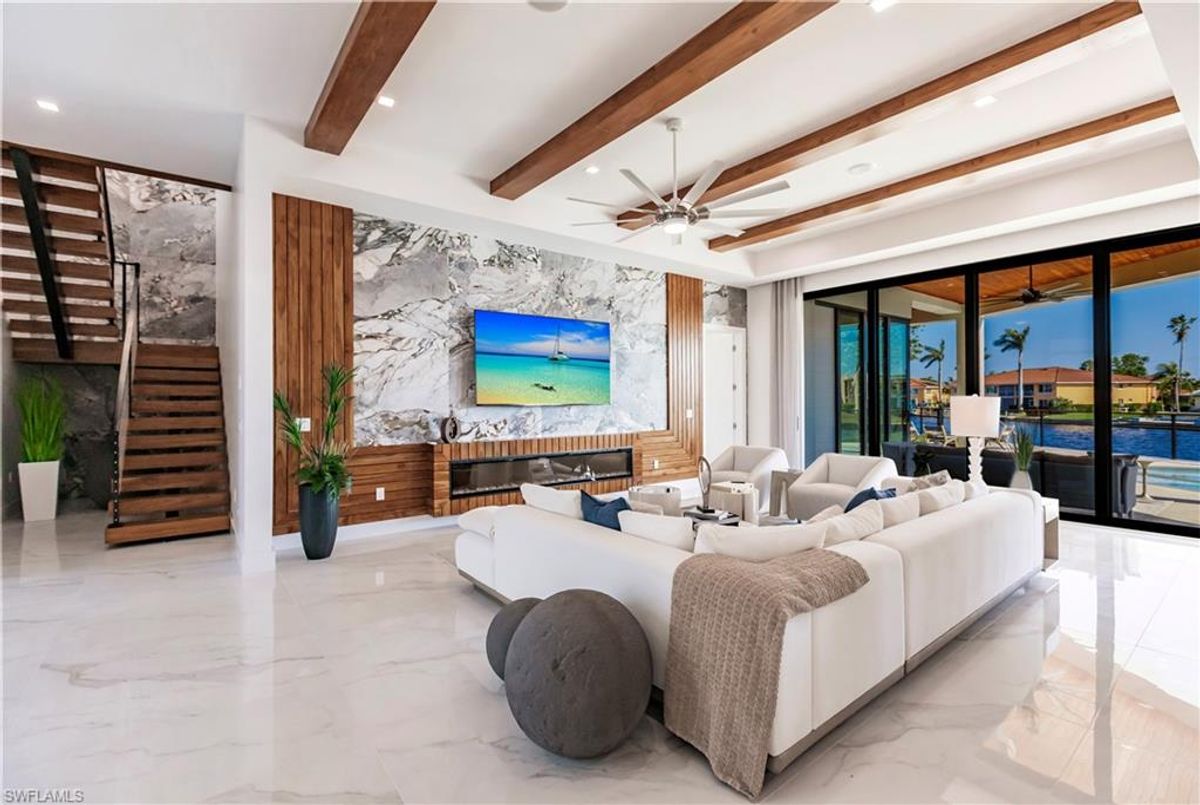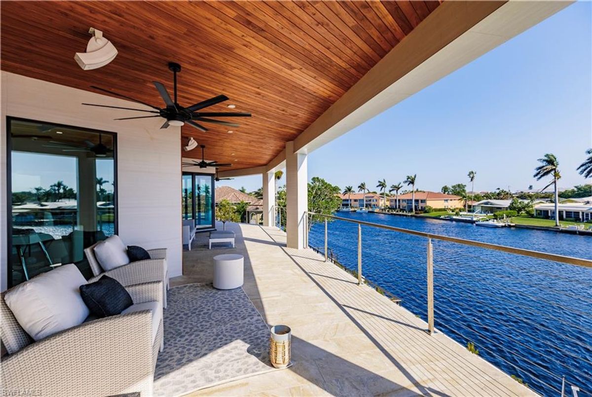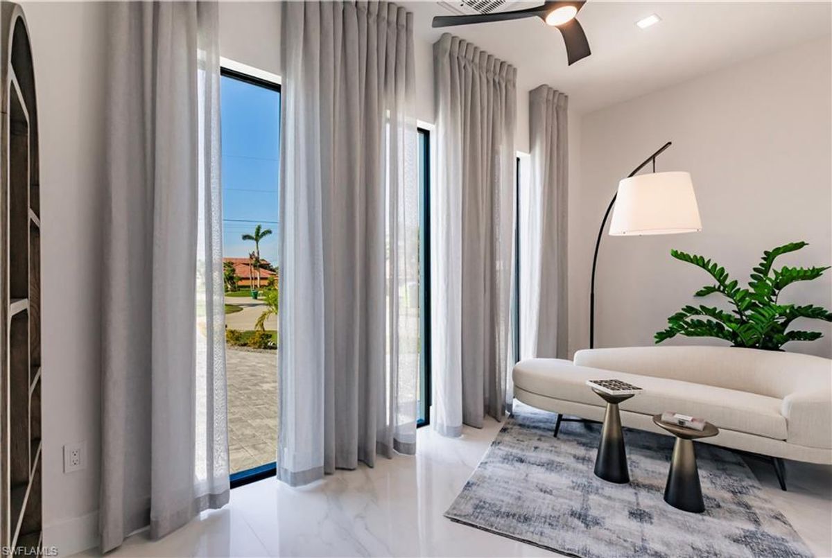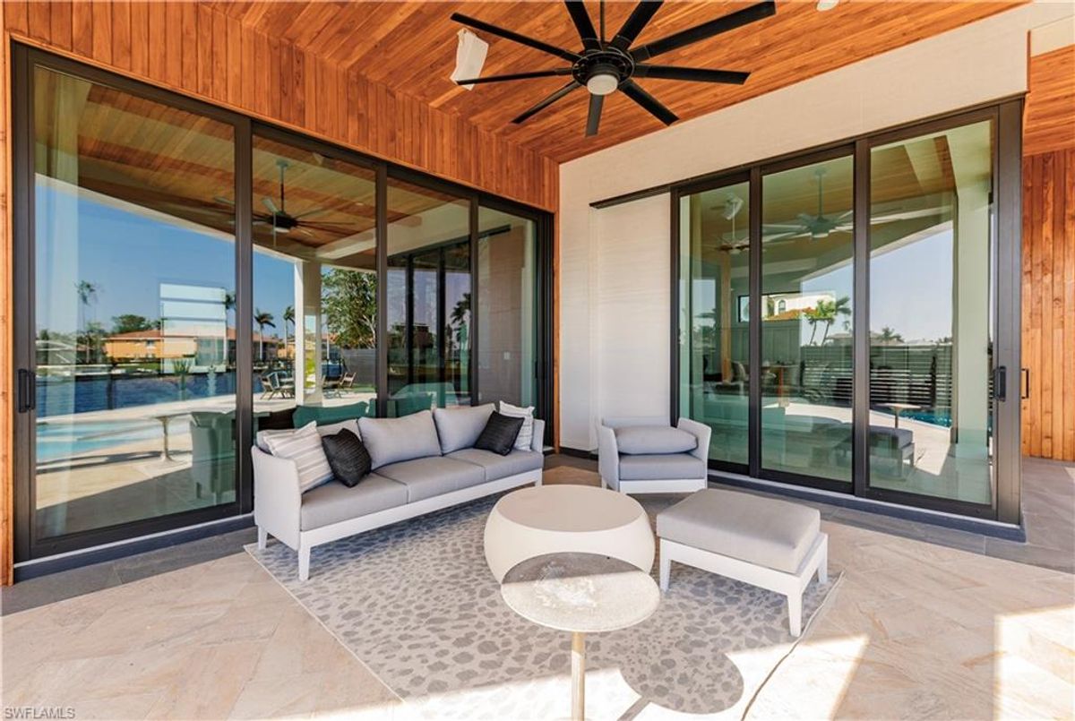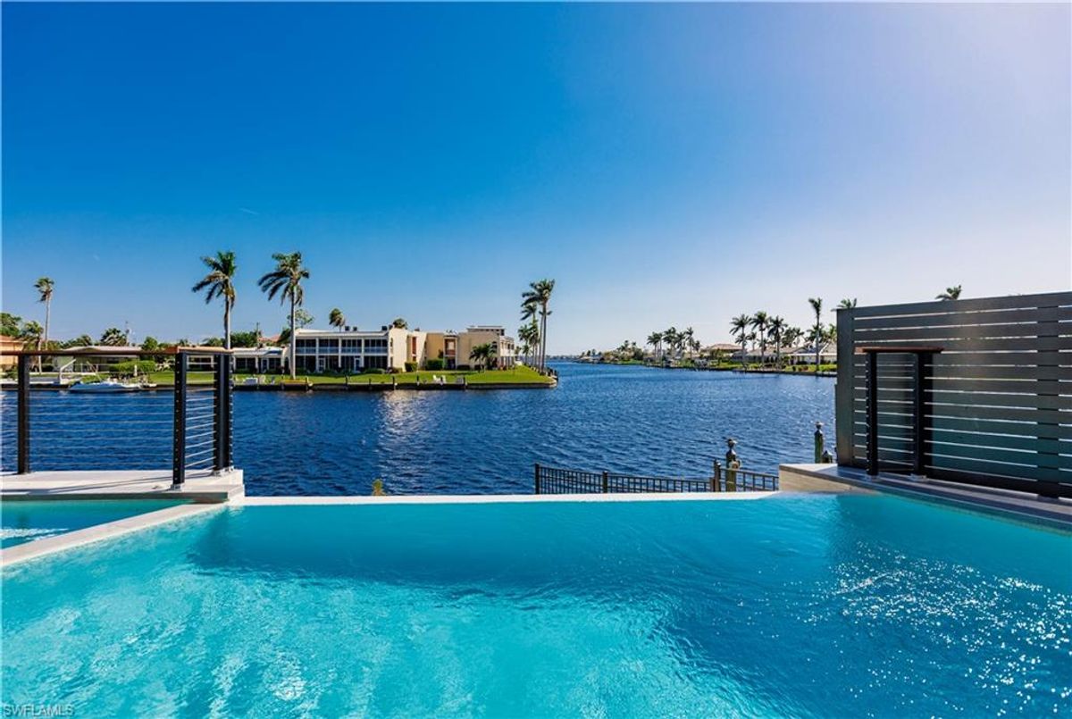 Gulf of America. Miles of canals. Cute burrowing owls. Beautiful parks. No state income tax! And LendingTree just called Cape Coral...Boomtown! What's not to love? Now you can bask in the sunshine in “Captain’s Retreat” ...a Fortress of Elegance!This BRAND NEW, stunning 2- story ultra-modern home was constructed to commercial standards to withstand the worst storms, providing unmatched safety and luxury to you and your loved ones, anytime of the year. For additional safety, it is situated on elevated ground on the 195-foot-wide Orpheus canal, just a few hundred feet from the Caloosahatchee River, protecting your prized vessel from strong waves and high winds. Direct access to Sanibel, Captiva and Useppa Islands and the crystal-clear tropical waters of Gasparilla Sound and the Gulf of America (Mexico). With 90+ feet of seawall, a deep canal and no bridges, it can accommodate a vessel of almost any size. As for the home, no expense was spared in construction and finish. For example, this high-end custom home builder used over a half million dollars of structural concrete over the required Florida code! There is a buried a 500-gallon LP tank to supply the gas stove and outdoor kitchen, and if needed, the Generac WHOLE HOUSE GENERATOR. For windstorm protection, only the highest quality wind/impact windows, sliders and doors were chosen. For finish, there are too many details to list, but as an example, the floating staircase is constructed from 5.5” Brazilian Cumaru wood. Even the furnishings are top quality by Clive Daniel Home Designs. This stunning home has 3900 square feet under A/C and 7700 square feet in total, with 4 bedrooms, 5.5 bathrooms and a Butler’s Pantry with wine cooler, 2nd dishwasher, ice-maker and prep station. On the first floor, there is a private office/den. What is especially unique is two master bedrooms, one on each floor, both with floor with interlocking pocket sliding doors to take advantage of the stunning water views. On the ground floor is a large patio with sitting area, custom pool with infinity edge, (visually) spilling into the canal, spa, sun shelf and sunbathing deck. There is also a full pool bathroom, complete outdoor kitchen and a firepit overlooking the canal. Imagine not just the enjoyment of living here, but also entertaining family, friends and business colleagues. This property screams “MASSIVE SUCCESS!” Brand new, Ultra-modern, stunning views, built like a fortress with gorgeous, quality furnishings. Come see what the easy Florida lifestyle is about, living in this VERY special “Captain’s Retreat”! (See aerial via Virtual Tour link)
