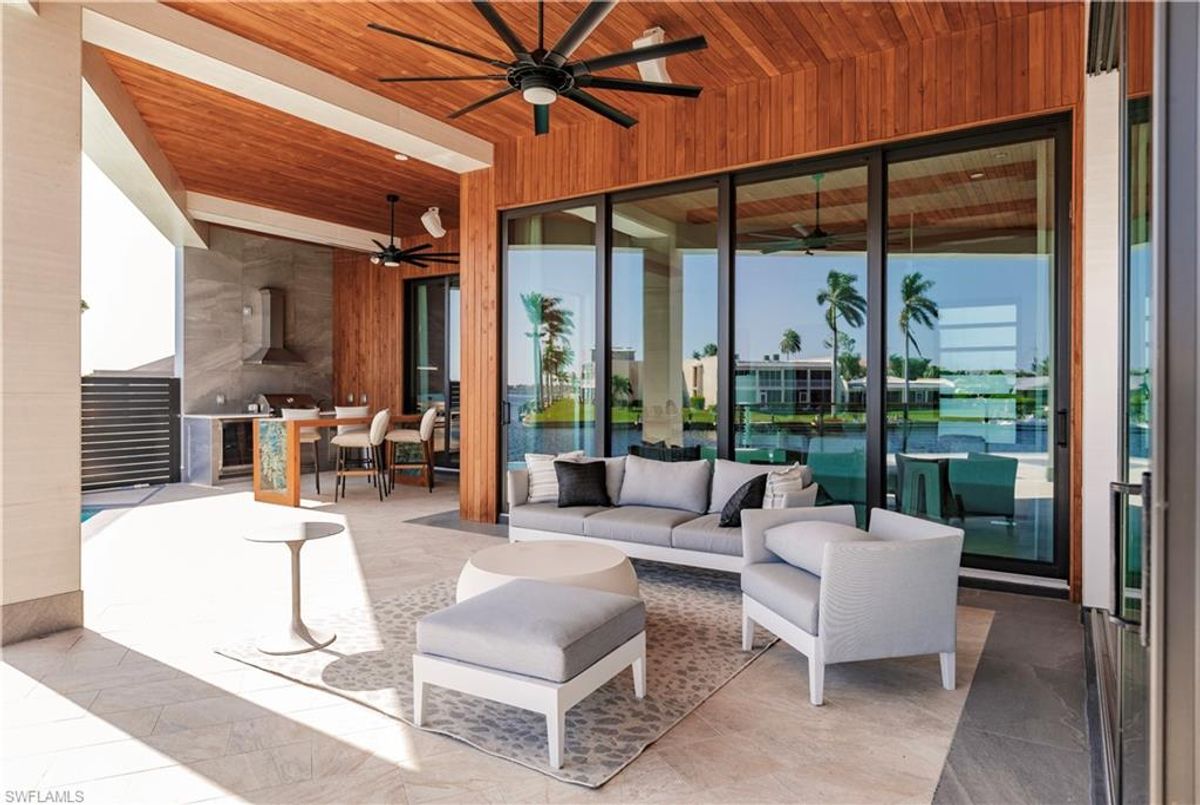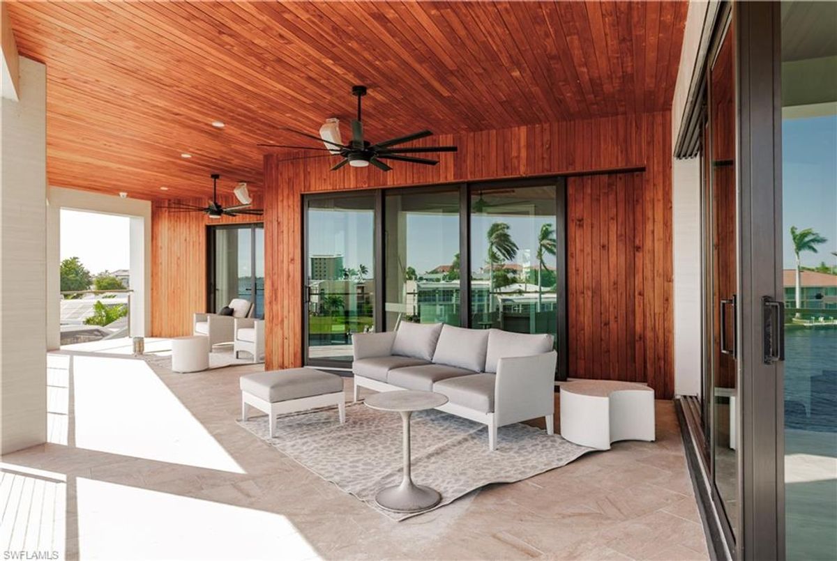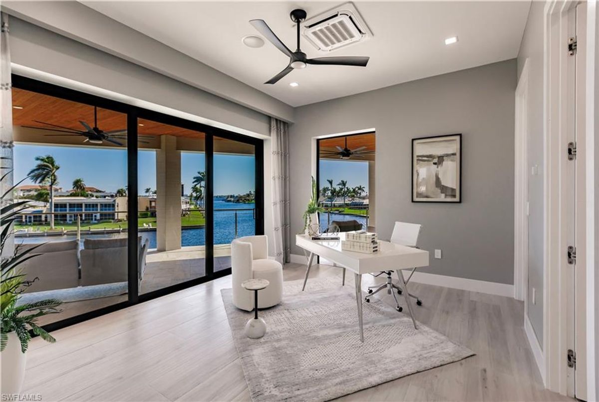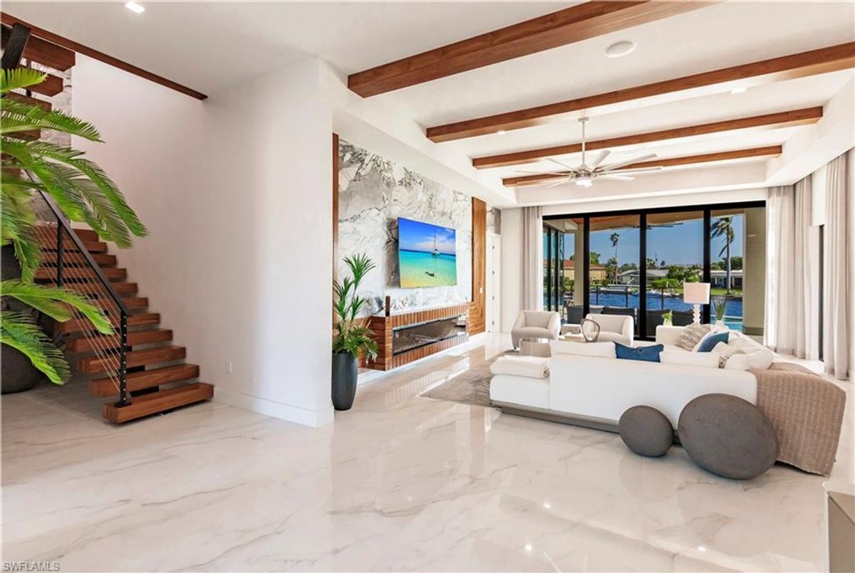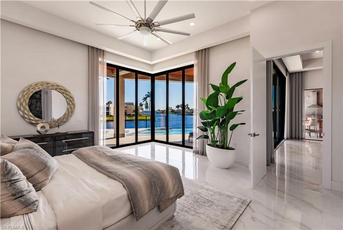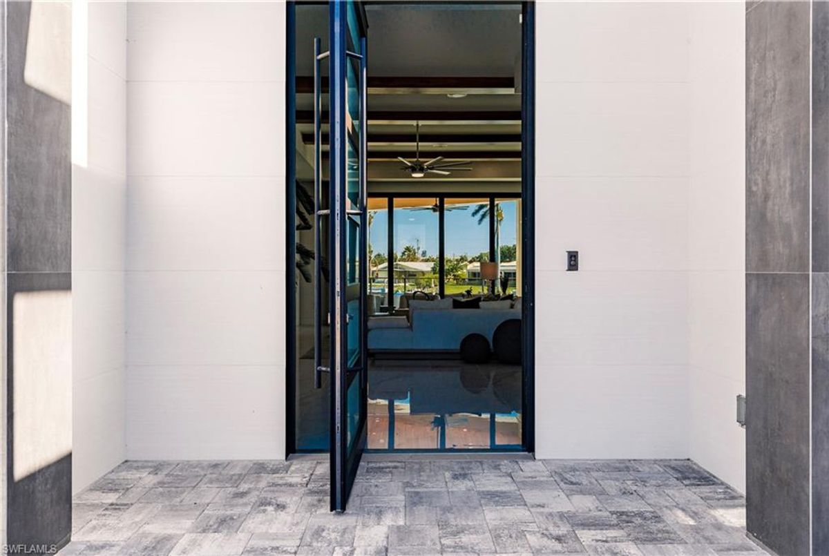 Gulf of America. Miles of canals. Cute burrowing owls. Beautiful parks. No state income tax! And LendingTree just called Cape Coral...Boomtown! What's not to love? Now you can bask in the sunshine in “Captain’s Retreat” ...a Fortress of Elegance!This BRAND NEW, stunning 2- story ultra-modern home was constructed to commercial standards to withstand the worst storms, providing unmatched safety and luxury to you and your loved ones, anytime of the year. For additional safety, it is situated on elevated ground on the 195-foot-wide Orpheus canal, just a few hundred feet from the Caloosahatchee River, protecting your prized vessel from strong waves and high winds. Direct access to Sanibel, Captiva and Useppa Islands and the crystal-clear tropical waters of Gasparilla Sound and the Gulf of America (Mexico). With 90+ feet of seawall, a deep canal and no bridges, it can accommodate a vessel of almost any size. As for the home, no expense was spared in construction and finish. For example, this high-end custom home builder used over a half million dollars of structural concrete over the required Florida code! There is a buried a 500-gallon LP tank to supply the gas stove and outdoor kitchen, and if needed, the Generac WHOLE HOUSE GENERATOR. For windstorm protection, only the highest quality wind/impact windows, sliders and doors were chosen. For finish, there are too many details to list, but as an example, the floating staircase is constructed from 5.5” Brazilian Cumaru wood. Even the furnishings are top quality by Clive Daniel Home Designs. This stunning home has 3900 square feet under A/C and 7700 square feet in total, with 4 bedrooms, 5.5 bathrooms and a Butler’s Pantry with wine cooler, 2nd dishwasher, ice-maker and prep station. On the first floor, there is a private office/den. What is especially unique is two master bedrooms, one on each floor, both with floor with interlocking pocket sliding doors to take advantage of the stunning water views. On the ground floor is a large patio with sitting area, custom pool with infinity edge, (visually) spilling into the canal, spa, sun shelf and sunbathing deck. There is also a full pool bathroom, complete outdoor kitchen and a firepit overlooking the canal. Imagine not just the enjoyment of living here, but also entertaining family, friends and business colleagues. This property screams “MASSIVE SUCCESS!” Brand new, Ultra-modern, stunning views, built like a fortress with gorgeous, quality furnishings. Come see what the easy Florida lifestyle is about, living in this VERY special “Captain’s Retreat”! (See aerial via Virtual Tour link)