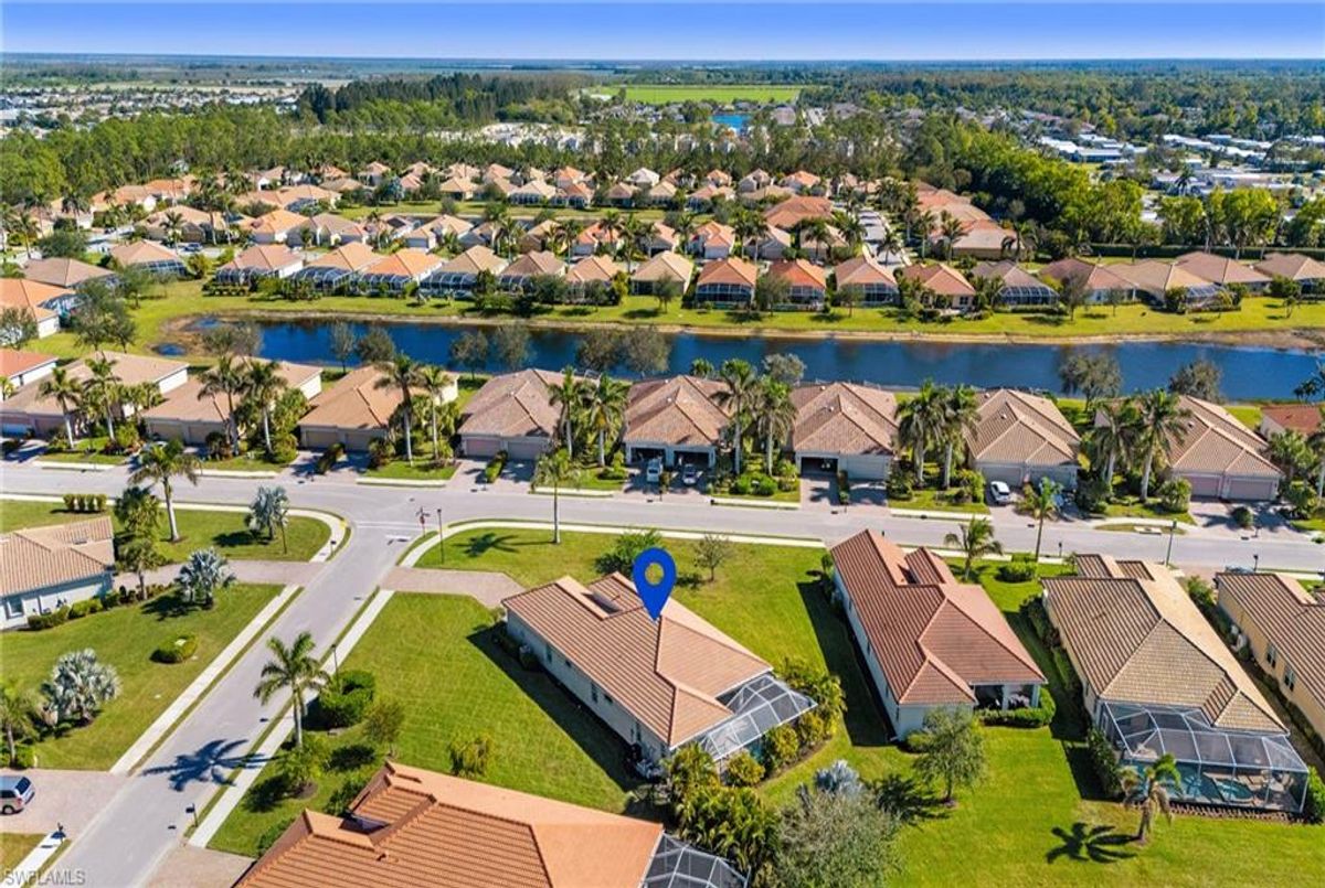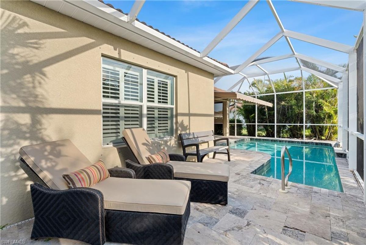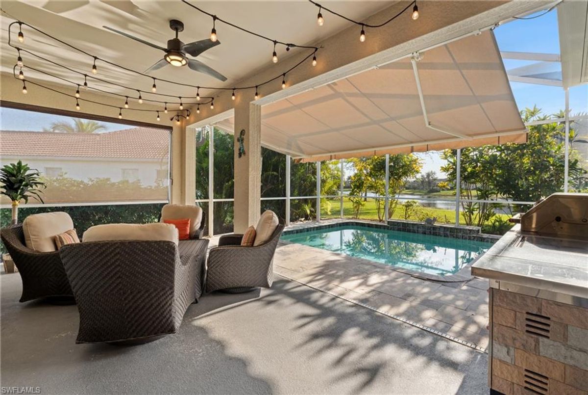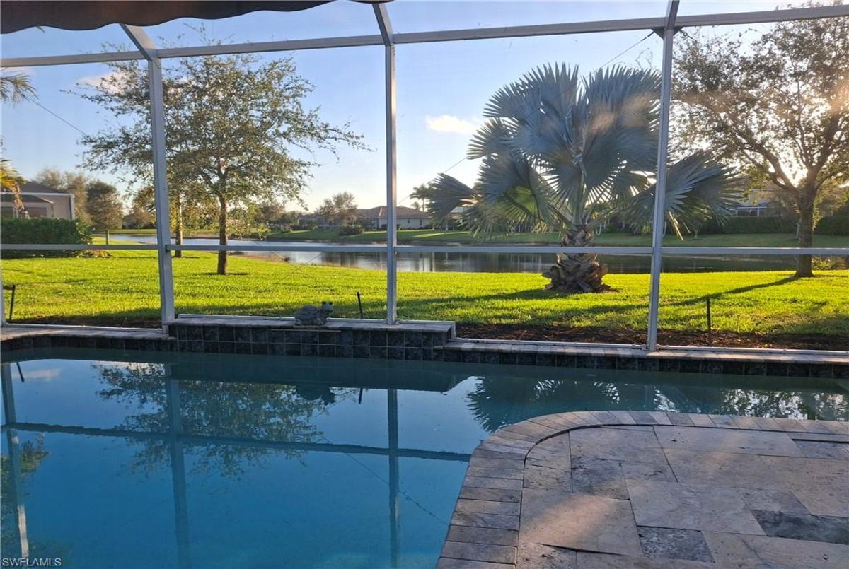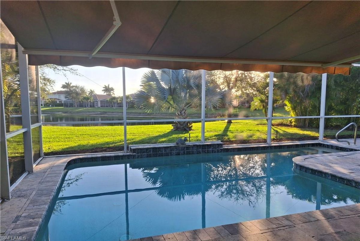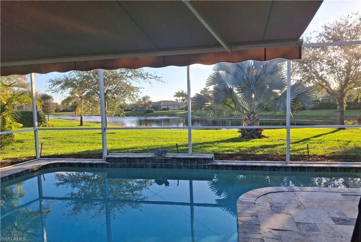Reflection Lakes of Naples is where you will find this exquisite single family home. Picturesque lake views from your lanai where you can enjoy sunset views. Offering three spacious bedrooms and a den/study or formal dining area and two full baths with a lake view on the best, most spacious lot in the neighborhood Take in the captivating sunset views on your screened in lanai which also includes a remote electric Sunsetter awning. Dip in your private, heated pool oasis creating a tranquil atmosphere. The exterior with a tiled roof and manual storm shutters offers peace of mind. Crown molding and plantation shutters adorn this open concept home setting off the charm of the Venetian painted ceiling. The kitchen which is the heart of the home has upgraded pull out cabinetry, stainless steel appliances, granite counters, walk-in pantry and center island. The formal dining area provides a picturesque setting for family and friend gatherings and a touch of elegance with wood trim or can be utilized as flex space for an office or den. The clubhouse offers amenities such as fitness center, pool, social room and a calendar filled with social events. With low HOA fees, paradise living awaits!!