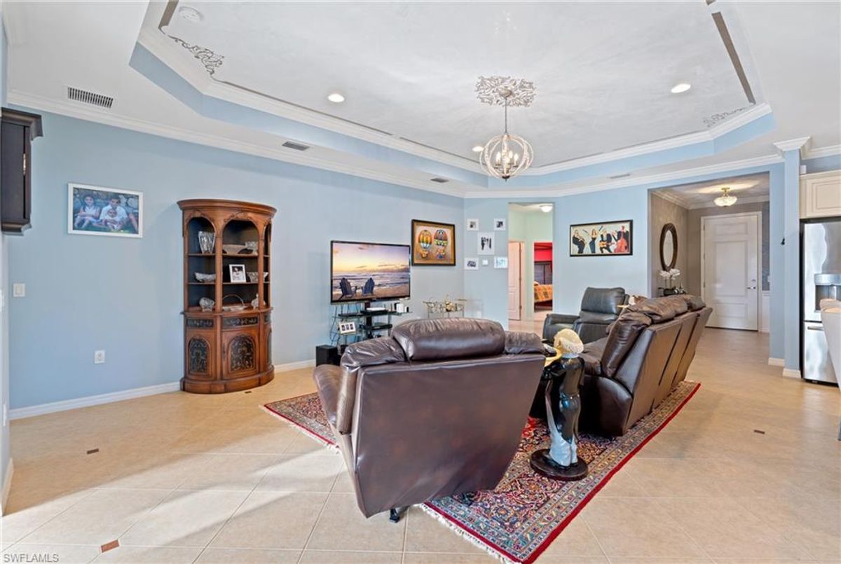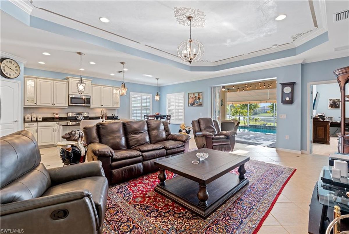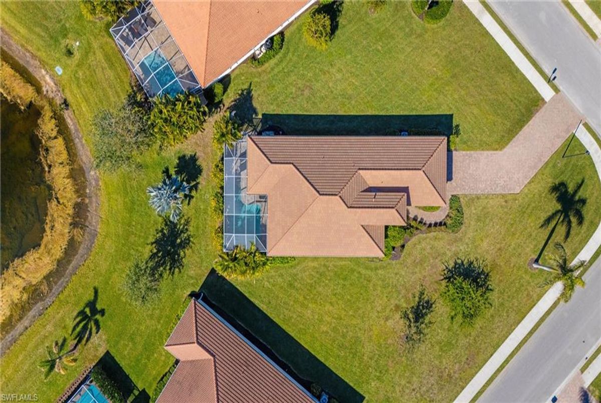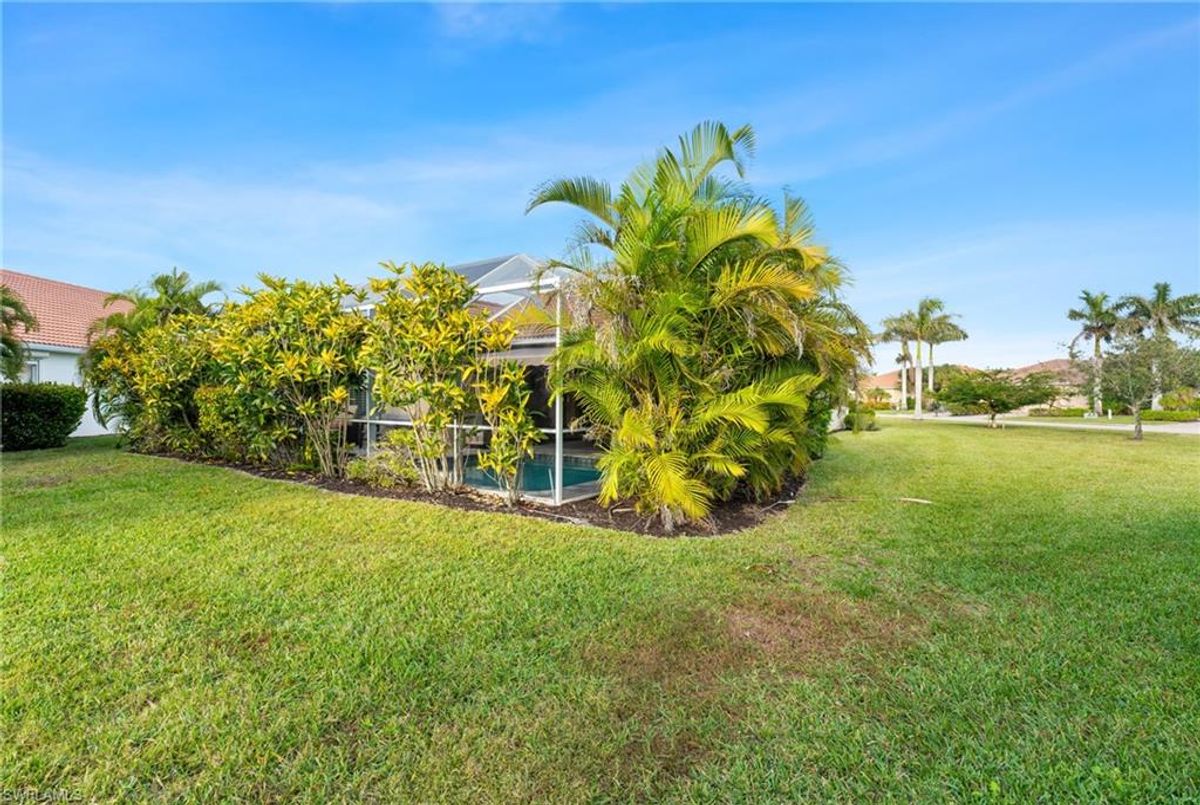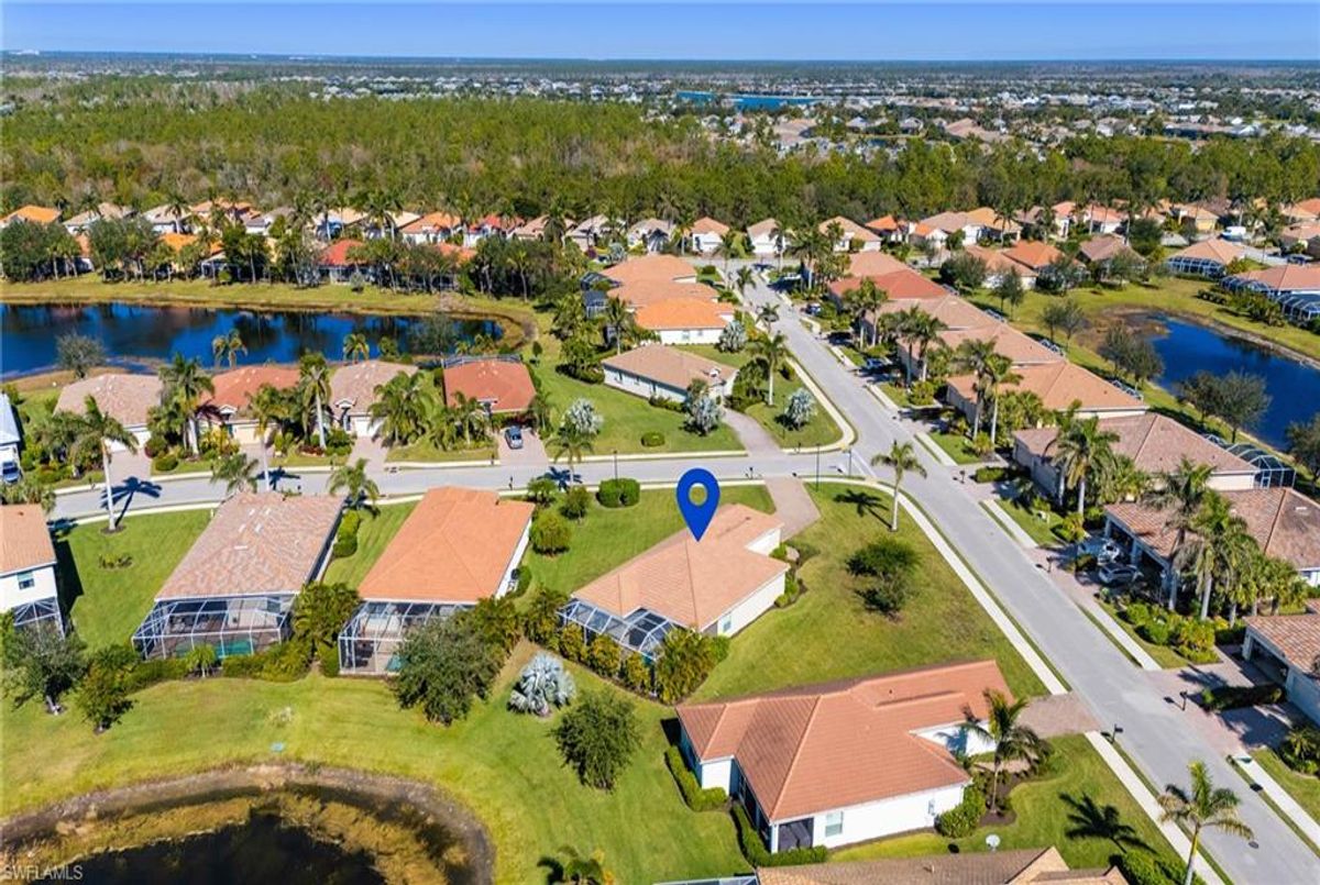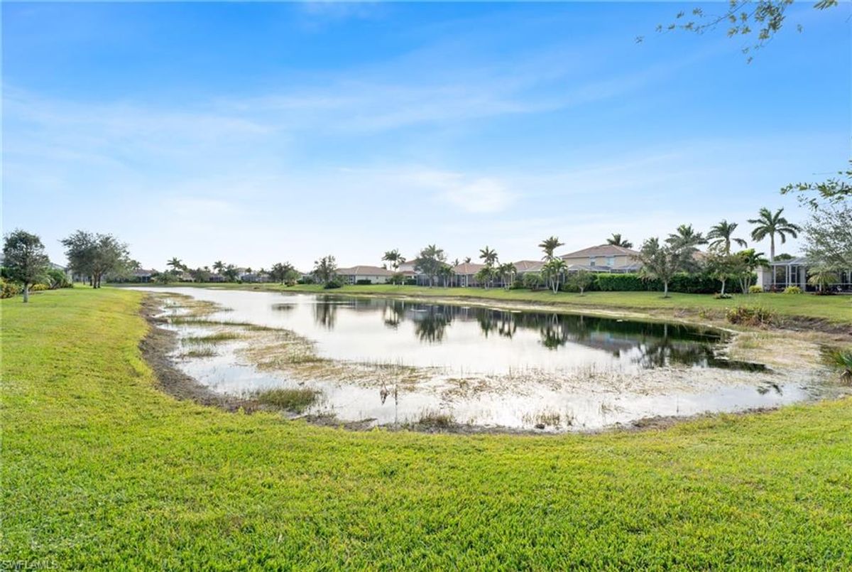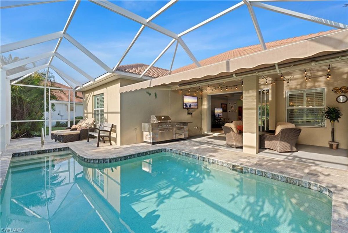 Reflection Lakes of Naples is where you will find this exquisite single family home. Picturesque lake views from your lanai where you can enjoy sunset views. Offering three spacious bedrooms and a den/study or formal dining area and two full baths with a lake view on the best, most spacious lot in the neighborhood Take in the captivating sunset views on your screened in lanai which also includes a remote electric Sunsetter awning. Dip in your private, heated pool oasis creating a tranquil atmosphere. The exterior with a tiled roof and manual storm shutters offers peace of mind. Crown molding and plantation shutters adorn this open concept home setting off the charm of the Venetian painted ceiling. The kitchen which is the heart of the home has upgraded pull out cabinetry, stainless steel appliances, granite counters, walk-in pantry and center island. The formal dining area provides a picturesque setting for family and friend gatherings and a touch of elegance with wood trim or can be utilized as flex space for an office or den. The clubhouse offers amenities such as fitness center, pool, social room and a calendar filled with social events. With low HOA fees, paradise living awaits!!