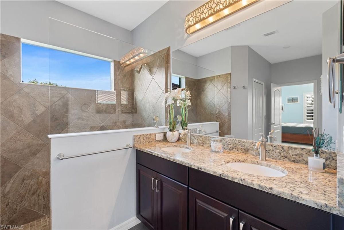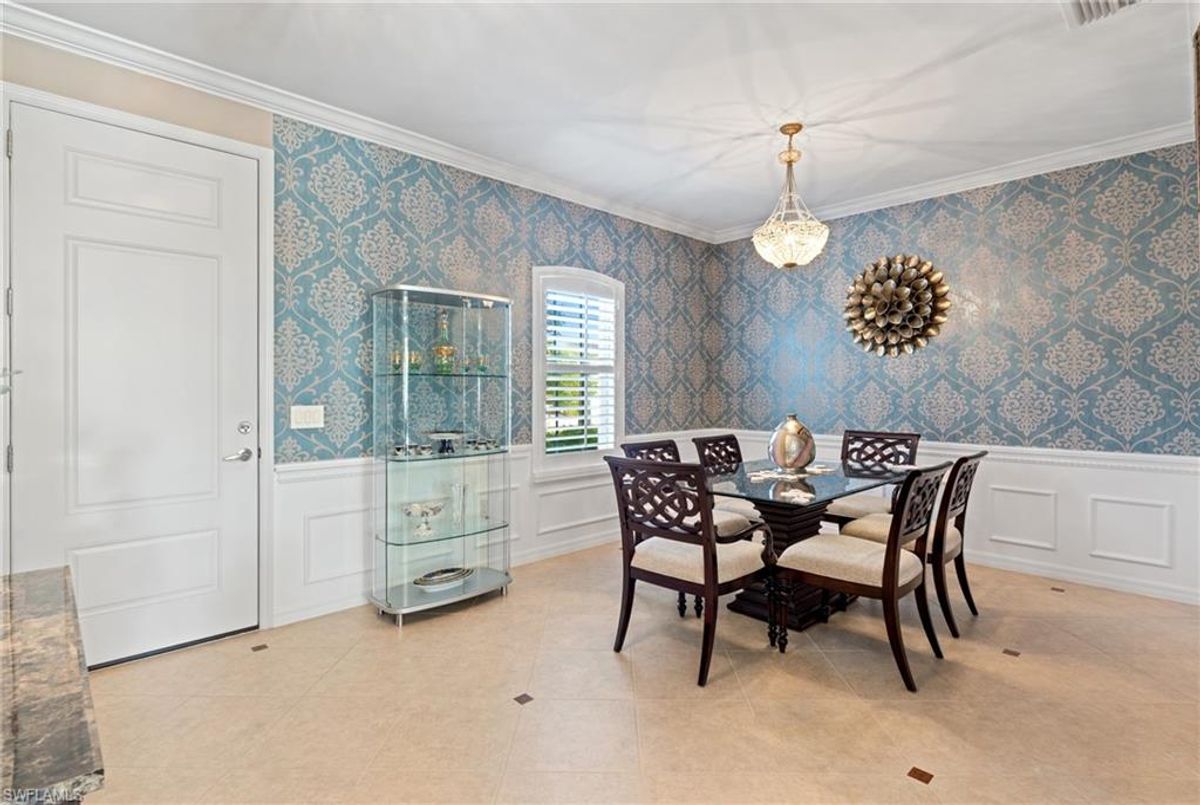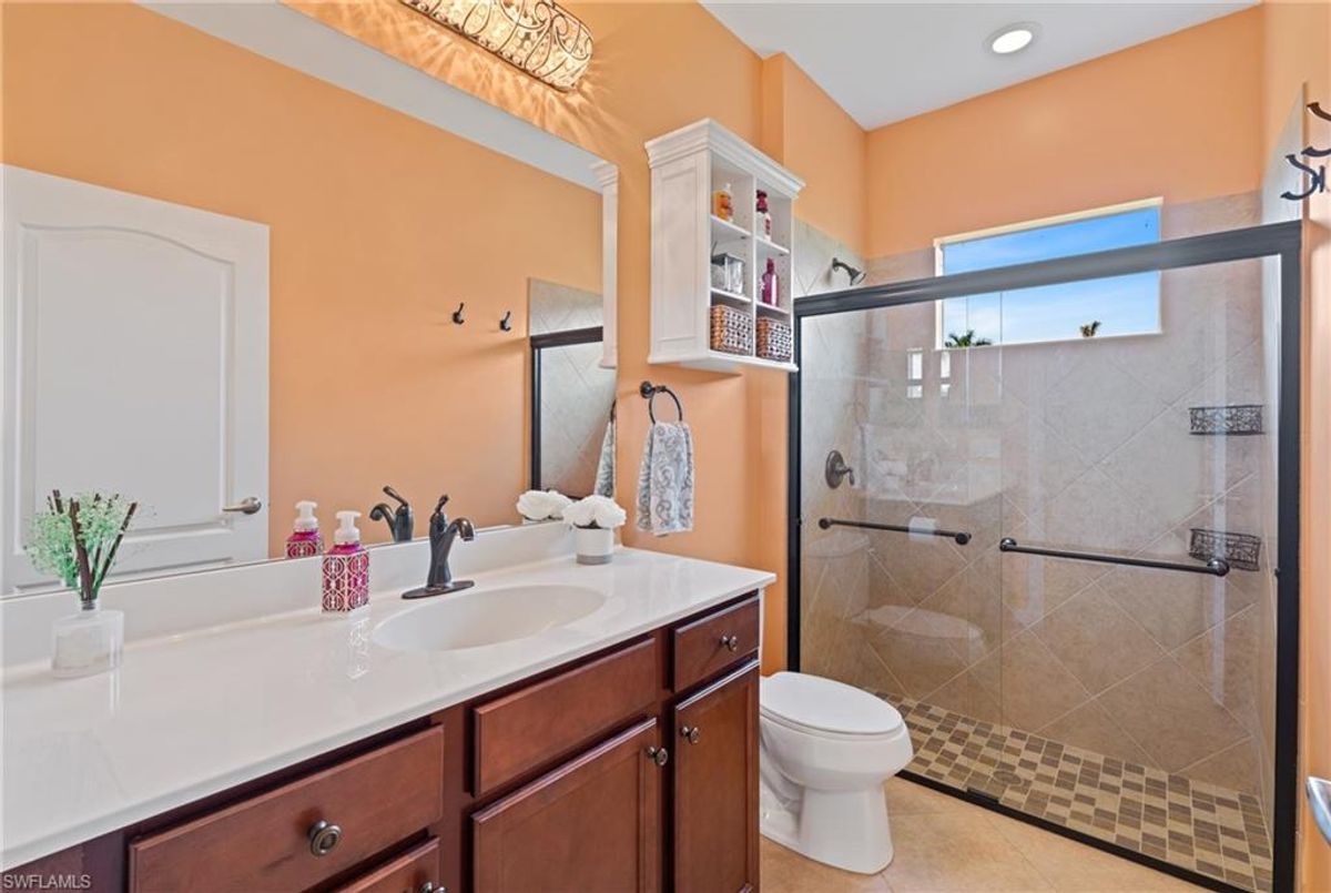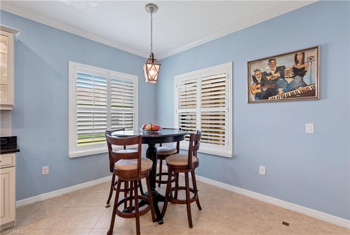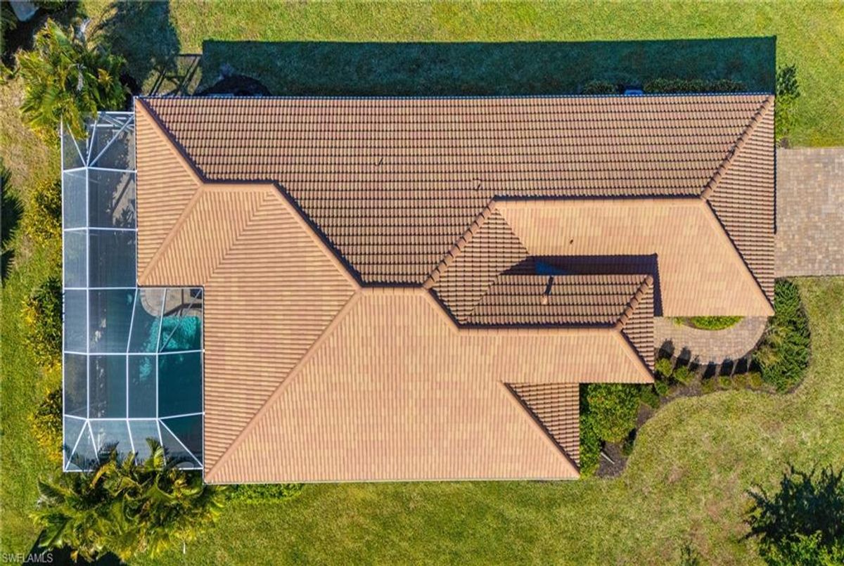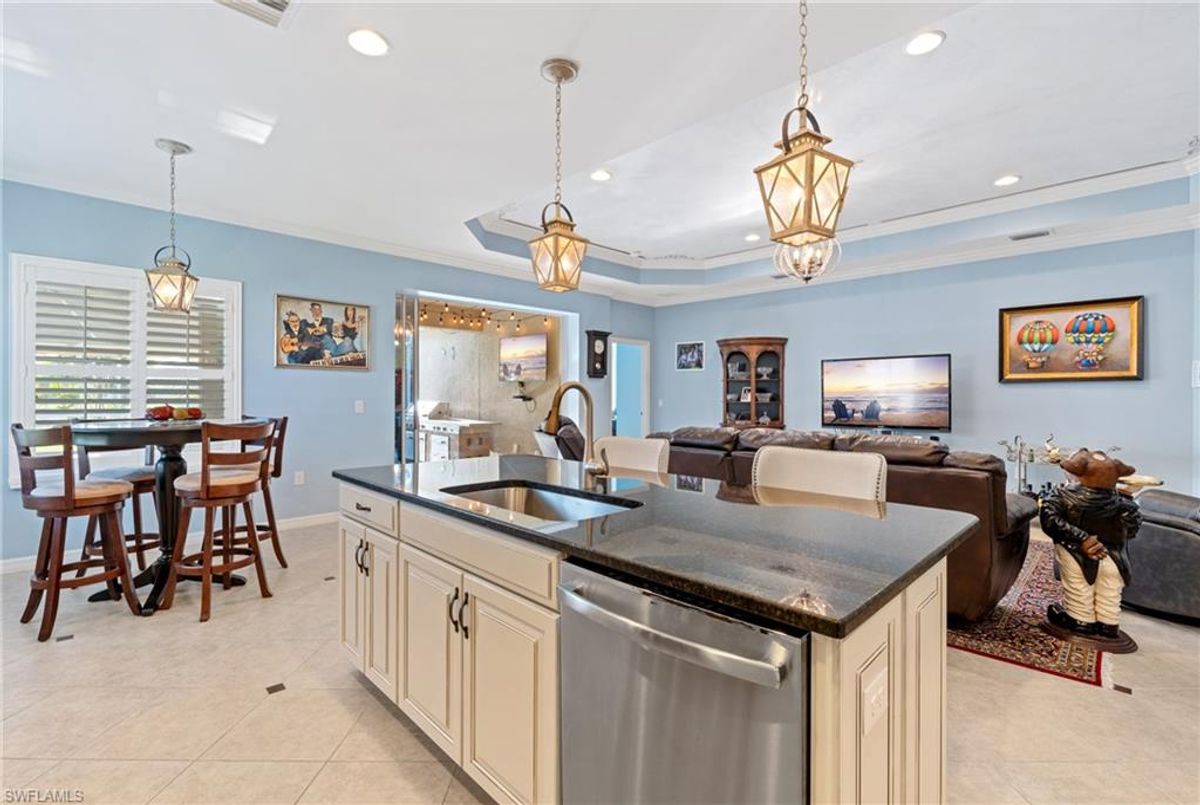 Reflection Lakes of Naples is where you will find this exquisite single family home. Picturesque lake views from your lanai where you can enjoy sunset views. Offering three spacious bedrooms and a den/study or formal dining area and two full baths with a lake view on the best, most spacious lot in the neighborhood Take in the captivating sunset views on your screened in lanai which also includes a remote electric Sunsetter awning. Dip in your private, heated pool oasis creating a tranquil atmosphere. The exterior with a tiled roof and manual storm shutters offers peace of mind. Crown molding and plantation shutters adorn this open concept home setting off the charm of the Venetian painted ceiling. The kitchen which is the heart of the home has upgraded pull out cabinetry, stainless steel appliances, granite counters, walk-in pantry and center island. The formal dining area provides a picturesque setting for family and friend gatherings and a touch of elegance with wood trim or can be utilized as flex space for an office or den. The clubhouse offers amenities such as fitness center, pool, social room and a calendar filled with social events. With low HOA fees, paradise living awaits!!