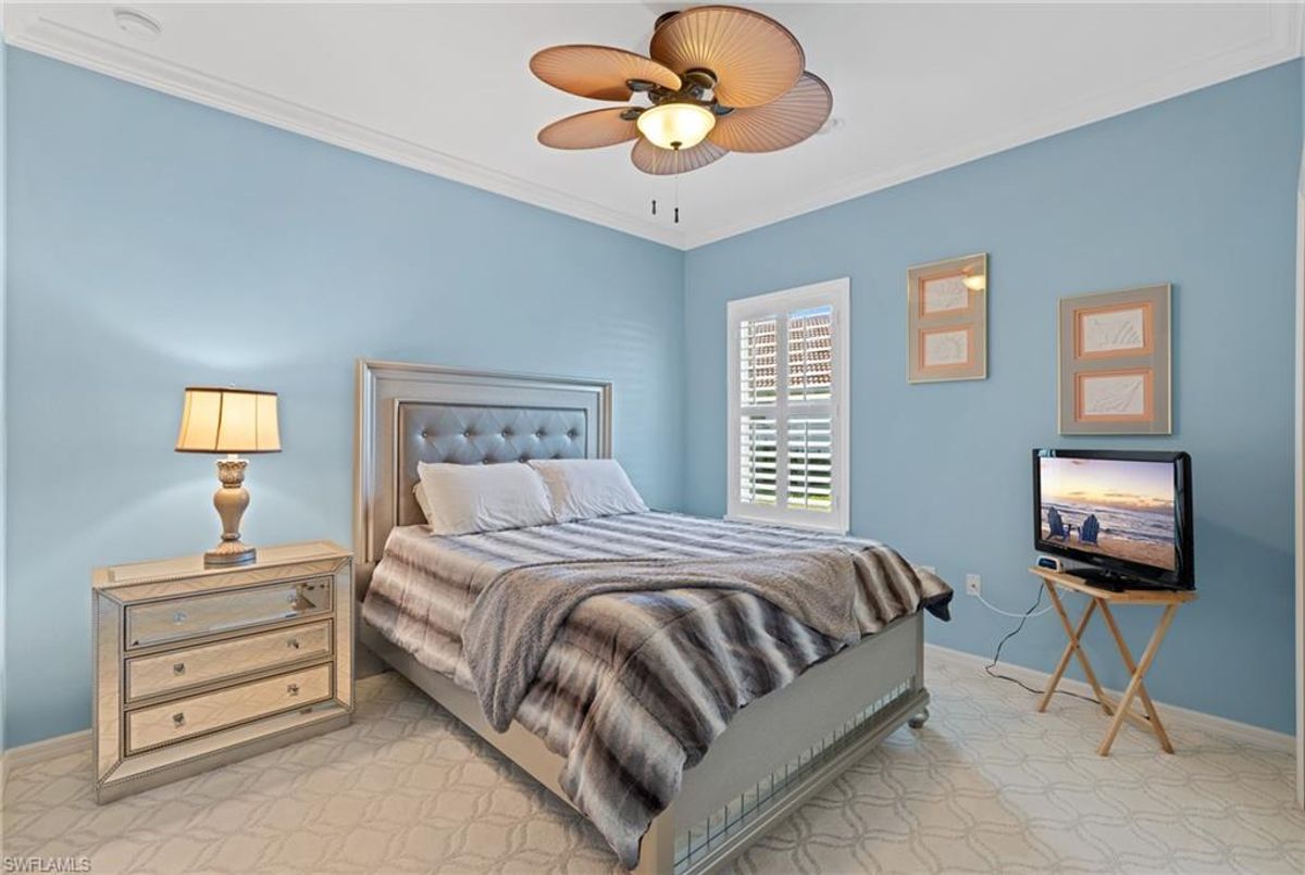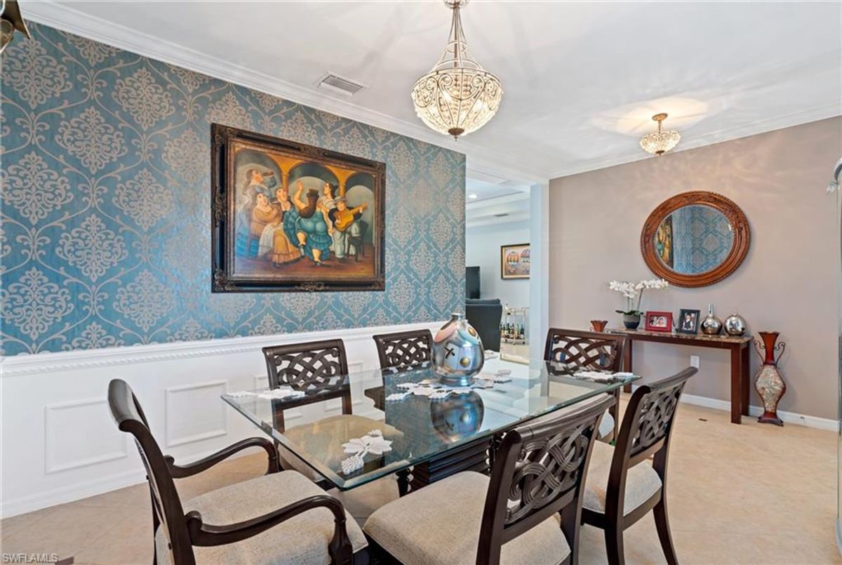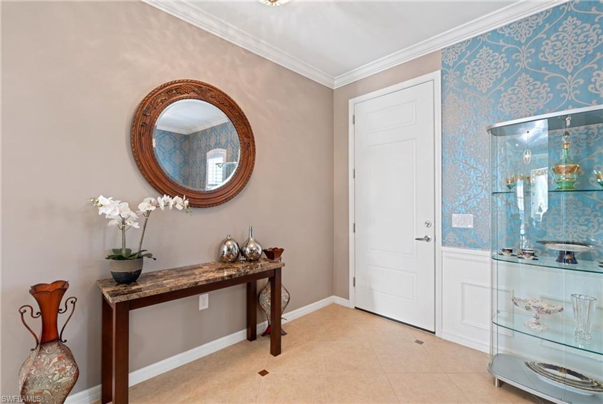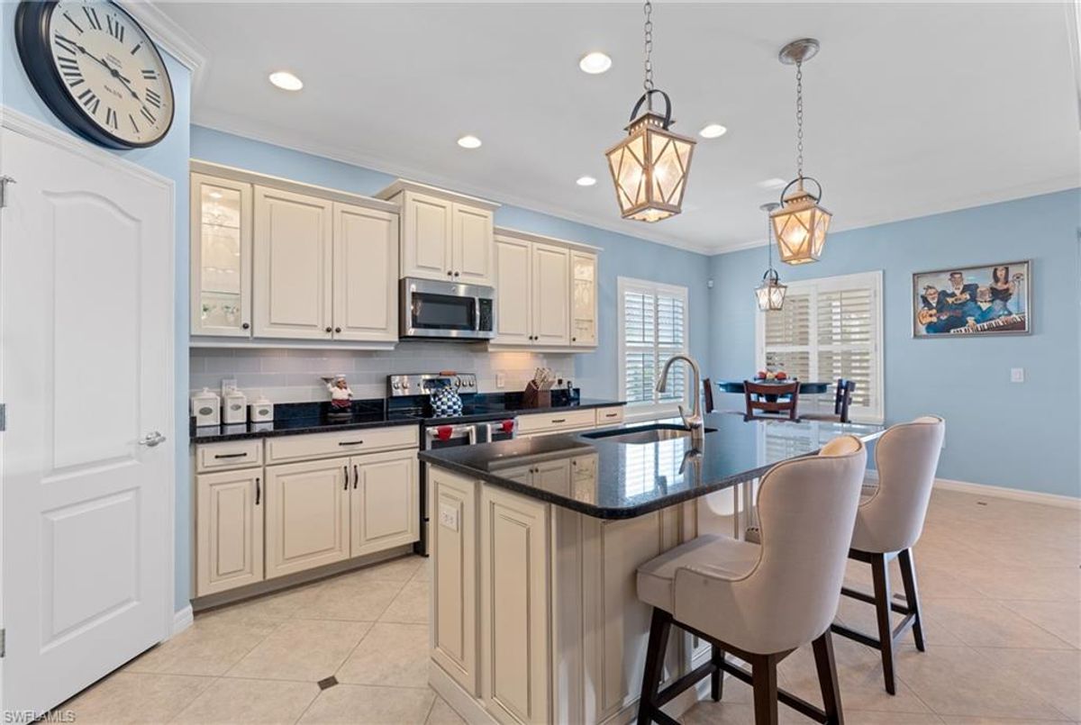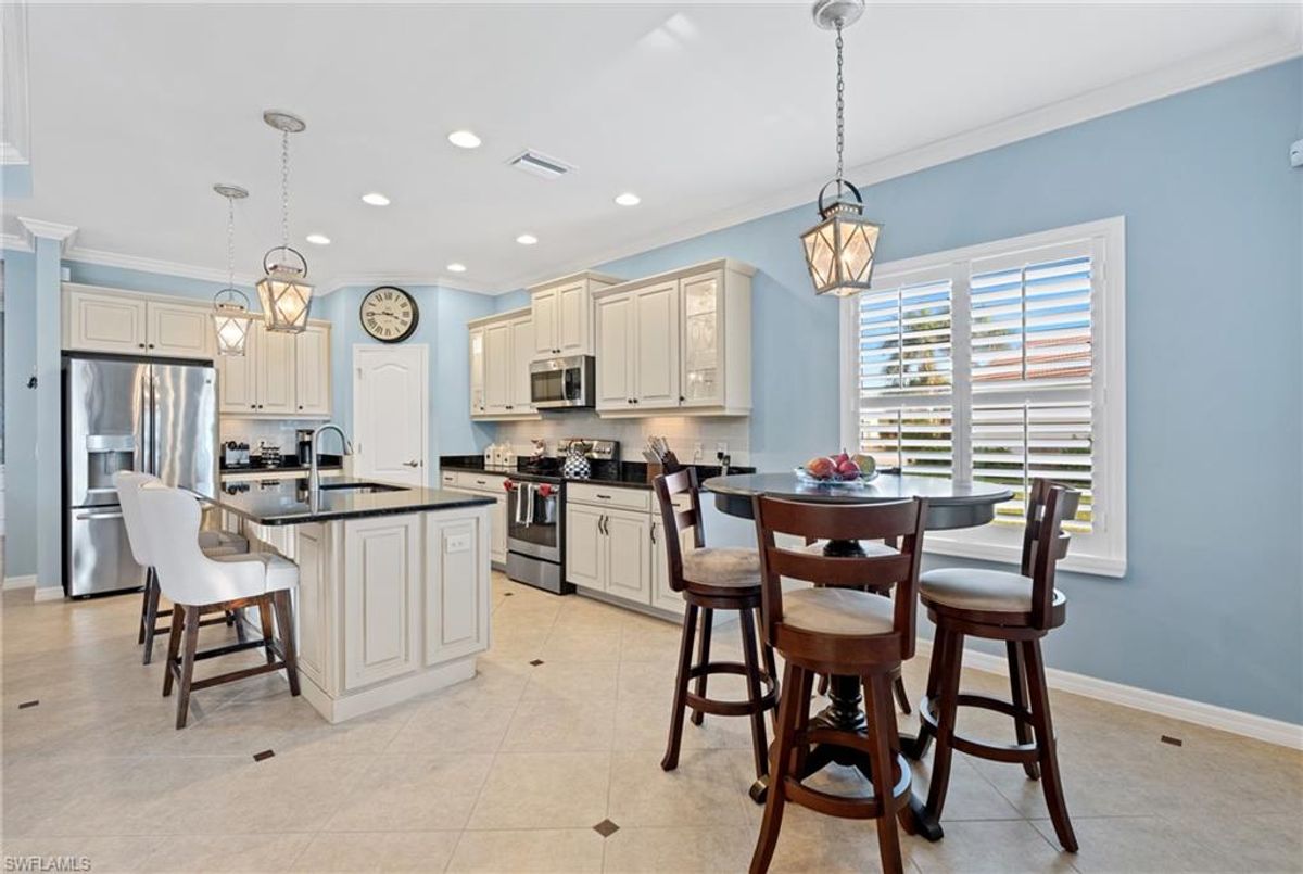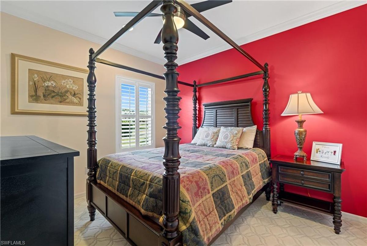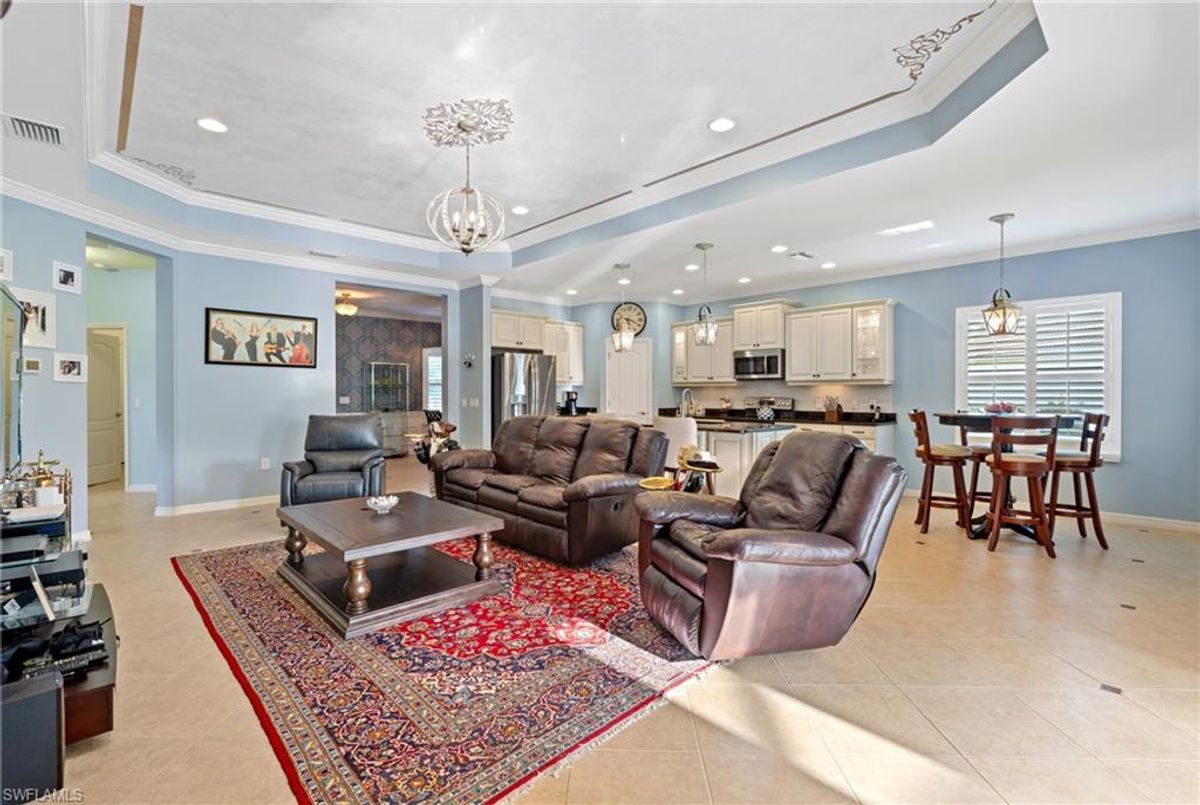 Reflection Lakes of Naples is where you will find this exquisite single family home. Picturesque lake views from your lanai where you can enjoy sunset views. Offering three spacious bedrooms and a den/study or formal dining area and two full baths with a lake view on the best, most spacious lot in the neighborhood Take in the captivating sunset views on your screened in lanai which also includes a remote electric Sunsetter awning. Dip in your private, heated pool oasis creating a tranquil atmosphere. The exterior with a tiled roof and manual storm shutters offers peace of mind. Crown molding and plantation shutters adorn this open concept home setting off the charm of the Venetian painted ceiling. The kitchen which is the heart of the home has upgraded pull out cabinetry, stainless steel appliances, granite counters, walk-in pantry and center island. The formal dining area provides a picturesque setting for family and friend gatherings and a touch of elegance with wood trim or can be utilized as flex space for an office or den. The clubhouse offers amenities such as fitness center, pool, social room and a calendar filled with social events. With low HOA fees, paradise living awaits!!