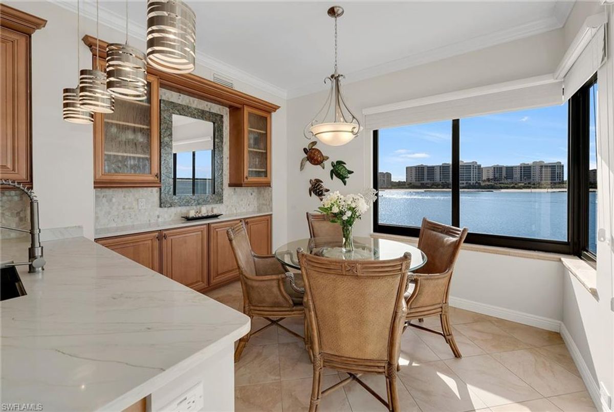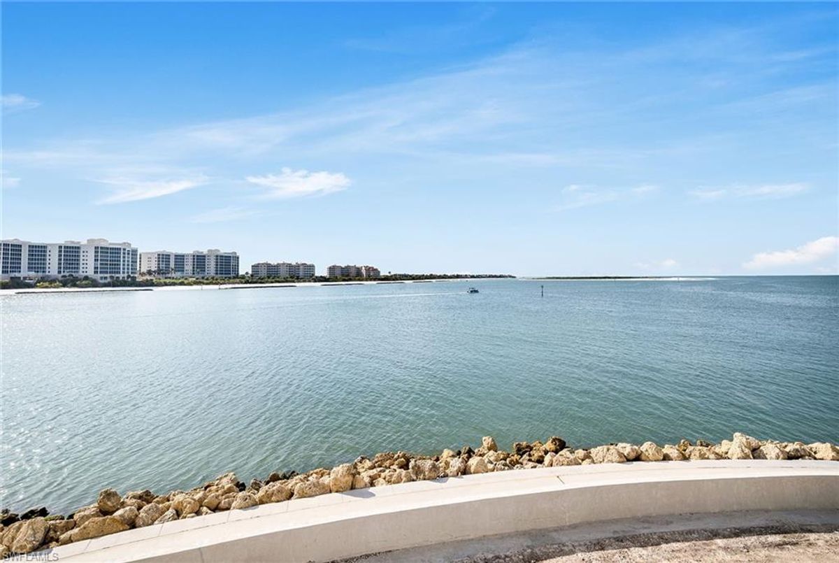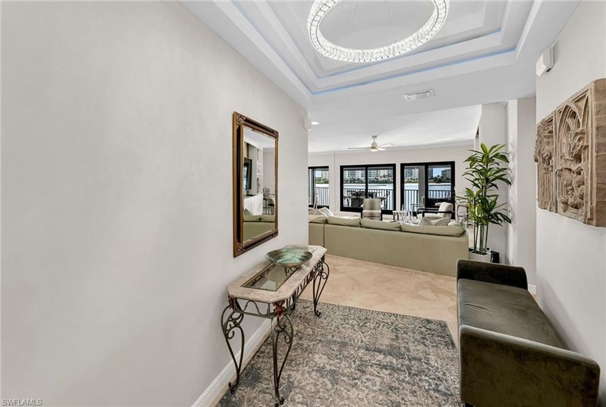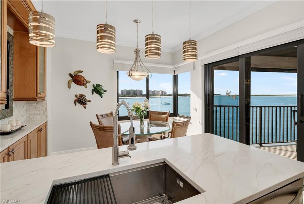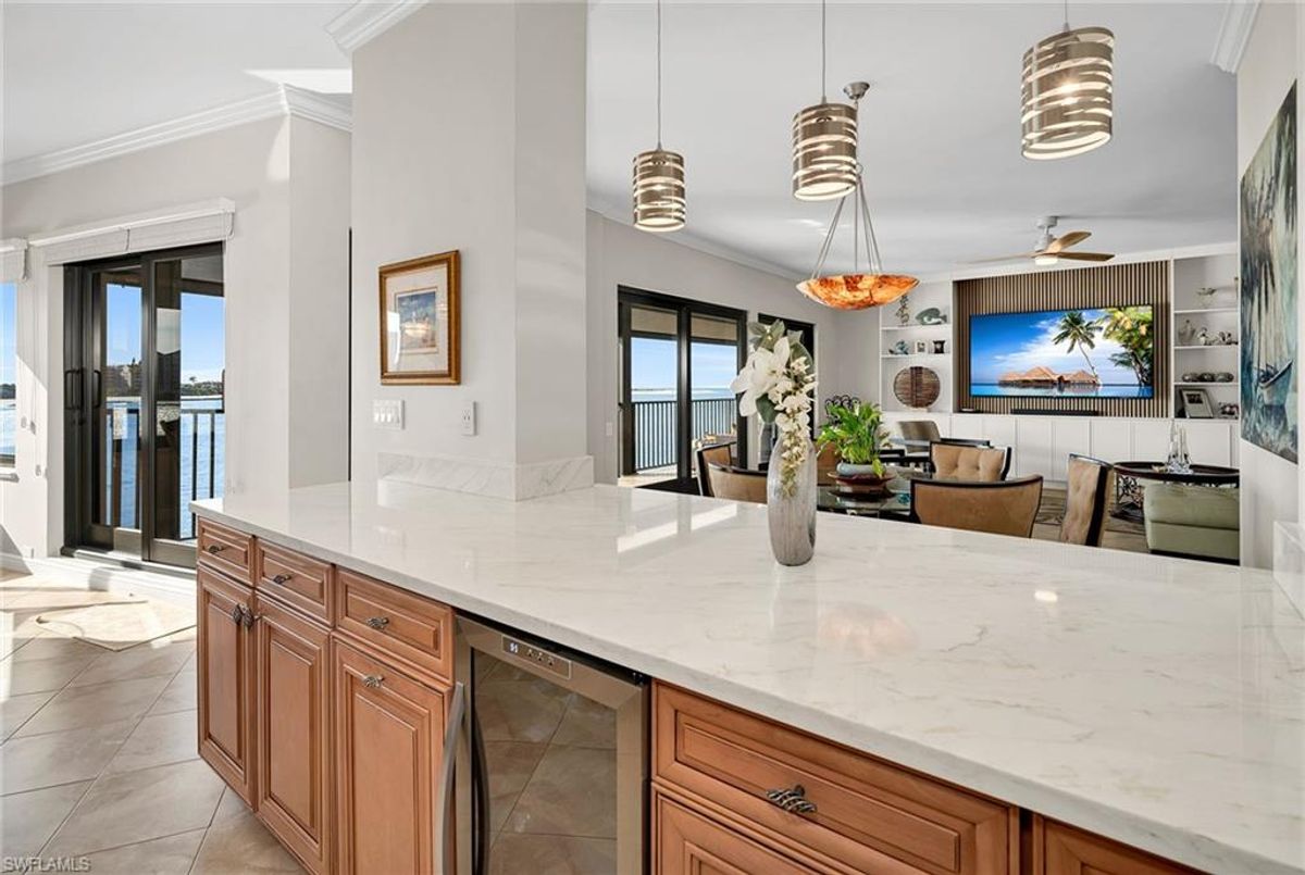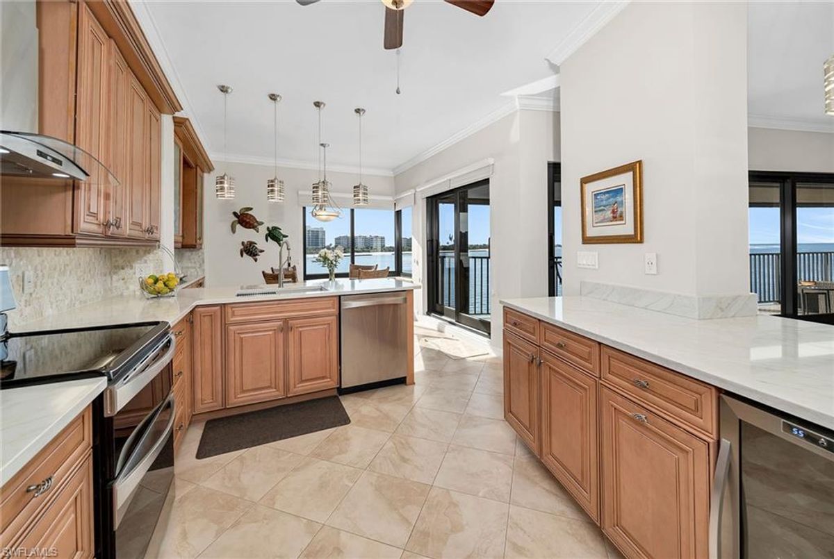 This stunning waterfront condominium offers unparalleled private views of the Big Marco River and the Gulf of Mexico, making it a true coastal retreat. The remodeled 2,200-square-foot residence features a spacious split-bedroom floor plan with three bedrooms, two-and-a-half baths, and the added convenience of a covered parking spot equipped with a charging station for electric vehicles, along with a storage unit. With southwest exposure, the home is bathed in natural light and designed to maximize breathtaking water views. Discover exquisite diagonal porcelain tile flooring throughout, complemented by elegant crown molding and white plantation shutters. The foyer sets the tone with a tray ceiling accented by rope lighting and a striking halo chandelier. The kitchen is a chef’s dream, showcasing shaker-style cabinets with soft-close drawers, quartz countertops, mosaic tile backsplash, under-cabinet lighting and stainless steel appliances, including a double oven range with hood, refrigerator with icemaker, dishwasher and wine cooler. A walk-in pantry with built-in wine shelves adds to the functionality. Adjacent to the kitchen, the breakfast nook offers built-in cabinets, a large corner window with stunning water views, and access to the lanai. The living room exudes charm and sophistication with a custom white built-in entertainment center featuring tambour paneling and direct access to the lanai through expansive impact glass sliders. The lanai is the perfect spot to sip morning coffee or unwind at sunset, with its spacious covered outdoor living area, tile flooring and panoramic water views. The luxurious owner’s suite features a double-door entry, tray ceiling and a spacious walk-in closet with built-in shelving. The en-suite bath is a spa-like retreat, offering dual quartz vanities, a walk-in shower with a frameless glass enclosure, and a mosaic tile ceiling. A cozy seating area positioned by a large corner window offers stunning private water views, further enhancing the suite's appeal. The guest bedrooms are equally impressive. One features a bay window, a deep walk-in closet with built-ins, and an additional storage closet, while the adjacent bath boasts a double quartz vanity and a walk-in shower with a built-in bench. The second guest bedroom, which can serve as a den or study, is equipped with glass French doors and is also conveniently located near the full bath. Additional features include a well-appointed powder bath with a quartz vanity and a laundry area with overhead cabinets and new stackable LG washer and dryer units. Located in the private, gated community of La Peninsula on Isles of Capri, this property offers an exceptional lifestyle with tropical landscaping, a clubhouse, a large pool, a fitness center and a waterfront walking path. Ideally positioned between Marco Island and Naples, residents enjoy the best of both worlds, with easy access to pristine beaches, shopping, dining and entertainment. A perfect coastal escape.