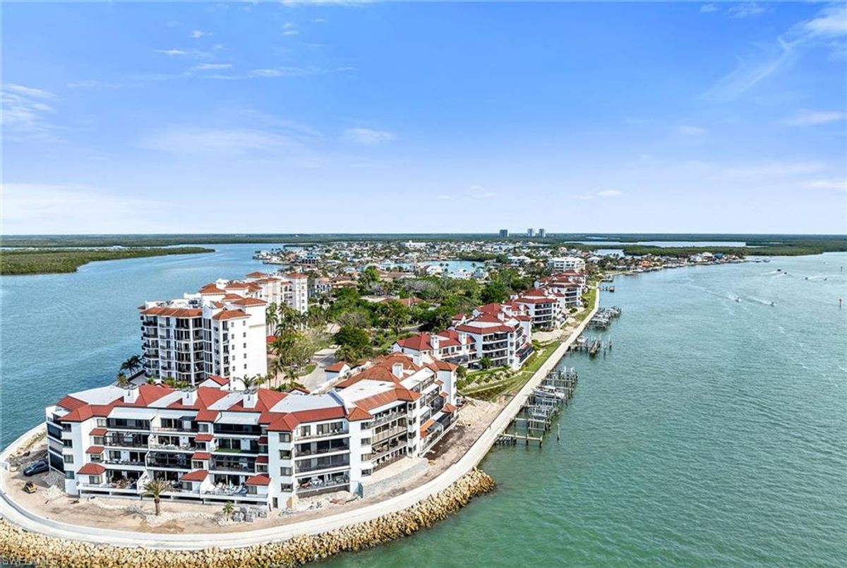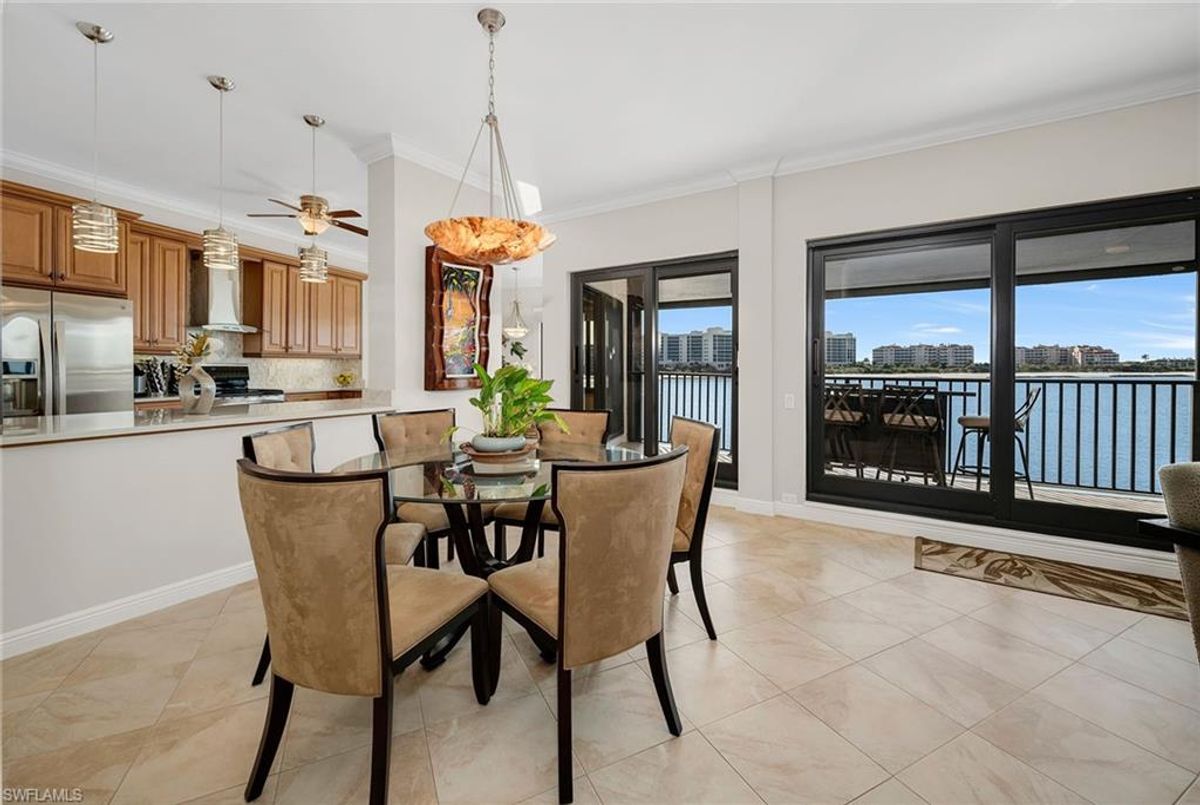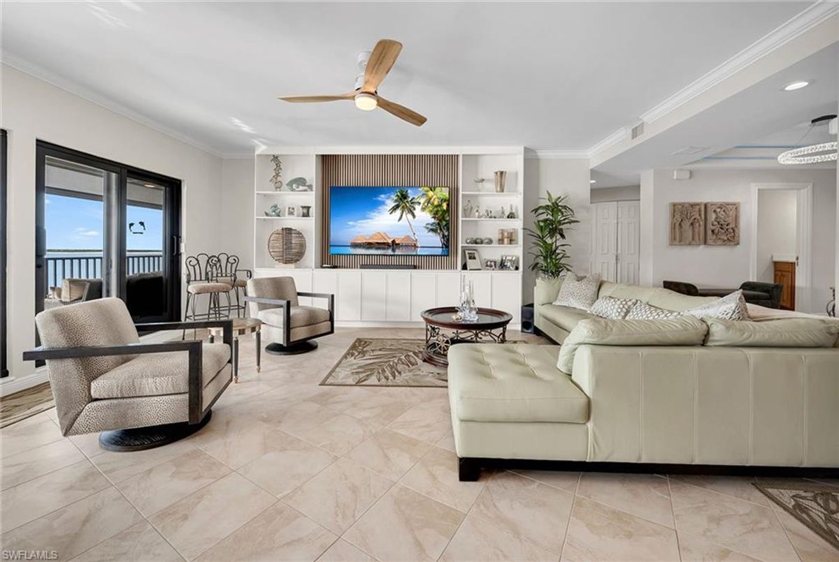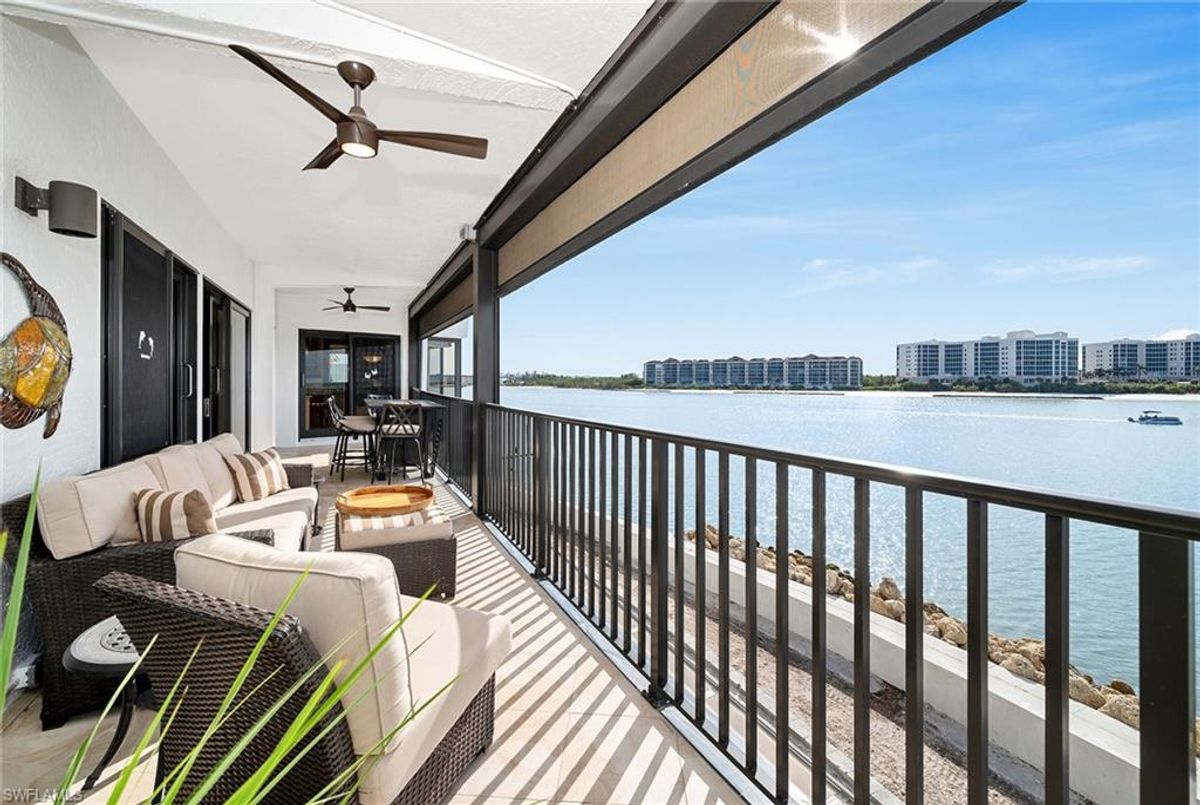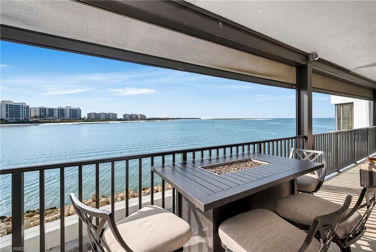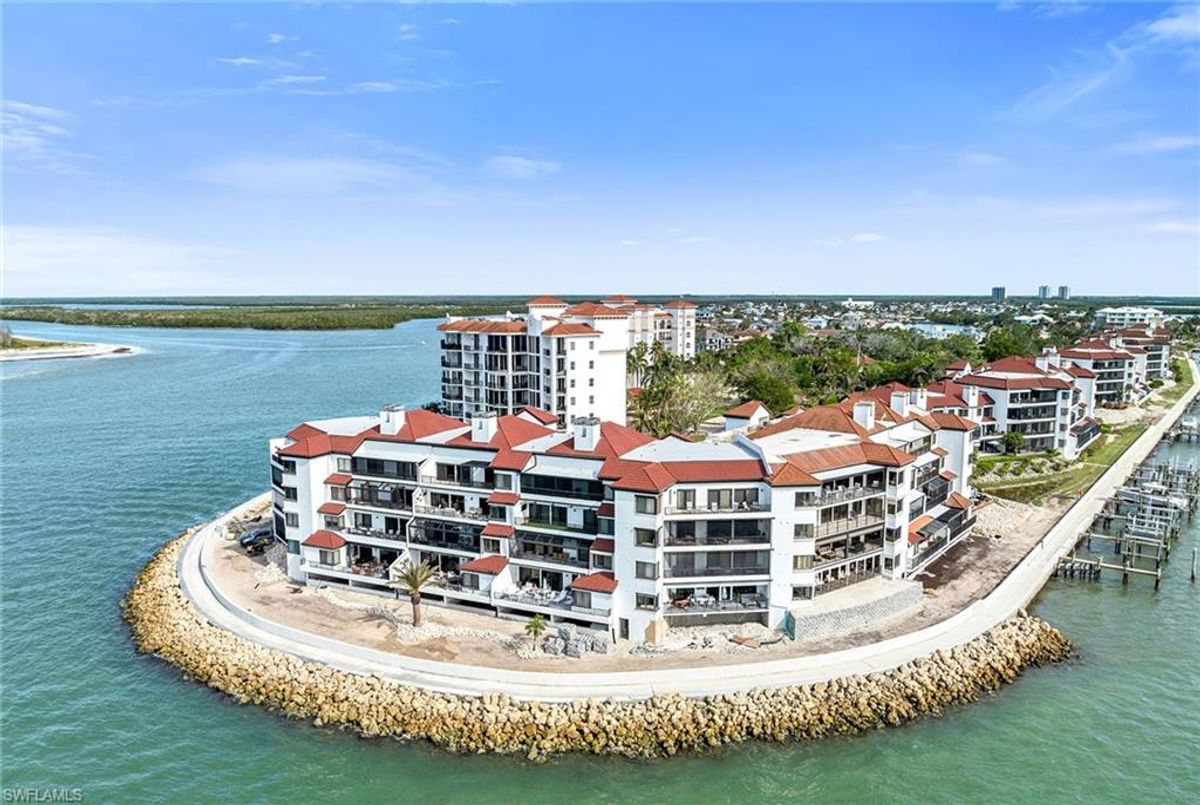 This stunning waterfront condominium offers unparalleled private views of the Big Marco River and the Gulf of Mexico, making it a true coastal retreat. The remodeled 2,200-square-foot residence features a spacious split-bedroom floor plan with three bedrooms, two-and-a-half baths, and the added convenience of a covered parking spot equipped with a charging station for electric vehicles, along with a storage unit. With southwest exposure, the home is bathed in natural light and designed to maximize breathtaking water views. Discover exquisite diagonal porcelain tile flooring throughout, complemented by elegant crown molding and white plantation shutters. The foyer sets the tone with a tray ceiling accented by rope lighting and a striking halo chandelier. The kitchen is a chef’s dream, showcasing shaker-style cabinets with soft-close drawers, quartz countertops, mosaic tile backsplash, under-cabinet lighting and stainless steel appliances, including a double oven range with hood, refrigerator with icemaker, dishwasher and wine cooler. A walk-in pantry with built-in wine shelves adds to the functionality. Adjacent to the kitchen, the breakfast nook offers built-in cabinets, a large corner window with stunning water views, and access to the lanai. The living room exudes charm and sophistication with a custom white built-in entertainment center featuring tambour paneling and direct access to the lanai through expansive impact glass sliders. The lanai is the perfect spot to sip morning coffee or unwind at sunset, with its spacious covered outdoor living area, tile flooring and panoramic water views. The luxurious owner’s suite features a double-door entry, tray ceiling and a spacious walk-in closet with built-in shelving. The en-suite bath is a spa-like retreat, offering dual quartz vanities, a walk-in shower with a frameless glass enclosure, and a mosaic tile ceiling. A cozy seating area positioned by a large corner window offers stunning private water views, further enhancing the suite's appeal. The guest bedrooms are equally impressive. One features a bay window, a deep walk-in closet with built-ins, and an additional storage closet, while the adjacent bath boasts a double quartz vanity and a walk-in shower with a built-in bench. The second guest bedroom, which can serve as a den or study, is equipped with glass French doors and is also conveniently located near the full bath. Additional features include a well-appointed powder bath with a quartz vanity and a laundry area with overhead cabinets and new stackable LG washer and dryer units. Located in the private, gated community of La Peninsula on Isles of Capri, this property offers an exceptional lifestyle with tropical landscaping, a clubhouse, a large pool, a fitness center and a waterfront walking path. Ideally positioned between Marco Island and Naples, residents enjoy the best of both worlds, with easy access to pristine beaches, shopping, dining and entertainment. A perfect coastal escape.