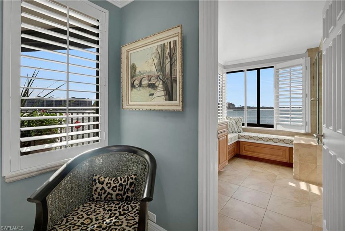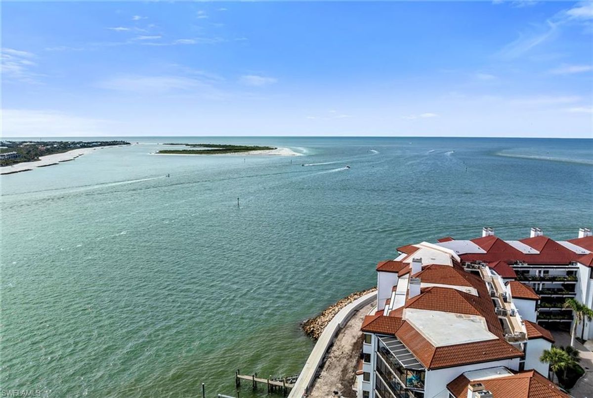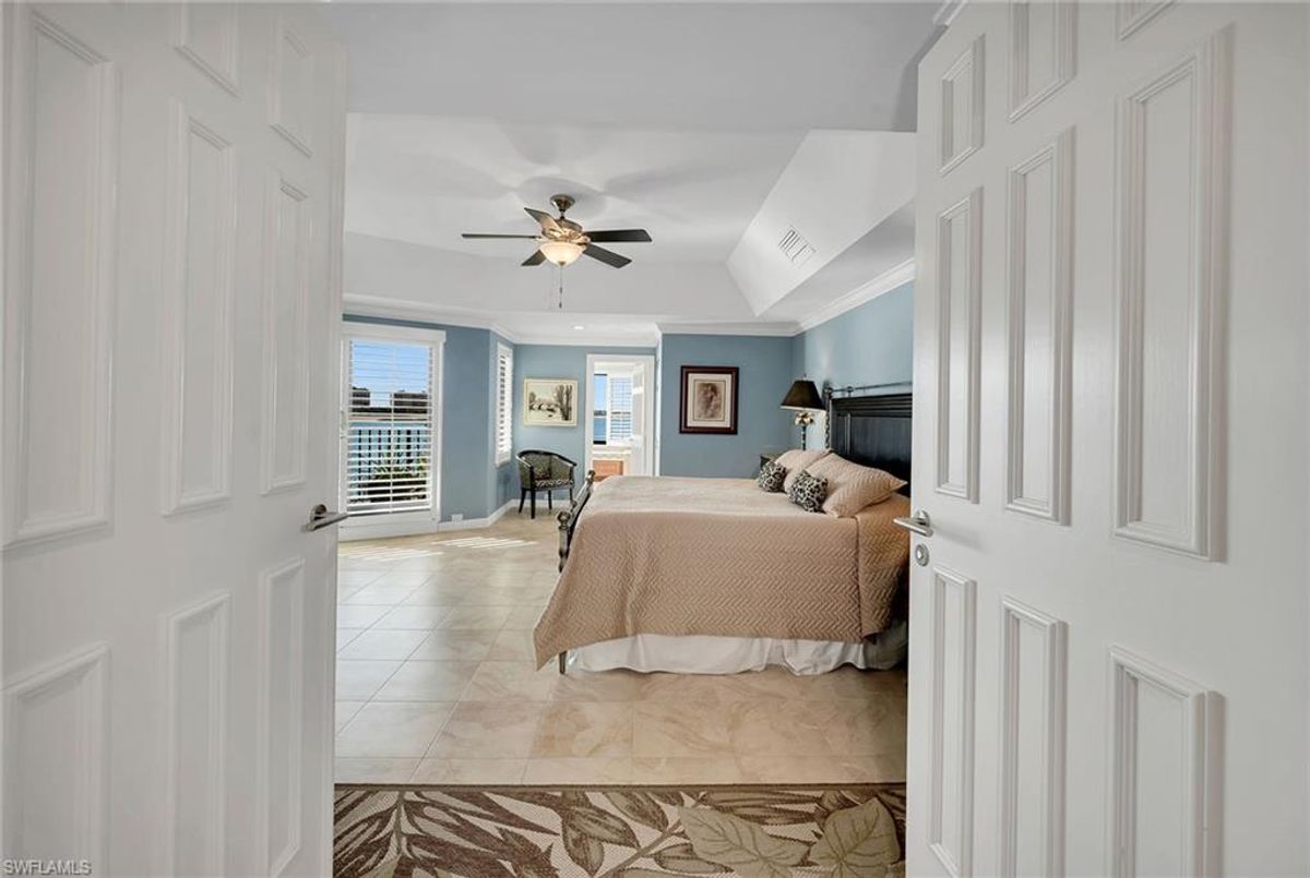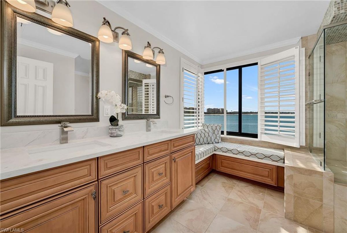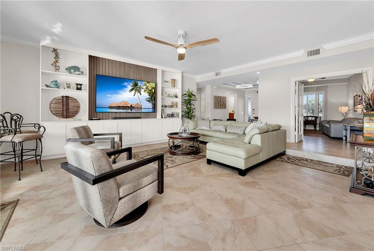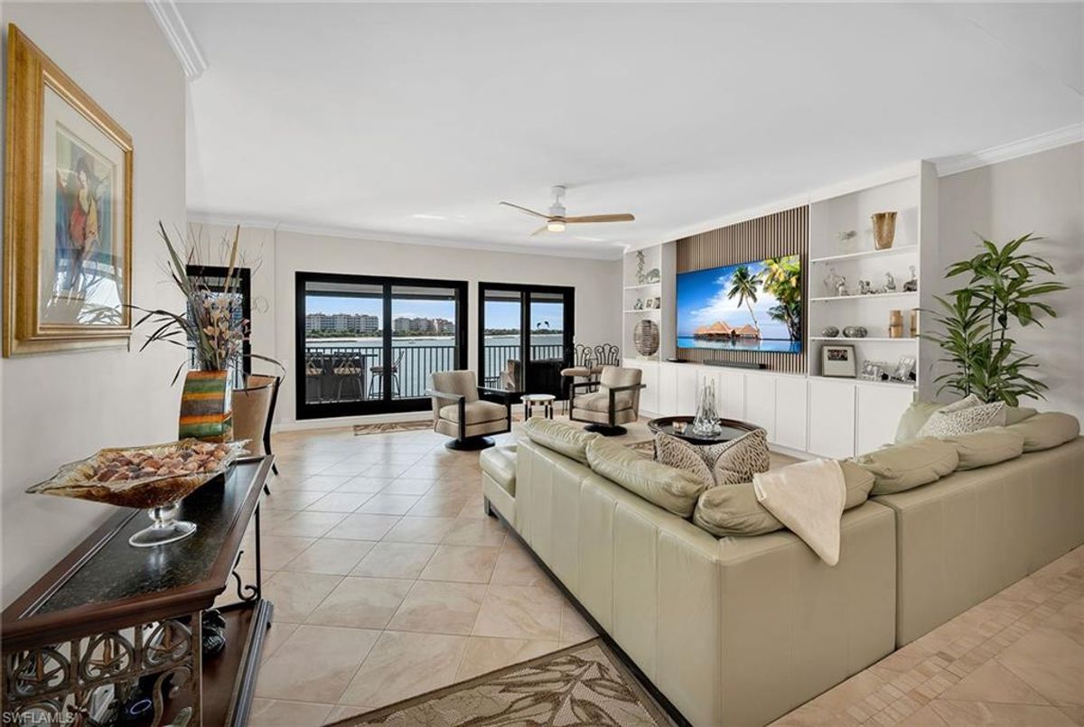 This stunning waterfront condominium offers unparalleled private views of the Big Marco River and the Gulf of Mexico, making it a true coastal retreat. The remodeled 2,200-square-foot residence features a spacious split-bedroom floor plan with three bedrooms, two-and-a-half baths, and the added convenience of a covered parking spot equipped with a charging station for electric vehicles, along with a storage unit. With southwest exposure, the home is bathed in natural light and designed to maximize breathtaking water views. Discover exquisite diagonal porcelain tile flooring throughout, complemented by elegant crown molding and white plantation shutters. The foyer sets the tone with a tray ceiling accented by rope lighting and a striking halo chandelier. The kitchen is a chef’s dream, showcasing shaker-style cabinets with soft-close drawers, quartz countertops, mosaic tile backsplash, under-cabinet lighting and stainless steel appliances, including a double oven range with hood, refrigerator with icemaker, dishwasher and wine cooler. A walk-in pantry with built-in wine shelves adds to the functionality. Adjacent to the kitchen, the breakfast nook offers built-in cabinets, a large corner window with stunning water views, and access to the lanai. The living room exudes charm and sophistication with a custom white built-in entertainment center featuring tambour paneling and direct access to the lanai through expansive impact glass sliders. The lanai is the perfect spot to sip morning coffee or unwind at sunset, with its spacious covered outdoor living area, tile flooring and panoramic water views. The luxurious owner’s suite features a double-door entry, tray ceiling and a spacious walk-in closet with built-in shelving. The en-suite bath is a spa-like retreat, offering dual quartz vanities, a walk-in shower with a frameless glass enclosure, and a mosaic tile ceiling. A cozy seating area positioned by a large corner window offers stunning private water views, further enhancing the suite's appeal. The guest bedrooms are equally impressive. One features a bay window, a deep walk-in closet with built-ins, and an additional storage closet, while the adjacent bath boasts a double quartz vanity and a walk-in shower with a built-in bench. The second guest bedroom, which can serve as a den or study, is equipped with glass French doors and is also conveniently located near the full bath. Additional features include a well-appointed powder bath with a quartz vanity and a laundry area with overhead cabinets and new stackable LG washer and dryer units. Located in the private, gated community of La Peninsula on Isles of Capri, this property offers an exceptional lifestyle with tropical landscaping, a clubhouse, a large pool, a fitness center and a waterfront walking path. Ideally positioned between Marco Island and Naples, residents enjoy the best of both worlds, with easy access to pristine beaches, shopping, dining and entertainment. A perfect coastal escape.