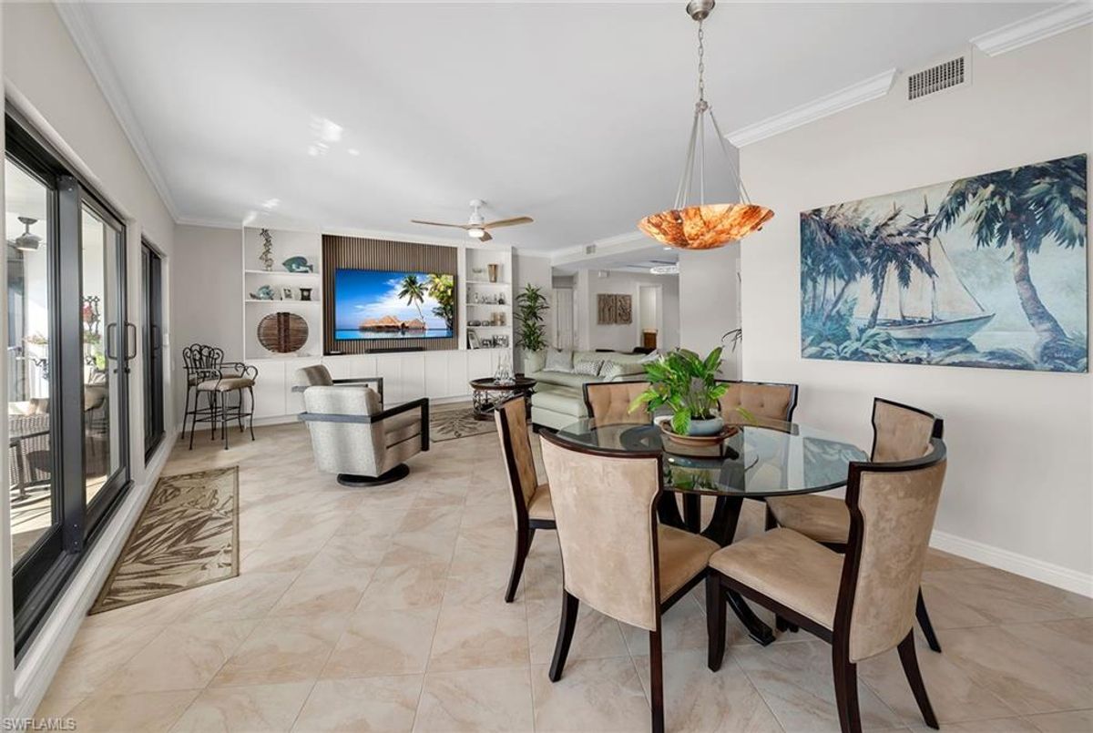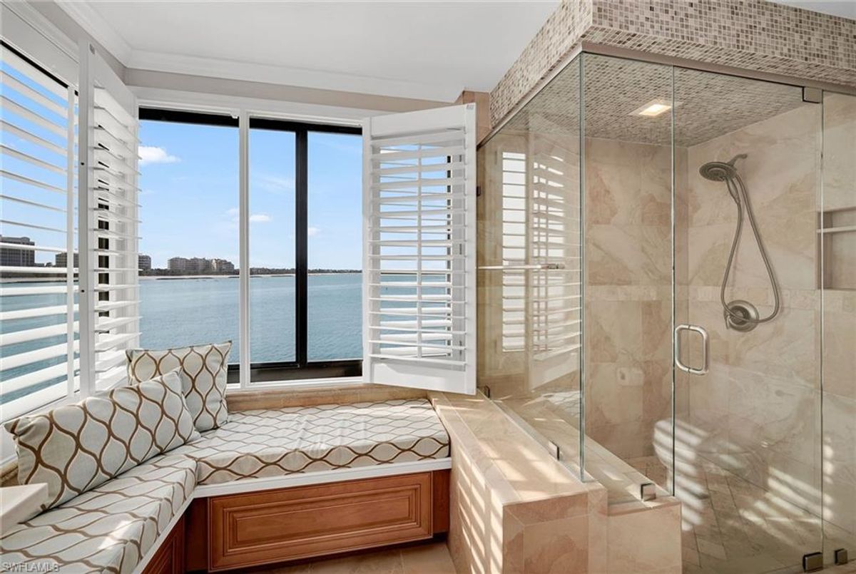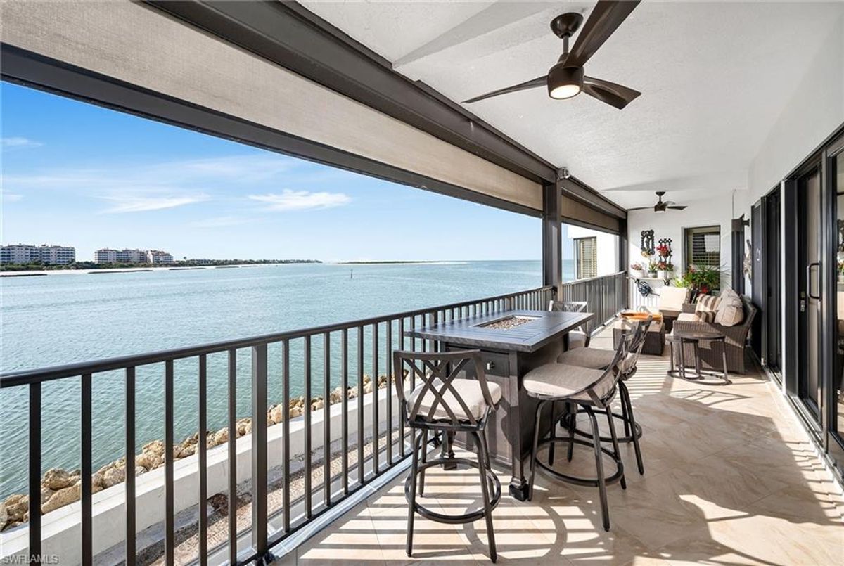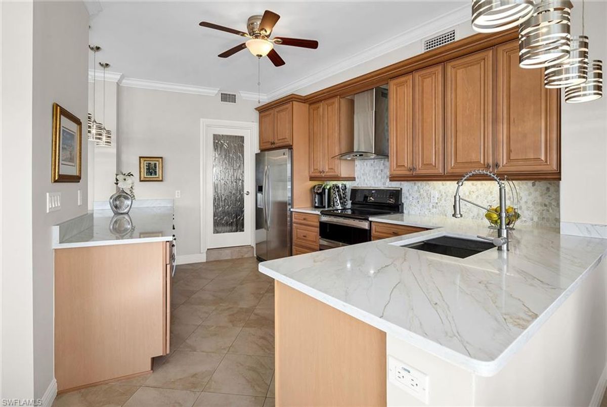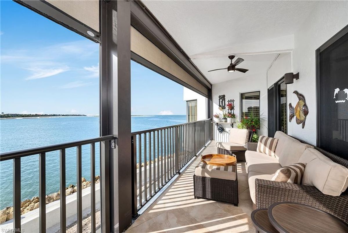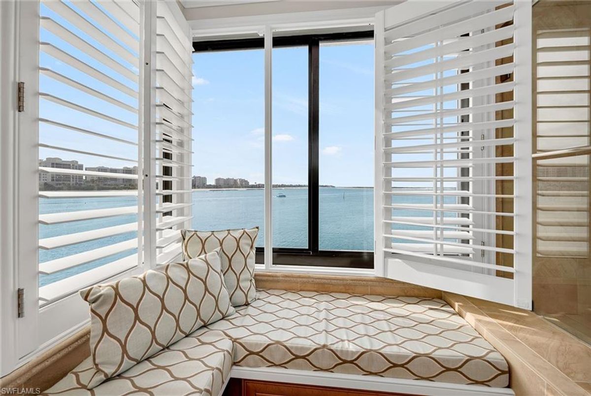 This stunning waterfront condominium offers unparalleled private views of the Big Marco River and the Gulf of Mexico, making it a true coastal retreat. The remodeled 2,200-square-foot residence features a spacious split-bedroom floor plan with three bedrooms, two-and-a-half baths, and the added convenience of a covered parking spot equipped with a charging station for electric vehicles, along with a storage unit. With southwest exposure, the home is bathed in natural light and designed to maximize breathtaking water views. Discover exquisite diagonal porcelain tile flooring throughout, complemented by elegant crown molding and white plantation shutters. The foyer sets the tone with a tray ceiling accented by rope lighting and a striking halo chandelier. The kitchen is a chef’s dream, showcasing shaker-style cabinets with soft-close drawers, quartz countertops, mosaic tile backsplash, under-cabinet lighting and stainless steel appliances, including a double oven range with hood, refrigerator with icemaker, dishwasher and wine cooler. A walk-in pantry with built-in wine shelves adds to the functionality. Adjacent to the kitchen, the breakfast nook offers built-in cabinets, a large corner window with stunning water views, and access to the lanai. The living room exudes charm and sophistication with a custom white built-in entertainment center featuring tambour paneling and direct access to the lanai through expansive impact glass sliders. The lanai is the perfect spot to sip morning coffee or unwind at sunset, with its spacious covered outdoor living area, tile flooring and panoramic water views. The luxurious owner’s suite features a double-door entry, tray ceiling and a spacious walk-in closet with built-in shelving. The en-suite bath is a spa-like retreat, offering dual quartz vanities, a walk-in shower with a frameless glass enclosure, and a mosaic tile ceiling. A cozy seating area positioned by a large corner window offers stunning private water views, further enhancing the suite's appeal. The guest bedrooms are equally impressive. One features a bay window, a deep walk-in closet with built-ins, and an additional storage closet, while the adjacent bath boasts a double quartz vanity and a walk-in shower with a built-in bench. The second guest bedroom, which can serve as a den or study, is equipped with glass French doors and is also conveniently located near the full bath. Additional features include a well-appointed powder bath with a quartz vanity and a laundry area with overhead cabinets and new stackable LG washer and dryer units. Located in the private, gated community of La Peninsula on Isles of Capri, this property offers an exceptional lifestyle with tropical landscaping, a clubhouse, a large pool, a fitness center and a waterfront walking path. Ideally positioned between Marco Island and Naples, residents enjoy the best of both worlds, with easy access to pristine beaches, shopping, dining and entertainment. A perfect coastal escape.