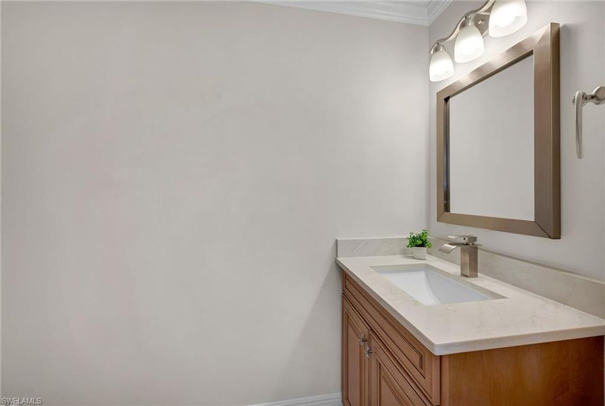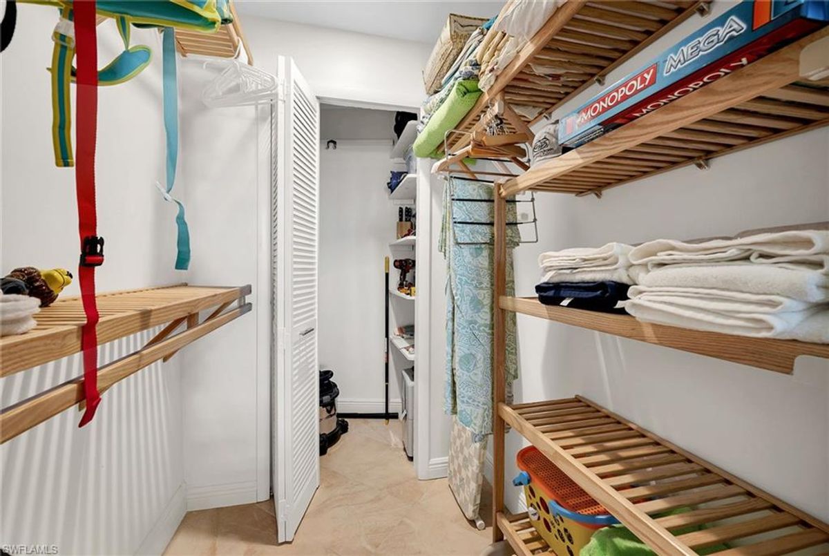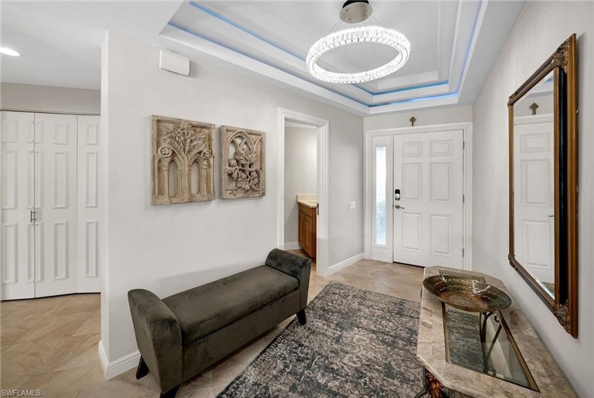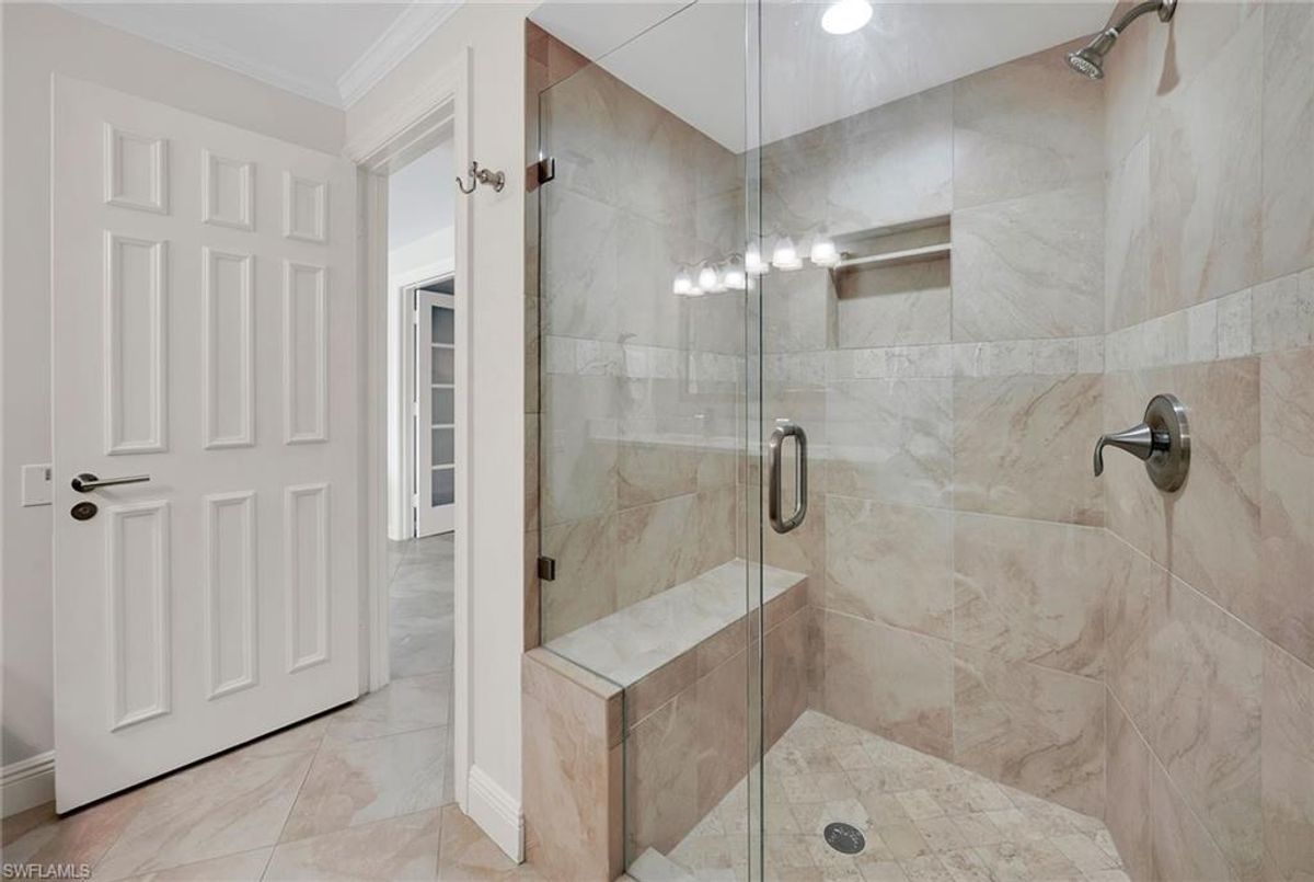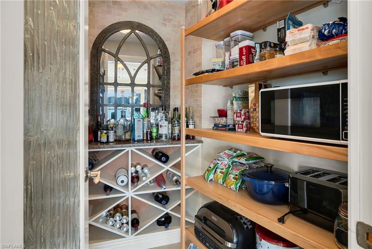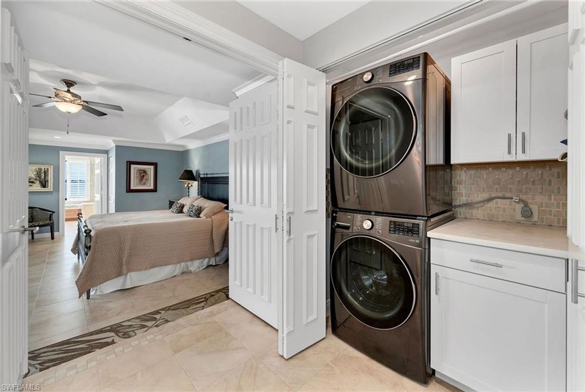 This stunning waterfront condominium offers unparalleled private views of the Big Marco River and the Gulf of Mexico, making it a true coastal retreat. The remodeled 2,200-square-foot residence features a spacious split-bedroom floor plan with three bedrooms, two-and-a-half baths, and the added convenience of a covered parking spot equipped with a charging station for electric vehicles, along with a storage unit. With southwest exposure, the home is bathed in natural light and designed to maximize breathtaking water views. Discover exquisite diagonal porcelain tile flooring throughout, complemented by elegant crown molding and white plantation shutters. The foyer sets the tone with a tray ceiling accented by rope lighting and a striking halo chandelier. The kitchen is a chef’s dream, showcasing shaker-style cabinets with soft-close drawers, quartz countertops, mosaic tile backsplash, under-cabinet lighting and stainless steel appliances, including a double oven range with hood, refrigerator with icemaker, dishwasher and wine cooler. A walk-in pantry with built-in wine shelves adds to the functionality. Adjacent to the kitchen, the breakfast nook offers built-in cabinets, a large corner window with stunning water views, and access to the lanai. The living room exudes charm and sophistication with a custom white built-in entertainment center featuring tambour paneling and direct access to the lanai through expansive impact glass sliders. The lanai is the perfect spot to sip morning coffee or unwind at sunset, with its spacious covered outdoor living area, tile flooring and panoramic water views. The luxurious owner’s suite features a double-door entry, tray ceiling and a spacious walk-in closet with built-in shelving. The en-suite bath is a spa-like retreat, offering dual quartz vanities, a walk-in shower with a frameless glass enclosure, and a mosaic tile ceiling. A cozy seating area positioned by a large corner window offers stunning private water views, further enhancing the suite's appeal. The guest bedrooms are equally impressive. One features a bay window, a deep walk-in closet with built-ins, and an additional storage closet, while the adjacent bath boasts a double quartz vanity and a walk-in shower with a built-in bench. The second guest bedroom, which can serve as a den or study, is equipped with glass French doors and is also conveniently located near the full bath. Additional features include a well-appointed powder bath with a quartz vanity and a laundry area with overhead cabinets and new stackable LG washer and dryer units. Located in the private, gated community of La Peninsula on Isles of Capri, this property offers an exceptional lifestyle with tropical landscaping, a clubhouse, a large pool, a fitness center and a waterfront walking path. Ideally positioned between Marco Island and Naples, residents enjoy the best of both worlds, with easy access to pristine beaches, shopping, dining and entertainment. A perfect coastal escape.