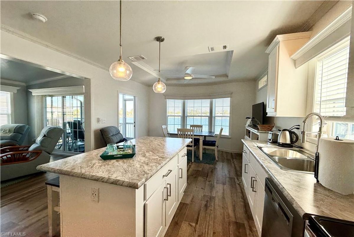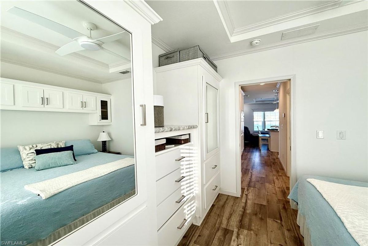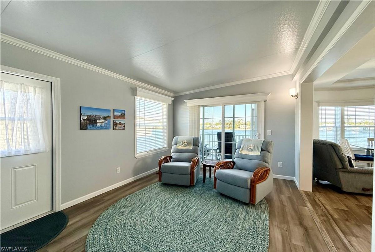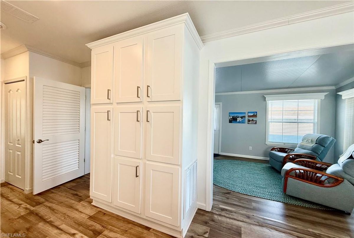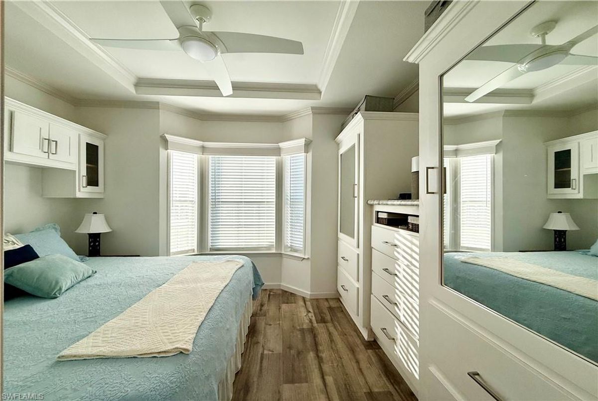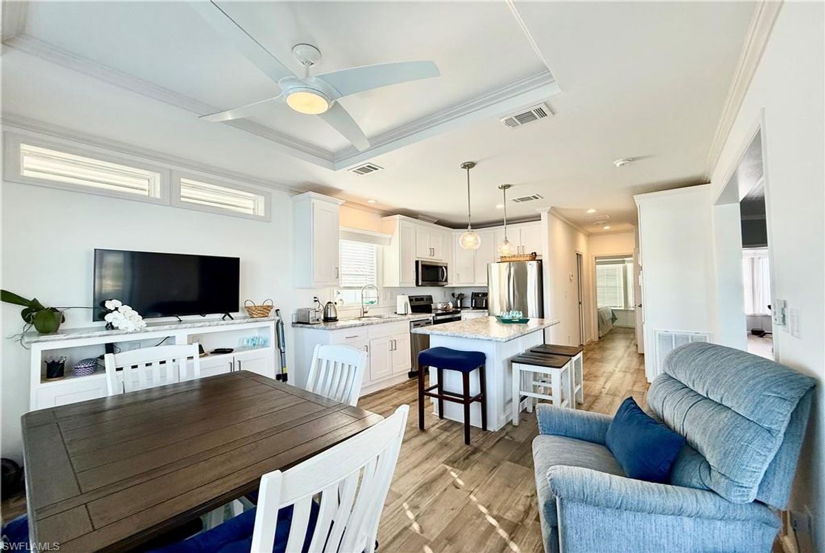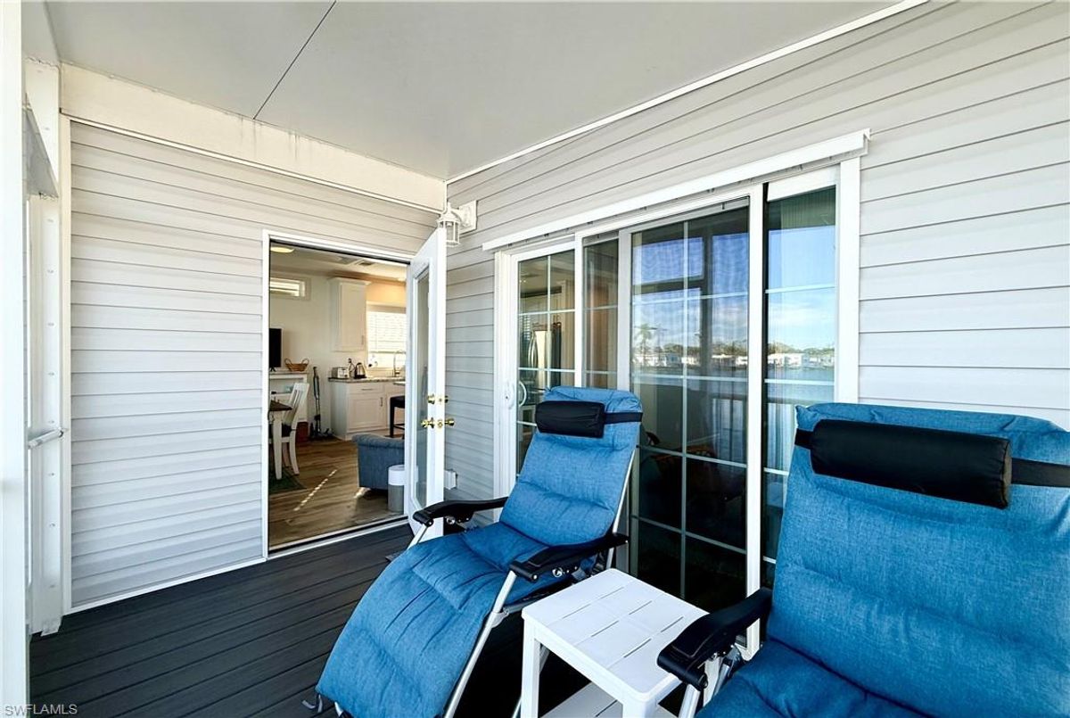 Thank you for viewing 524 Cheetah Drive in the Imperial Wilderness Condominium Association of Naples, FL. This is a very active, gated, 55+ community where YOU OWN THE LAND. This outstanding 2Br/2Ba home was constructed in 2022 and 2023 and is situated on the water of the largest lake in the community. The home’s superlative position, near the center of the lake, provides a breathtaking sunrise view that can be enjoyed from the screened lanai, dining area, and rear patio. Additionally, the second pool area is diagonally across the street. The park model is a 2022 Skyline, Palm Bay model 2622, and the addition was completed in 2023. The color palette is tasteful, relaxing, and consistent. You will appreciate the attractive lighting fixtures and abundance of natural light. Both bathrooms are quite spacious and offer walk-in showers. The bathroom near the main bedroom has a large shower with double seats. The main bedroom offers a Tempur-Cloud Supreme split-king, built-in storage, and 2 closets. Throughout the home, there is crown molding. In the main bedroom and kitchen, there are trey ceilings. The kitchen contains Whirlpool and LG appliances. The laundry appliances are Bosch. In addition to ample storage within the house, the under-home storage area is huge. This storage location is high enough to store your bikes in a standing position. This beautiful home is being sold furnished. The HOA fee of $840. per quarter is very reasonable and covers many of your needs: water, lawn care, basic cable, trash/recycling, and community amenities. Community amenities include the following: 2 pools with spas, bocce, pickleball, pétanque, tennis, shuffleboard, billiards, ping pong, a library, clubhouse, dog parks, and an extremely active events calendar!