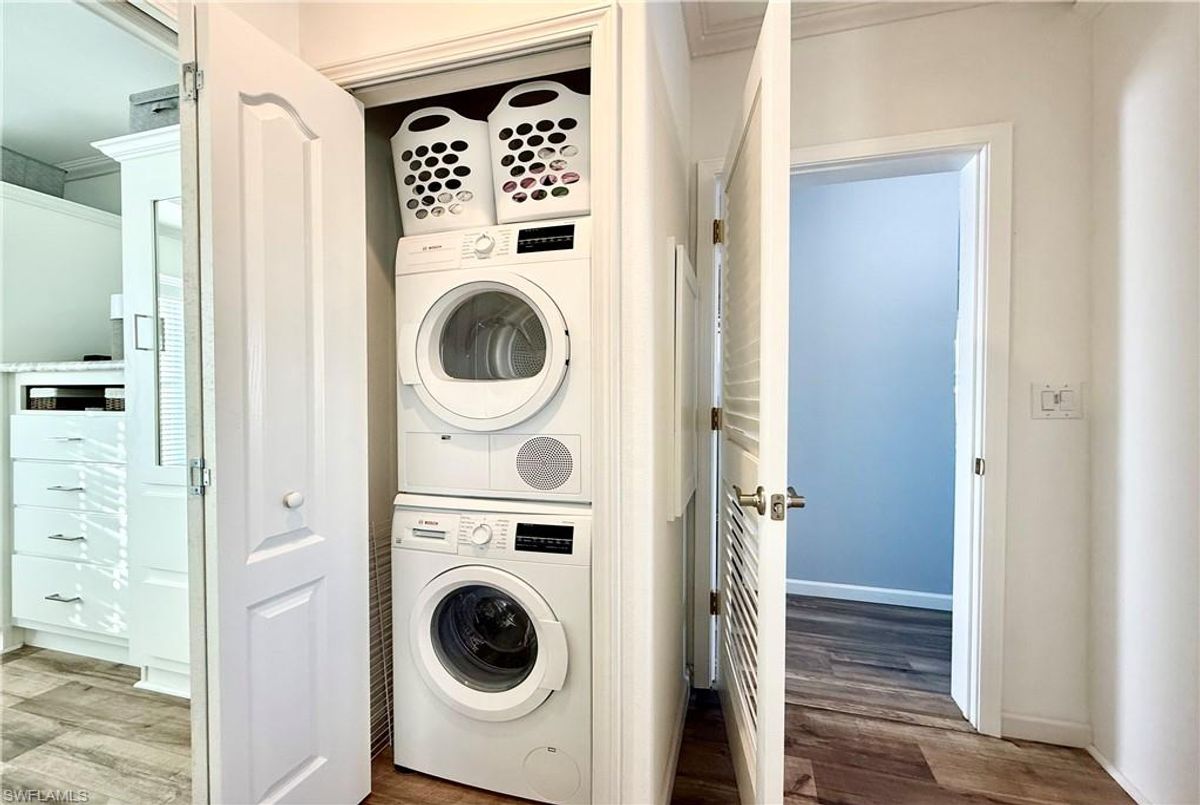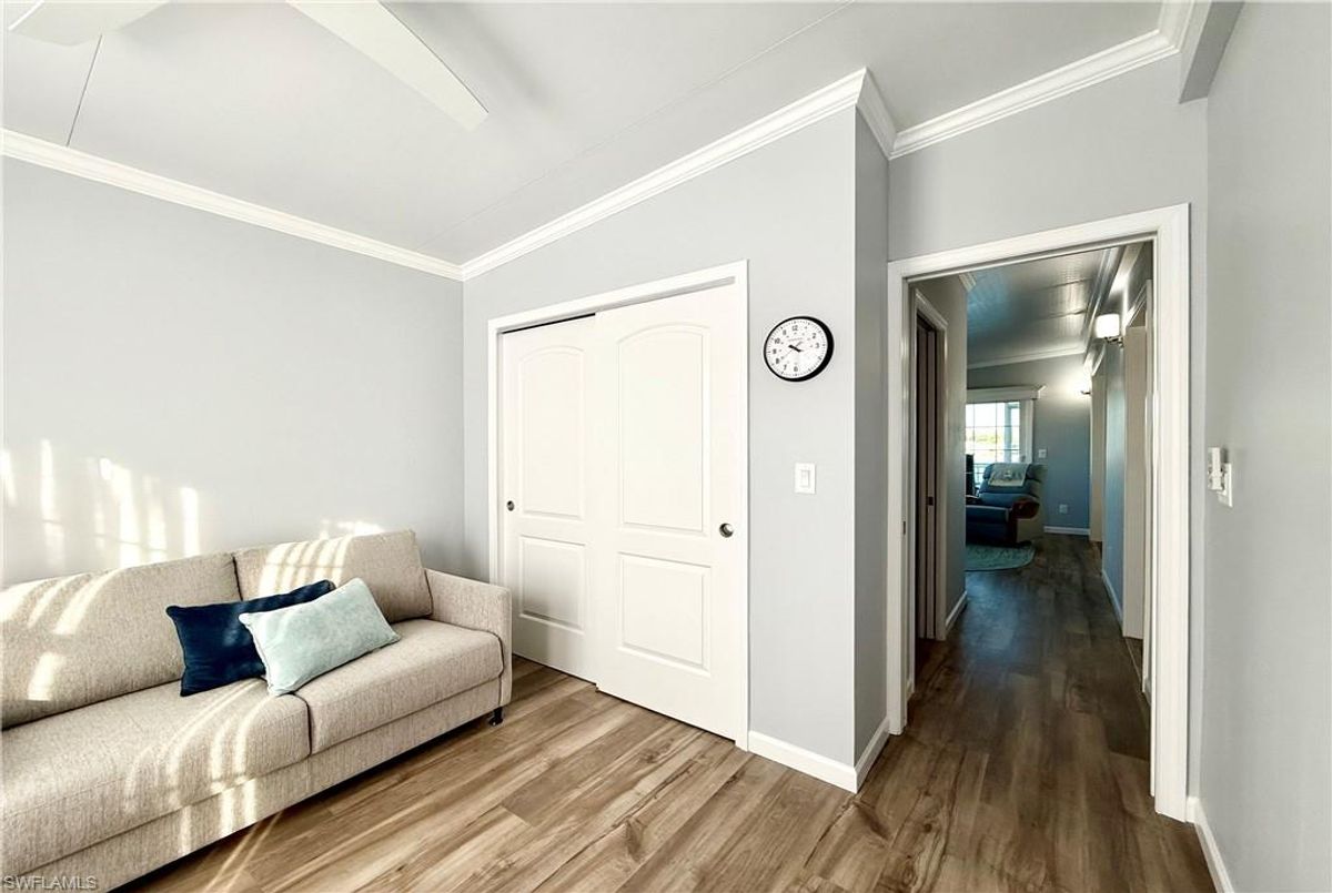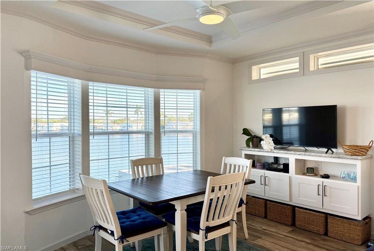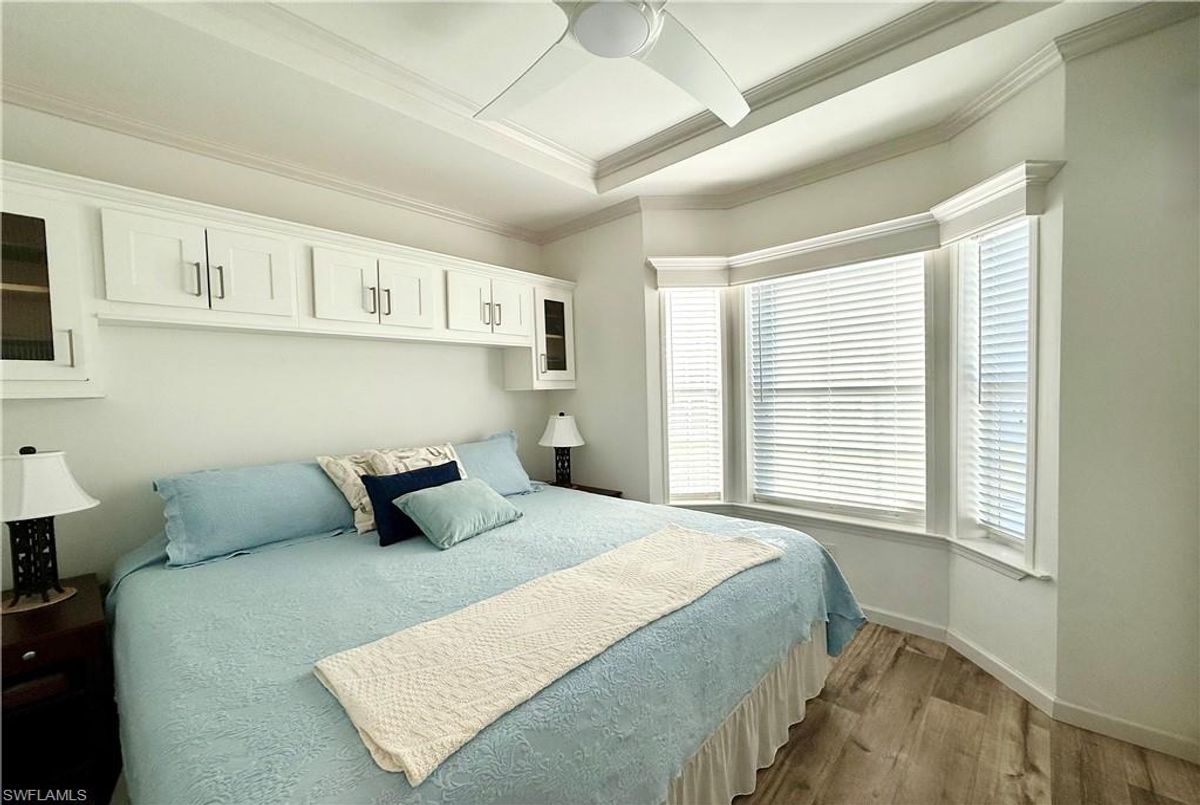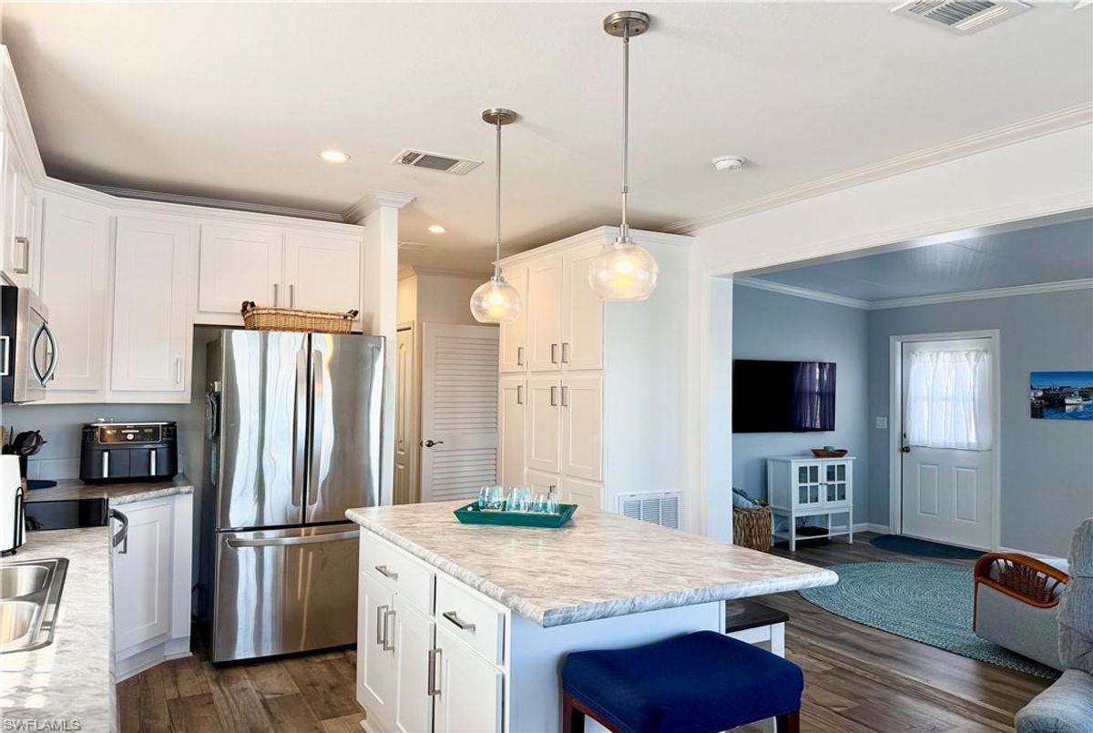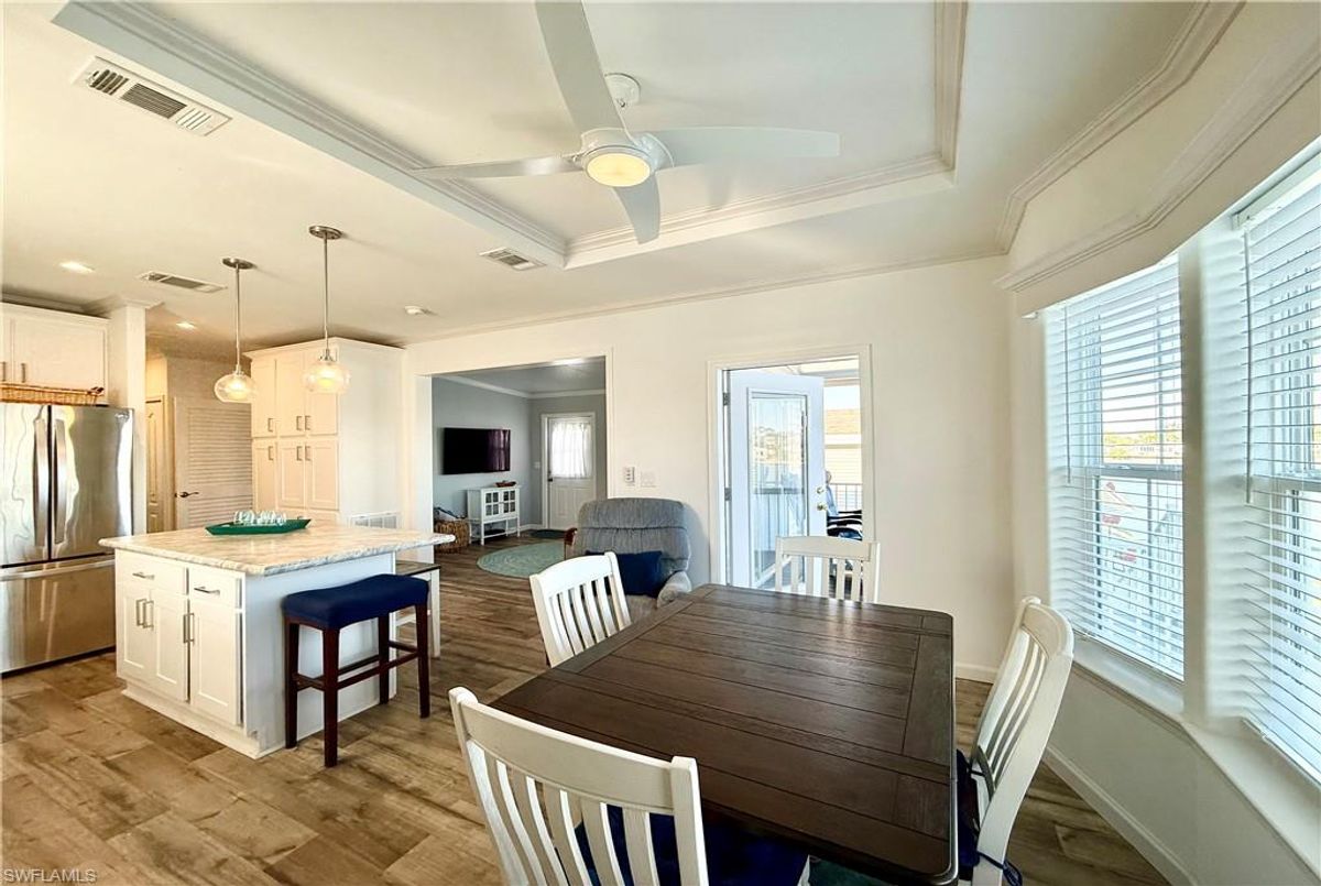 Thank you for viewing 524 Cheetah Drive in the Imperial Wilderness Condominium Association of Naples, FL. This is a very active, gated, 55+ community where YOU OWN THE LAND. This outstanding 2Br/2Ba home was constructed in 2022 and 2023 and is situated on the water of the largest lake in the community. The home’s superlative position, near the center of the lake, provides a breathtaking sunrise view that can be enjoyed from the screened lanai, dining area, and rear patio. Additionally, the second pool area is diagonally across the street. The park model is a 2022 Skyline, Palm Bay model 2622, and the addition was completed in 2023. The color palette is tasteful, relaxing, and consistent. You will appreciate the attractive lighting fixtures and abundance of natural light. Both bathrooms are quite spacious and offer walk-in showers. The bathroom near the main bedroom has a large shower with double seats. The main bedroom offers a Tempur-Cloud Supreme split-king, built-in storage, and 2 closets. Throughout the home, there is crown molding. In the main bedroom and kitchen, there are trey ceilings. The kitchen contains Whirlpool and LG appliances. The laundry appliances are Bosch. In addition to ample storage within the house, the under-home storage area is huge. This storage location is high enough to store your bikes in a standing position. This beautiful home is being sold furnished. The HOA fee of $840. per quarter is very reasonable and covers many of your needs: water, lawn care, basic cable, trash/recycling, and community amenities. Community amenities include the following: 2 pools with spas, bocce, pickleball, pétanque, tennis, shuffleboard, billiards, ping pong, a library, clubhouse, dog parks, and an extremely active events calendar!
