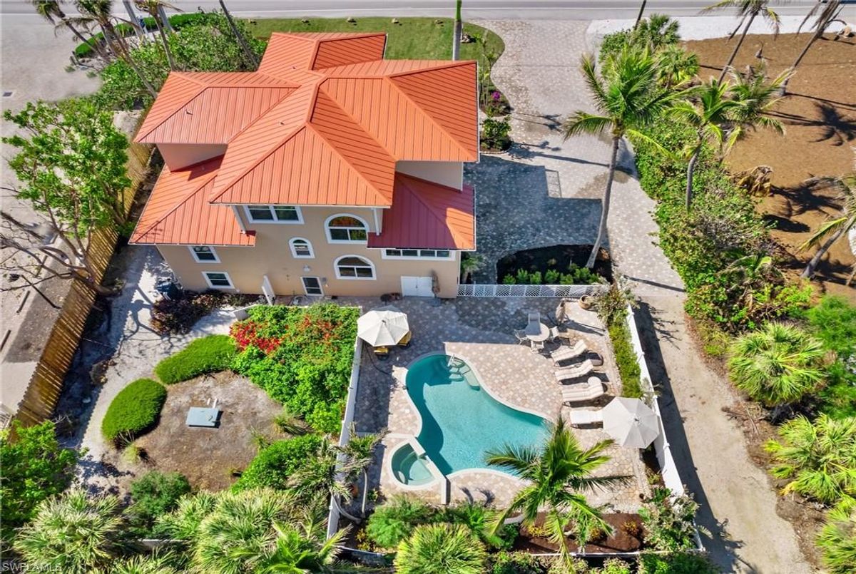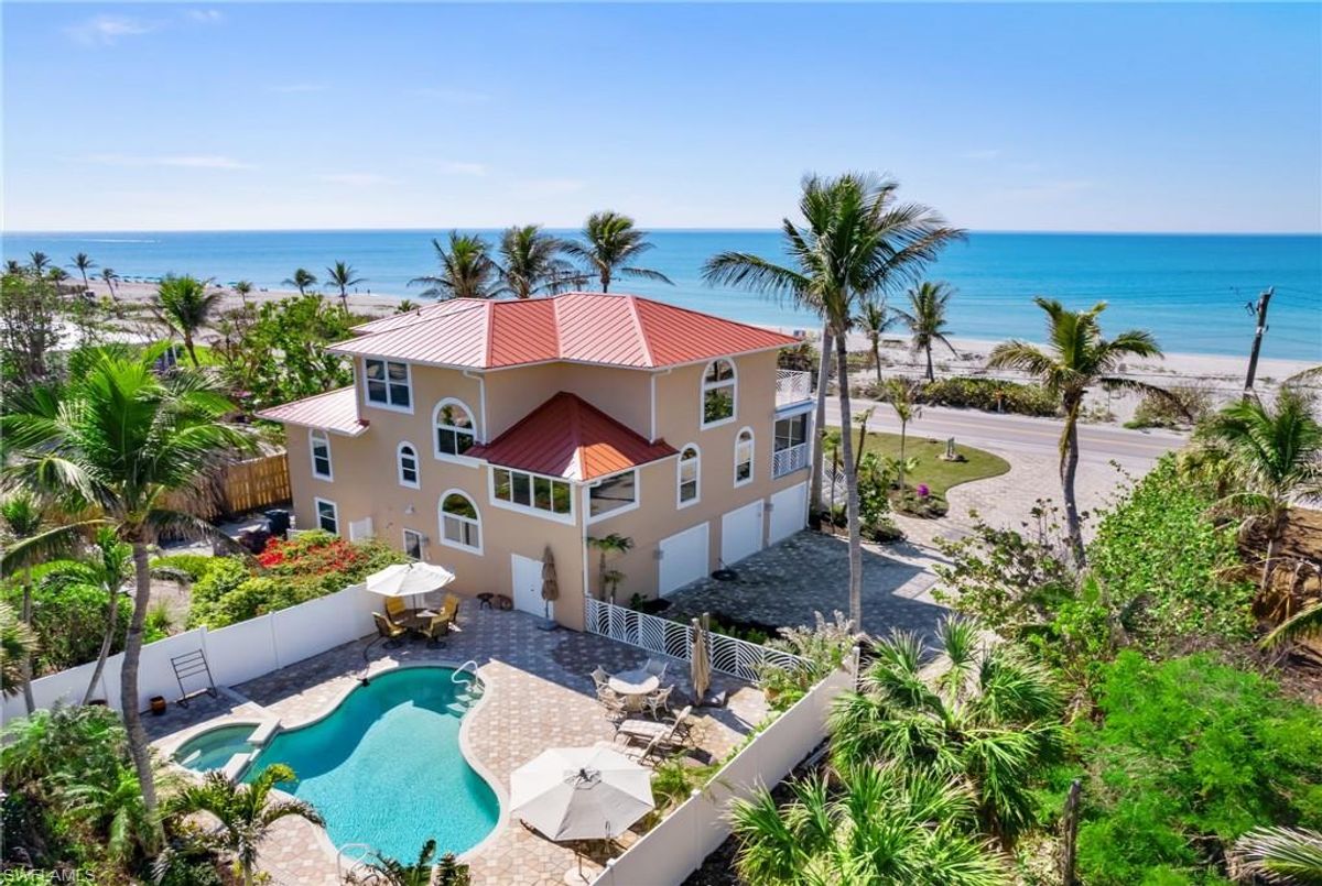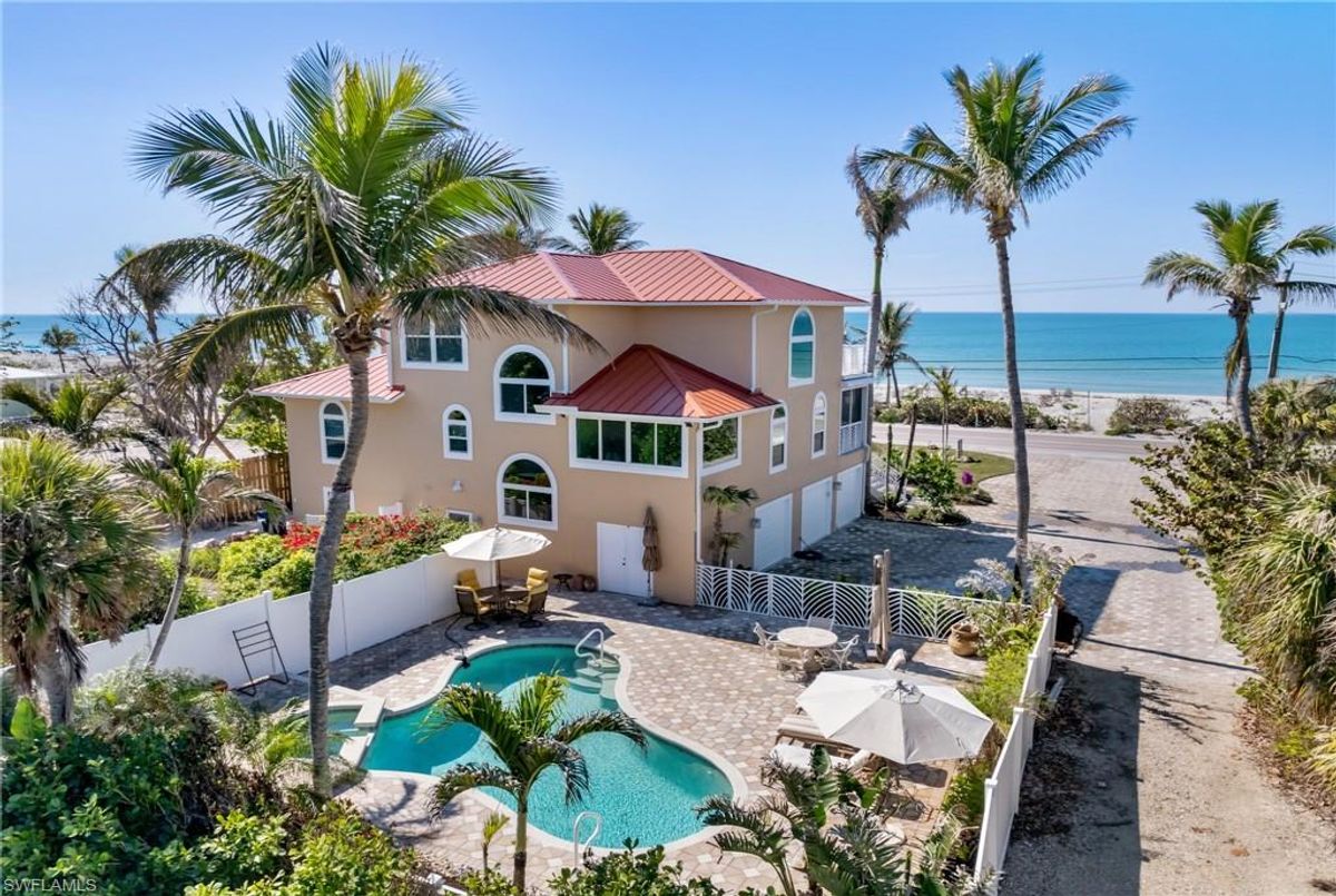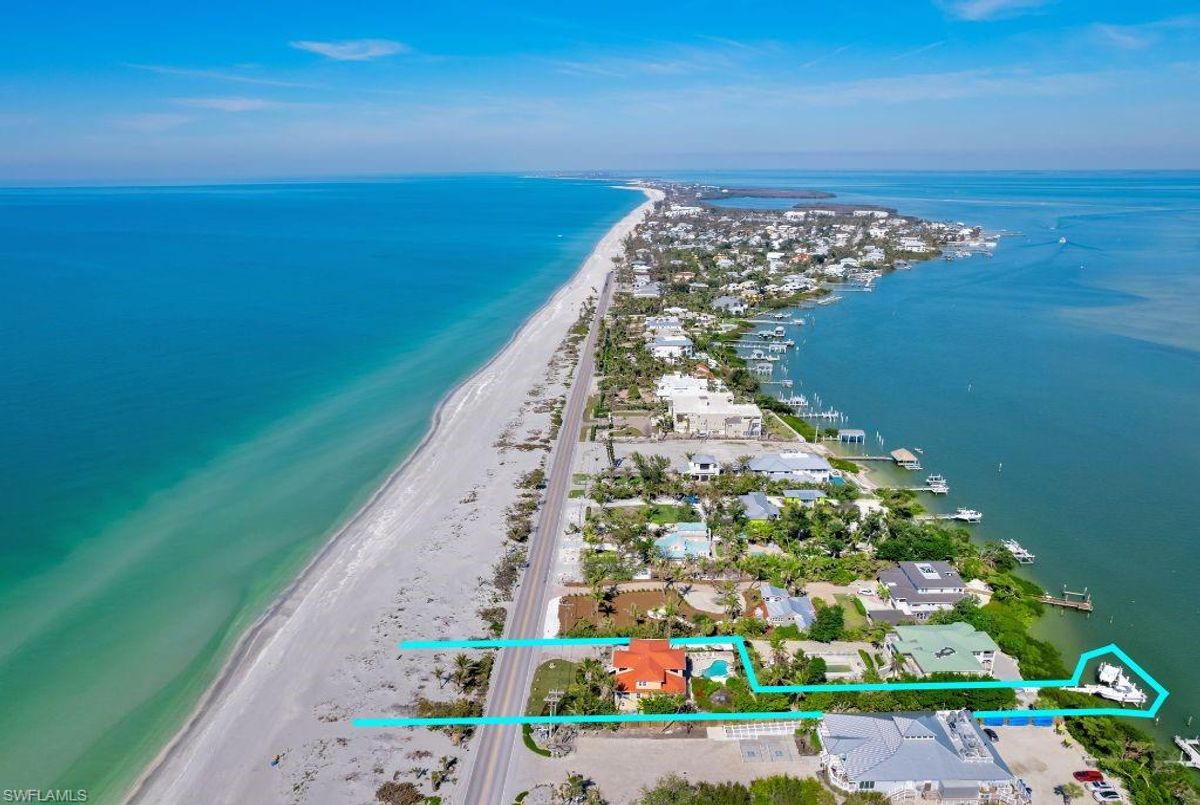 Nestled between the Gulf and Bay, this stunning beachfront home offers unparalleled 180-degree views of both pristine waters, coupled with direct deep-water boating access and a private dock space with lift. Perfect for those who enjoy both the beach and boating lifestyle, this residence seamlessly blends luxurious indoor spaces with expansive outdoor living areas. The thoughtfully designed split floor plan provides ultimate privacy for owners and guests, while the open-concept gathering areas flow effortlessly from room to room. Sunlight pours through large windows, highlighting the voluminous interiors and enhancing the beauty of the home. The light-filled spaces lead to multiple outdoor areas ideal for entertaining or relaxing, all while taking in the spectacular views. Enjoy easy maintenance witha galvalume roof, composite decking, aluminum railings, durable stucco finish, impact windows and doors and more. The beautifully landscaped property boasts a large fenced backyard with pavers, perfect for hosting or enjoying the outdoors, plus a spacious pool and spa for ultimate relaxation. The gourmet kitchen offers fantastic views of the Gulf, stone countertops, a large pantry, a cozy dining area, and an adjacent deck for alfresco dining. The master suite is a true retreat, featuring incredible Gulf views, a spacious bath, two walk-in closets, and a private office. With a 3-car garage, this home is as practical as it is luxurious—making it the perfect waterfront getaway. NOTE, this property is atsome of the highest elevation in the X Zone of Captiva Island.