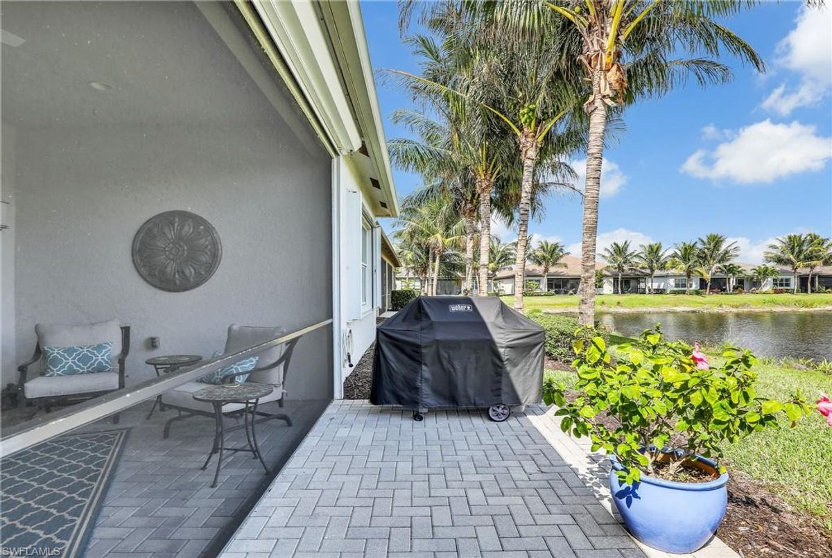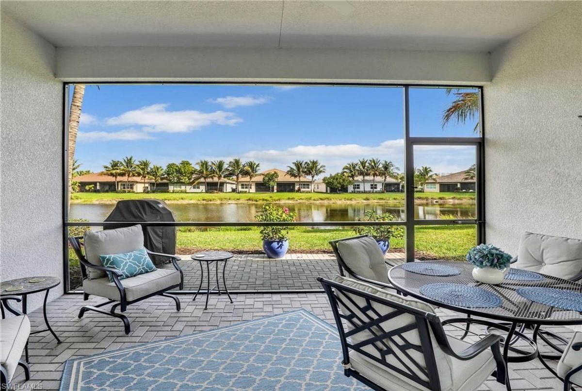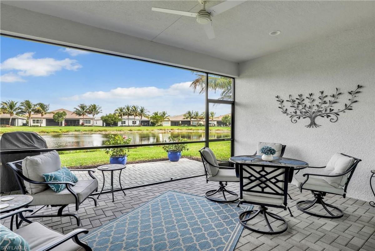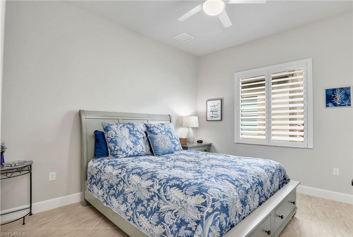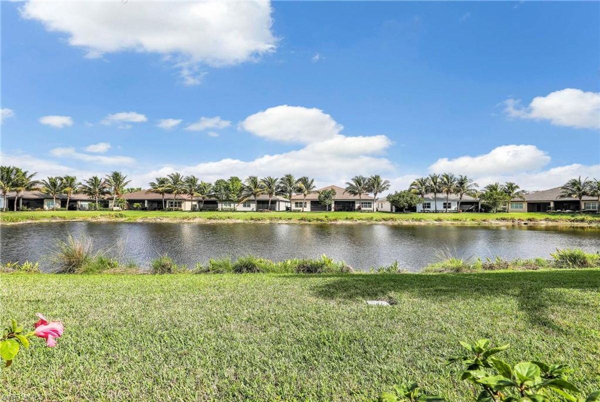 This beautiful lake front villa with eastern exposure features quartz countertops in the kitchen, upgraded 42” cabinets, pantry pullouts, tall end cabinets and upgraded GE appliances. The home includes tile throughout along with a built in desk in the den and a built in located in the living room. The master bath includes quartz countertops, drawers in the vanities and an additional window for more light. The second bath also includes a walk in shower and quartz counter tops. The Laundry room includes a sink and cabinets for easy use. A tankless water supplies all the needed hot water, plantation shutters throughout, and the back lanai includes a roll down hurricane screen along with a rear patio extension. The garage includes electric storage for easy access, epoxy floors, and a new motor for the garage door. Valencia Bonita residents enjoy one of the premier communities with 45,000 sq ft clubhouse, tennis courts, pickleball courts, bocce courts, fitness center, multiple pools, fitness center, restaurant, spa/salon, a social hall with concerts and entertainment and over 40 resident clubs to enjoy and meet new people.