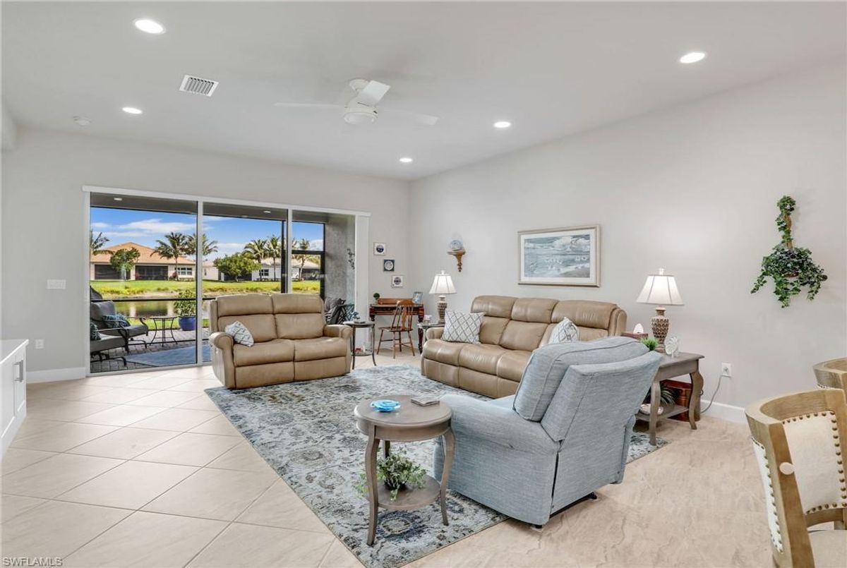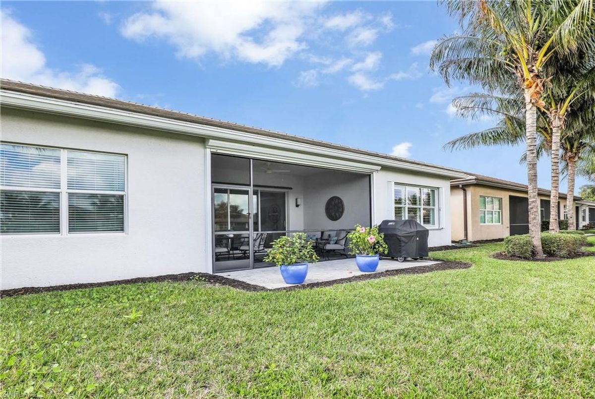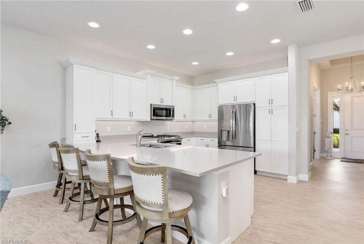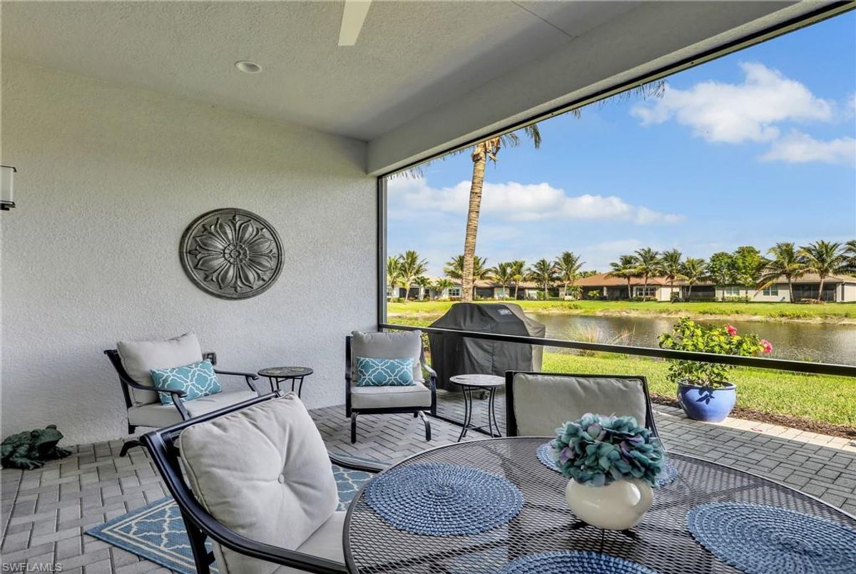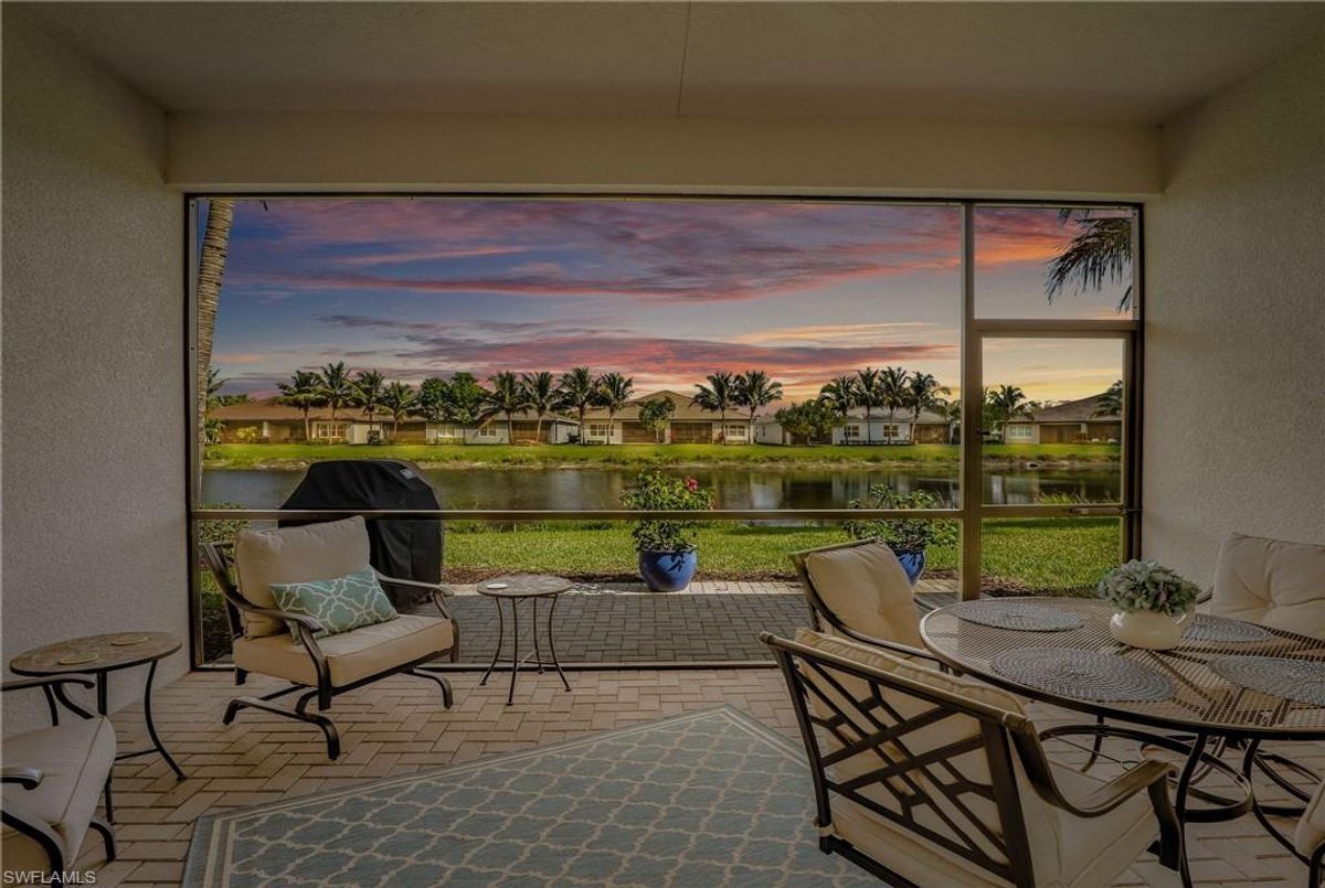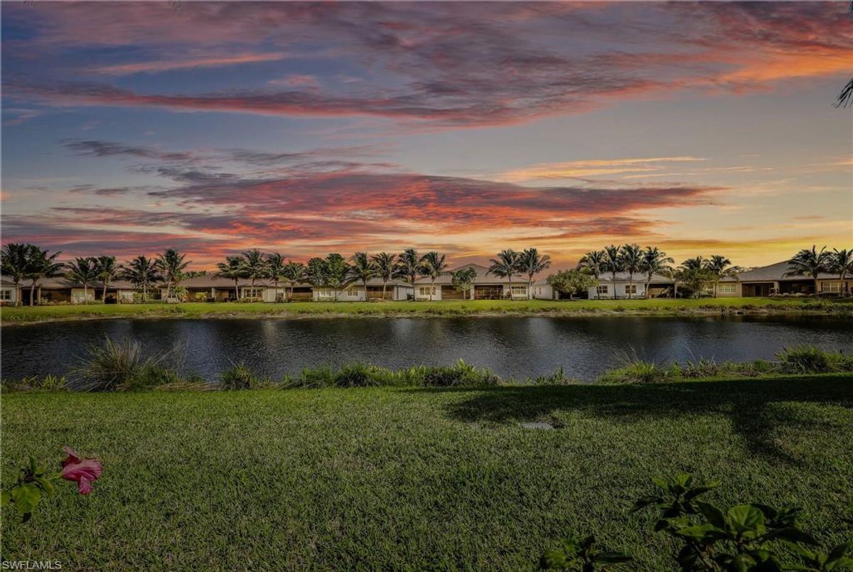 This beautiful lake front villa with eastern exposure features quartz countertops in the kitchen, upgraded 42” cabinets, pantry pullouts, tall end cabinets and upgraded GE appliances. The home includes tile throughout along with a built in desk in the den and a built in located in the living room. The master bath includes quartz countertops, drawers in the vanities and an additional window for more light. The second bath also includes a walk in shower and quartz counter tops. The Laundry room includes a sink and cabinets for easy use. A tankless water supplies all the needed hot water, plantation shutters throughout, and the back lanai includes a roll down hurricane screen along with a rear patio extension. The garage includes electric storage for easy access, epoxy floors, and a new motor for the garage door. Valencia Bonita residents enjoy one of the premier communities with 45,000 sq ft clubhouse, tennis courts, pickleball courts, bocce courts, fitness center, multiple pools, fitness center, restaurant, spa/salon, a social hall with concerts and entertainment and over 40 resident clubs to enjoy and meet new people.