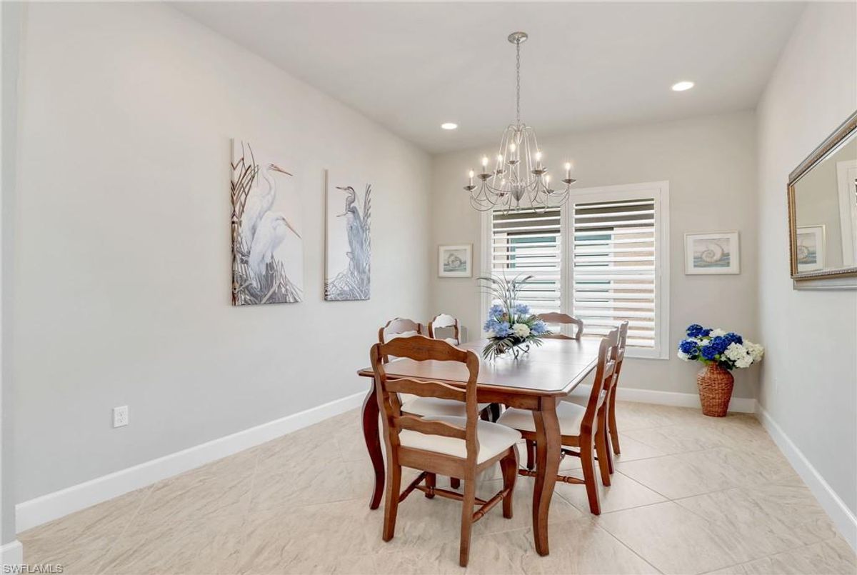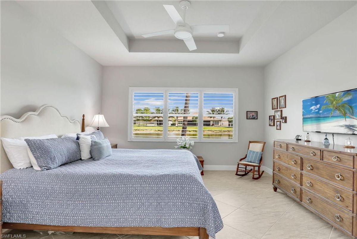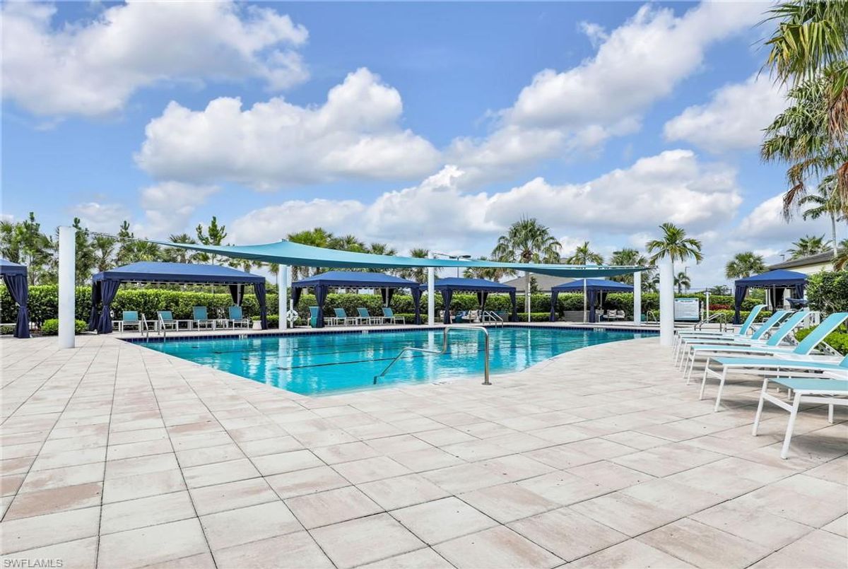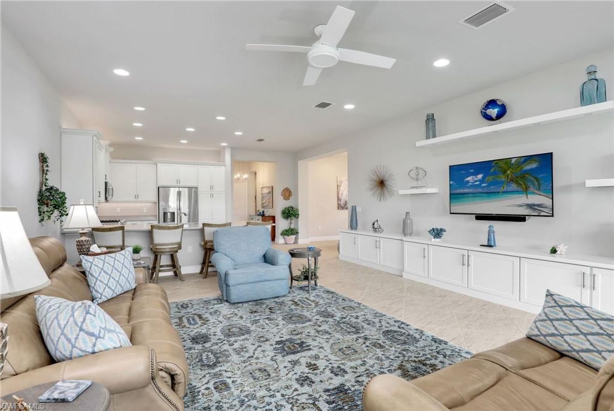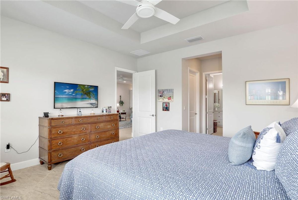 This beautiful lake front villa with eastern exposure features quartz countertops in the kitchen, upgraded 42” cabinets, pantry pullouts, tall end cabinets and upgraded GE appliances. The home includes tile throughout along with a built in desk in the den and a built in located in the living room. The master bath includes quartz countertops, drawers in the vanities and an additional window for more light. The second bath also includes a walk in shower and quartz counter tops. The Laundry room includes a sink and cabinets for easy use. A tankless water supplies all the needed hot water, plantation shutters throughout, and the back lanai includes a roll down hurricane screen along with a rear patio extension. The garage includes electric storage for easy access, epoxy floors, and a new motor for the garage door. Valencia Bonita residents enjoy one of the premier communities with 45,000 sq ft clubhouse, tennis courts, pickleball courts, bocce courts, fitness center, multiple pools, fitness center, restaurant, spa/salon, a social hall with concerts and entertainment and over 40 resident clubs to enjoy and meet new people.