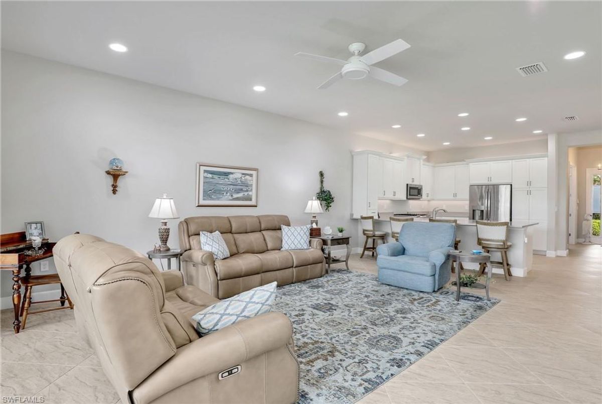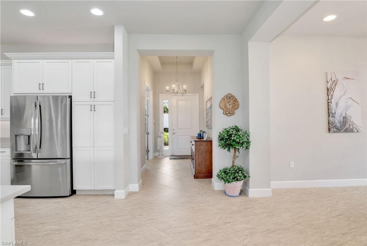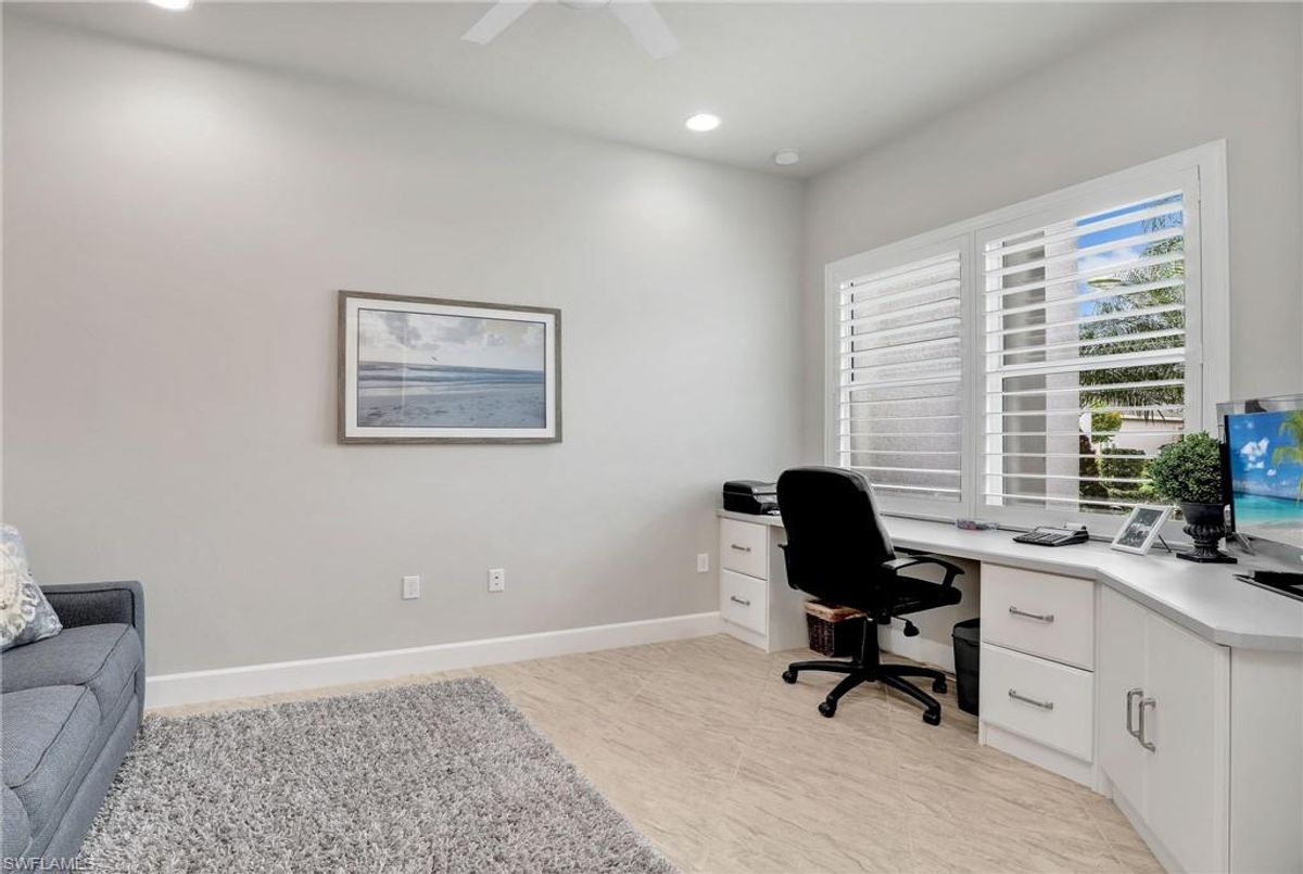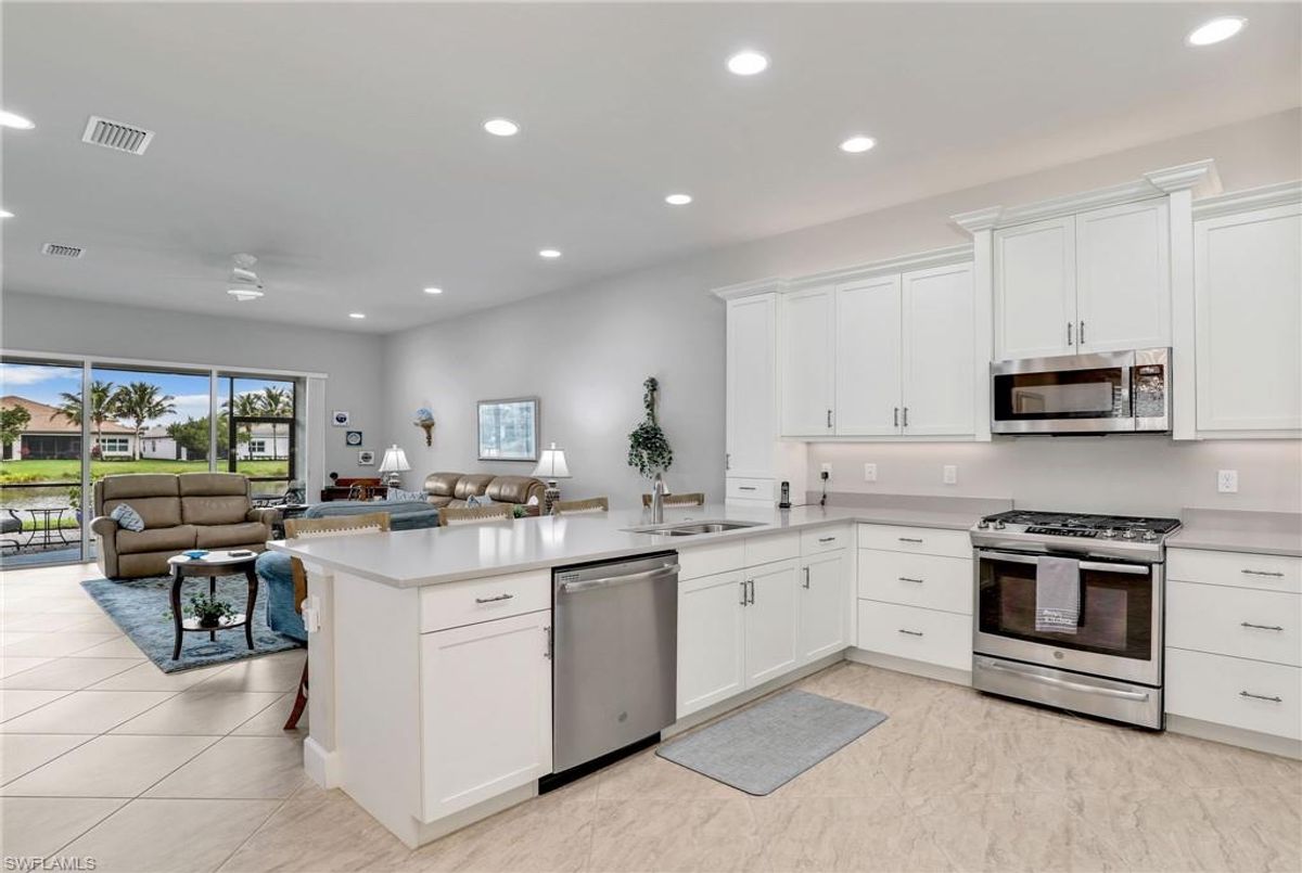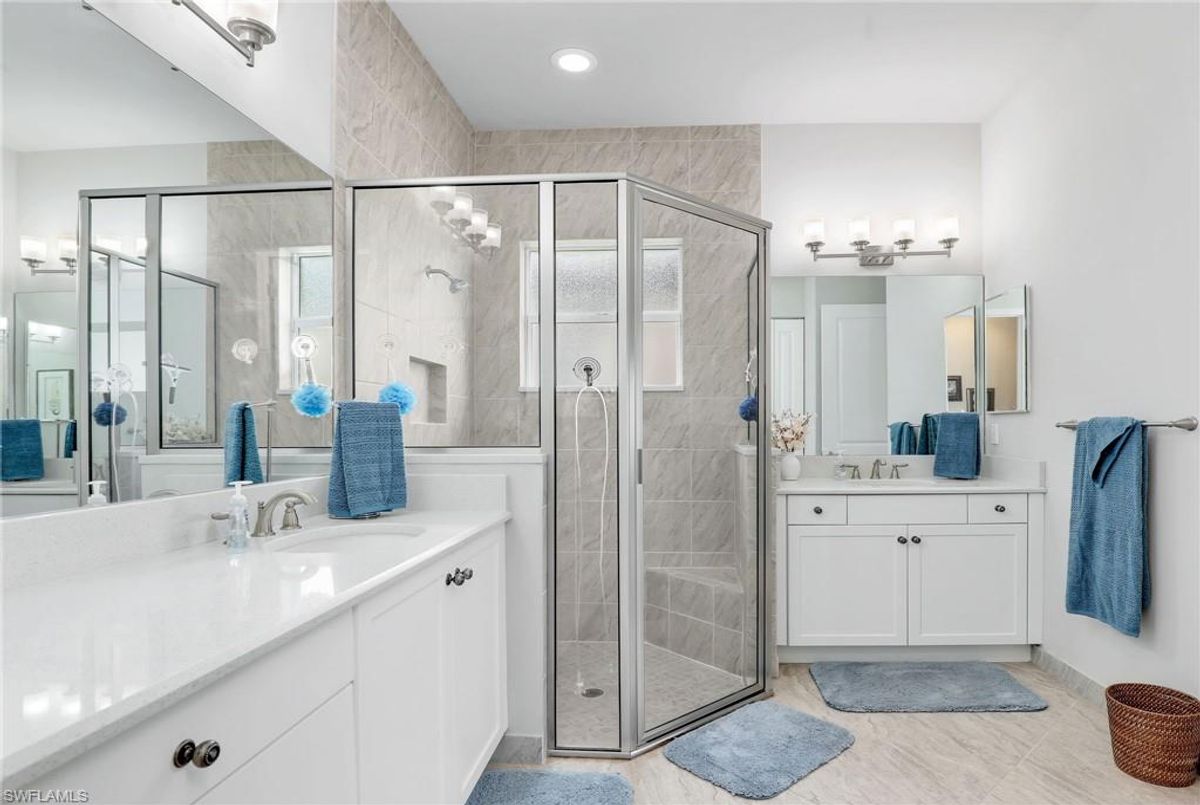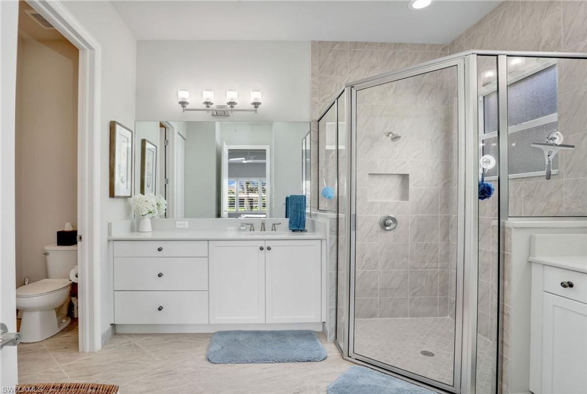 This beautiful lake front villa with eastern exposure features quartz countertops in the kitchen, upgraded 42” cabinets, pantry pullouts, tall end cabinets and upgraded GE appliances. The home includes tile throughout along with a built in desk in the den and a built in located in the living room. The master bath includes quartz countertops, drawers in the vanities and an additional window for more light. The second bath also includes a walk in shower and quartz counter tops. The Laundry room includes a sink and cabinets for easy use. A tankless water supplies all the needed hot water, plantation shutters throughout, and the back lanai includes a roll down hurricane screen along with a rear patio extension. The garage includes electric storage for easy access, epoxy floors, and a new motor for the garage door. Valencia Bonita residents enjoy one of the premier communities with 45,000 sq ft clubhouse, tennis courts, pickleball courts, bocce courts, fitness center, multiple pools, fitness center, restaurant, spa/salon, a social hall with concerts and entertainment and over 40 resident clubs to enjoy and meet new people.