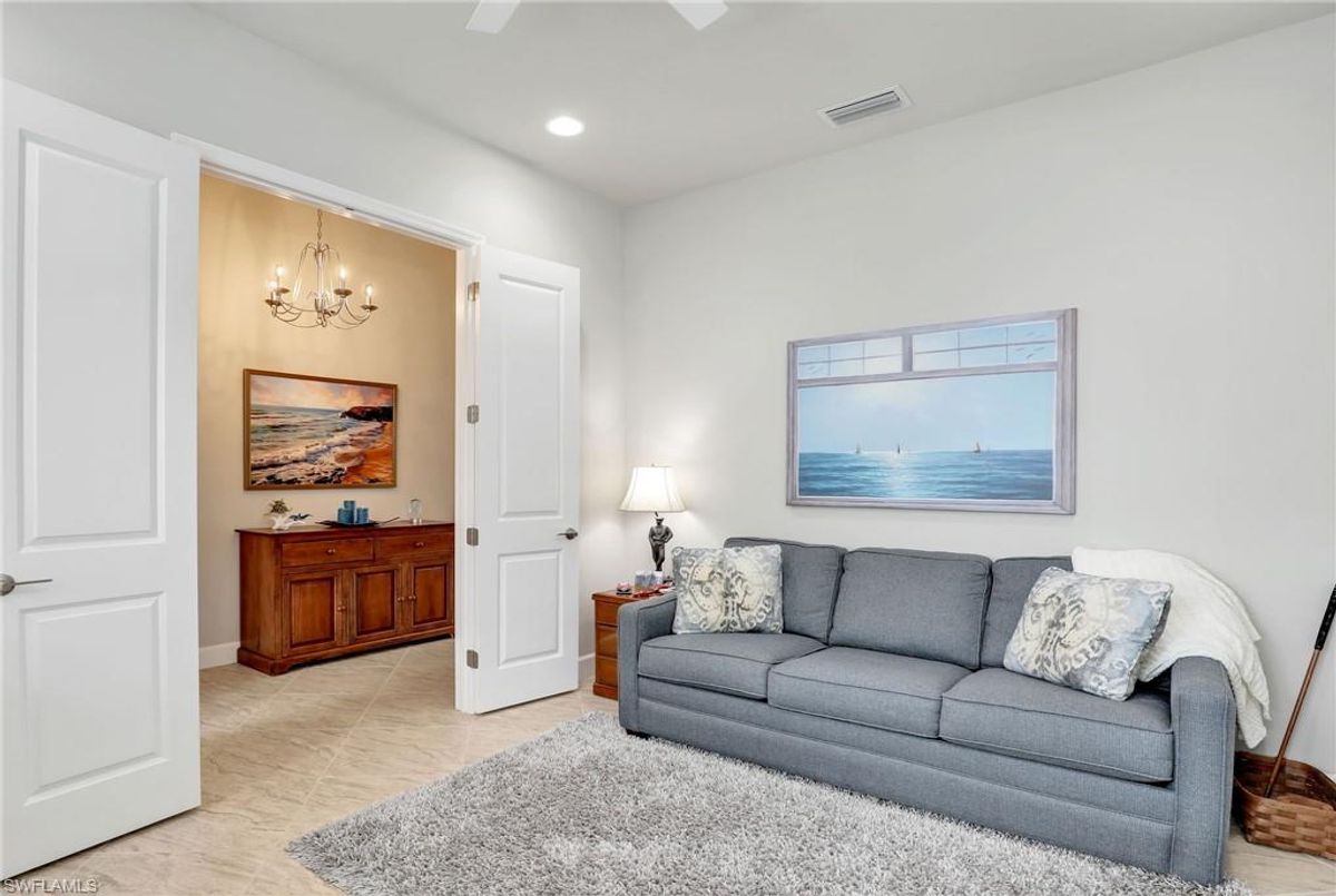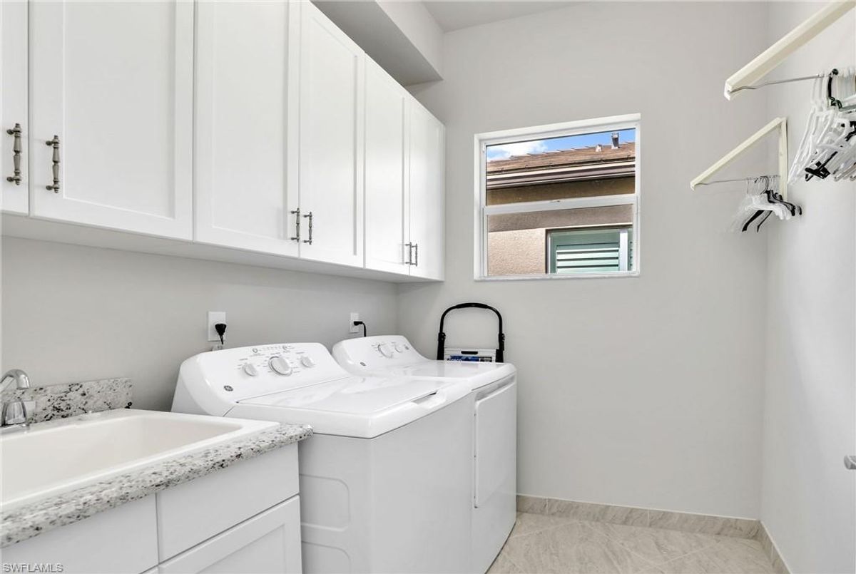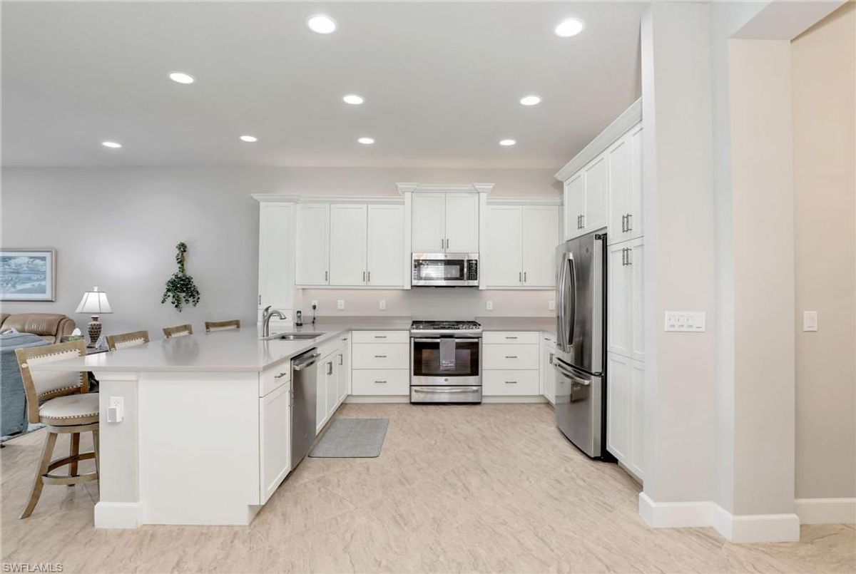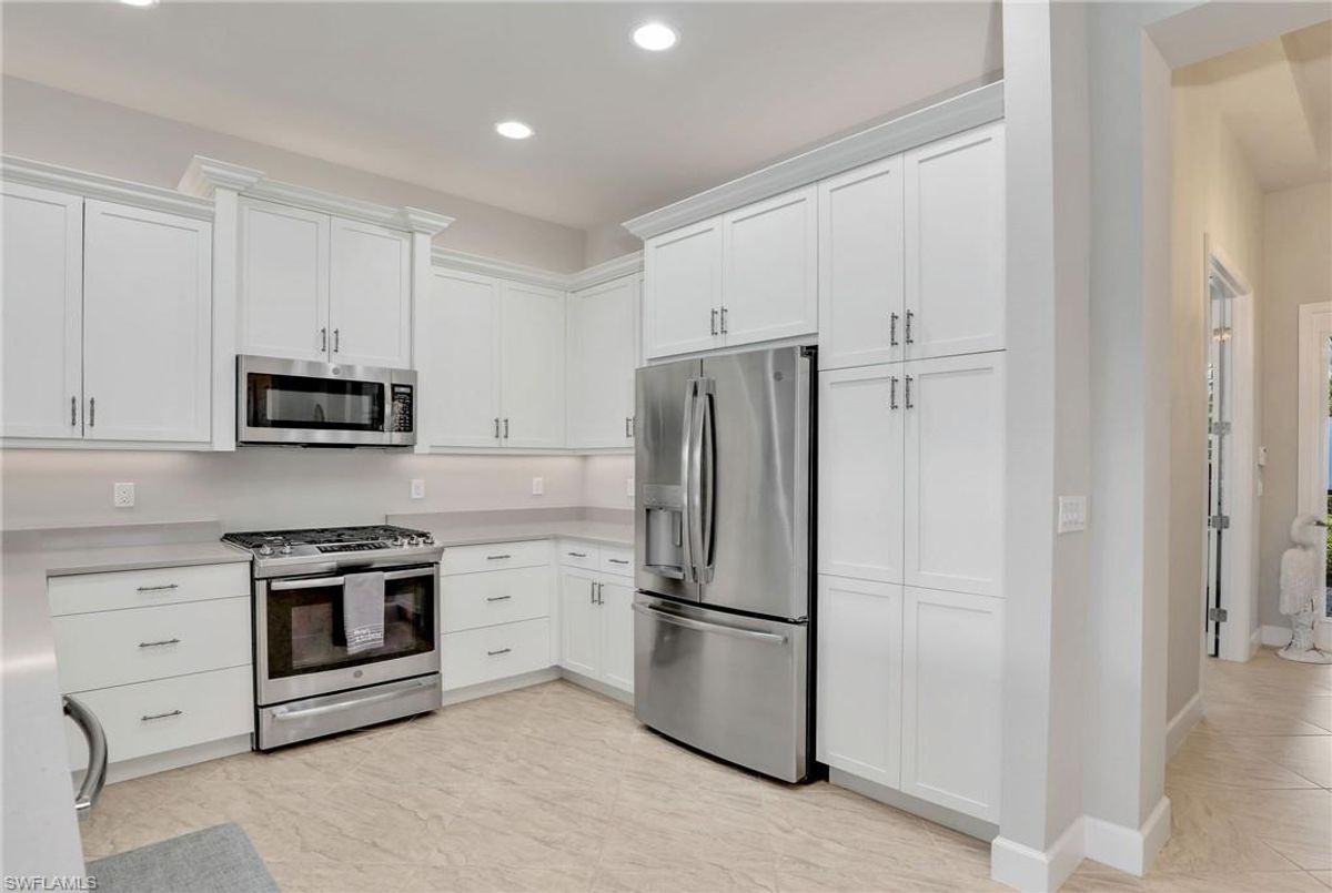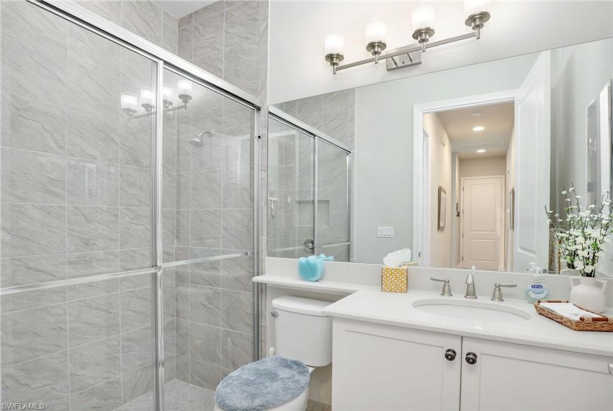This beautiful lake front villa with eastern exposure features quartz countertops in the kitchen, upgraded 42” cabinets, pantry pullouts, tall end cabinets and upgraded GE appliances. The home includes tile throughout along with a built in desk in the den and a built in located in the living room. The master bath includes quartz countertops, drawers in the vanities and an additional window for more light. The second bath also includes a walk in shower and quartz counter tops. The Laundry room includes a sink and cabinets for easy use. A tankless water supplies all the needed hot water, plantation shutters throughout, and the back lanai includes a roll down hurricane screen along with a rear patio extension. The garage includes electric storage for easy access, epoxy floors, and a new motor for the garage door. Valencia Bonita residents enjoy one of the premier communities with 45,000 sq ft clubhouse, tennis courts, pickleball courts, bocce courts, fitness center, multiple pools, fitness center, restaurant, spa/salon, a social hall with concerts and entertainment and over 40 resident clubs to enjoy and meet new people.